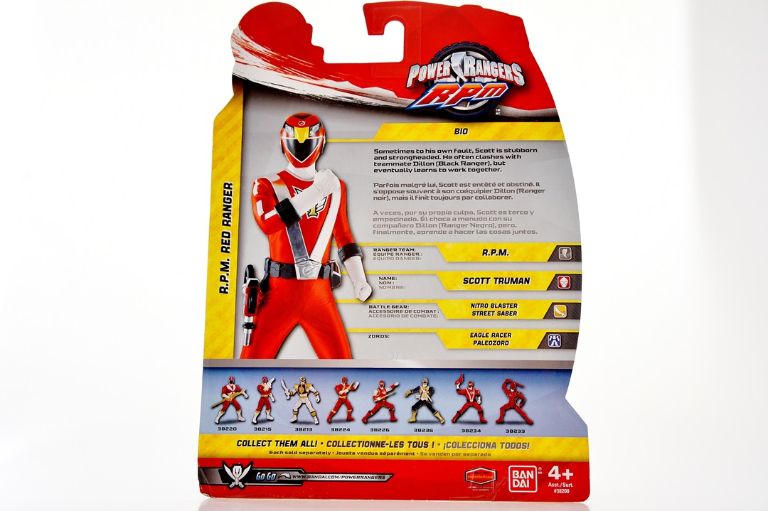 Humanity is on the brink of destruction. An evil computer virus known as Venjix has taken over most of the world, and the survivors of the human race have banded together in the domed city of Corinth. Thanks to technology developed by Dr. K and the defunct Alphabet Soup facility, Scott Truman becomes Operator Series Red, or as we know him, the RPM Red Ranger! Part of the Power Rangers Super Megaforce 5" Action Figure line, the RPM Red Ranger comes with his Street Saber as well as his Nitro Blaster (shown in pictures). The Street Saber is molded in red plastic but the blade of the sword is painted silver. The Nitro Saber is simply in red plastic. The figure itself features roughly 15 points of articulation (head, both shoulders with up/down movement and side movement, both forearms, both wrists, both legs, both lower legs). The figure I received was a little loose right out of the package, meaning it won't take long (from either displaying or playing) for the figure to lose the ability to make poses. The paint and detailing on the figure is actually very incredible - the RPM logo is molded on the belt as well as the helmet in silver, and the helmet features nearly a full paint job. Even the vents and the lights in the eyes on the helmet have molded plastic in them. The silver "belt" that goes across his chest is not molded, merely painted, and he also features the white lines on his arms. The last bit of detail is in the cuffs of his gloves and boots, which are molded as tire treads. The belt also features a decent amount of molding. The one downside these 5" figures have - the way they're molded where, if they are standing up right, their back is curved. It causes you to either to bend the knees to get the figure to stand without falling for a pose, or be skilled in photography to work around that obstacle. Unlike the Super Megaforce Rangers, there is no plastic molding to hold this figure's movement back (the Super Megaforce Rangers had the collar and the part of their suit hanging down which limited movement). All in all - this isn't a S.H. Figuart as many of us have grown accustomed to over the years. But as a cheaper alternative, I can't recommend this figure enough. The paint job is superb - I can proudly display this figure with my S.H. Figuarts and while it will obviously stand out a little, as you can see in photos the figure still looks very nice. This figure is part of the Wave 4 case assortment and is available at online retailers, and has yet to be spotted frequently in stores. A very special thanks to my buddy Fury Diamond from RangerCrew.com for helping me acquire the Wave 4 figures. Full details from the back of the packaging below. Bio: Sometimes to his own fault, Scott is stubborn and strongheaded. He often clashes with teammate Dillon (Black Ranger), but eventually learns to work together. Ranger Team: R.P.M. Name: Scott Truman Battle Gear: Nitro Blaster, Street Saber Zords: Eagle Racer, Paleozord