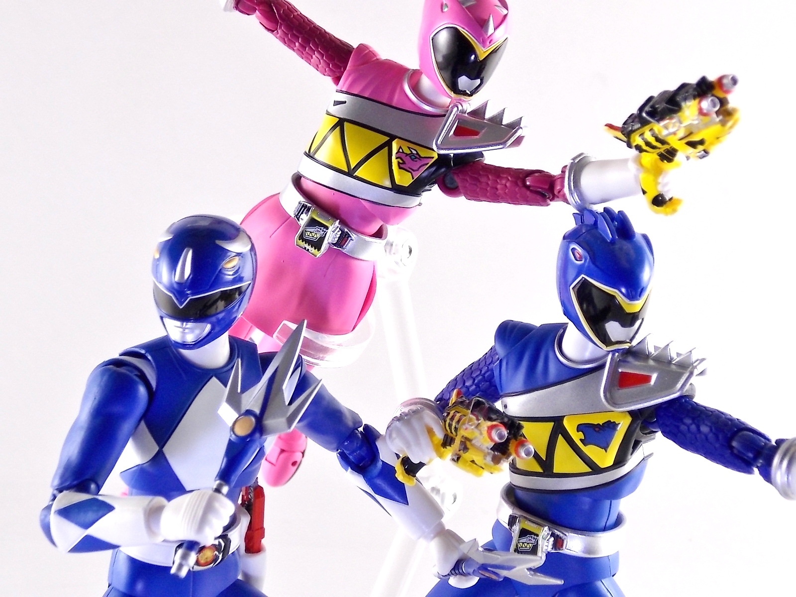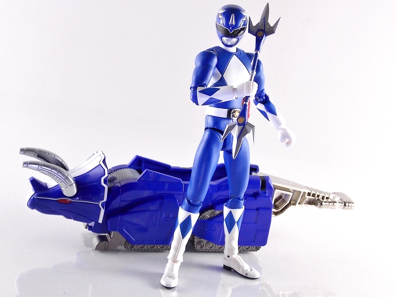 One of the most anticipated S.H. Figuarts of the year has just been released. S.H. Figuarts Tricera Ranger from the classic series Kyoryu Sentai Zyuranger. Or if you're picking up the US release then he's the original Blue Ranger from Mighty Morphin Power Rangers! **Post #2 contains tons of images as well. Check out all of them! Tricera Ranger was just released as a Tamashii Web Exclusive in Japan. A US release by Bluefin is also coming up very very soon. With Tricera Ranger's release the Zyurangers and original Power Rangers are down to just a single pending release to complete each team! The upcoming Tiger Ranger/Yellow Ranger will finally finish off this fantastic set! S.H.Figuarts Tricera Ranger comes packaged in the now standard windowless box style of recent Web Exclusives. But once you have the figure out of the box, you'll never want to put it down. Tricera Ranger is absolutely gorgeous. I said in my previous review of S.H. Figuarts Mammoth Ranger that he was my favorite at that time. Well Tricera ranger has officially knocked him out of that spot. This guy is fantastic. Crisp paint applications, and the perfect shade of blue will make you fall in love with this figure. There's not much more that can be said that I haven't said 5 timesalready with previous Zyuranger galleries. They're all top notch. And this one is a perfect example of the quality of these figures. Accessories Tricera Ranger comes with possibly the most accessories of any of the Zyuranger releases. At least in terms of them being unique. Dan includes 3 alternate sets of hands, two set of open types for weapon holding, and one set of curled knuckle types for fighting stances. He also includes his signature Tricera Lances in two forms, separate and combined short staff. Sadly he does not include an extended version of the staff, but it was used on rare occasions in show. Also included is the traditional Ranger Stick in it's standard form, as well as the combined Ranger Slinger weapon. The rest of Dan's accessories are dedicated to building the Howling Cannon! Beginning with Mammoth Ranger each Zyuranger figuart includes some of the accessories needed to assemble the Howling Cannon. Mammoth included the Ryugekiken and Tricera Lances, Tricera Ranger includes the Ptera Arrow and Sabre Daggers. It should be noted that the axe included with Mammoth Ranger DOES NOT allow you to create the Howling Cannon. He only comes with the axe form of the Mammoth Breaker, not the gun form necessary to complete the Howling Cannon. The Tricera Lances Mammoth Ranger includes are molded in a different size with additional tabs to make the Howling Cannon, so the Lances that come standard with Tricera are not compatible. Likewise the Sabre Daggers which Tricera Ranger comes with are meant for the Howling Cannon and differ from what will be included with the actual S.H. Figuarts Tiger Ranger. The Ptera Arrow included with Tricera is likewise larger and molded with additional tabs to create the cannon, when compared to the one included with Ptera Ranger. This whole thing is meant to ensure that you can display your individual Zyurangers with their weapons AND still be able to create the cannon. Overall If you haven't been impressed yet by the Zyuranger/Power Rangers releases in this line, and this one didn't do the trick, I don't know what will. S.H. Figuarts Tricera Ranger is absolutely perfect, aside from the lance issue which really isn't a big deal to me personally. He's easily the most well constructed of the Zyurangers I own. He includes a plethora of accessories. And damn it all he looks GOOD with sentai blues and other blue toku heroes. Do yourself a favor and pick up this exquisite figure ASAP.