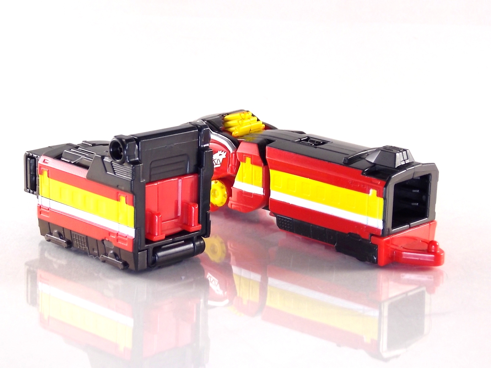 Today we're doubling up with the Ressha EX DX Kyoryuger Ressha & DX Den-Liner Ressha! Both of these unique add-ons for DX ToQ Oh feature prominently in the recent film Heisei Rider Vs. Show Raider: Kamen Rider Taisen Featuring Super Sentai! Each of them is also based on a Legend Hero. To start we have the Kyoryuger Ressha. At first glance it's obvious that this machine is clearly based on Gabutyra from Zyuden Sentai Kyoryuger. Each of these Legend Sentai Resshas so far has been modeled after the main piece of the main mecha from each series. So Gabutyra was the logical choice here. Kyoryuger Ressha is a crisply painted figure with some nice new details added to the generic ressha body. Interestingly Bandai gave it;s mouth the ability to open ever so slightly, though it serves no real purpose. This Ressha as with the Go-Busters one before it is a special 2-car vehicle. the 2nd "car" is merely a hiding spot for the combined mode head which is modeled after Kyoryuzin. Side by side this head with the real deal are a much closer match than the Go-Busters Ressha compared to Go-Buster Ace. Though due to the transformation they still don't have the natural feel the suits on film do. When combined in place of Red Ressha, ToQ Oh Kyoryuzin is formed! Sadly this Ressha does include Kyoryuzin's sword the Goren Zyudenken. However you can borrow a Zyudenken from your DX Kyoryuzin to complete the look. It's a tight fit but DX ToQ Oh can hold the sword! Den-Liner Ressha is next. If the name didn't give it away this Legend Rider Ressha is based on the Den-Liner vehicle from Kamen Rider Den-O! Easily the most intelligent merchandise induced crossover sentai has done, mixing two train themed heroes was a no brainer. Though Den-Liner Ressha comes off a bit simplistic. Seeing as these parts are merely replacements for the lower legs of DX ToQ Oh there isn't much to say. Each car faithfully replicates the look of Den-Liner at this much smaller scale. I've attached an image of the DX (gold ver.) Den-Liner to compare it to the size of the original. There's quite the difference between them. When combined with just ToQ Oh you create ToQ Oh Den-Liner. But when used simultaneously with Kyoryuger Ressha, ToQ Oh Kyoryuzin featuring Den-Liner is formed! This form being a fun inversion of the title of the movie itself. These new legs also happen to feature the same mounting clips that the standard Blue & Green Resshas do. So if you're in the mood to mix and match there are plenty of options. I messed around and came up with Cho ToQ Oh Kyoryuzin featuring Den-Liner. A mouthful but still fun to look at.