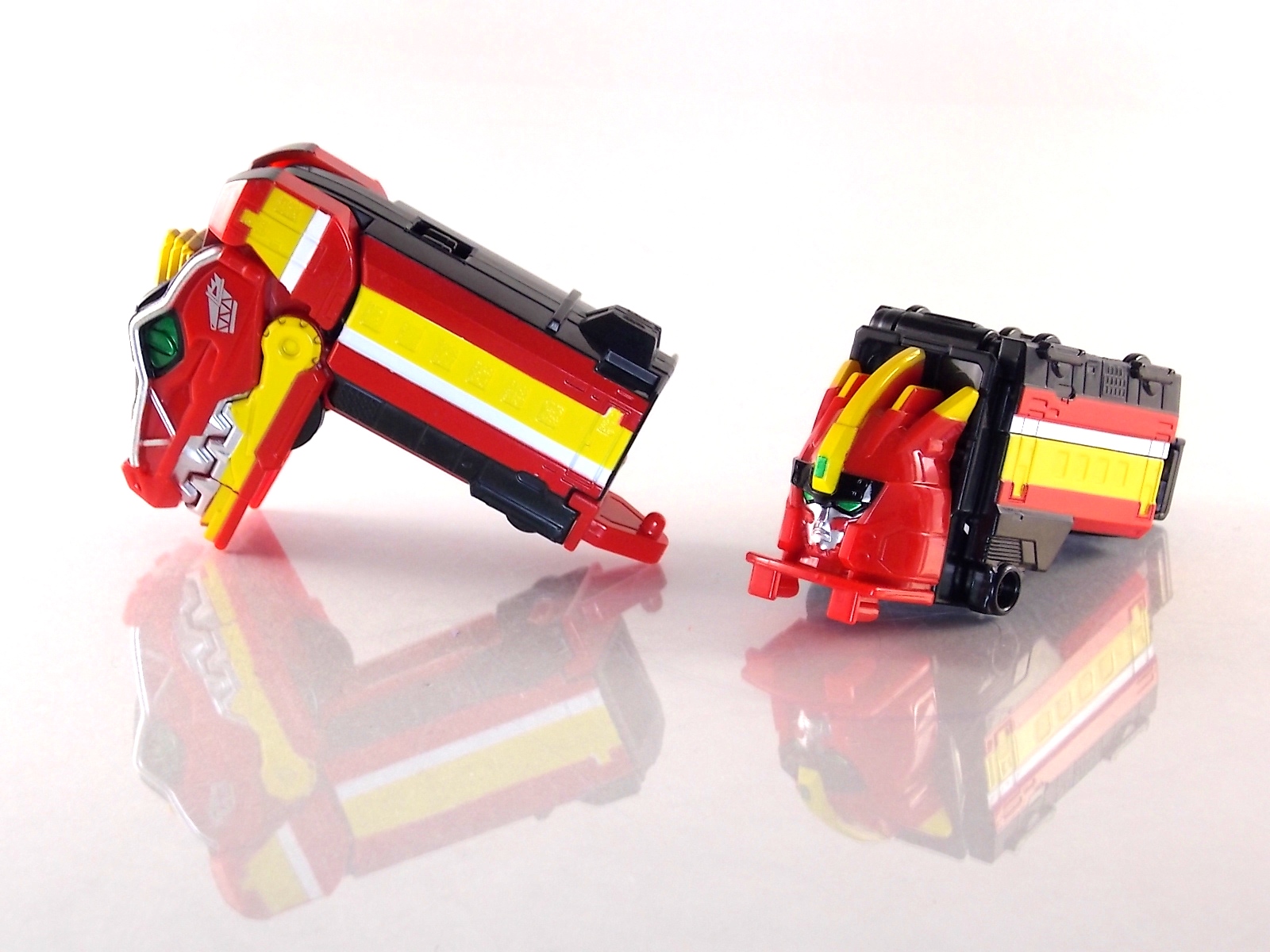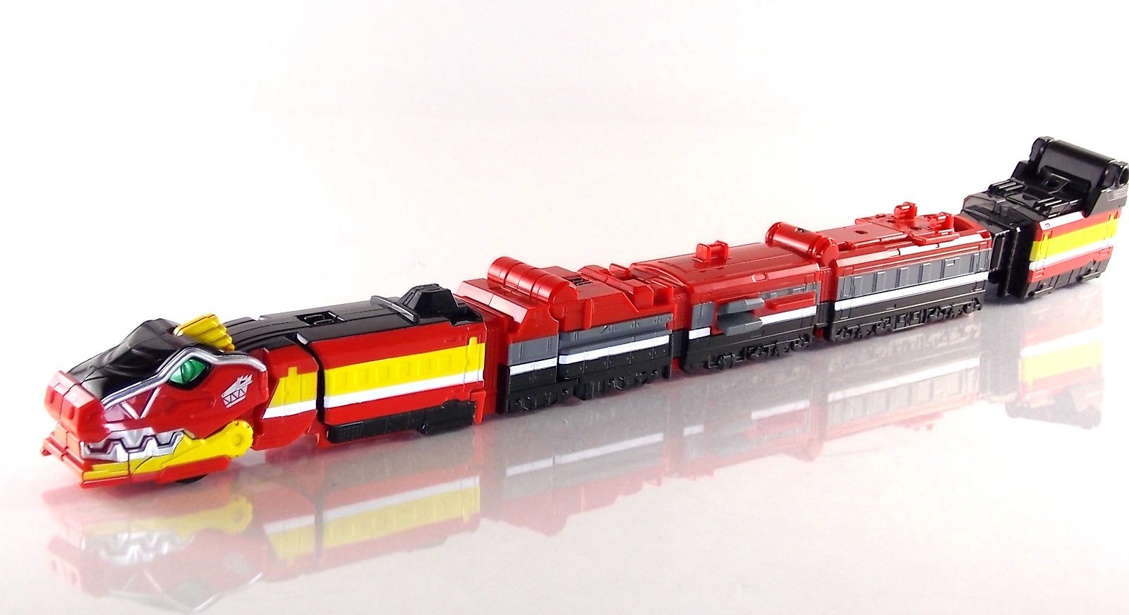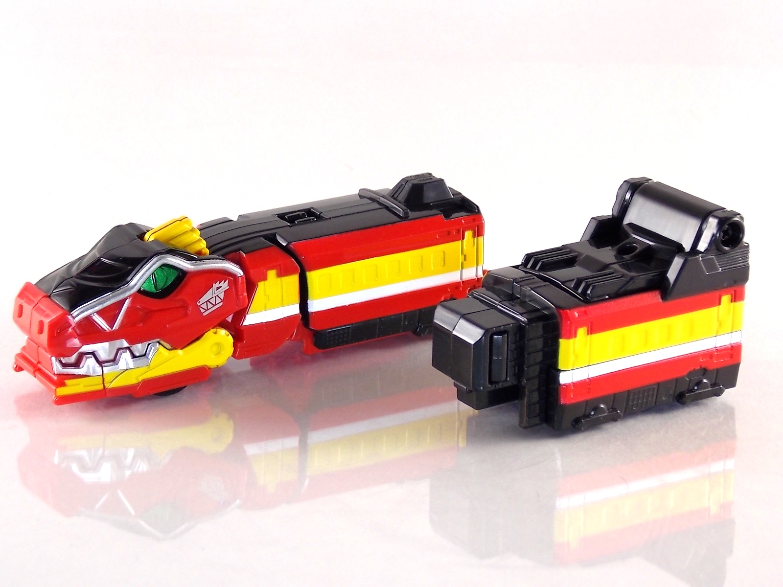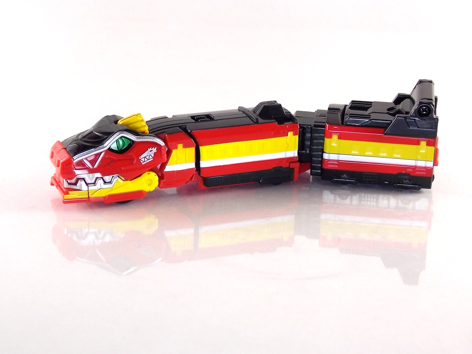 Today we're doubling up with the Ressha EX DX Kyoryuger Ressha & DX Den-Liner Ressha! Both of these unique add-ons for DX ToQ Oh feature prominently in the recent film Heisei Rider Vs. Show Raider: Kamen Rider Taisen Featuring Super Sentai! Each of them is also based on a Legend Hero. To start we have the Kyoryuger Ressha. At first glance it's obvious that this machine is clearly based on Gabutyra from Zyuden Sentai Kyoryuger. Each of these Legend Sentai Resshas so far has been modeled after the main piece of the main mecha from each series. So Gabutyra was the logical choice here. Kyoryuger Ressha is a crisply painted figure with some nice new details added to the generic ressha body. Interestingly Bandai gave it;s mouth the ability to open ever so slightly, though it serves no real purpose. This Ressha as with the Go-Busters one before it is a special 2-car vehicle. the 2nd "car" is merely a hiding spot for the combined mode head which is modeled after Kyoryuzin. Side by side this head with the real deal are a much closer match than the Go-Busters Ressha compared to Go-Buster Ace. Though due to the transformation they still don't have the natural feel the suits on film do. When combined in place of Red Ressha, ToQ Oh Kyoryuzin is formed! Sadly this Ressha does include Kyoryuzin's sword the Goren Zyudenken. However you can borrow a Zyudenken from your DX Kyoryuzin to complete the look. It's a tight fit but DX ToQ Oh can hold the sword! Den-Liner Ressha is next. If the name didn't give it away this Legend Rider Ressha is based on the Den-Liner vehicle from Kamen Rider Den-O! Easily the most intelligent merchandise induced crossover sentai has done, mixing two train themed heroes was a no brainer. Though Den-Liner Ressha comes off a bit simplistic. Seeing as these parts are merely replacements for the lower legs of DX ToQ Oh there isn't much to say. Each car faithfully replicates the look of Den-Liner at this much smaller scale. I've attached an image of the DX (gold ver.) Den-Liner to compare it to the size of the original. There's quite the difference between them. When combined with just ToQ Oh you create ToQ Oh Den-Liner. But when used simultaneously with Kyoryuger Ressha, ToQ Oh Kyoryuzin featuring Den-Liner is formed! This form being a fun inversion of the title of the movie itself. These new legs also happen to feature the same mounting clips that the standard Blue & Green Resshas do. So if you're in the mood to mix and match there are plenty of options. I messed around and came up with Cho ToQ Oh Kyoryuzin featuring Den-Liner. A mouthful but still fun to look at.