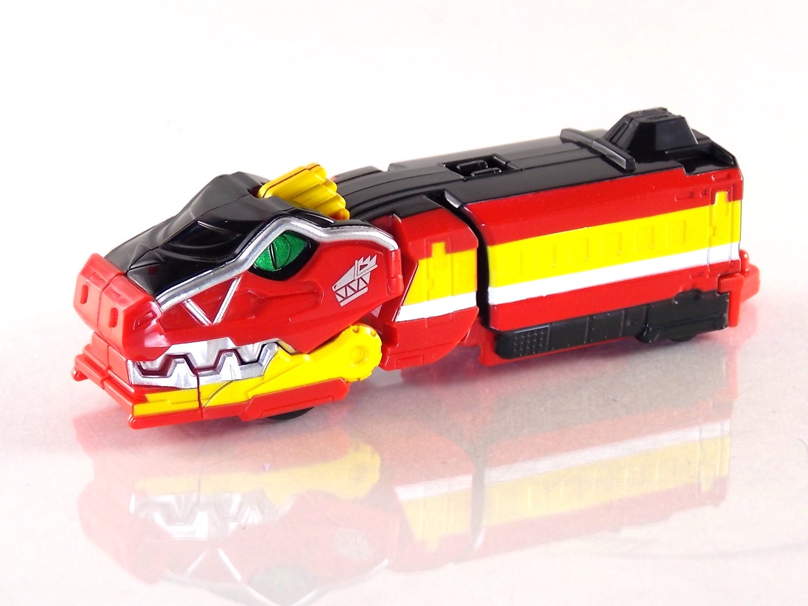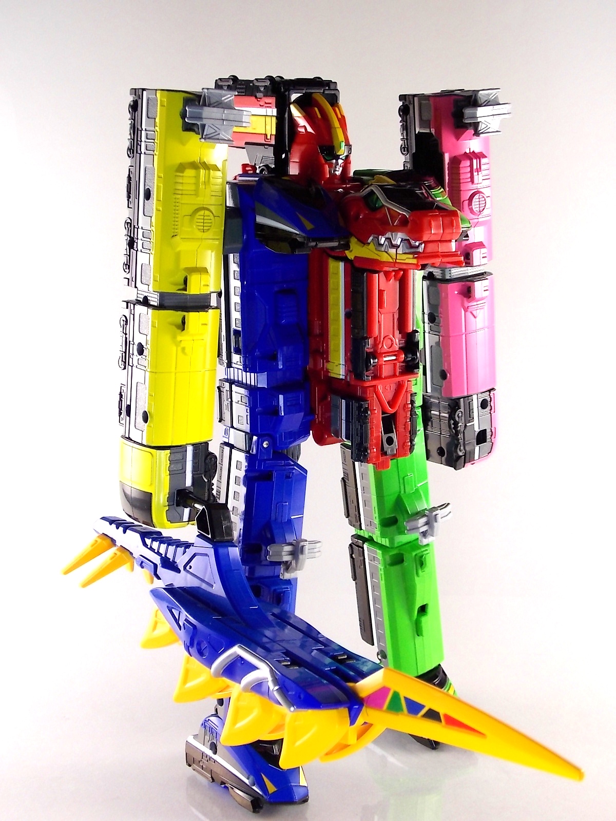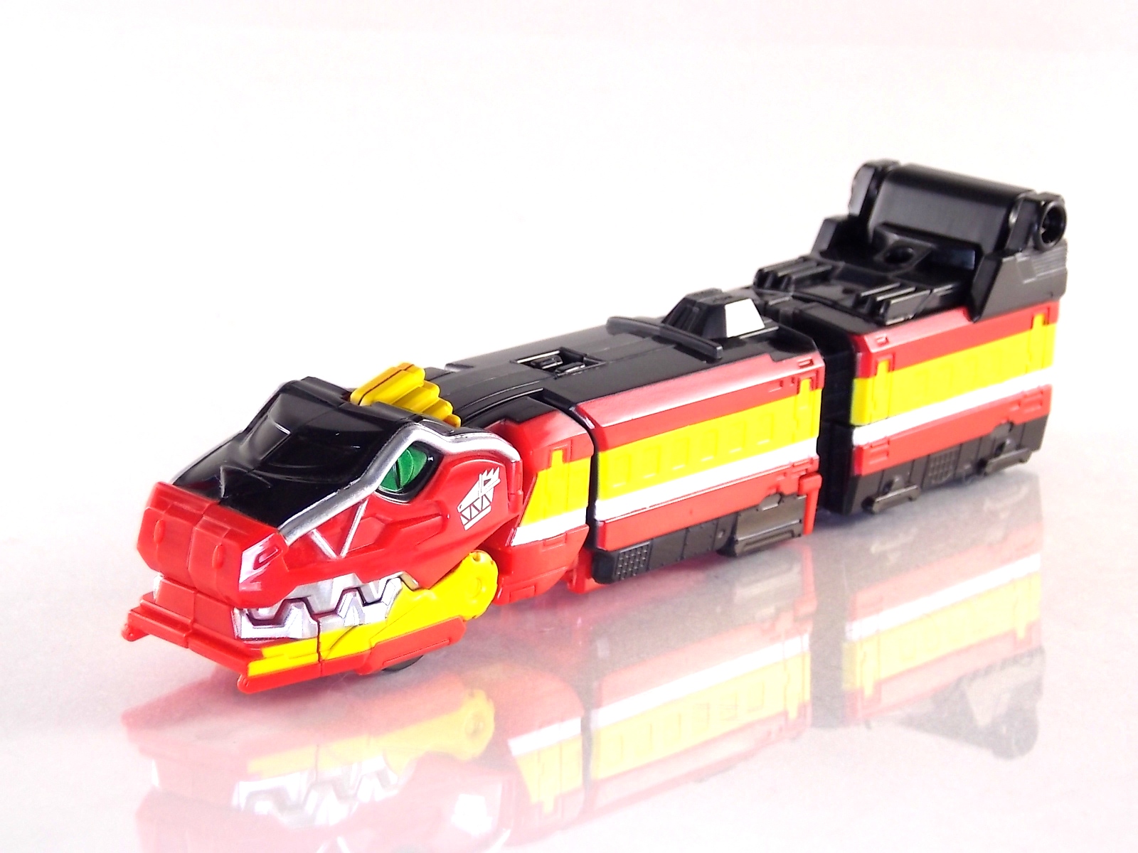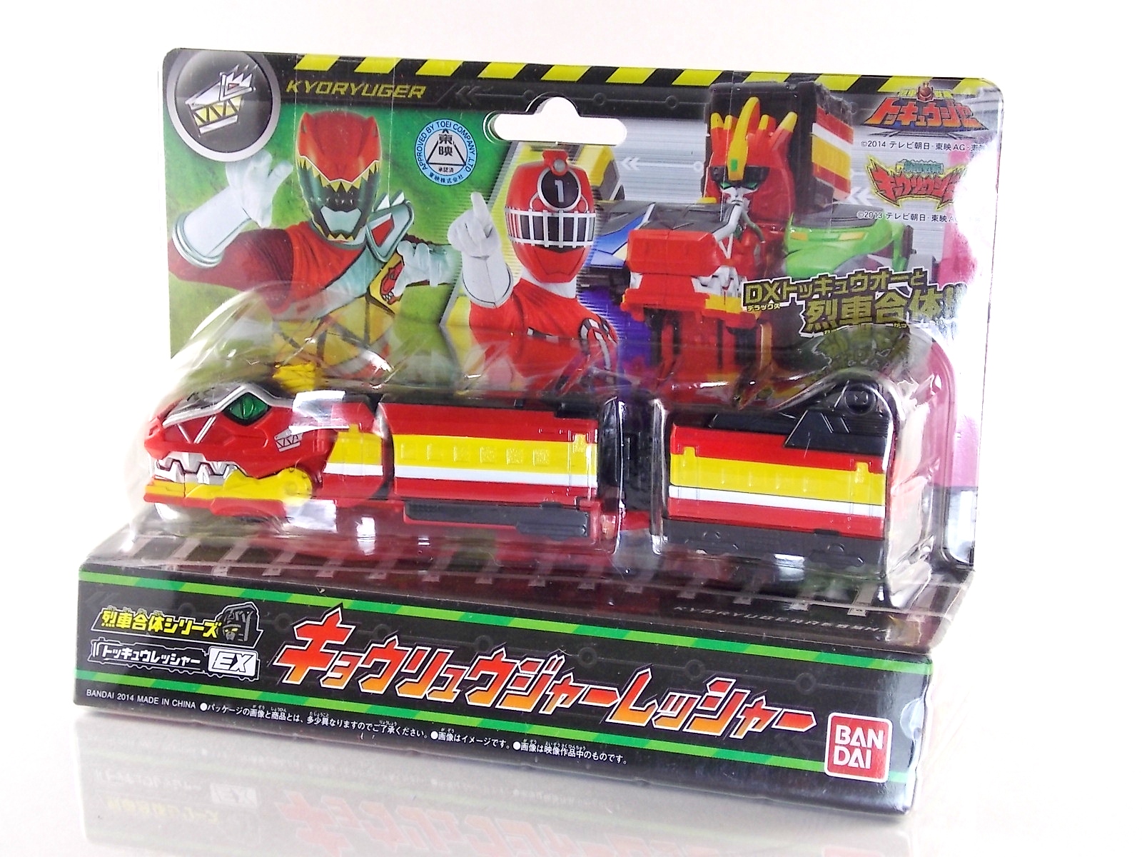 Today we're doubling up with the Ressha EX DX Kyoryuger Ressha & DX Den-Liner Ressha! Both of these unique add-ons for DX ToQ Oh feature prominently in the recent film Heisei Rider Vs. Show Raider: Kamen Rider Taisen Featuring Super Sentai! Each of them is also based on a Legend Hero. To start we have the Kyoryuger Ressha. At first glance it's obvious that this machine is clearly based on Gabutyra from Zyuden Sentai Kyoryuger. Each of these Legend Sentai Resshas so far has been modeled after the main piece of the main mecha from each series. So Gabutyra was the logical choice here. Kyoryuger Ressha is a crisply painted figure with some nice new details added to the generic ressha body. Interestingly Bandai gave it;s mouth the ability to open ever so slightly, though it serves no real purpose. This Ressha as with the Go-Busters one before it is a special 2-car vehicle. the 2nd "car" is merely a hiding spot for the combined mode head which is modeled after Kyoryuzin. Side by side this head with the real deal are a much closer match than the Go-Busters Ressha compared to Go-Buster Ace. Though due to the transformation they still don't have the natural feel the suits on film do. When combined in place of Red Ressha, ToQ Oh Kyoryuzin is formed! Sadly this Ressha does include Kyoryuzin's sword the Goren Zyudenken. However you can borrow a Zyudenken from your DX Kyoryuzin to complete the look. It's a tight fit but DX ToQ Oh can hold the sword! Den-Liner Ressha is next. If the name didn't give it away this Legend Rider Ressha is based on the Den-Liner vehicle from Kamen Rider Den-O! Easily the most intelligent merchandise induced crossover sentai has done, mixing two train themed heroes was a no brainer. Though Den-Liner Ressha comes off a bit simplistic. Seeing as these parts are merely replacements for the lower legs of DX ToQ Oh there isn't much to say. Each car faithfully replicates the look of Den-Liner at this much smaller scale. I've attached an image of the DX (gold ver.) Den-Liner to compare it to the size of the original. There's quite the difference between them. When combined with just ToQ Oh you create ToQ Oh Den-Liner. But when used simultaneously with Kyoryuger Ressha, ToQ Oh Kyoryuzin featuring Den-Liner is formed! This form being a fun inversion of the title of the movie itself. These new legs also happen to feature the same mounting clips that the standard Blue & Green Resshas do. So if you're in the mood to mix and match there are plenty of options. I messed around and came up with Cho ToQ Oh Kyoryuzin featuring Den-Liner. A mouthful but still fun to look at.