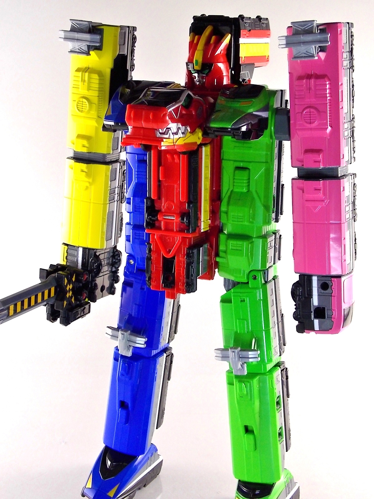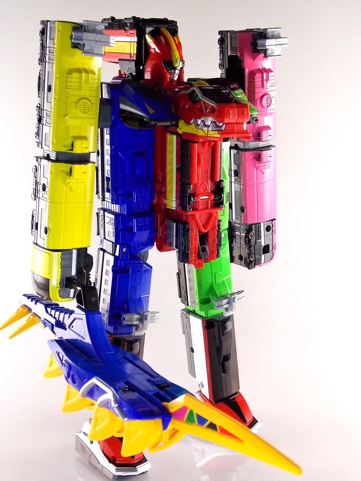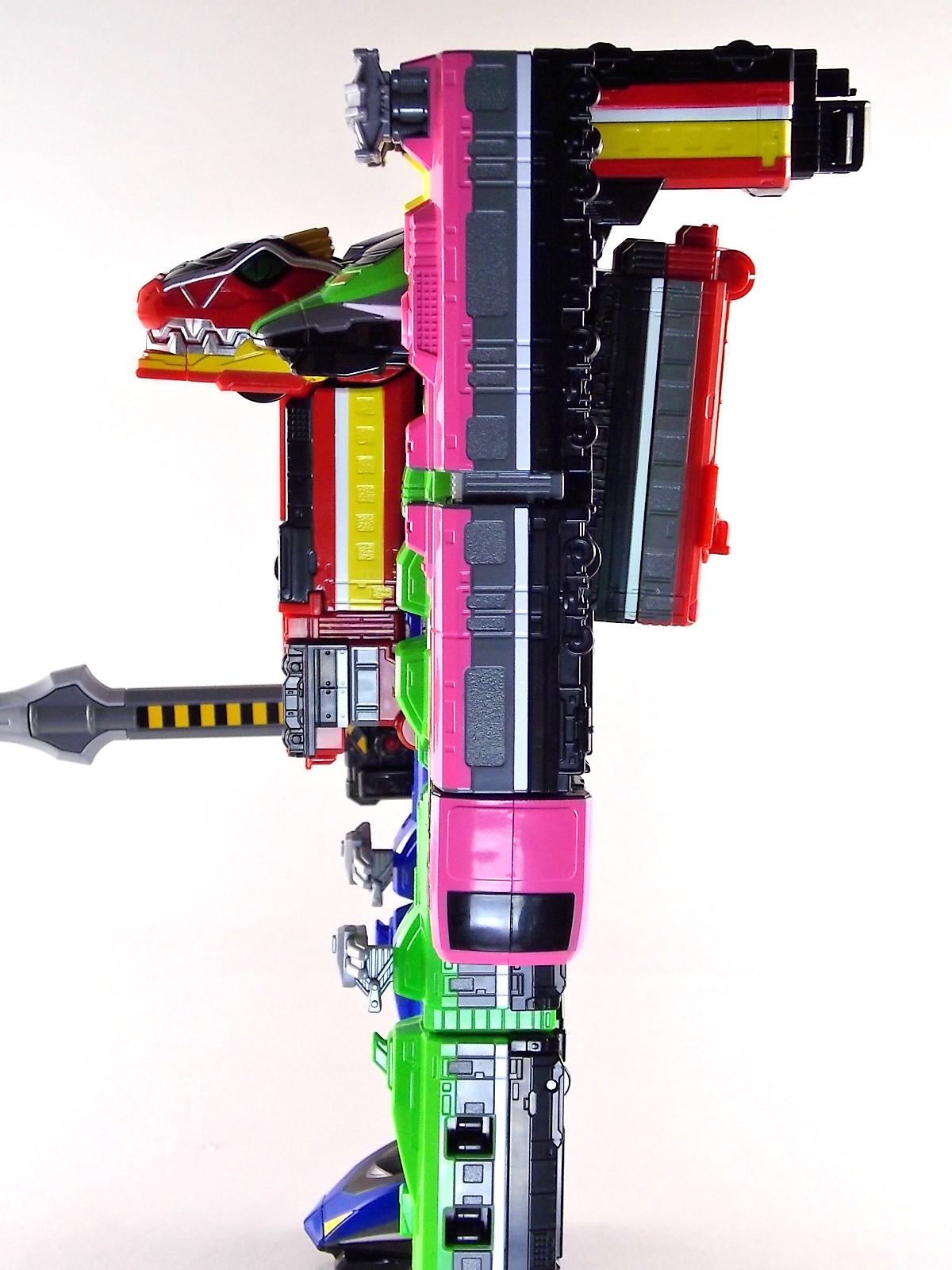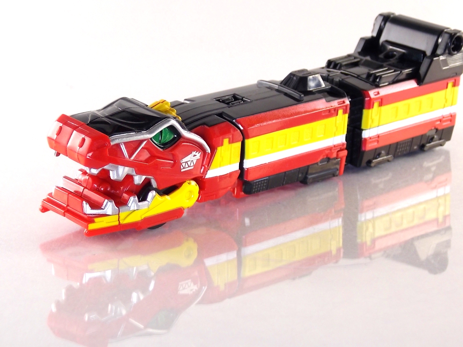 Today we're doubling up with the Ressha EX DX Kyoryuger Ressha & DX Den-Liner Ressha! Both of these unique add-ons for DX ToQ Oh feature prominently in the recent film Heisei Rider Vs. Show Raider: Kamen Rider Taisen Featuring Super Sentai! Each of them is also based on a Legend Hero. To start we have the Kyoryuger Ressha. At first glance it's obvious that this machine is clearly based on Gabutyra from Zyuden Sentai Kyoryuger. Each of these Legend Sentai Resshas so far has been modeled after the main piece of the main mecha from each series. So Gabutyra was the logical choice here. Kyoryuger Ressha is a crisply painted figure with some nice new details added to the generic ressha body. Interestingly Bandai gave it;s mouth the ability to open ever so slightly, though it serves no real purpose. This Ressha as with the Go-Busters one before it is a special 2-car vehicle. the 2nd "car" is merely a hiding spot for the combined mode head which is modeled after Kyoryuzin. Side by side this head with the real deal are a much closer match than the Go-Busters Ressha compared to Go-Buster Ace. Though due to the transformation they still don't have the natural feel the suits on film do. When combined in place of Red Ressha, ToQ Oh Kyoryuzin is formed! Sadly this Ressha does include Kyoryuzin's sword the Goren Zyudenken. However you can borrow a Zyudenken from your DX Kyoryuzin to complete the look. It's a tight fit but DX ToQ Oh can hold the sword! Den-Liner Ressha is next. If the name didn't give it away this Legend Rider Ressha is based on the Den-Liner vehicle from Kamen Rider Den-O! Easily the most intelligent merchandise induced crossover sentai has done, mixing two train themed heroes was a no brainer. Though Den-Liner Ressha comes off a bit simplistic. Seeing as these parts are merely replacements for the lower legs of DX ToQ Oh there isn't much to say. Each car faithfully replicates the look of Den-Liner at this much smaller scale. I've attached an image of the DX (gold ver.) Den-Liner to compare it to the size of the original. There's quite the difference between them. When combined with just ToQ Oh you create ToQ Oh Den-Liner. But when used simultaneously with Kyoryuger Ressha, ToQ Oh Kyoryuzin featuring Den-Liner is formed! This form being a fun inversion of the title of the movie itself. These new legs also happen to feature the same mounting clips that the standard Blue & Green Resshas do. So if you're in the mood to mix and match there are plenty of options. I messed around and came up with Cho ToQ Oh Kyoryuzin featuring Den-Liner. A mouthful but still fun to look at.