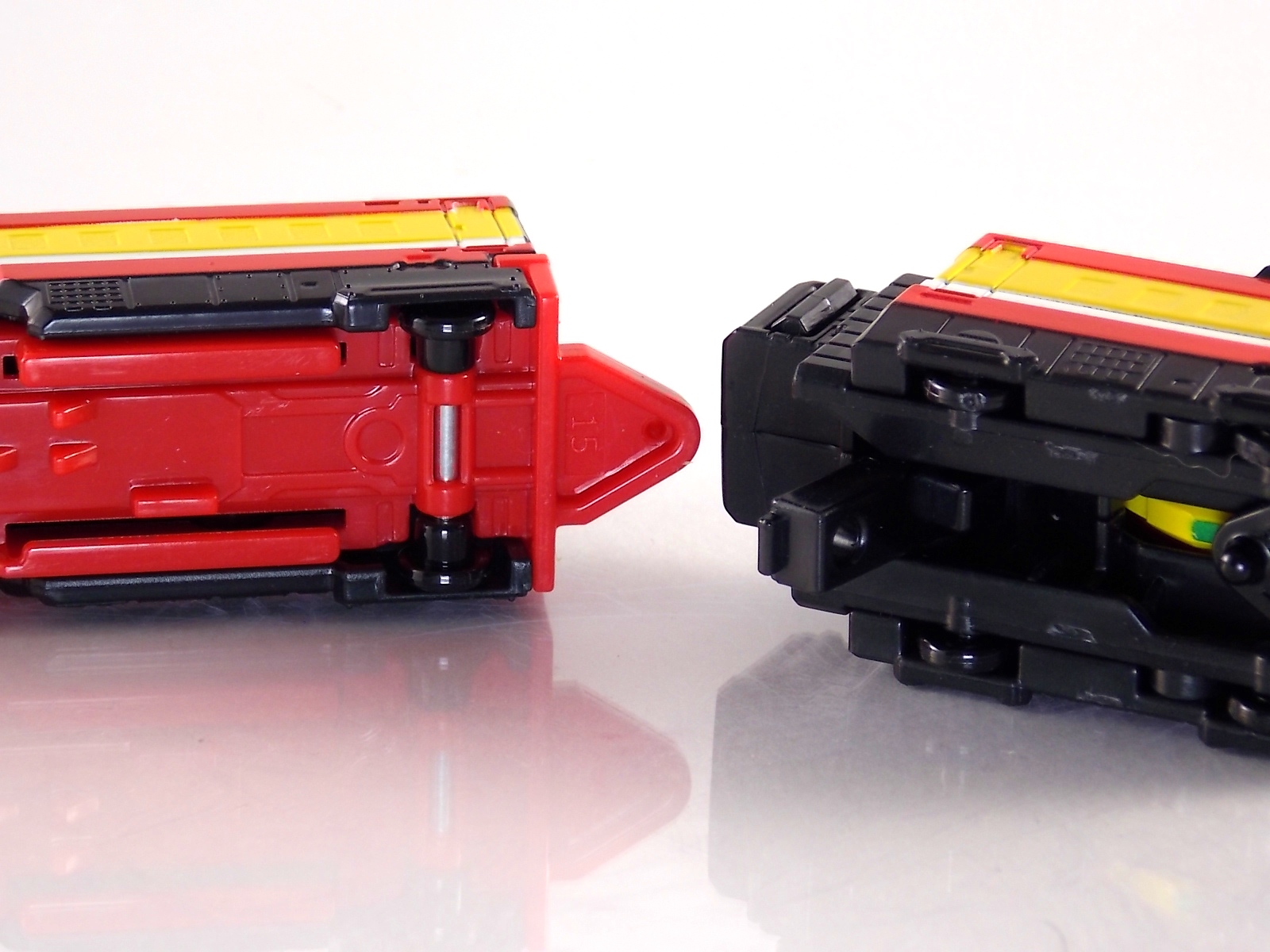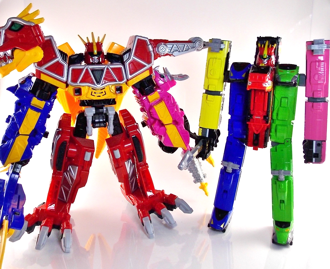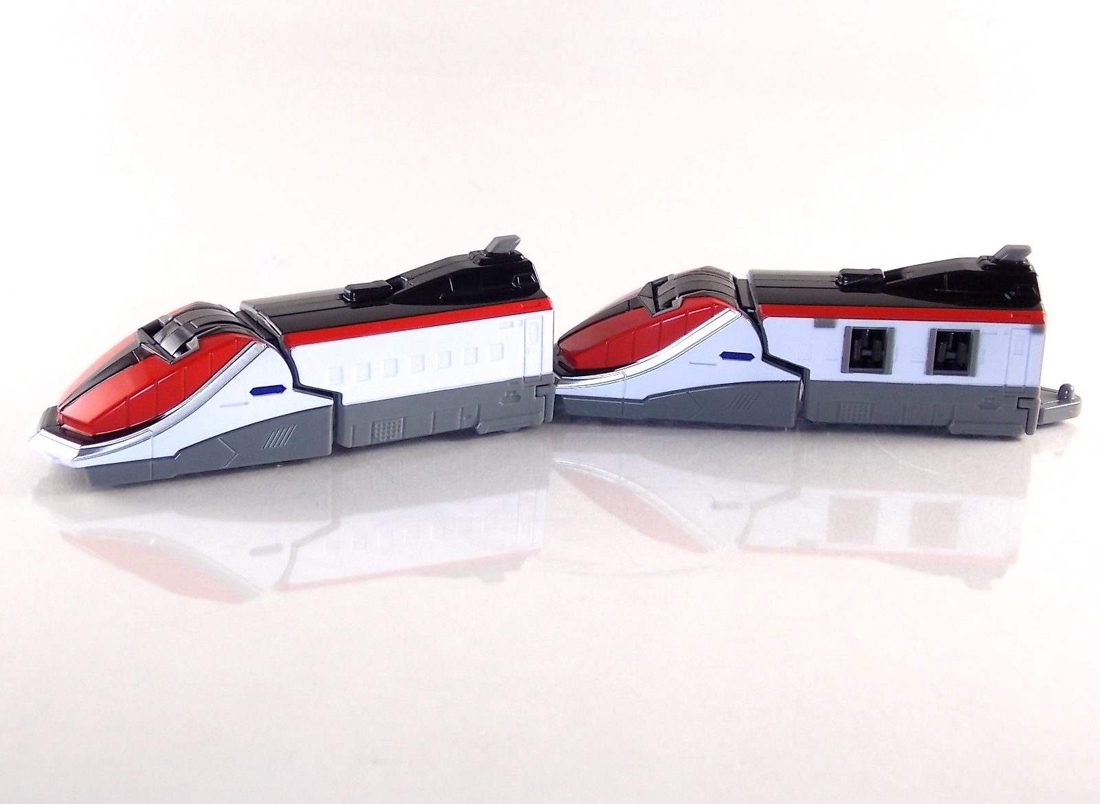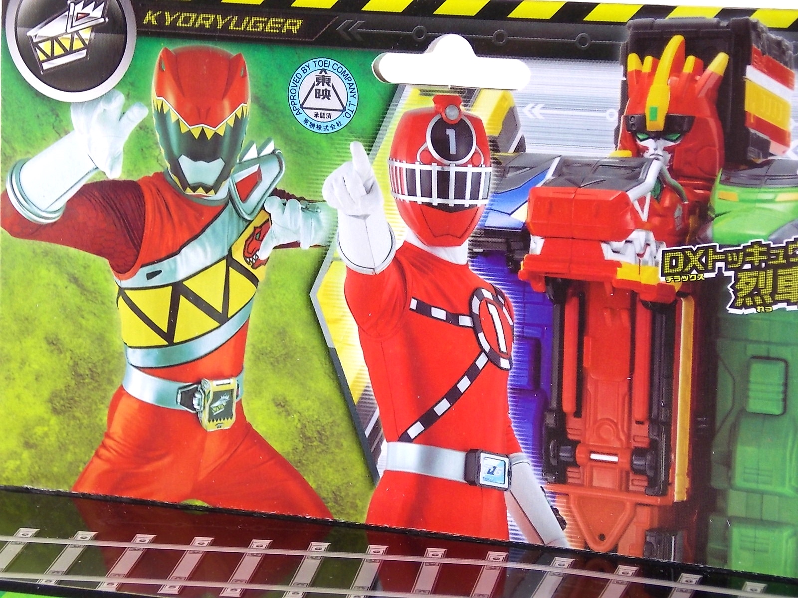 Today we're doubling up with the Ressha EX DX Kyoryuger Ressha & DX Den-Liner Ressha! Both of these unique add-ons for DX ToQ Oh feature prominently in the recent film Heisei Rider Vs. Show Raider: Kamen Rider Taisen Featuring Super Sentai! Each of them is also based on a Legend Hero. To start we have the Kyoryuger Ressha. At first glance it's obvious that this machine is clearly based on Gabutyra from Zyuden Sentai Kyoryuger. Each of these Legend Sentai Resshas so far has been modeled after the main piece of the main mecha from each series. So Gabutyra was the logical choice here. Kyoryuger Ressha is a crisply painted figure with some nice new details added to the generic ressha body. Interestingly Bandai gave it;s mouth the ability to open ever so slightly, though it serves no real purpose. This Ressha as with the Go-Busters one before it is a special 2-car vehicle. the 2nd "car" is merely a hiding spot for the combined mode head which is modeled after Kyoryuzin. Side by side this head with the real deal are a much closer match than the Go-Busters Ressha compared to Go-Buster Ace. Though due to the transformation they still don't have the natural feel the suits on film do. When combined in place of Red Ressha, ToQ Oh Kyoryuzin is formed! Sadly this Ressha does include Kyoryuzin's sword the Goren Zyudenken. However you can borrow a Zyudenken from your DX Kyoryuzin to complete the look. It's a tight fit but DX ToQ Oh can hold the sword! Den-Liner Ressha is next. If the name didn't give it away this Legend Rider Ressha is based on the Den-Liner vehicle from Kamen Rider Den-O! Easily the most intelligent merchandise induced crossover sentai has done, mixing two train themed heroes was a no brainer. Though Den-Liner Ressha comes off a bit simplistic. Seeing as these parts are merely replacements for the lower legs of DX ToQ Oh there isn't much to say. Each car faithfully replicates the look of Den-Liner at this much smaller scale. I've attached an image of the DX (gold ver.) Den-Liner to compare it to the size of the original. There's quite the difference between them. When combined with just ToQ Oh you create ToQ Oh Den-Liner. But when used simultaneously with Kyoryuger Ressha, ToQ Oh Kyoryuzin featuring Den-Liner is formed! This form being a fun inversion of the title of the movie itself. These new legs also happen to feature the same mounting clips that the standard Blue & Green Resshas do. So if you're in the mood to mix and match there are plenty of options. I messed around and came up with Cho ToQ Oh Kyoryuzin featuring Den-Liner. A mouthful but still fun to look at.