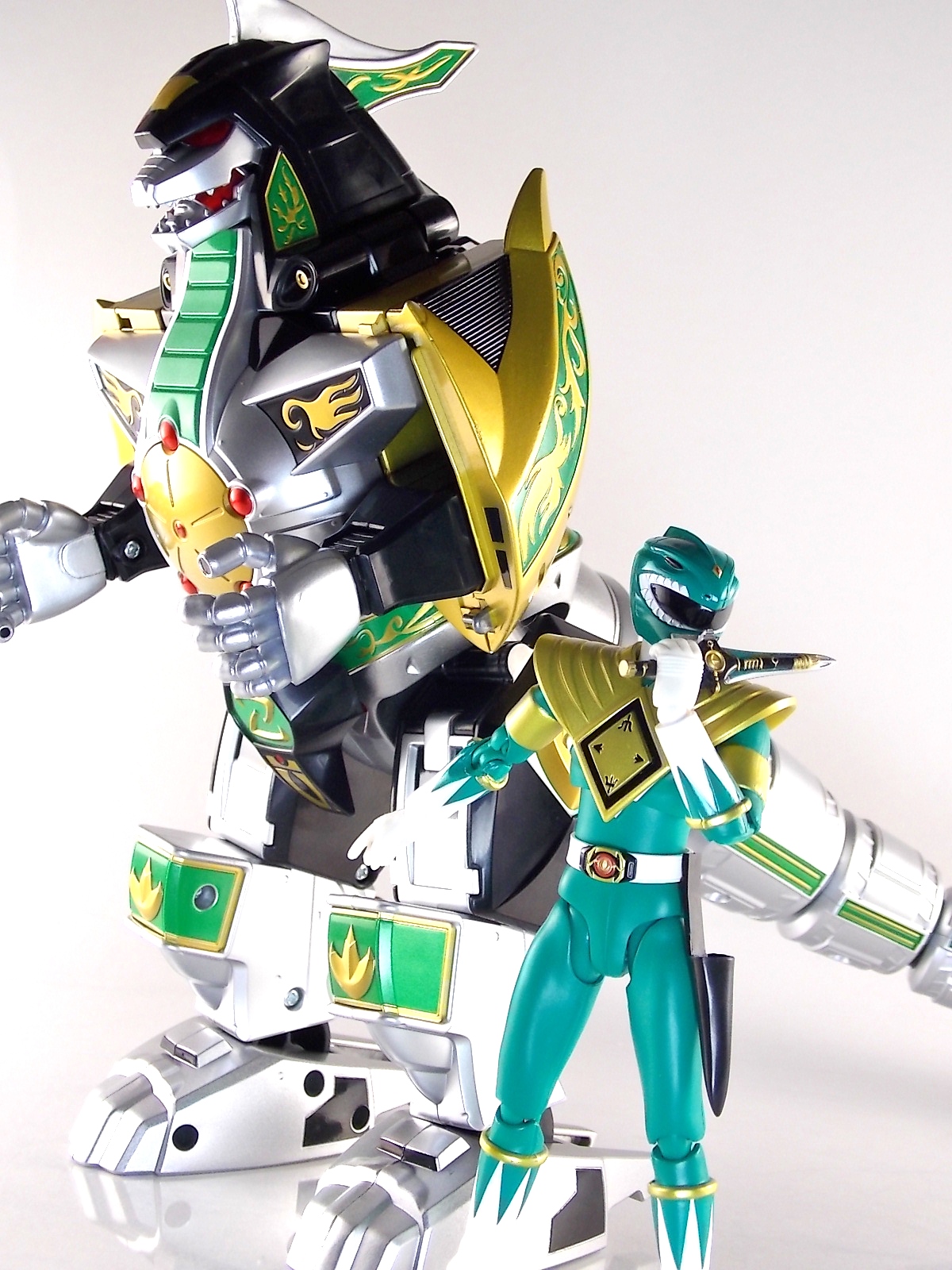 After a long long wait, we finally have our hands on the Legacy Dragonzord to review and gallery for your viewing pleasure! Read on to check out TokuNation's full assessment of this highly sought after itme! **Post #2 contains additional images. Comparison images of Original & Legacy Dragonzord's courtesy of Photo & Content staff member ThatRangerGuy! Packaging Continuing the trend begun by the Legacy Megazord, the Legacy Dragonzord is presented in a vintage style Mighty Morphin Power Rangers box. Right down to the recap of the Power Rangers origin story, the Dragonzord's stats and the "power of the Dinozords" this awesome box screams 90's. Dragonzord Mode By far the most iconic form of this mechanical beast is it's Dragonzord mode. This form of course shares some notable design cues with the classic Toho beast Godzilla or rather Dragonzord's source footage counterpart Dragon Caesar does. In this form though Dragonzord is a lean mean fighting machine. When looking at this form versus the original DX Dragonzord or Dragon Caesar it's clear Bandai of America was striving to improve the proportions of the figure. And for the most part they succeeded. The features of the machine have been streamlined to give it a more realistic type of body (as real as a mechanical lizard can be). The legs splay out a bit more naturally, the shoulder fold out, the tail's been given articulation, the hands on wrist joints for added motion, they even included a swappable set of "motion" hands. They really tried to throw in the kitchen sink here. But at least one issue exists, the diecast content. Now the diecast for a lot of fans is a selling point of this toy. It hearkens back to an age when toys were made with some degree of sternness that's missing in today's standards. In Dragonzord's case it can be an issue though. The entire toy isn't metal, but there is enough of it to make it hard to balance this guy sometimes. The hip joints aren't particularly strong to begin, so he leans forward a bit with the added diecast content of the figure. Luckily the feet are also solid chunks so that helps to offset it. The tail is also fairly hefty despite being all plastic so that helps too. The tail itself is articulated between each section, it's actually pretty fantastic how articulated it is. But to be perfectly honest the tail is absurdly long when used in any way other than in Dragonzord mode. And while it is articulated it could have used a little higher degree of motion, it makes it a bit hard to display this guy on a shelf with how far back the tail points. Also of note though is a positive. And that's the lavish paint applications. No stickers here. Unlike the Legacy Megazord this guy is 100% painted. While some of these applications are a tad splotchy in places on mine, they look nice overall. No stickers could ever accomplish the level of detail these paint apps do. The painted silver and gold looks especially nice, and there's a great vibrant green used here as well. Overall this mode is a winner, compared to the original at face value this one does look better, minor height issues aside. But then again when do Sentai or Power Rangers mecha ever scale properly when next to each other? Dragonzord Battle Mode The scarcely seen yet beloved Dragonzord Battle Mode. This form is achieved thanks to combining the Dragonzord with the Mastodon, Sabertooth Tiger, and Tricertops Dino Zords. The 2010 Megazord and/or the Legacy Megazord are completely compatible. To create this form you physically need to split the Dragonzord in half, remove the chest piece, and remove the tail. Then plug the 2 halves back together, fold the shoulder around to make the new chest. Pull the Dragonzords mouth down to reveal Battle Mode's face, doing so well release the spring holding the Dragonzord's red eyes in place as well making them "dormant". No here's where this thing starts to lose out to the original. To make the legs compatible with the Legacy Megazord the Zord Builder system had to be incorporated into this figure. So there are pegs on the back of the legs to combined with the Megazords legs. To get to them you need to fold up and open the thigh panels on the Dragonzord and then rotate it's knees up into the open space. Unfortunately there is no locking mechanism whatsoever for these joints. If you plan to create Battle Mode you have to be very careful when moving this toy. The legs will fall out without a moment's notice as soon as you pick this guy up. Sadly the legs are just far too heavy, way too much diecast, for them to stay in place. And no clip or lock was implemented to keep them in place. Another issue you may notice is the way the complete legs now look. The new knees look marvelous. But because of the way the 2010/Legacy Megazord was designed with a more opened leg stance where they angle in, here the toy looks very odd. The lower legs bend inward as intended, but the Dragonzord wasn't designed with that aesthetic in mind so the upper legs appear more rigid and robotic compared to the more dynamic lower halves. The finished product does look nice. If you can forget for a moment the previous issues. It's a great shelf piece. However the Diecast present above the knees makes this figure a precarious one to balance on your shelf. Mine leans forward just enough for me not to pose it at all without it's Power Staff. On that topic a separate staff stand is included to combine with the chest piece and tail you removed earlier. You simply need to plug the staff into the chest, collapse the tail joints down, and fold out the hand peg. The main issue here is again the absurd length of the tail which results in a staff nearly twice the height of the actual figure. The staff base is also not even on all 4 prongs, so balancing it at all without the Dragonzord holding it isn't possible, it has to be held to be displayed upright. Luckily the staff gives the figure the added balance it needs to overcome the weight issues it has in this 