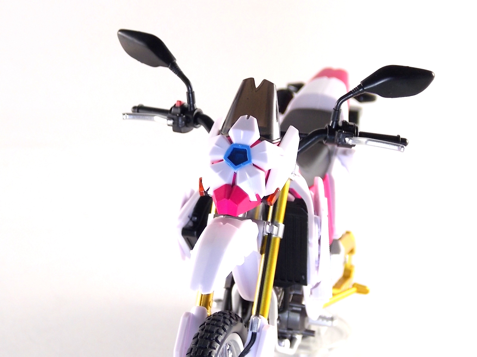 S.H. Figuarts Kamen Rider Gaim came out last month and what an excellent figure he was. But this month a companion piece to that figure has been released. A rider without a ride is no rider at all! But luckily Gaim has one in the form of S.H. Figuarts Sakura Hurricane! This bike is the first vehicle released in the SHF line for Kamen Rider Gaim. So as an initial outing for Gaim, how does it stack up to previous rider bikes? Read on! The Sakura Hurricane is, as the name implies, a flower themed bike based on the sakura/cherry blossom iconic to Japan. Thus far each of the vehicles featured in Gaim are in fact all based on flowers of one type or another. Though the theme isn't overt it's clearly there. The bike itself is pretty gorgeous though. It certainly has a "premium" paint job when compared to the "dx" style Lock vehicles released in the Gaim main toyline. When compared to the Lock Vehicle version this Sakura Hurricane is far far nicer. Clearly each of these lines is aimed at an entirely different market so there should be differences. And clearly the SHF doesn't have the transformation gimmick, nor the compatibility with other DX toys in the line such as the Sengoku Driver. What it does have going for it is an excellent paint job and a fantastic sculpt that makes it stand out even among other more recent SHF bikes. And as has become tradition with S.H. Figuarts rider bikes they include generally only a few accessories. In this case a clear wheel stand for the bike and a replaceable set of handlebars and mirrors. It would seem these are a just in case type of accessory, something you might need if you break these fragile little parts. Clearly Gaim looks like he was born to be on this bike. It was made for him! If the other Gaim related bikes in the line are at all similar to this release then they'll be nothing but must owns for me personally. They may not do a lot, but when do SHF rider bikes ever do an amazing number of things other than look like a sweet rider? I'd recommend getting this if you're a completionist like me and really want to see Gaim on his bike, but if you can live without it it's also probably best to go with that instinct.