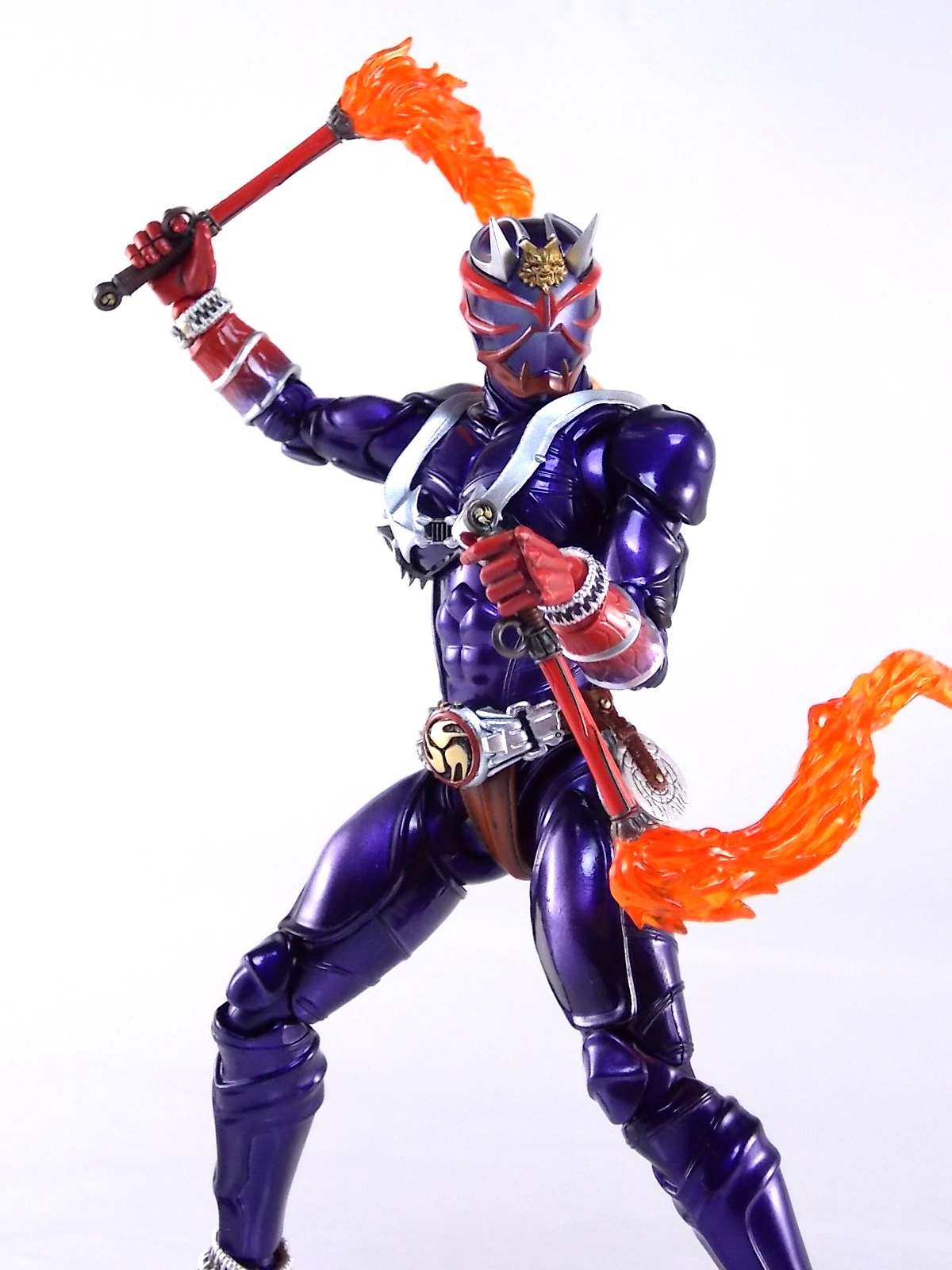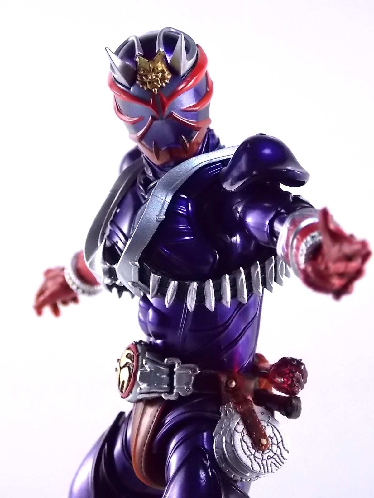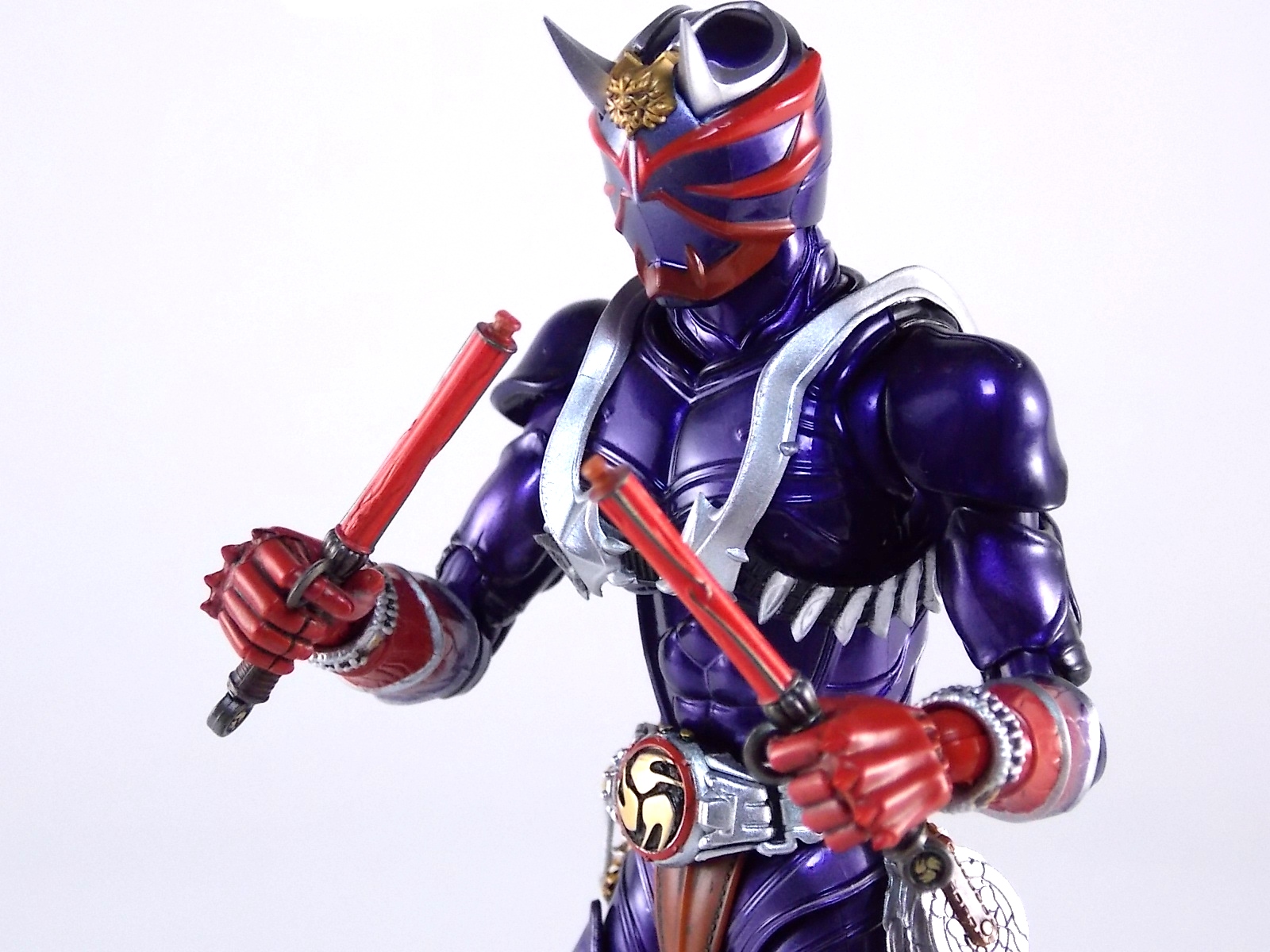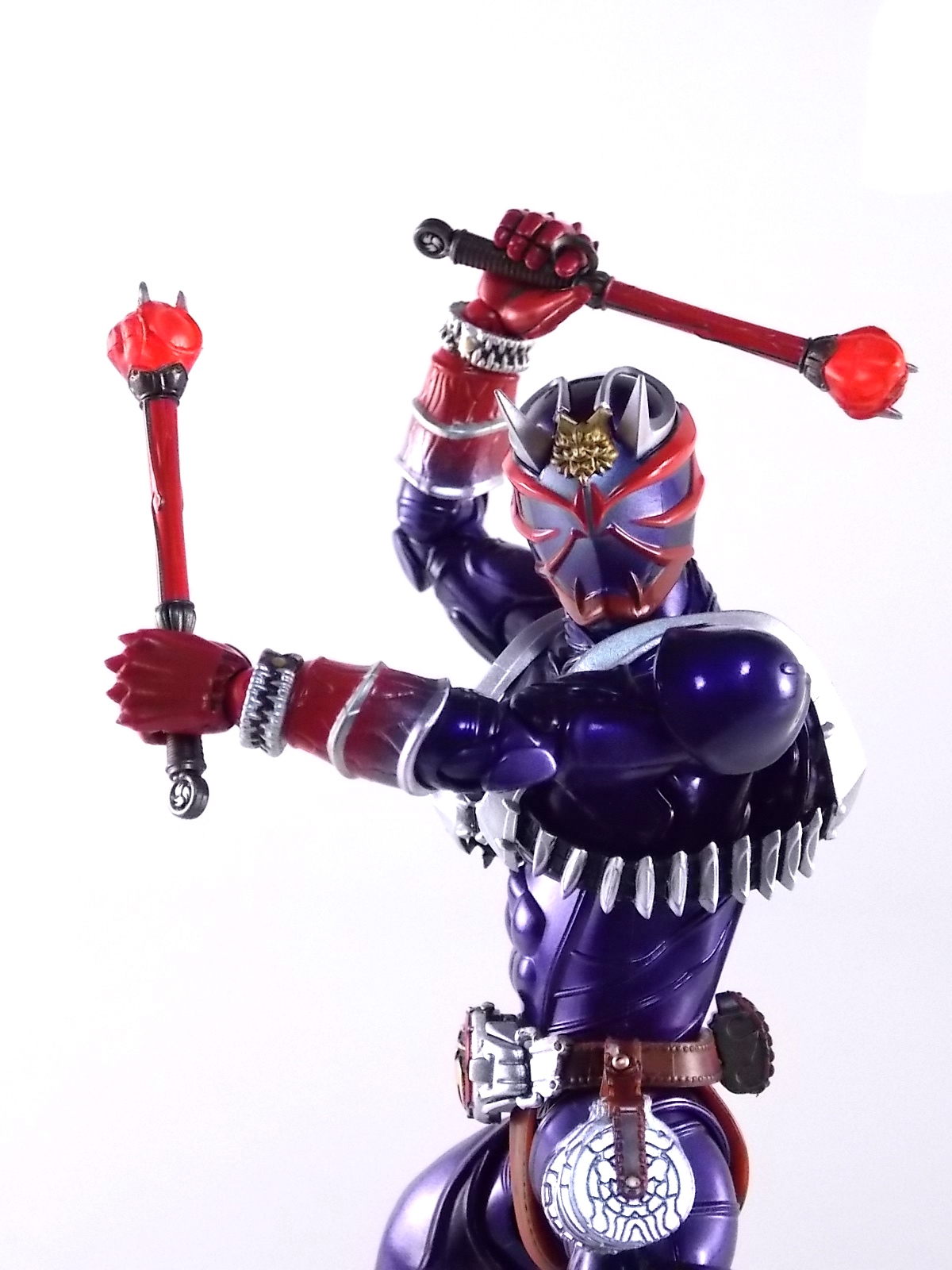 A long time coming, S.H. Figuarts Kamen Rider Hibiki finally makes his appearance! After many years of this line continuing without all the main riders, we're one step closer to having them all! Released in the same premium style as the recent S.H. Figuarts Kabuto Renewal Hibiki aims to deliver an incredible product and for the most part it succeeds. Let's take a look at exactly what this figure is like. Post #1 contains 40 images with over 30 more in post #2! Packaging S.H. Figuarts Hibiki comes in identical packaging to Renewal Kabuto. The exact same type of rectangular box, with stacked white plastic trays. It's a little odd that Hibiki would be given the same premium treatment Renewal Kabuto was, considering this is the first SHF Hibiki to be made. So far these two figures are the only ones to feature this packaging which seems odd, we'll see if it continues down the line. Main Figure First things first, Hibiki is drop dead GORGEOUS. The sculpting on this bad boy is absolutely perfect. In every way imaginable it captures the look of the on screen suit right down to the textured musculature. The details are near perfection. Seriously I can not say enough about the new sculpting process used for Hibiki that was first introduced on Kabuto Renewal. Like Kabuto we see from the included concept book that the sculpt for this figure began from the ground up with a skeletal inner frame. And that extra work really pays off, especially when compared to other main line S.H. Figuarts. The only issue I really have with Hibiki, which is isolated to the one I have, is errant paint applications. Just above his belt on mine there are several significant splotches of silver. And there's another on his inner thigh. Based on how tight some of the joints are I think it's safe to say that the purple paint all over the figure may flake off over time as well. The thighs/hips and upper body were pretty darn tight too. The interesting new hip design makes me think they could break pretty easily as well. But that's just catious speculation on my part, it really feels like there could be issues with the figure down the line. As is, the main body of the figure looks gorgeous. Again it really does look incredibly faithful to the onscreen counterpart. The articulation is pretty superb as well. The way the shoulder pads unhinge up and over the shoulders themselves, the innovative way the hips angle out with a filler piece that fills the gap (itself reminiscent of Toy Biz Marvel Legends joints), and the traditional peg style hands with pretty open wrist cuffs that won't hinder their movement. It should be noted that Hibiki DOES NOT use the "figma style" wrist peg system that Kabuto Renewal does. It has the traditional ball jointed wrists that nearly all Figuarts do. So far the only releases that have featured this new system are Kabuto and the Anti-Piracy figures. I am hugely thankful of this. The peg system introduced with Kabuto is in my opinion pretty terrible. I'm very happy to see a return to standard ball joins again. Accessories S.H. Figuarts Kamen Rider Hibiki is fully loaded! Aside from the excellent sculpt of the figure it's also armed to the teeth with accessories. Including much more than the pre-requisites of more standard fair releases, the accessory count is what really bumps Hibiki into the premium SHF territory. Included with Hibiki are: 4 - sets of alternate hands. As usual this gives you all you need for nice static, dynamic, and signature poses, including the perfect pair for Hibiki to hold his weapons. 2 - different sets of Ongekikou Rekka. One set molded into a holster. This set can be plugged into the back of his belt in place of the standard "empty" holster pouch. The second set of Ongekikou Rekka are magnificent. These full fledged versions of the weapons slide into Hibiki's holding hands and actually looped around the forefingers just as the real rider himself would hold them. They really are excellent. 2 - flame effect parts for the Ongekikou. To use them you need to pop the head of each Ongekikou off and pop these on. These flame effects look fantastic and really help the figure pull off it's dynamic look even better. Great for dynamic shots and poses. 2 - different versions of the Onkaku Tuning Fork. One version is molded in a folded down position to be plugged onto the right side of the belt in the same manner the Ongekikou on the back. The second Onkaku is the proper unfolded version for the figure to hold in hand. Though I don't feel any of the included hands can really hold it that well. 1 - Disk Animal holster molded with the appearance of 3 discs in it. Again meant to be plugged onto the belt in place of the bare plug that's normally there. 3 - Disc Animals in disc form. Though they don't transform, at this scale I'm not sure that would be possible. They'd almost certainly break. As is they look really nice for their size/sculpt/Paint. The 3 you get are Steel hawk, Azure Wolf, & Green Ape. So as you can see, Hibiki gets a boat LOAD of accessories. Seriously this is basically everything he could possibly need. These accessories really make it the premium release it should be. As a bonus the the Ongekikou Kaentsuzumi buckle on his belt can also be removed to replicate at least the first part of the Ongeki Da finisher. The figure should have included a giant version of this accessory but that's a bit of a dream honestly. You can always pick up the old Final Form Rider Hibiki to replicate it if you wish. Final Thoughts S.H. Figuarts Kamen Rider Hibiki really does feel like just as much of a Premium release as Kabuto Renewal did. Though mine suffers from some unfortunate QC issues, don't let that affect your opinion of it. It really is an excellent figure. It has the sculpt down perfectly, and for the most part the paint apps are incredible. It has a wealth of accessories that really are just incredible. With Hibiki's release we are now officially 1 rider away from having ALL the Heisei 