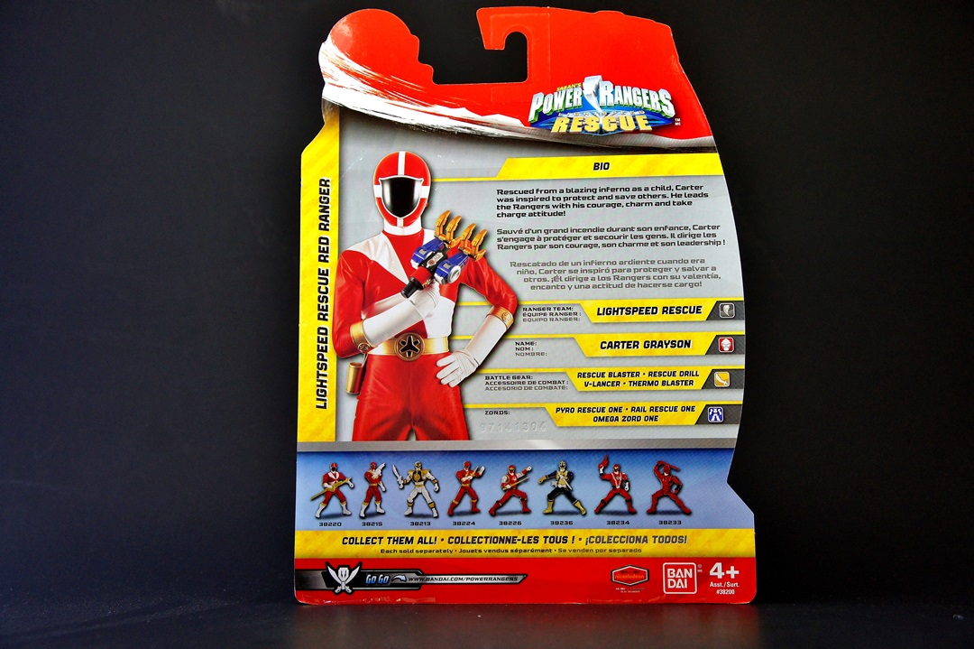 Continuing the galleries of the Power Rangers Super Megaforce 5" Figures, we're proud to bring you another legendary Red Ranger gallery. Having surged in popularity in recent years his figure is desired by many and found by few. That's right - we're talking about the Lightspeed Rescue Red Ranger, Carter Grayson. Releasing in Wave 4 of the 5" figure assortment, this figure is actually harder to find than you might expect - a lot of stores never got Wave 4 and if they did, you had one (at most maybe two) chances at grabbing the figure as he was packaged one per case. The figure itself is your standard 5" figure, 13 points of articulation and shares the same arms and legs as every other male 5" figure has. The differences in this figure are the details - and they're great! They molded the Lightspeed Rescue symbol on to the cuffs of the gloves and boots as well as the belt. And while the symbol isn't perfect (especially the smaller ones on the boots and gloves), the fact that it's there and looks pretty close is astonishing. This isn't S.H. Figuarts level of detailing, but for a Bandai of America figure at an affordable cost of around $10, this is an awesome surprise. The weapons - again - are cast with soft plastic so that they bend. I'm not sure if this is a safety reason (pointy edges for swords/weapons/blades/etc) but it does hamper what is otherwise a GREAT figure! He comes with both the V-Lancer and the Rescue Blaster. The detailing on both these weapons is phenomenal - especially the V-Lancer (comes in the 'extended' mode). For some odd reason (stock photos probably), the image of the Lightspeed Rescue Red Ranger shown on the package is shown holding his component of the Rescue Bird, which is not included with the figure. This doesn't happen often in this line (that the figure is shown with a weapon other than what they come with) but we do see it again in an upcoming gallery of the Super Samurai Red Ranger. So let's get down to the details shall we? THE GOOD!