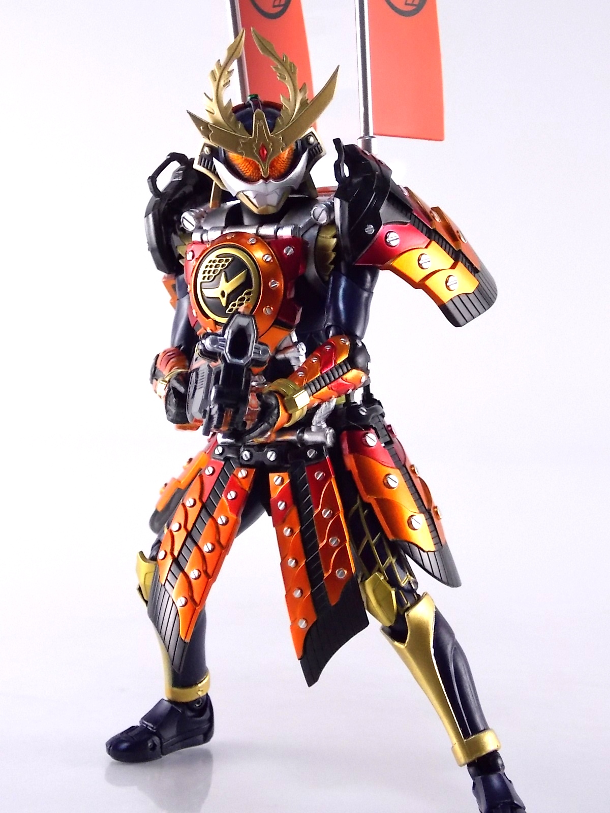 Raise up your flag if you know what I mean TokuNation is proud to finally present a gallery of one of the more hotly anticipated figures this year. S.H. Figuarts Kamen Rider Gaim Kachidoki Arms! Recently released at mass retail Kachidoki Arms is already in short supply, fetching about 6000 yen or more on the secondary market. Now let's jump in to our extensive look at this wonderful figure.**This is a HUGE gallery split into two posts, 40 images each. Packaging As has become tradition with Kamen Rider Gaim figuarts Kachidoki Arms comes in a wonderfully detailed box. Though Kachidoki clearly isn't a fruit but more of a robot samurai warlord mega orange tank of destruction, the box is themed in much the same manner as previous releases. Sort of a fruit bisection for the window, with great stock shots of the figure (which simply do not do it justice). Main Figure Let's just get it out of the way now, Kamen Rider Gaim Kachidoki Arms is glorious. Absolutely glorious. Forgetting whether you've seen the series or not, whether you've ever seen this suit design or not, it's a masterpiece in toy form. Let's start with the basic sculpt of things. Kachidoki Arms is magnificently detailed. I thought at the time that Gaim Orange Arms was released that Bandai had set a new bar for realistic detail on a figuart. With kachidoki in hand it feels almost as though they've set that bar even higher. In just about every way this figure captures the look of the on screen counterpart nearly perfectly. Just look at that head sculpt and the intricate detailing that's present, well, everywhere. There may be a few soft spots like the chest emblem but on the whole this bad boy is badass. The armor has crisp edges and sharp paint details, and on top of that works fantastically. Seriously the armor barely hinders the articulation of the basic Gaim body at all! Each of the skirt pieces can hinge up to an almost 90 degree angle and (depending on the tightness of the joints figure to figure) can maintain that position freely. You can actually get Gaim completely kneeling on two legs in a totally natural looking way. The shoulder armor is likewise hinged and ball jointed to not only allow for upward movement but also back/forward movement. Allowing you to really take advantage of some great action poses. Meanwhile the added attachments that run from the chest to the waist armor are actually made of a fairly soft rubbery plastic that's flexible enough to allow for a mostly normal range of waist movement. Speaking of the waist the Sengoku Drive belt is crazy loose, almost free spinning really. It's not bad and doesn't hurt the figures performance, it's just odd that it sits so loosely. You might also think that all this additional armor would mean this guy is off balance. Wrong. This thing is capable of the same types of poses that your standard Gaim would be. Now where this figure really shines is with the included accessories. Accessories Kamen Rider Gaim Kachidoki Arms is no slouch on the accessory count either. It really does include everything it could possibly need: 3 - sets of alternate hands. More than enough to adequately create whatever scenes you choose. 2 of these alt sets are specifically meant for holding the alternate forms of the DJ Gun so that leaves only one set of "expressive" hands. But that's okay. 1 - closed Kachidoki Lockseed. This of course is in addition to the already included opened lock that comes packaged on Gaim's driver and is removable. Having both gives you the option of attaching one version or the other to his belt and weapons to reenact specific scenes. As I've said before I don't particularly find much use for the extra locks but welcome their inclusion. 2 - Kachidoki Bata. These two flags emblazoned with Gaim's crest are actually pretty rad. The flags come pre-assembled so that Gaim can hold them and use them as weapons right out of the box. They look nice and are of course hard plastic as cloth items aren't really present in the SHF line. But cloth flags would have been nice. As is they're quite nice. If you unplug the lower handle on each flag you may then attach them to Kachidoki's backpack where the exposed pegs are already in place. So you've got options with these things. Compared to the Arms Change flags, which are pretty dinky, these things are perfect. 1 - DJ Gun (gun mode). Kachidoki's signature weapon/destroyer of Kurokage Troopers. It's like night and day when you compare this release of the gun to those included with the Arms Changes. While it can't functionally transform and the the DJ Scratch Table is (obviously) non-funtional the DJ Gun still succeeds in being a pretty great looking brick of plastic. The paint details are magnificent. I find the hand meant to hold the gun form is a little too relaxed so it's a loose fit. 1 - DJ Gun (Taiken Mode). Taiken mode is the combined form of the DJ Gun and Musou Saber. Sadly, despite how the AC version of this figure included alternate versions of the DJ Gun for combination AND a Musou Saber for said combination, S.H. Figuarts Kachidoki skimps out. Taiken Mode is molded into place permanently. The Musou Saber is not removable meaning Kachidoki also just doesn't come with one at all despite having used a standard Musou Saber in show on several occasions. Taiken Mode is beautifully sculpted and is an appropriately awesome weapon, but losing out on a Musou Saber does kind of suck. In short though Gaim Kachidoki Arms comes with everything it could really need. Aside from one pesky Musou Saber. Final Thoughts Though the show may be over Kamen Rider Gaim figuarts will continue to trickle out for likely the next year or so. Each successive release seems to improve a little in one area or another but honestly nothing has really topped that first Kamen Rider Gaim Orange Arms. But Kachidoki just might have matched it. With excellent details, a top notch paint job, a plethora of accessories, and a wide range of movement for such bulky armor, 