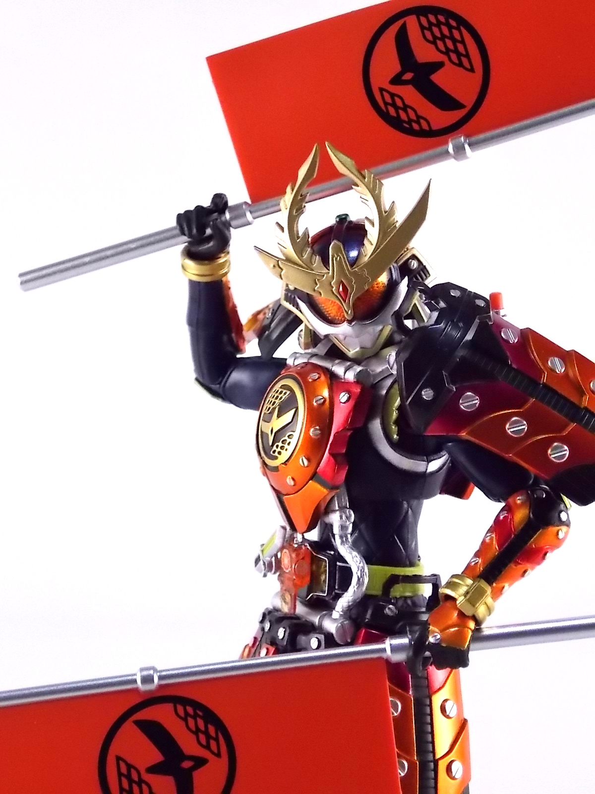 Raise up your flag if you know what I mean TokuNation is proud to finally present a gallery of one of the more hotly anticipated figures this year. S.H. Figuarts Kamen Rider Gaim Kachidoki Arms! Recently released at mass retail Kachidoki Arms is already in short supply, fetching about 6000 yen or more on the secondary market. Now let's jump in to our extensive look at this wonderful figure.**This is a HUGE gallery split into two posts, 40 images each. Packaging As has become tradition with Kamen Rider Gaim figuarts Kachidoki Arms comes in a wonderfully detailed box. Though Kachidoki clearly isn't a fruit but more of a robot samurai warlord mega orange tank of destruction, the box is themed in much the same manner as previous releases. Sort of a fruit bisection for the window, with great stock shots of the figure (which simply do not do it justice). Main Figure Let's just get it out of the way now, Kamen Rider Gaim Kachidoki Arms is glorious. Absolutely glorious. Forgetting whether you've seen the series or not, whether you've ever seen this suit design or not, it's a masterpiece in toy form. Let's start with the basic sculpt of things. Kachidoki Arms is magnificently detailed. I thought at the time that Gaim Orange Arms was released that Bandai had set a new bar for realistic detail on a figuart. With kachidoki in hand it feels almost as though they've set that bar even higher. In just about every way this figure captures the look of the on screen counterpart nearly perfectly. Just look at that head sculpt and the intricate detailing that's present, well, everywhere. There may be a few soft spots like the chest emblem but on the whole this bad boy is badass. The armor has crisp edges and sharp paint details, and on top of that works fantastically. Seriously the armor barely hinders the articulation of the basic Gaim body at all! Each of the skirt pieces can hinge up to an almost 90 degree angle and (depending on the tightness of the joints figure to figure) can maintain that position freely. You can actually get Gaim completely kneeling on two legs in a totally natural looking way. The shoulder armor is likewise hinged and ball jointed to not only allow for upward movement but also back/forward movement. Allowing you to really take advantage of some great action poses. Meanwhile the added attachments that run from the chest to the waist armor are actually made of a fairly soft rubbery plastic that's flexible enough to allow for a mostly normal range of waist movement. Speaking of the waist the Sengoku Drive belt is crazy loose, almost free spinning really. It's not bad and doesn't hurt the figures performance, it's just odd that it sits so loosely. You might also think that all this additional armor would mean this guy is off balance. Wrong. This thing is capable of the same types of poses that your standard Gaim would be. Now where this figure really shines is with the included accessories. Accessories Kamen Rider Gaim Kachidoki Arms is no slouch on the accessory count either. It really does include everything it could possibly need: 3 - sets of alternate hands. More than enough to adequately create whatever scenes you choose. 2 of these alt sets are specifically meant for holding the alternate forms of the DJ Gun so that leaves only one set of "expressive" hands. But that's okay. 1 - closed Kachidoki Lockseed. This of course is in addition to the already included opened lock that comes packaged on Gaim's driver and is removable. Having both gives you the option of attaching one version or the other to his belt and weapons to reenact specific scenes. As I've said before I don't particularly find much use for the extra locks but welcome their inclusion. 2 - Kachidoki Bata. These two flags emblazoned with Gaim's crest are actually pretty rad. The flags come pre-assembled so that Gaim can hold them and use them as weapons right out of the box. They look nice and are of course hard plastic as cloth items aren't really present in the SHF line. But cloth flags would have been nice. As is they're quite nice. If you unplug the lower handle on each flag you may then attach them to Kachidoki's backpack where the exposed pegs are already in place. So you've got options with these things. Compared to the Arms Change flags, which are pretty dinky, these things are perfect. 1 - DJ Gun (gun mode). Kachidoki's signature weapon/destroyer of Kurokage Troopers. It's like night and day when you compare this release of the gun to those included with the Arms Changes. While it can't functionally transform and the the DJ Scratch Table is (obviously) non-funtional the DJ Gun still succeeds in being a pretty great looking brick of plastic. The paint details are magnificent. I find the hand meant to hold the gun form is a little too relaxed so it's a loose fit. 1 - DJ Gun (Taiken Mode). Taiken mode is the combined form of the DJ Gun and Musou Saber. Sadly, despite how the AC version of this figure included alternate versions of the DJ Gun for combination AND a Musou Saber for said combination, S.H. Figuarts Kachidoki skimps out. Taiken Mode is molded into place permanently. The Musou Saber is not removable meaning Kachidoki also just doesn't come with one at all despite having used a standard Musou Saber in show on several occasions. Taiken Mode is beautifully sculpted and is an appropriately awesome weapon, but losing out on a Musou Saber does kind of suck. In short though Gaim Kachidoki Arms comes with everything it could really need. Aside from one pesky Musou Saber. Final Thoughts Though the show may be over Kamen Rider Gaim figuarts will continue to trickle out for likely the next year or so. Each successive release seems to improve a little in one area or another but honestly nothing has really topped that first Kamen Rider Gaim Orange Arms. But Kachidoki just might have matched it. With excellent details, a top notch paint job, a plethora of accessories, and a wide range of movement for such bulky armor, 