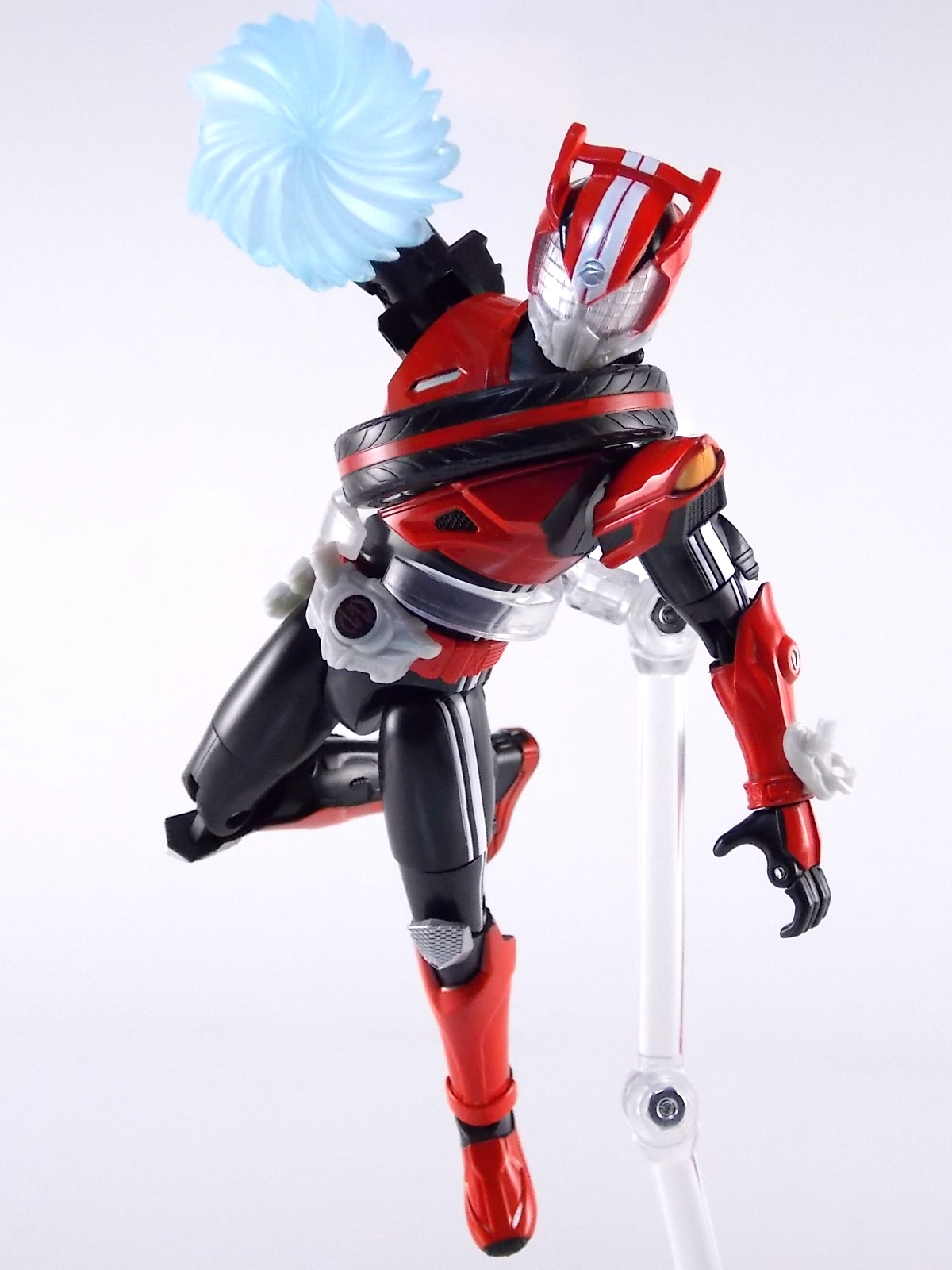 Kamen Rider Drive is finally underway and with the inaugural episode having aired this past weekend, the toyline was released in unison in Japan. Luckily enough some of it has made it's way to our part of the world as well. So today we're taking a look at the very first figure in Drive's gimmick line Tire Koukan! Following up from last years fantastically well received Arms Change line, Tire Koukan has a similar gimmick. Literally you swap various themed tires onto Drive and other compatible future figures by splitting the figure in half. So let's jump right in with TK-01 Kamen Rider Drive Type Speed! Post #2 contains tons of additional images of this wonderful figure! Packaging TK-01 Drive comes packaged in a fairly standard box. The mass retail toylines don't tend to have the fancy bells and whistles of Bandai's collector lines but they get the job done. Drive's box is very similar to that of an Arms Change albeit much slimmer as the Tires aren't nearly as cumbersome as Arms were. The cross sells on the box give us some official looks at the upcoming DX Tridoron & TK-02 Tire Set. Drive himself is packaged in a plastic clam shell and is split into his upper and lower halves with no tire attached. Main Figure Inevitably the comparison between Tire Koukan & Arms Change was going to be made. So let me go ahead and make it. As with most if not all mass retail "gimmick line" rider figures from the last roughly 5 or 6 years the body type is fairly generic. At least in the placement of articulation points and complexity. OCC, FMCS, WAP, AC. These all share basic design structures so Tire Koukan is no different in that regard. Last years AC's brought the retail lines to a new level with it's innovative gimmick, and Tire Koukan is attempting to bring the same magic. I feel it's an admirable successor. Kamen Rider Drive can actually be snapped together without a tire connected to his chest peg funnily enough, though he won't have much of a chest if you do that. There's nothing to fill in the big gap on him like the basic suit used in the show between Koukans. So to really examine the figure as a whole you need to equip the included Speed Tire. Drive's Type Speed is his default form anyway. This basic form of Drive is pretty damn slick. Though this is merely a gimmick figure it absolutely nails most of the details from the suit. You could levy the complaint that the Shift Brace, Drive Driver, and Shift Car holster are unpainted. True enough they aren't and are simply molded in gray plastic. But as a mainline non-SHF figure it's forgivable. The details are still nice on all 3, right down to the three tiny molded cars on the holster. The holster is also removable though that doesn't serve a purpose right now. The back of the figure is where it really shines though. Look at ALL that detailing! Much like the real suit, TK-01 Drive has that incredible car undercarriage detailing on his back. It really does look fantastic. Drive's basic red has a nice gloss to it to make it feel a bit more authentic, and his visor is nice big and open to allow plenty of light in, making the eyes really pop. While on the subject the helmet is also excellently detailed, right down to the (sadly unpainted) piping around the sides. Seriously look at this figures profile, it's fantastic. Many people complain the tires seems too large but if you ask me it looks just right on the Tire Koukan figure. It gives Drive a nice unique shape. It can hinder the leftward movement of the head to a degree, but this figure doesn't have an incredible range of motion to begin with so it isn't a huge loss. As you can see you can get some nice fun poses out of a figure like this and with some already purchased effect parts you can make the most of him. Drive also fits in pretty well with S.H. Figuarts and the like. Though he's a tad bit taller than the standard figuarts, he'll look good with some of your more modern riders, and other law enforcement heroes... Accessories Drive's one additional accessory aside from the necessary Speed Tire is the Max Flare Tire. First seen in episode 1, Max Flare gives Drive access to Fire based powers and attacks even letting him create flamed whirlwinds punches and kicks. Sadly the spikes on this Tire don't pop up automatically when placed on Drive, you do need to flip them out individually. It should also be noted that the Tire's only go on one way. They're molded to only be placed on a figure one direction, with the screws facing down on the "bottom" of the Tire. Max Flare is cast in a nice fiery orange and although the spikes can be a pain when posing, they still don't really affect the figures ability to pose. Again, if you have some effect parts in hand already Max Flare can be just as much fun as Speed. I had some and really had fun with it. Drive will apparently receive actual weapons later on in the show so for now there's no gun or sword or anything like that for him to use. But Max Flare is a good bonus to throw in for now. The TK-02 set will be nothing but extra Tires; Justice Hunter, Mad Monster, & Funky Spike. Final Thoughts Though not quite as snazzy or immediately as playable as the Arms Change line, I feel Tire Koukan is more than a worthy successor. Koukan's focus is on Tire swapping but we do know that later figures will introduce something more like torso swapping as Drive's upgraded forms Wild, Technic, & Dead Heat appear. Recently it was confirmed that Drive will eventually have a Type Gaim/Type Fruit form as well, and a new Arms Change figure in the form of Gaim Drive Arms is forthcoming. TK-01 Kamen Rider Drive Type Speed is only just hitting the market, but as is usually the case when a new rider show begins, basically everything is selling out. Is this figure worth the initial mad dash to own? Perhaps. But much like any gimmick laden figure, it will always be more attainable at a later date. For now I'm more than happy to have this Drive in hand to fool around with and I'd highly reco