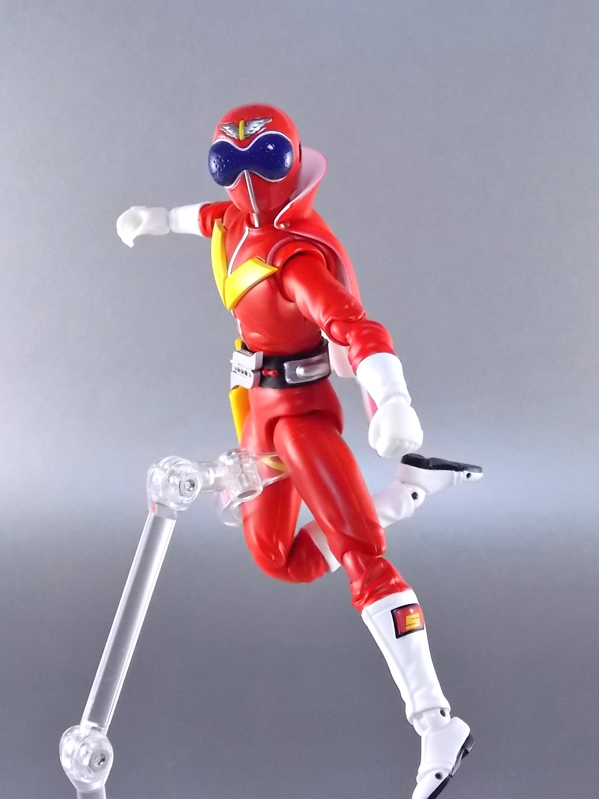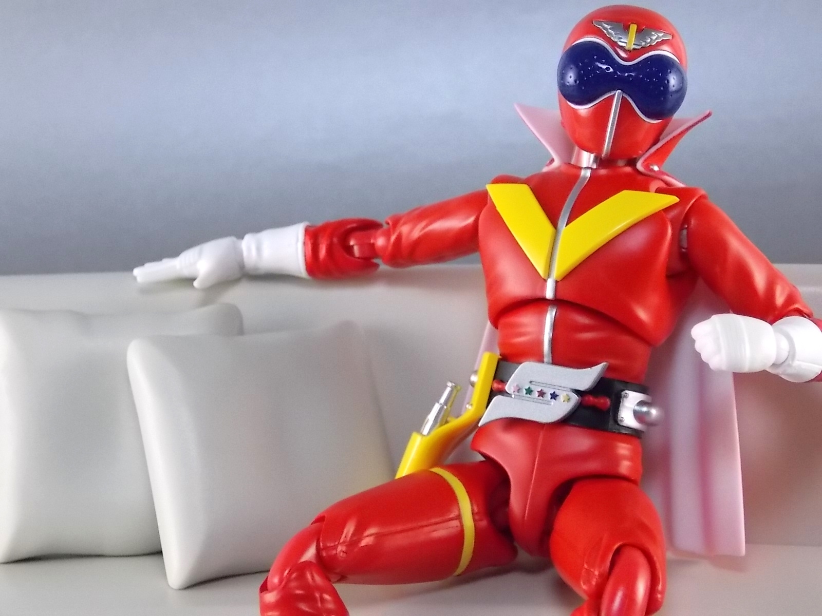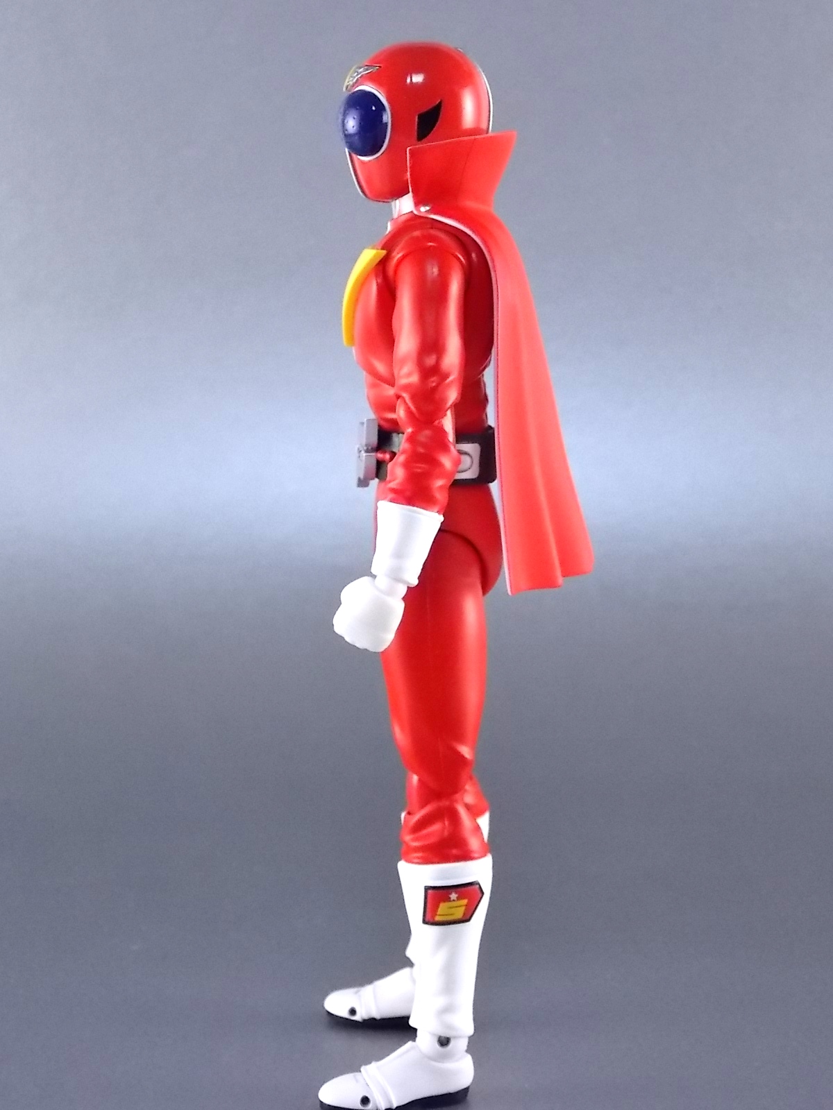 TokuNation has at long last made it's way back to the first Sentai. Well, the show that retroactively is known as the first. Himitsu Sentai Goranger! Though it was nearly 20 years after it's debut that this series gained it's sentai status it's unquestionable that the series began a long tradition of colorful spandex heroes helping some big eyed bug men save Japan. Tamashii Nations has at long last delved into the depths of Toei's sentai library to release a figure from this original series. S.H. Figuarts Akaranger! Note that the name on the box is spelled Akarenger, the official romanization of his name. Generally his name in English is accepted to be Akaranger and Toei's subsequent use of the actual word "Ranger" in many series and hero names would imply that should be the correct term in this instance. Likely it's spelled "renger" here to line up with how the name sounds when spoken. But onto the figure! *Post #2 contains additional images Packaging In an era of S.H. Figuarts when many figures are released as part of larger overall lines it's nice to get more of a one off release now and then like Akaranger. Seeing as he may be the only member of Goranger released for some time, his unique packaging art is a nice refresher. A nice shot of Akaranger himself on the front and one of his iconic yellow stripes wrapping around the box set it apart. Though there isn't much else here we don't normally see like the stock photos on the back. Main Figure S.H. Figuarts Akaranger is a great figure but there are a few things you should know about it. There is an elephant in the room when it comes to him. Well it is him. Akaranger is a huge figure. Oddly this figure is designed around a new type of larger body that's closer to an Ultra-Act in size than a Figuart. It's kind of odd, jarring, and especially noticeable when you put him up against a Kamen Rider like Ichigo. It's crazy how much taller he is. nd he's rather built, pretty big arms and legs. He also towers over most Sentai figuarts though not as noticeably. He stands out, but looks good in large groups. Size issues aside the figure is wonderfully detailed. Featuring more of Bandai's sculpted in fabric details, this guy looks very much like the real suit he's based on. The paint apps appear to be nice and crisp as well making Akaranger look great in all the right places. His belt is sculpted wonderfully and fully properly painted. And the sculpted in version of his gun holster is quite nice. The helmet itself though is where the best detail is. Right down to the eye holes which were present on the real thing so the suit actor could see, this thing is a perfect replica of the real deal. My one real complaint is that straight out of the box you need to use an accessory. His cape. I know Figuarts aren't known for using cloth with figures but this probably would have been a great time to make an exception. Unlike certain other figures where the capes have been hinged or included dynamic parts to change out with, Akaranger's cape is exactly what you see here. A static hunk of plastic that all but disallows the use of Tamashii Stages. It's one big rigid chunk that gets in the way of just about everything. As you can see from the images below it's hard to work around that thing. If only this figure could have incorporated the complexity used for something like Kamen Rider Knight. Accessories Now despite Akaranger's shortcomings he does include quite a number of accessories: 4 &1/2 - sets of additional hands for various poses and gestures. Several to hold the other included accessories. 2 - versions of the Red Bute rope weapon. Again, this is where cloth would have done this figure justice. Even though Bandai easily included a proper Rope Arm for Figuarts Riderman, Akaranger's signature ROPE weapon is a hard piece of inflexible plastic. The first version is suppoed to be the Bute rolled up before use, the sculpt on it is weak and pretty unconvincing. The second is the rope in it's Spear Bute form, which as the toy represents properly is a rigid staff weapon. 1 - alternate empty pistol holster. To be swapped for the standard one when he's holding his included pistol 1 - Silver Shot pistol. A weapon literally almost never even seen in Akaranger's hand, yet included here in two forms (sculpted into holster, and individual accessory). Yet no real rope? 1 - new belt with the Birdie flight equipment attached. This was the extra that really sold me on this figure. A great bonus to be included. Though sadly because of the afformentioned cape issues it's a bit hard to get good flying shots of this guy. 1 - Goranger Storm Ball. Though not the standard generic ball seen that usually starts this technique. This version of the ball is actually a fully powered version ready to kick at the monster of the week after the passes to the other 4 Gorangers are completed. A bit of an odd choice, but certainly more interesting than a standard ball. Final Thoughts S.H. Figuarts Akaranger is an odd figure for me. He's a bit too tall for my taste, and too bulky as well. But it's one of my favorite Showa costumes and is a truly iconic design. My nostalgia almost gives this guy a free pass, and despite his shortcomings he's still a solid figure. The wealth of accessories included and just the fact that the original red is in toy form make this a must own for me. And damn it all he looks good on my shelf.