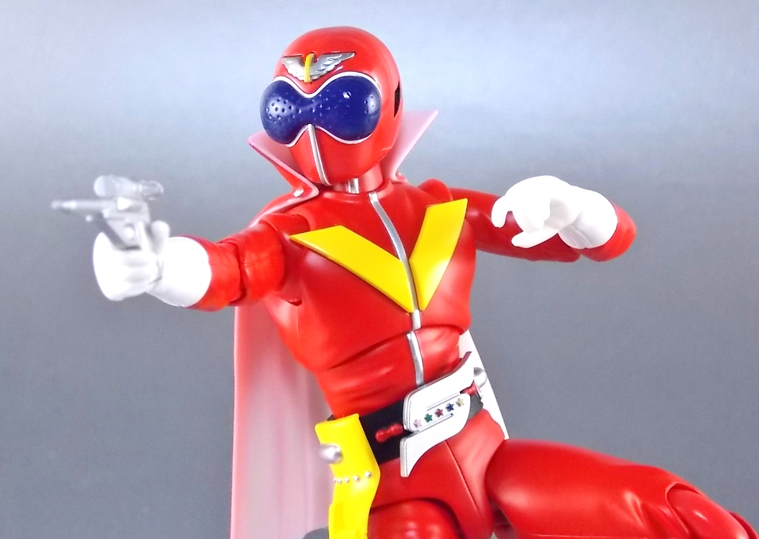 TokuNation has at long last made it's way back to the first Sentai. Well, the show that retroactively is known as the first. Himitsu Sentai Goranger! Though it was nearly 20 years after it's debut that this series gained it's sentai status it's unquestionable that the series began a long tradition of colorful spandex heroes helping some big eyed bug men save Japan. Tamashii Nations has at long last delved into the depths of Toei's sentai library to release a figure from this original series. S.H. Figuarts Akaranger! Note that the name on the box is spelled Akarenger, the official romanization of his name. Generally his name in English is accepted to be Akaranger and Toei's subsequent use of the actual word "Ranger" in many series and hero names would imply that should be the correct term in this instance. Likely it's spelled "renger" here to line up with how the name sounds when spoken. But onto the figure! *Post #2 contains additional images Packaging In an era of S.H. Figuarts when many figures are released as part of larger overall lines it's nice to get more of a one off release now and then like Akaranger. Seeing as he may be the only member of Goranger released for some time, his unique packaging art is a nice refresher. A nice shot of Akaranger himself on the front and one of his iconic yellow stripes wrapping around the box set it apart. Though there isn't much else here we don't normally see like the stock photos on the back. Main Figure S.H. Figuarts Akaranger is a great figure but there are a few things you should know about it. There is an elephant in the room when it comes to him. Well it is him. Akaranger is a huge figure. Oddly this figure is designed around a new type of larger body that's closer to an Ultra-Act in size than a Figuart. It's kind of odd, jarring, and especially noticeable when you put him up against a Kamen Rider like Ichigo. It's crazy how much taller he is. nd he's rather built, pretty big arms and legs. He also towers over most Sentai figuarts though not as noticeably. He stands out, but looks good in large groups. Size issues aside the figure is wonderfully detailed. Featuring more of Bandai's sculpted in fabric details, this guy looks very much like the real suit he's based on. The paint apps appear to be nice and crisp as well making Akaranger look great in all the right places. His belt is sculpted wonderfully and fully properly painted. And the sculpted in version of his gun holster is quite nice. The helmet itself though is where the best detail is. Right down to the eye holes which were present on the real thing so the suit actor could see, this thing is a perfect replica of the real deal. My one real complaint is that straight out of the box you need to use an accessory. His cape. I know Figuarts aren't known for using cloth with figures but this probably would have been a great time to make an exception. Unlike certain other figures where the capes have been hinged or included dynamic parts to change out with, Akaranger's cape is exactly what you see here. A static hunk of plastic that all but disallows the use of Tamashii Stages. It's one big rigid chunk that gets in the way of just about everything. As you can see from the images below it's hard to work around that thing. If only this figure could have incorporated the complexity used for something like Kamen Rider Knight. Accessories Now despite Akaranger's shortcomings he does include quite a number of accessories: 4 &1/2 - sets of additional hands for various poses and gestures. Several to hold the other included accessories. 2 - versions of the Red Bute rope weapon. Again, this is where cloth would have done this figure justice. Even though Bandai easily included a proper Rope Arm for Figuarts Riderman, Akaranger's signature ROPE weapon is a hard piece of inflexible plastic. The first version is suppoed to be the Bute rolled up before use, the sculpt on it is weak and pretty unconvincing. The second is the rope in it's Spear Bute form, which as the toy represents properly is a rigid staff weapon. 1 - alternate empty pistol holster. To be swapped for the standard one when he's holding his included pistol 1 - Silver Shot pistol. A weapon literally almost never even seen in Akaranger's hand, yet included here in two forms (sculpted into holster, and individual accessory). Yet no real rope? 1 - new belt with the Birdie flight equipment attached. This was the extra that really sold me on this figure. A great bonus to be included. Though sadly because of the afformentioned cape issues it's a bit hard to get good flying shots of this guy. 1 - Goranger Storm Ball. Though not the standard generic ball seen that usually starts this technique. This version of the ball is actually a fully powered version ready to kick at the monster of the week after the passes to the other 4 Gorangers are completed. A bit of an odd choice, but certainly more interesting than a standard ball. Final Thoughts S.H. Figuarts Akaranger is an odd figure for me. He's a bit too tall for my taste, and too bulky as well. But it's one of my favorite Showa costumes and is a truly iconic design. My nostalgia almost gives this guy a free pass, and despite his shortcomings he's still a solid figure. The wealth of accessories included and just the fact that the original red is in toy form make this a must own for me. And damn it all he looks good on my shelf.
