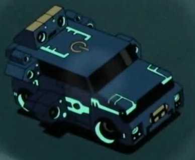 Type: Semi w/ trailer Description: Blue long nosed truck with smoke colored accents along with a grey trailer Tire: One large, thick, dark grey tire. Heavy enough to noticeably weigh Drive down. Ability: Gatakiriba. Constant cloning for a convoy of Drive.