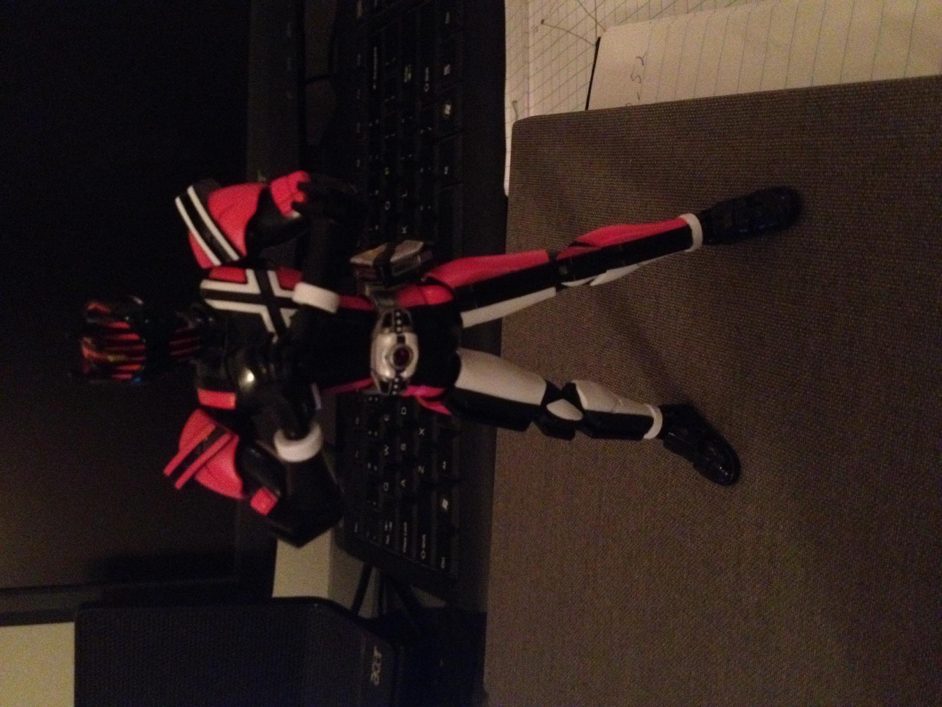 As a Fan of Kamen Rider Decade, the SH Figuart did bug me in a way I cannot explain. But a toy can do so much, nothing is perfect. Decade's knee pad was all black and can be easily taken off easily. I changed that by painted it more show accurate and super glued the knee pads on, so it wouldn't come off at all. It was a minor customization, but good enough to satisfy me. Making the magenta color paint to match the toy color was more difficult for me and the overall results are okay, could of done better, but I am satisfy with it. That minor fix makes the figure a lot better for me. And this is the Violent Emotion Decade, but I wasn't really found of that head sculpt design, it looks good on the S.I.C figure, so I just kept it as the regular default Decade head. The original Decade figuart is expensive for me, so I'll get what I can get. Sorry for the bad quality photo, I took the picture off my iPhone.