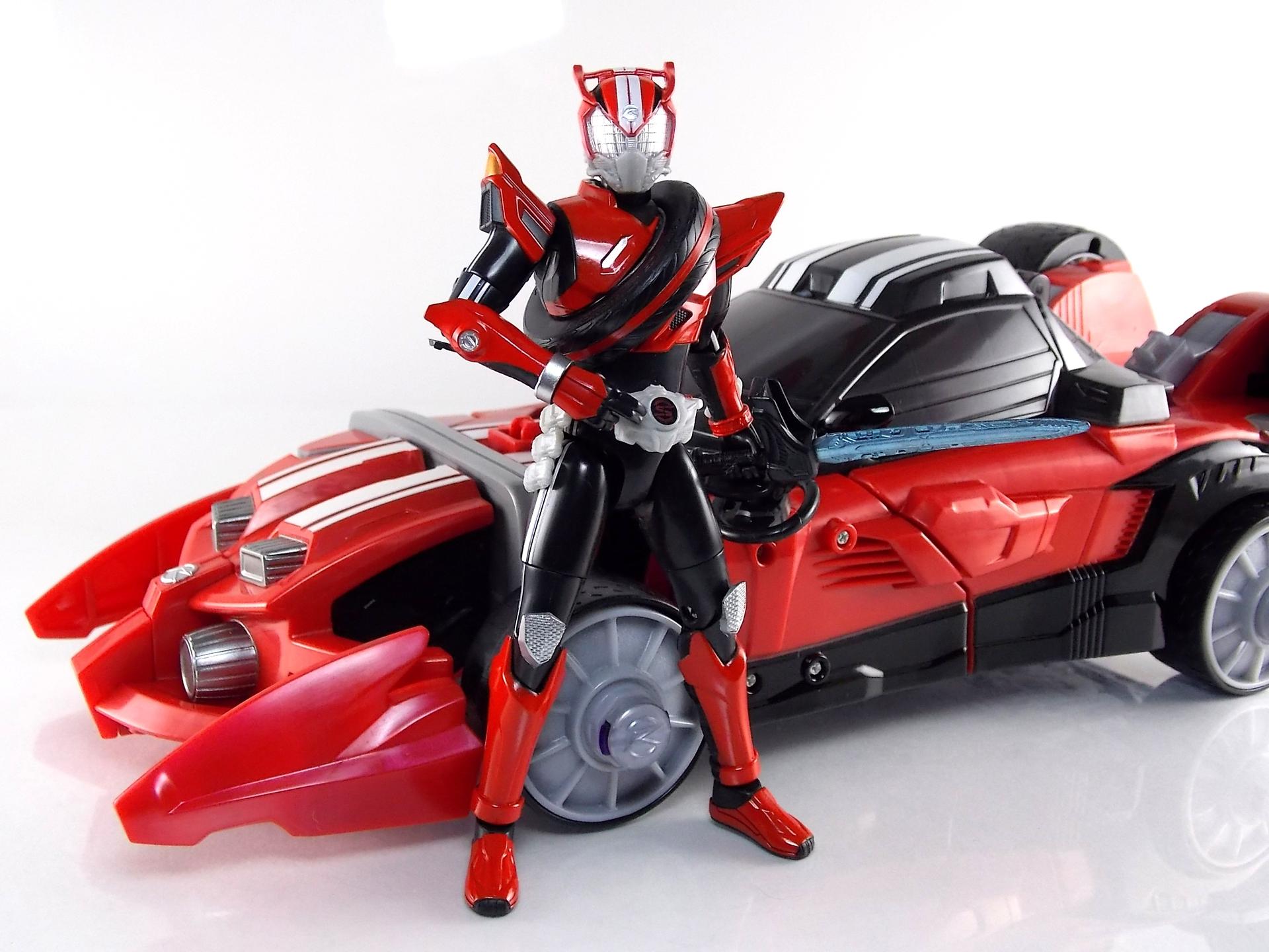 Start your engine again with another gallery from Kamen Rider Drive! Today we're taking a look at Drive's first upgraded form. From the Tire Koukan line it's TK-03 Kamen Rider Drive Type Wild! Don't forget to check out the video review of this excellent figure by my man Baltmatrix as well! Packaging Much like Drive Type Speed and the TK-02 tire set, Drive Type Wild comes in a nice slim box with one diagonally rounded off side. Collectors of the line have nothing new to see here other than the obviously new stock images for Drive and some of his new tires. Unlike Type Speed however Wild is packed as one solid figure rather than two halves. This is of course due to how the Tire Koukan gimmick has changed for this Type. Main Figure Kamen Rider Drive Type Wild is a pretty beastly form. A design commented on by many, Type Wild looks much like a mixture of Master Chief, Optimus Prime, and a little bit of Riser Gant thrown in for good measure. It looks great in show and in figure form it really pulls off the badass police tank theme it's going for. While the figure may seem plain at first it's not missing many paint apps aside from the belt and brace. It actually conveys it's on screen appearance very well. The black is slick and properly applied and the hints of gray/silver really break up the monotony of the black as well. Taking a look at the back of the figure it shares much of the same undercarriage detailing that Type Speed had, just in gray this time making the details easier to make out. One big improvement this figure has over Type Speed is the shoulders. Type Wild has pull out shoulders! Given a normal range of forward/back and outward motion already, the shoulders on Type Wild can be pulled out from the torso about a centimeter allowing his shoulders to swing up pretty far and allow for some fairly dynamic poses. You might think the right shoulder where the tire attaches would hinder movement but it already doesn't And even if it did this clever shoulder design would alleviate such a problem. While talking about that shoulder you can see there's actually a groove molded into the upper arm for tires. This ensures when a tire is attached that it doesn't get in the way of the arm and instead physically moves with the arm. Rather than sitting on top of the arm it's physically part of it. Pretty damn smart engineering. Where the tire is connected you'll see that a silver cap sits in the center as well. Before or after you plug a tire on this cap can be removed revealing a peg that exactly matches that of Type Speeds torso, allowing for lot's of wacky combos. The silver cap is mainly there to fill in where a weapon would normally be stored on a tire which includes one. The cap is a part of Type Wild's standard look with a normal tire, but some tires have additional parts that would go where it is. As for tires, the figure really isn't complete without it's default one, so let's move onto; Accessories Drive Type Wild comes with just 3 accessories, but they're the perfect inclusions for this upgraded form. 1 - Type Wild Tire. This of course is the primary tire accessed for this form from the Type Wild Shift Car. It's a nice bulky off-road tread tire that looks like it would be at home on a police humvee of some sort. It really adds to the whole police tank aesthetic they were going for with this form. Even with the Tire attachment point moved to the shoulder this figure will still fit comfortably in DX Tridoron. And of course now you have something to pair up with Tridoron Type Wild as well.! 1 - Rumble Dump Tire. This tire is one of the afformentioned weapon tires. More than just a tire on it's own the drill can also be detached from Rumble Dump. When this tire is plugged onto the shoulder you need to remove the silver "hub" cap first. This allows the tire to be connected while the drill is still attached. When the drill is popped off you can put the cap back on completing the normal look of the shoulder. You'll also see when you take the drill off that there are gears in there too. When you rotate the top half of the tire and the drill is connected, this rotating will make the drill spin too! To me this is hands down the best tire in the line so far. 1 - Handle Sword! Yes, Type Wild includes the Handle Sword, Drive's signature melee weapon! Though it's primarily a weapon for Type Speed we know that Wild & by extension any form, could also use this sword. It's actually a pretty awesomely detailed weapon, quite a bit more so than most of last years Arms Change weapons even. And the steering wheel actually does turn! In short Type Wild comes with everything we've seen from it up to this point. Everything it needs. Final Thoughts Already the Tire Koukan line is shaping up to be pretty damn solid. Drive Type Speed was fantastic while the first Tire Set left a little bit to be desired. But TK-03 Drive Type Wild is the full package. Excellent sculpt & details packed with just the right accessories. You should definitely do yourself a favor and pick this one up, in my personal opinion it far exceeds the excellence of even Drive Type Speed. Though an eventual Figuart will of course beat it out, for now this figure does not disappoint. Nice Drive!