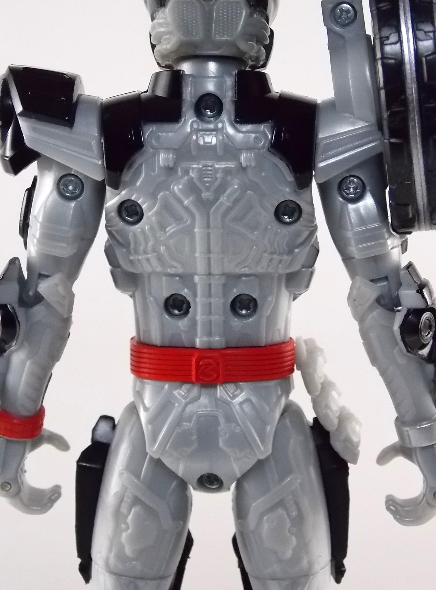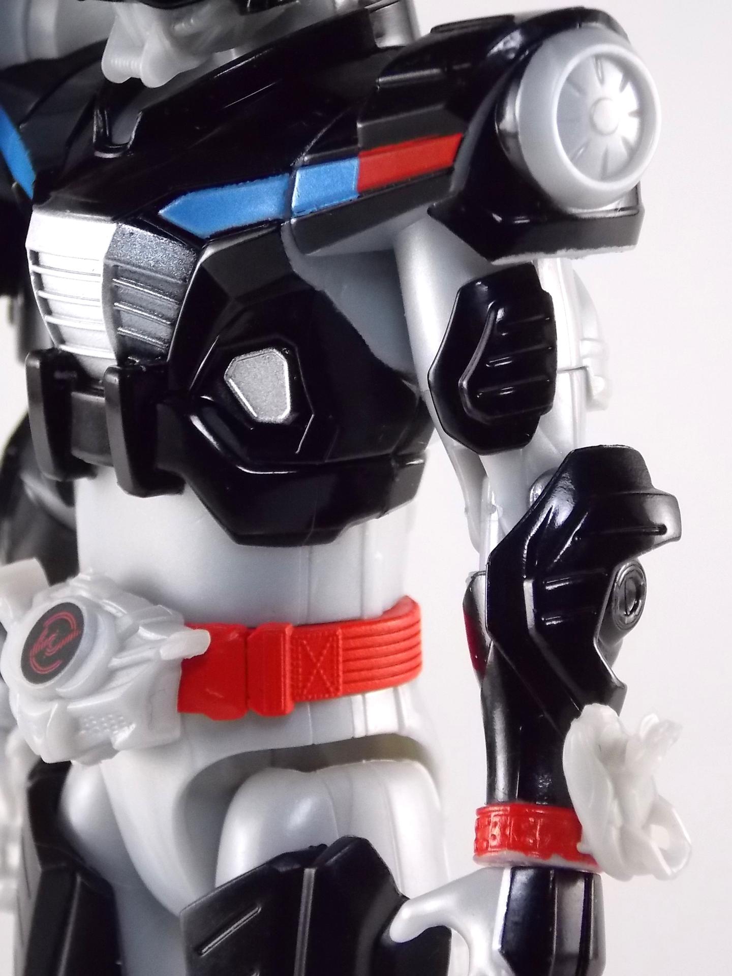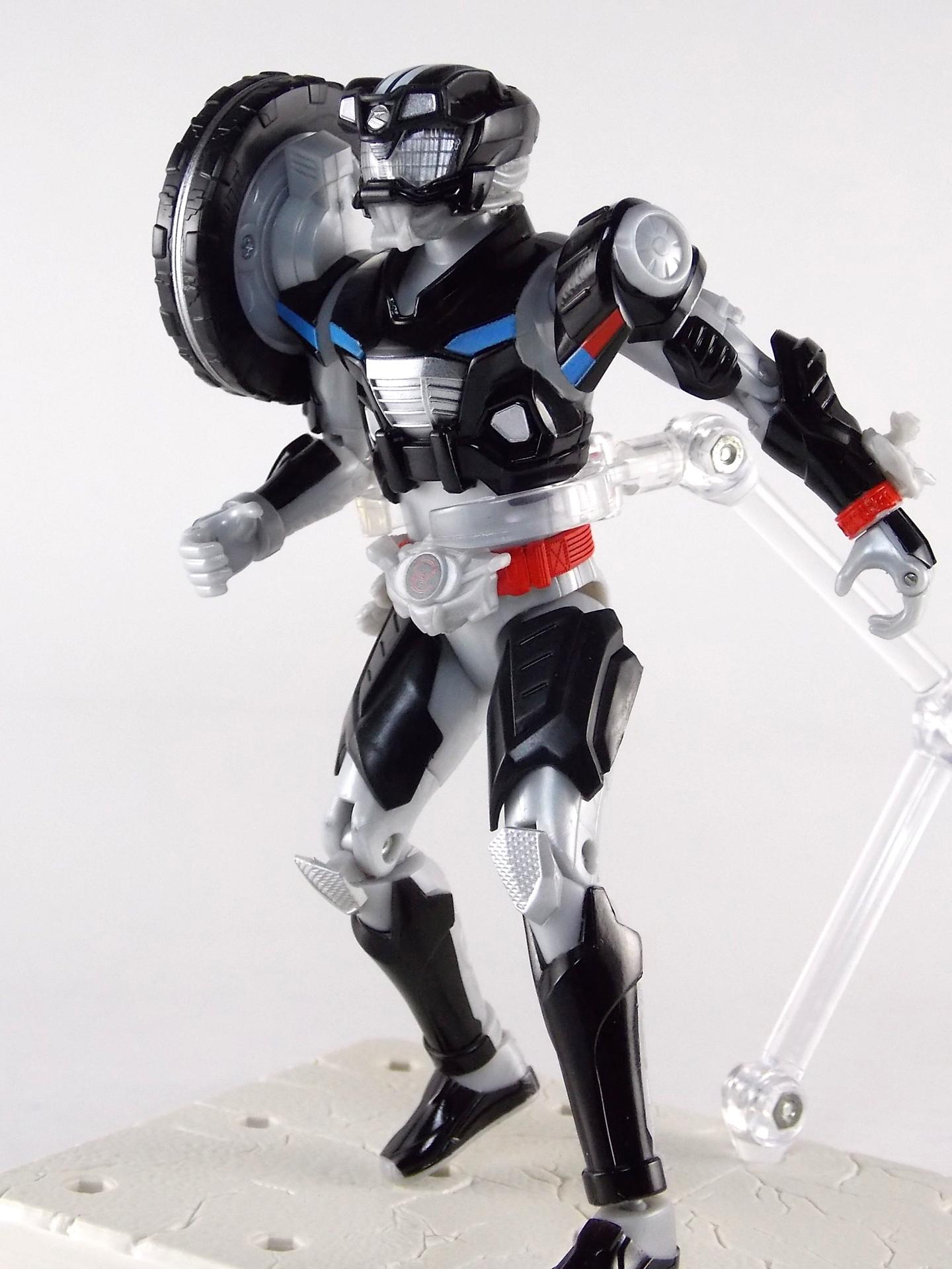 Start your engine again with another gallery from Kamen Rider Drive! Today we're taking a look at Drive's first upgraded form. From the Tire Koukan line it's TK-03 Kamen Rider Drive Type Wild! Don't forget to check out the video review of this excellent figure by my man Baltmatrix as well! Packaging Much like Drive Type Speed and the TK-02 tire set, Drive Type Wild comes in a nice slim box with one diagonally rounded off side. Collectors of the line have nothing new to see here other than the obviously new stock images for Drive and some of his new tires. Unlike Type Speed however Wild is packed as one solid figure rather than two halves. This is of course due to how the Tire Koukan gimmick has changed for this Type. Main Figure Kamen Rider Drive Type Wild is a pretty beastly form. A design commented on by many, Type Wild looks much like a mixture of Master Chief, Optimus Prime, and a little bit of Riser Gant thrown in for good measure. It looks great in show and in figure form it really pulls off the badass police tank theme it's going for. While the figure may seem plain at first it's not missing many paint apps aside from the belt and brace. It actually conveys it's on screen appearance very well. The black is slick and properly applied and the hints of gray/silver really break up the monotony of the black as well. Taking a look at the back of the figure it shares much of the same undercarriage detailing that Type Speed had, just in gray this time making the details easier to make out. One big improvement this figure has over Type Speed is the shoulders. Type Wild has pull out shoulders! Given a normal range of forward/back and outward motion already, the shoulders on Type Wild can be pulled out from the torso about a centimeter allowing his shoulders to swing up pretty far and allow for some fairly dynamic poses. You might think the right shoulder where the tire attaches would hinder movement but it already doesn't And even if it did this clever shoulder design would alleviate such a problem. While talking about that shoulder you can see there's actually a groove molded into the upper arm for tires. This ensures when a tire is attached that it doesn't get in the way of the arm and instead physically moves with the arm. Rather than sitting on top of the arm it's physically part of it. Pretty damn smart engineering. Where the tire is connected you'll see that a silver cap sits in the center as well. Before or after you plug a tire on this cap can be removed revealing a peg that exactly matches that of Type Speeds torso, allowing for lot's of wacky combos. The silver cap is mainly there to fill in where a weapon would normally be stored on a tire which includes one. The cap is a part of Type Wild's standard look with a normal tire, but some tires have additional parts that would go where it is. As for tires, the figure really isn't complete without it's default one, so let's move onto; Accessories Drive Type Wild comes with just 3 accessories, but they're the perfect inclusions for this upgraded form. 1 - Type Wild Tire. This of course is the primary tire accessed for this form from the Type Wild Shift Car. It's a nice bulky off-road tread tire that looks like it would be at home on a police humvee of some sort. It really adds to the whole police tank aesthetic they were going for with this form. Even with the Tire attachment point moved to the shoulder this figure will still fit comfortably in DX Tridoron. And of course now you have something to pair up with Tridoron Type Wild as well.! 1 - Rumble Dump Tire. This tire is one of the afformentioned weapon tires. More than just a tire on it's own the drill can also be detached from Rumble Dump. When this tire is plugged onto the shoulder you need to remove the silver "hub" cap first. This allows the tire to be connected while the drill is still attached. When the drill is popped off you can put the cap back on completing the normal look of the shoulder. You'll also see when you take the drill off that there are gears in there too. When you rotate the top half of the tire and the drill is connected, this rotating will make the drill spin too! To me this is hands down the best tire in the line so far. 1 - Handle Sword! Yes, Type Wild includes the Handle Sword, Drive's signature melee weapon! Though it's primarily a weapon for Type Speed we know that Wild & by extension any form, could also use this sword. It's actually a pretty awesomely detailed weapon, quite a bit more so than most of last years Arms Change weapons even. And the steering wheel actually does turn! In short Type Wild comes with everything we've seen from it up to this point. Everything it needs. Final Thoughts Already the Tire Koukan line is shaping up to be pretty damn solid. Drive Type Speed was fantastic while the first Tire Set left a little bit to be desired. But TK-03 Drive Type Wild is the full package. Excellent sculpt & details packed with just the right accessories. You should definitely do yourself a favor and pick this one up, in my personal opinion it far exceeds the excellence of even Drive Type Speed. Though an eventual Figuart will of course beat it out, for now this figure does not disappoint. Nice Drive!