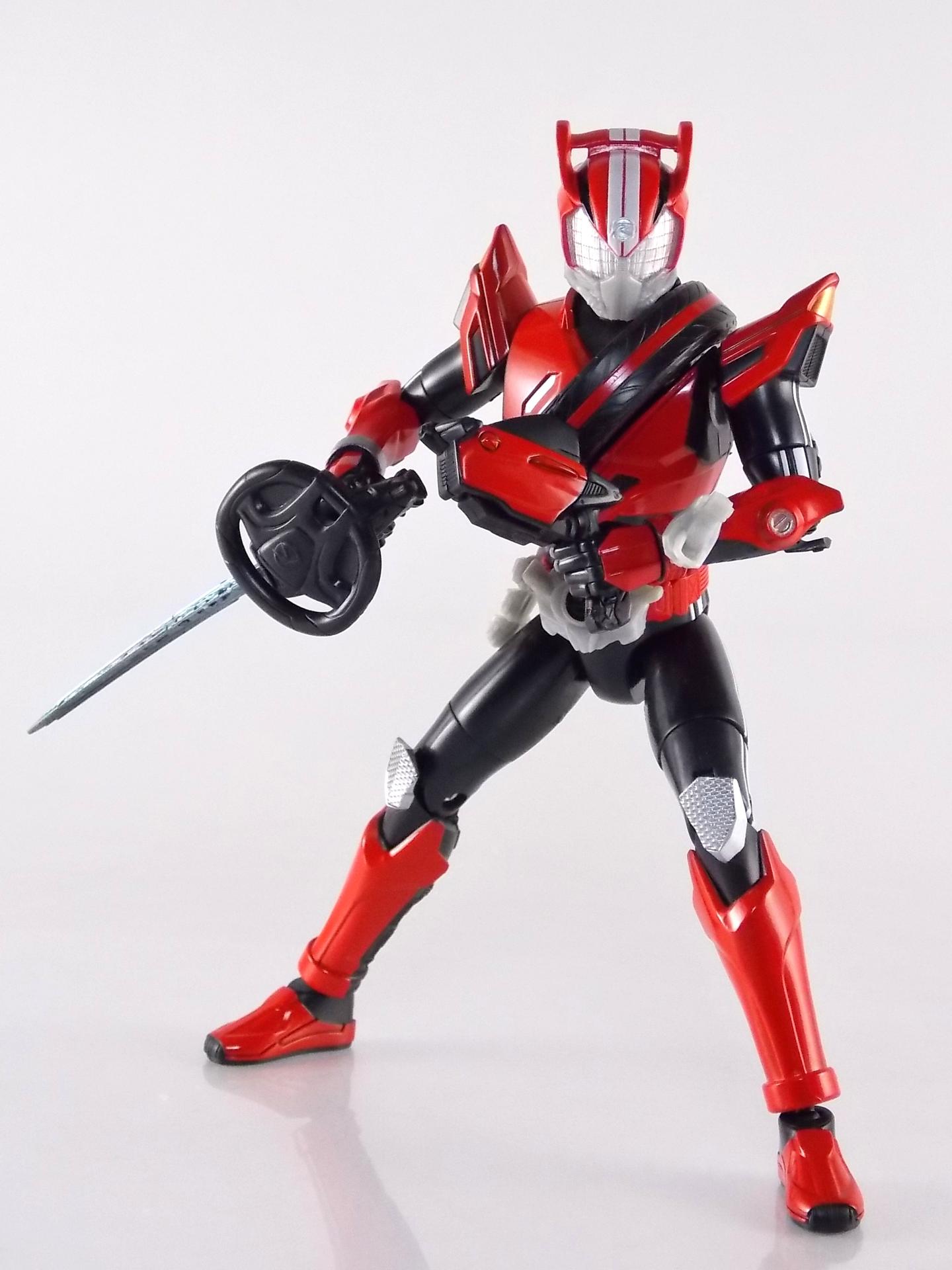 TokuNation is in gear with more Kamen Rider Drive! Continuing our series of Drive galleries we're looking today at the 5th Tire Koukan release, TK-05 Kamen Rider Drive Type Technic! Don't forget to check out the video review of this excellent figure by my man Baltmatrix as well! Packaging Much like Drive Type Speed and Drive Type Wild, Type Technic comes in a nice slim box with one diagonally rounded off side. Collectors of the line have nothing new to see here other than the obviously new stock images for Drive and some of his newer tires. Much like Type Wild, Technic is packed as one solid figure rather than two halves like Type Speed. This is of course due to how the Tire Koukan gimmick has changed for this Type. Main Figure Kamen Rider Drive Type Technic has been pretty divisive actually. A good number of people either love or hate the suits design, I'm firmly in the camp of loving it. But let's explore how this figure lives up to it. For the lower half of the body this is much of the same figure you already got with Types Speed & Wild before. But let me tell you that torso and head are entirely different beasts. Type Technic moves the TK gimmick once again, this time to the rather odd chest area. In order to utilize it you need to hinge back the upper most part of Technic's torso on the arm connected to the back. The shoulders, upper chest, and head are all connected. Then insert a tire, most likely the standard Type Technic Tire and here you have the figure's completed look. Let's start with positives. Despite having a pretty funky version of the line's gimmick the Techinc doesn't suffer that greatly from it. You'd think there'd be no shoulder movement, but there's a ton of it. The shoulders are set on ball joints just bellow where the edge of a tire rests and they have some pretty decent motion. Some false cables are molded on to the upper arms simulate the connection to the shoulder pads as well, the pads themselves can hinge freely for a full range of movement thanks to the upper body's transformation. The sculpt is also spot on for this guy. As always right down to the intricate undercarriage detailing on the back and the exquisite head sculpt. The drawbacks of the design are that, sadly, you can't do "Drive stacking" with this figure. Type Wild offered the hilarious possibility of attaching Type speed to his shoulder because they share the same universal connector. For some reason Type Technic has an entirely different connector on that chest peg meaning you can't do that. It's an incredibly odd change. What this also means is that for tires like Dream Vegas, which require the version 1 connector to be able to stack parts, are incompatible with Type Technic. Now the chest is designed gloriously to allow any of the Tires with moving or protruding bits to still work seamlessly with Technic. The shoulders really are aimed at allowing you to use any tire. However because of how the upper chest swings backs on a single joint hinge, anything thicker than one tire will essentially not work on this guy. That being said it isn't necessarily the point of this figure to be able to accommodate things such as stacking. We've all had our fun with Type Wild but we have no indication that stacking the 3 pieces of Dream Vegas on there or putting Type Speeds torso there, will ever happen in show. So expecting that same kind of compatibility with Technic doesn't necessarily make sense. But it would have been fun. The head also has some pretty limited up/down movement because of the lip around the neck. Accessories Included with Drive Type Technic are several key accessories: 1 - Type Technic Tire. This is of course the main tire necessary to complete Technic's look. 1 - Door Gun. The second standard weapon of Kamen Rider Drive, the Door Gun made it's debut before Type Technic in the show but as with Type Wild and the Handle Sword this was included to sort of sweeten the deal. It's actually not too shabby. Much like the Handle Sword it's fully functional! Though it required only a single hinge to be able to do it the Door Gun opens and closes just as it should. A nice touch in all honesty. 1 - Fire Braver Tire. This new tire made it's debut in episode 9 of Kamen Rider Drive and as the name implies it's based on a fire rescue vehicle. Fire Brave is a fairly creative new tire with a folding "fire ladder" styled arm that can collapse along the inner indentation of the tire. Allowing it to not only fit perfectly inside of Technic's chest, but also to allow for variation of length of the arm for display. The arm itself is physically a bit weak and can pop apart from time to time, but it's inclusion here is a nice bonus. Final Thoughts As before with Types Speed & Wild, TK-05 Kamen Rider Drive Type Technic really does sell me on this lines gimmick. I think this figure is so far the best proof yet that the design detail of Tire Koukan continues to exceed that of Arms Change with a far less obstructive gimmick. Tire Koukan may seem simple but it's intelligently implemented in these figures and is actually a lot of fun. Negatives aside Type Technic is still a really interesting design and a pretty great figure. Nice Drive!