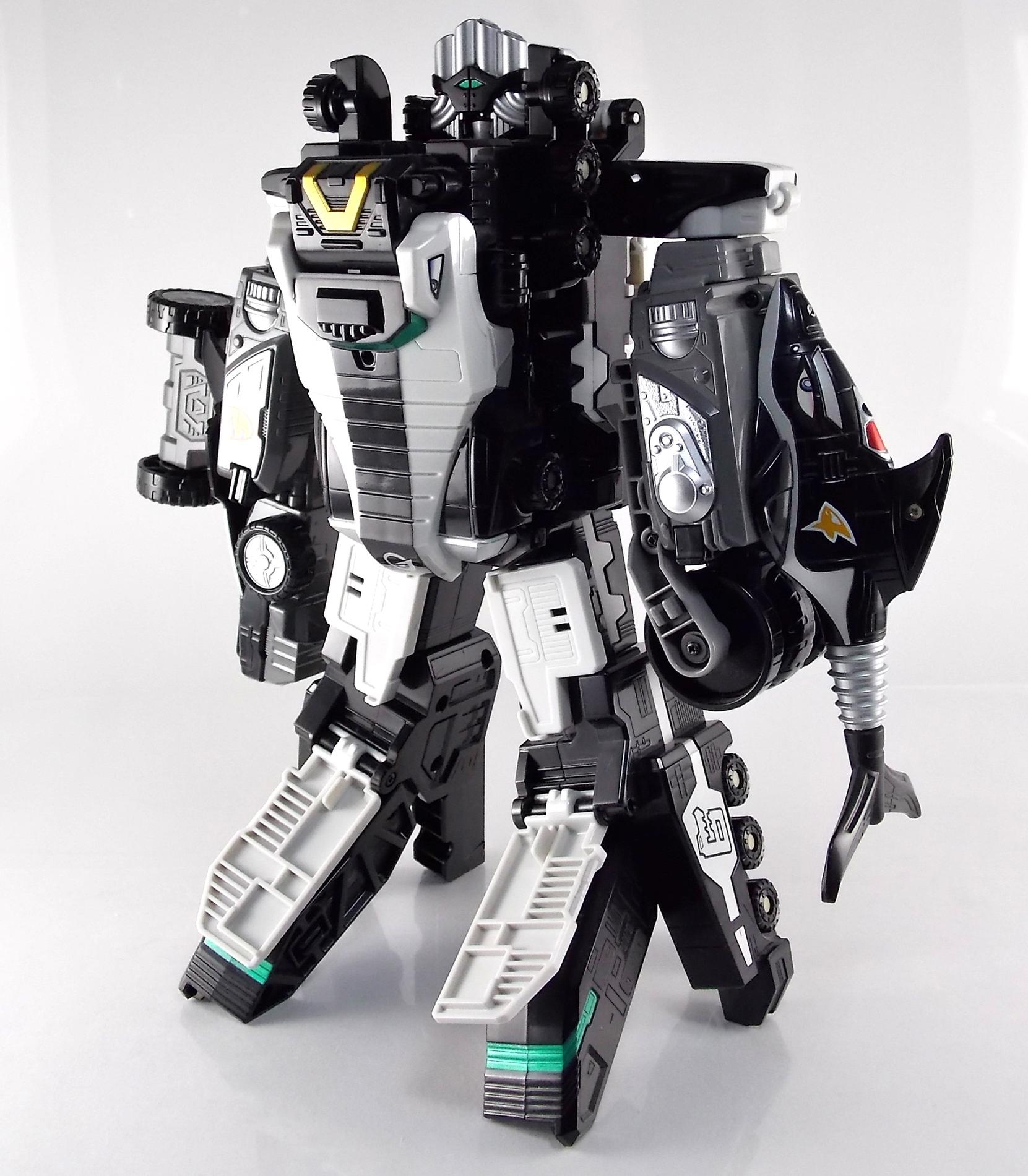 TokuNation is proud to present a long long overdue gallery. Rounding out our COMPLETE series of Engine Sentai Go-Onger DX mecha at last, we bring to you the DX Police Deco Gunbir-Oh! You may recall last year that for the entire month of July we took a look back at the entire Go-Onger toyline and posted galleries for each set and their various combinations. The elusive Toy Dreams Project Police Deco Gunbir-Oh was the final piece of the puzzle I'd been unable to attain until very very recently. Thankfully though I can finally share a full gallery of this wonderful set with the community! It should be noted that as a Toy Dreams Project release this is an entirely toy exclusive coloration. It's solely unique to this toy and has no basis in any show related material. Like basically all Toy Dreams Project releases. Packaging As a special release, Police Gunbir-Oh differs from the standard DX Gunbiroh in that it was sold as a complete 3-piece boxed set. The components of Gunbir Oh were originally sold in 3 individual boxes. As a limited Toy Dreams Project release it's only natural that these figures would be boxed together for sale. The box obviously has a bit more flare to it thanks to it featuring this new deco of Gunbir-Oh as well. It even advertises the altered G6 combination you can make with Engine Oh which is impressive. Birca DX Birca was originally in a mostly bright green color scheme with black for accents. For Police Deco Birca black has flipped from his base to replace all the green, while the base retains a flat gray color. The eyes have also been changed from bright yellow to white with blue pupils. The silver detailing and #4 emblem, as well as all 3 tires are largely unchanged. The Birca Engine Soul has also been changed to an opaque black plastic with a more "sparkly" foil like label on it. Gunpherd The least changed of the 3, Police Deco Gunpherd is only distinguishable from the original because of the gray used for his base. Otherwise it's nearly identical to the original DX Gunpherd. It's kind of understandable though as Gunpherd is already a police car and had the appropriate colors to begin with. It's a similar situation to the Gaohunter Blue Moon release with the mostly unchanged Gao Wolf & Hammerhead. The Gunpherd Engine Soul has also been changed to an opaque black plastic with a more "sparkly" foil like label on it. Carrygator DX Carrygator was a bright orange car carrying alligator robot. Now he's a sleek black & white Police Deco car carrying robot? Yeah alligator car carriers are still a little out there no matter what color they're in. By far this one looks the best of the trio. And oddly it has the easiest color swap. All of Carrygator's orange plastics and paint apps have been swapped for white. And since the basic figure is black with green accents already, boom you have a police gator that looks pretty damn snazzy. It really outshines the standard Carrygator. The Carrygator Engine Soul has also been changed to an opaque black plastic with a more "sparkly" foil like label on it. Gunbir-Oh & Combinations When all combined Police Deco Gunbir-Oh actually succeeds in being a far more cohesive looking robo than the standard version. These colors lend themselves very well to the individual vehicles as is but the combined form is incredibly appealing. The combined forms with the various other Engines benefit from this color change to an extent as well. The one form I was most excited to create with this set involved the DX Engine Dai Shogun. Though it isn't really an official combo nothing else would be either involving Police Gunbir-Oh either. Either way I think it's befitting that 2 repaints of Go-Onger mecha that aren't normally supposed to be combined with anthing, look pretty damn snazy together. It's by far my favorite thing to do with this set. But you can also still create the Engine Oh G6, G9. & G12 with this set as there are no mold differences with it, only color. And while the G6 combo looks fine, and perhaps G9, by the time you get to 12 all of the Police Deco parts are on the feet and don't mesh with anything else sadly. Final Thoughts At the end of the day DX Police Deco Gunbir-Oh is by far a superfluous thing to own. It's gorgeous in these colors don't get me wrong, I'm thrilled personally to have it. But you have to be a huge Go-Onger fan to seek this one out as it's a toy exclusive coloration. Worse yet is that in most cases it's prohibitively expensive, ranging as high as $150-200 on the aftermarket. I love this thing, more than regular Gunbir-Oh by far, but it's definitely for the ultimate Go-Onger collectors.