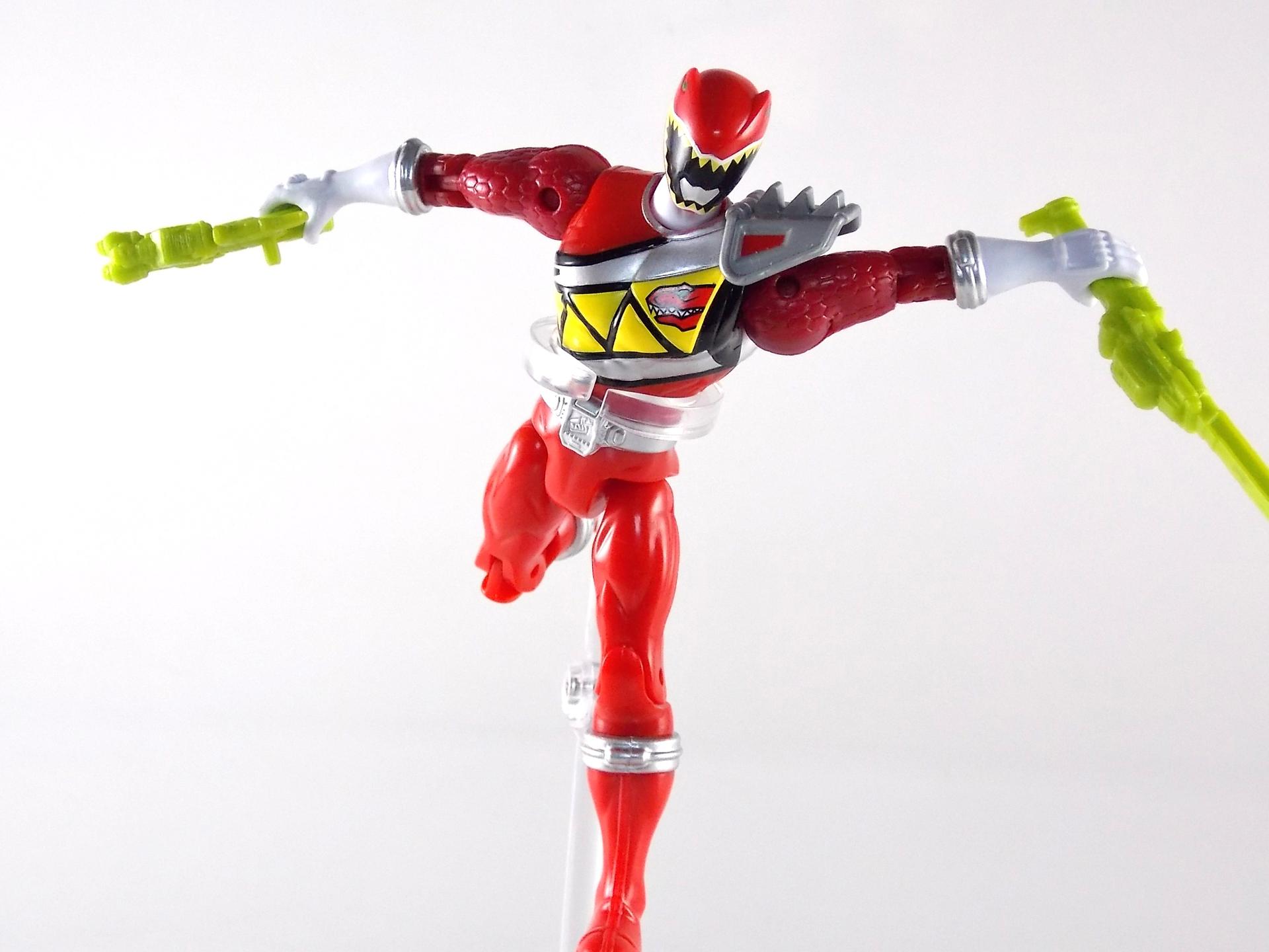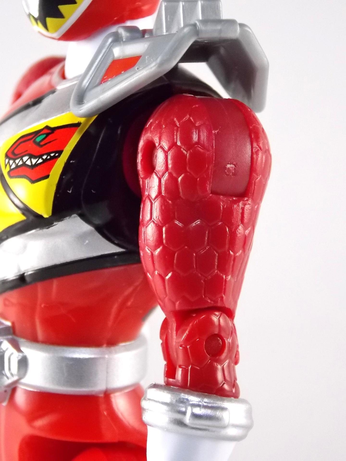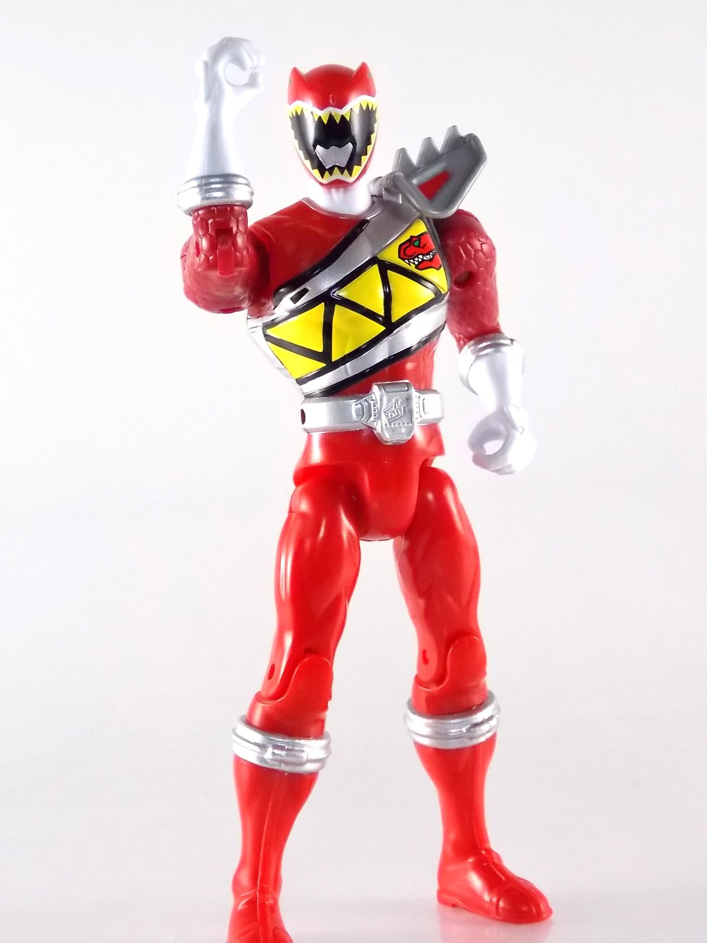 TokuNation is ready to ring in the new year with yet another gallery from Power Rangers Dino Charge! And today we're taking a look at the 5" Dino Charge Red Ranger! Packaging It seems that for this years rangers Bandai of America has stepped their game up from the rather bland semi-circular packaging of the Super Megaforce 5" line to what we have here. For Dino Charge we've been treated to some detailed packaging with pretty rad and elaborate graphics & images. Taking it's cues from the Super Megaforce line though this new 5" line also features a nice stock shot of the ranger in question on the back as well as a multi-lingual bio and a short list of stats. The packaging mistakenly labels the Red Ranger with the name Lucas, which was the original name for the character. The name was changed to Tyler when it was realized that Lucas had been used previously for the Blue Time Force Ranger. In any case it appears the change was made too late into the toy lines production cycle to change the name. A cross-sell along the bottom also advertises the other 4 Dino Charge Rangers as well as the initial villain figures for the line, Fury & the Viviks. Main Figure At this point there aren't many surprises left for figures in this scale. The Super Megaforce 5" was liked by many but was not without it's faults. While the figure were of decent quality most of the time they suffered from all too generic sculpting and parts reuse. While I'm sure that will happen here as well, for now Dino Charge Red Ranger is a fairly solid figure. It's standard fair as far as BOA figures go, but it's a pretty decent representation of the character. Definitely much more so than the barely articulated 5" Red that came with the Dino Cycle. While most of the basic tooling is similar if not identical to the Super Megaforce line, the Dino Charge suits feature much more detail, as do their figures. You'll see the standard hip peg hole and basic joints on theis figure. But the scaled look on the upper arms, the newly molded gauntlets, a decent head sculpt, and a hinged shoulder pad can go a long way to making a cheap figure like this look a little nicer. That being said I've seen reports from numerous collectors about sloppy paint applications on their 5" Dino Charge Rangers. While the paint apps are hardly accurate in the first place (inaccurate back of the suit and Dino Com) the overspray of silver on the Dino Com itself is pretty bad. Things like this are all too common in mass market toy lines like this but it's still a knock against an otherwise fine figure. Accessories As is the case with the other 4 simultaneously released Dino Charge Rangers, the 5" Red Ranger includes only two accessories: 1 - Dino Saber. Molded entirely in a lime green plastic this is the one part of the figure that does not exceed the predecessor line. No paint apps on the accessories makes look rather cheap. At least if you're going to cast it in a single color get that color right. While the blade should be this color the entire weapon shouldn't be. Though no one color would have really gotten the job done for this one. The sculpt is otherwise fairly intricate and detailed, a nice paint wash could actually bring quite a bit of that out. 1 - Dino Charge Morpher. Suffering from the same gang molded color issue as the Saber, the Morpher likewise has a great amount of detail that just can't be seen that well. If anything this accessory should have been cast in solid yellow rather than green to at least try to simulate what it should look like. Obviously these weapons don't combine into the Dino Cannon at this scale but that would have been a nice touch. Though it's only two accessories it's about the best we could have expected for a figure of this size at this price point. While they certainly aren't perfect, they do get the job done. Final Thoughts While I've never personally been the biggest fan of the 5" Power Rangers line, it's apparent that the Dino Charge 5" Rangers are nicer than what we got with Super Megaforce. Are they perfect? No, far from it. But for a collector on a budget who wants to own their favorite ranger this is a pretty good stand in. Paint & color issues aside the 5" Dino Charge Red Ranger will look great with most any other 5" ranger figures.