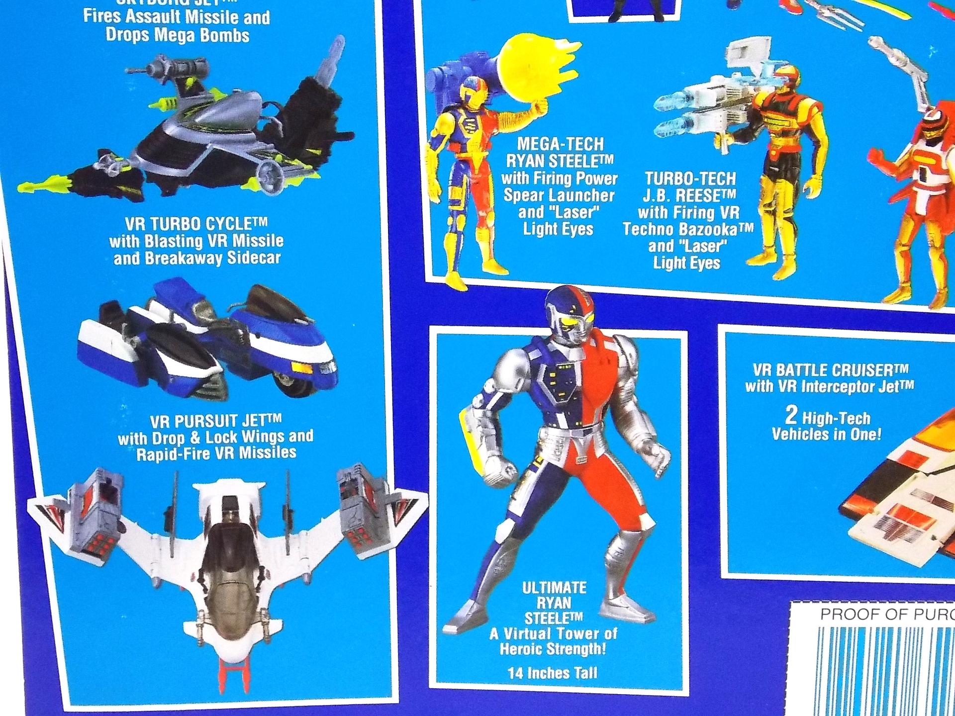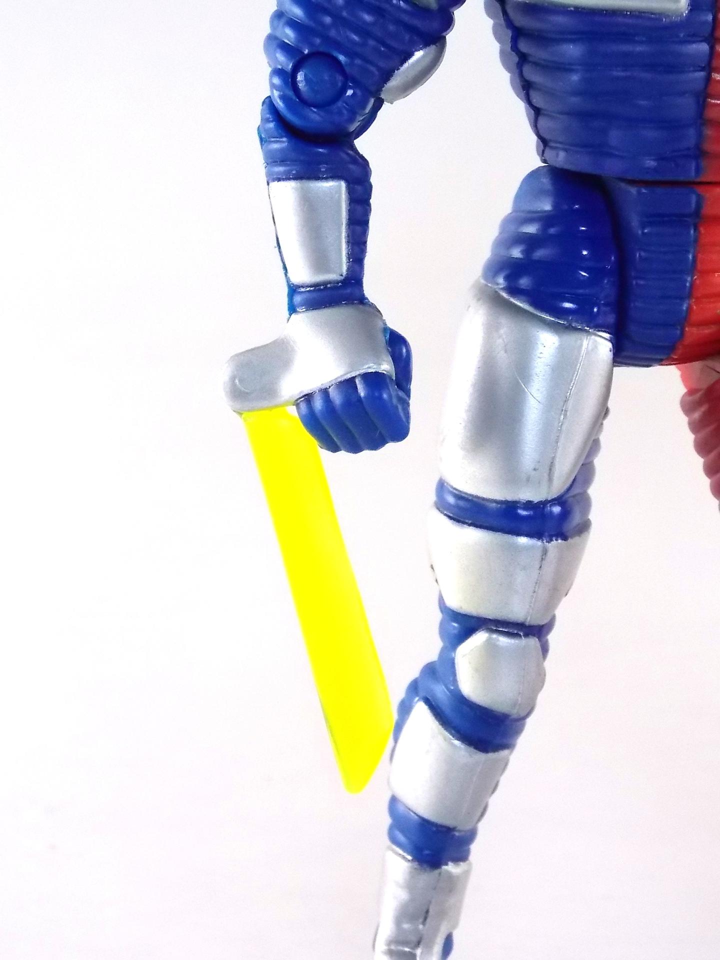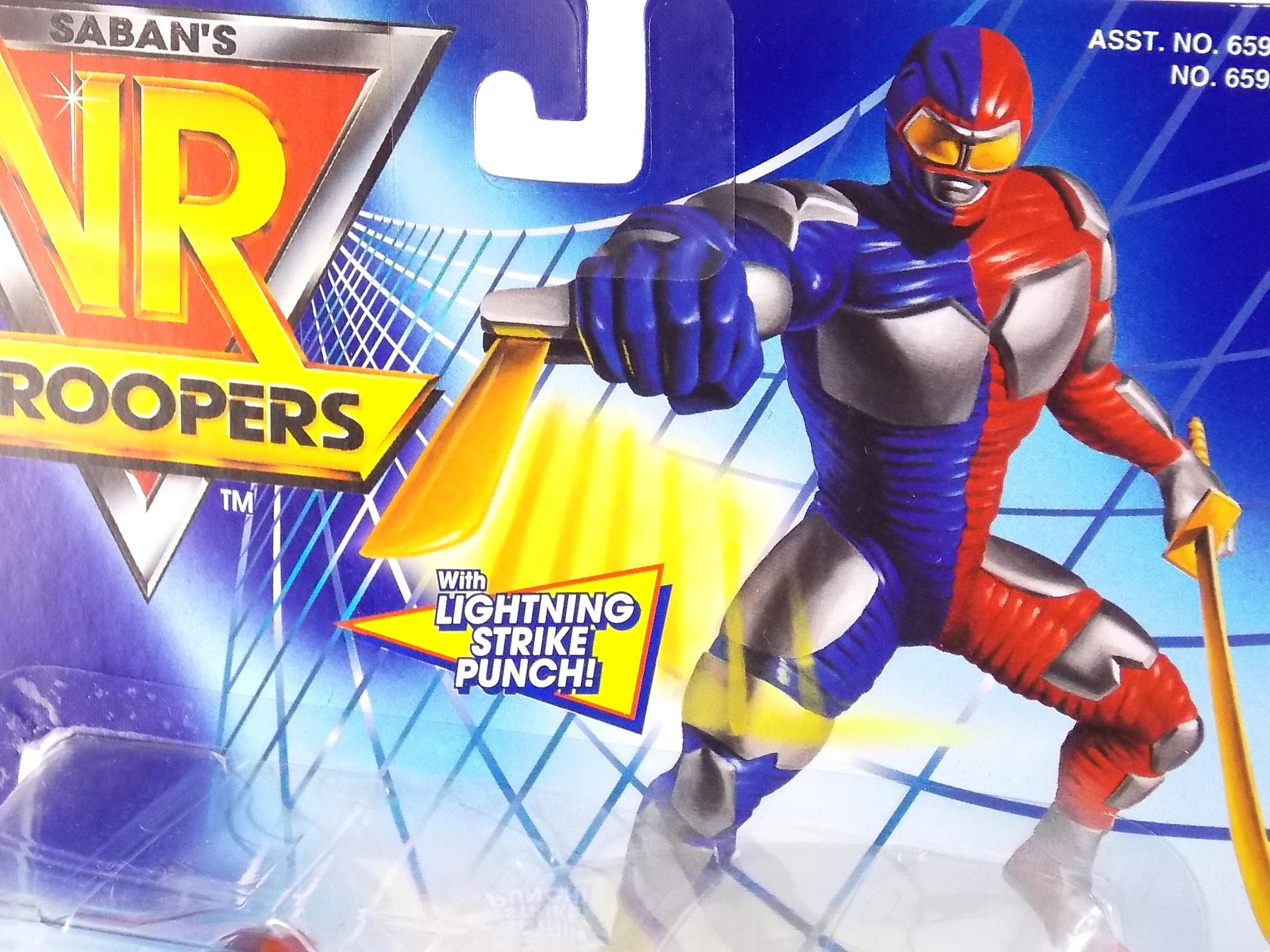 This unique form is the product of Saban's constraint to use both Metalder & Spielban footage during season 1 of the show. Since the footage came from 2 shows the 3 heroes could never really be shown together on screen without the cost of filming new footage with the Metalder, Spielban, & Diana Lady suits. The easiest solution was to create these new cheaper costumes and write them in as new forms. These were incredibly cheap spandex suits with basic padding on them that all featured poorly repainted Mighty Morphin Red Ranger helmets. Though they definitely aren't as polished as their finished counterparts, they're kind of a fun & quirky love child of the 90's american toku industry. The figure is itself much the same. Packaging Typical of the VR Troopers toy line Battle Grid Ryan Steele comes carded, though this card back is a bit larger than most of the figures released in the line. Packaged on the same style of widened cards as the Battle Tech & Turbo Tech figures, you can see tons of cross-sells for the rest of the line. These more Deluxe releases included more accessories than standard VR figures and generally featured weapons and designs not seen in the show. The Battle Grid suits themselves were featured in series, but the weapons the toys included were not. The front of the card features some seriously wicked art that makes a goofy spandex suit with a repainted Red Ranger helmet look truly awesome. Main Figure For those who don't know the VR Troopers toy line was actually contracted out by Bandai. Unlike their Power Rangers & Beetleborgs figures, VR Troopers was produced by Kenner. As a result the toy line wound up being a bit of a hodgepodge of various toys and figures, some Japanese molds, some new american molds, and even others imported from other toy lines. The Battle Grid figures are of course entirely US made. Battle Grid Ryan Steele is pretty unique. It's got the handicap of 90's articulation working against it, but it's otherwise a nice toy. It has basic shoulders & hips, and one "floppy" right elbow joint. It's meant to swing swing the attached blade for a Lightning Strike Punch attack when the legs are squeezed. The figure actually has more to it than the full suit did with the ribbed detailing. And although the show helmet is itself a repainted MMPR Red one, the toy is not a mere repaint but is an original mold meant to evoke it. Which is kind of ironic and awesome. Accessories Like any good action figure released in the 90's Battle Grid Ryan Steele included so many accessories that he can't even use them all, nor are any of them relevant to his show appearances. None of theme are officially named on the packaging or elsewhere: 2 - Energy Katanas. Each cast in translucent yellow plastic. They actually aren't that bad, but the figure is only capable of holding one at a time while storing the second in his back holster. Only the left hand is molded open to hold a weapon while the lightning strike right fist is molded shut. So the second katana is kind of overkill. One could assume this weapon is maybe an homage to Metalder's Katana, but that's probably not something that was part of the design process for this toy. 1 - Sai. This is a really odd one. As the only non-energized accessory in the set it's really out of place. Again Ryan can only hold it in his left hand or store it on his back, but that's now 3 weapons he includes with places to put only 2 of them. 1 - VR Troopers Shield. This one is the most awesome accessory in the set. Emblazoned with the VR Troopers logo it's clearly a toy only item that really screams 90's, but it's my favorite thing included with Ryan. Why not bash in a monsters face with a shield bearing your team's name? As with the above accessories you can only place this in his left hand and it can't be stored on his back, so you run into the accessory storage situation again. Though the accessories are confusing and superfluous they're right in line with what we should expect from a toy released in the mid-90's. Final Thoughts Obviously it's hard to review a toy like this 20 years after it's release and try to hold it to some kind of crazy modern standard. This thing is silly, fun, includes a ton of weapons, has an action feature, and honestly looks pretty cool. With some more basic articulation it'd be pretty much perfect. I'm always a sucker for forms created specifically for american toku shows and the Battle Grid suits from VR Troopers take the cake for most odd and fun. Battle Grid Ryan Steele is one weird and awesome piece in my collection. I have Kaitlin as well, but have never been able to find a J.B.
