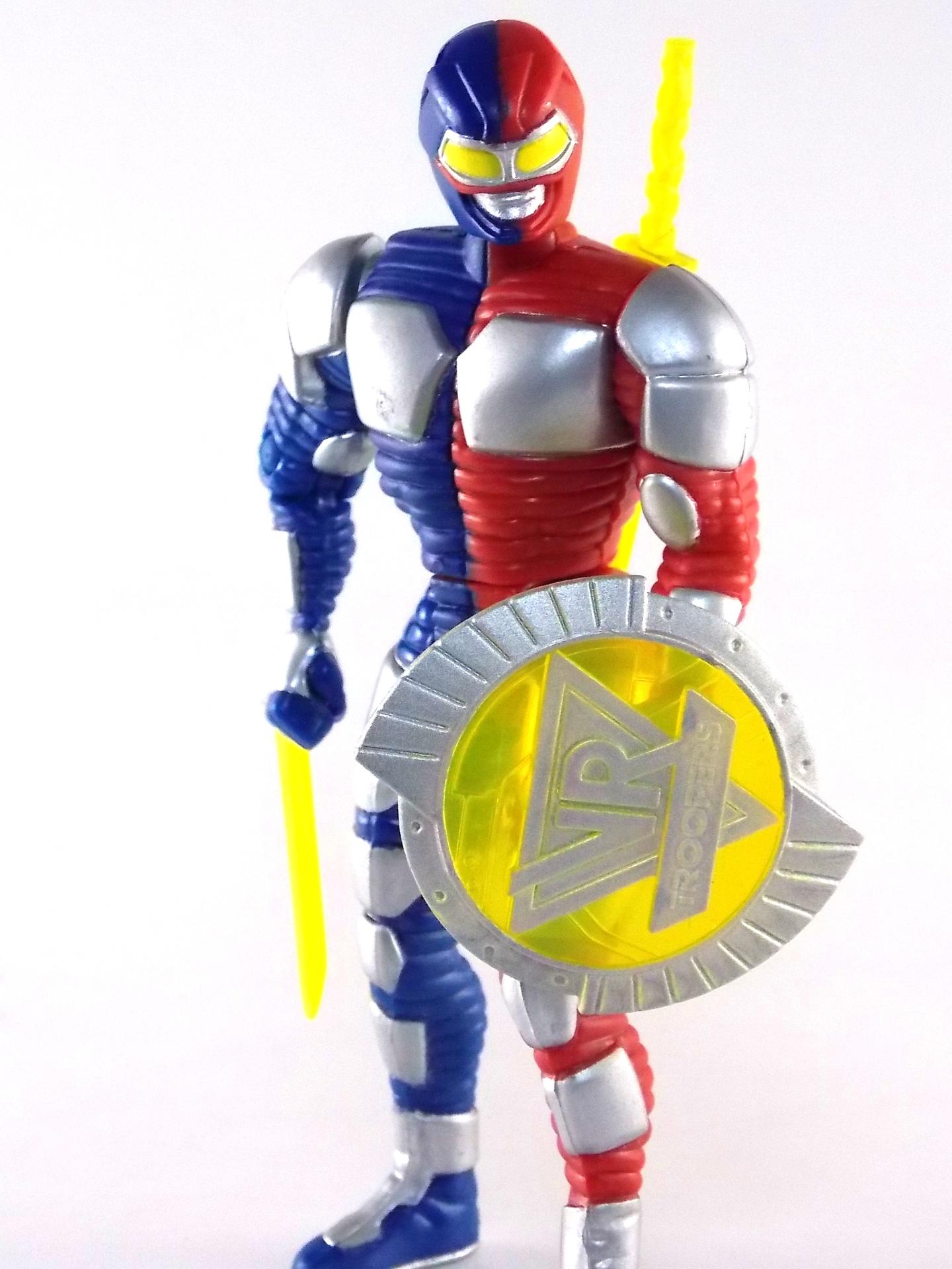This unique form is the product of Saban's constraint to use both Metalder & Spielban footage during season 1 of the show. Since the footage came from 2 shows the 3 heroes could never really be shown together on screen without the cost of filming new footage with the Metalder, Spielban, & Diana Lady suits. The easiest solution was to create these new cheaper costumes and write them in as new forms. These were incredibly cheap spandex suits with basic padding on them that all featured poorly repainted Mighty Morphin Red Ranger helmets. Though they definitely aren't as polished as their finished counterparts, they're kind of a fun & quirky love child of the 90's american toku industry. The figure is itself much the same. Packaging Typical of the VR Troopers toy line Battle Grid Ryan Steele comes carded, though this card back is a bit larger than most of the figures released in the line. Packaged on the same style of widened cards as the Battle Tech & Turbo Tech figures, you can see tons of cross-sells for the rest of the line. These more Deluxe releases included more accessories than standard VR figures and generally featured weapons and designs not seen in the show. The Battle Grid suits themselves were featured in series, but the weapons the toys included were not. The front of the card features some seriously wicked art that makes a goofy spandex suit with a repainted Red Ranger helmet look truly awesome. Main Figure For those who don't know the VR Troopers toy line was actually contracted out by Bandai. Unlike their Power Rangers & Beetleborgs figures, VR Troopers was produced by Kenner. As a result the toy line wound up being a bit of a hodgepodge of various toys and figures, some Japanese molds, some new american molds, and even others imported from other toy lines. The Battle Grid figures are of course entirely US made. Battle Grid Ryan Steele is pretty unique. It's got the handicap of 90's articulation working against it, but it's otherwise a nice toy. It has basic shoulders & hips, and one "floppy" right elbow joint. It's meant to swing swing the attached blade for a Lightning Strike Punch attack when the legs are squeezed. The figure actually has more to it than the full suit did with the ribbed detailing. And although the show helmet is itself a repainted MMPR Red one, the toy is not a mere repaint but is an original mold meant to evoke it. Which is kind of ironic and awesome. Accessories Like any good action figure released in the 90's Battle Grid Ryan Steele included so many accessories that he can't even use them all, nor are any of them relevant to his show appearances. None of theme are officially named on the packaging or elsewhere: 2 - Energy Katanas. Each cast in translucent yellow plastic. They actually aren't that bad, but the figure is only capable of holding one at a time while storing the second in his back holster. Only the left hand is molded open to hold a weapon while the lightning strike right fist is molded shut. So the second katana is kind of overkill. One could assume this weapon is maybe an homage to Metalder's Katana, but that's probably not something that was part of the design process for this toy. 1 - Sai. This is a really odd one. As the only non-energized accessory in the set it's really out of place. Again Ryan can only hold it in his left hand or store it on his back, but that's now 3 weapons he includes with places to put only 2 of them. 1 - VR Troopers Shield. This one is the most awesome accessory in the set. Emblazoned with the VR Troopers logo it's clearly a toy only item that really screams 90's, but it's my favorite thing included with Ryan. Why not bash in a monsters face with a shield bearing your team's name? As with the above accessories you can only place this in his left hand and it can't be stored on his back, so you run into the accessory storage situation again. Though the accessories are confusing and superfluous they're right in line with what we should expect from a toy released in the mid-90's. Final Thoughts Obviously it's hard to review a toy like this 20 years after it's release and try to hold it to some kind of crazy modern standard. This thing is silly, fun, includes a ton of weapons, has an action feature, and honestly looks pretty cool. With some more basic articulation it'd be pretty much perfect. I'm always a sucker for forms created specifically for american toku shows and the Battle Grid suits from VR Troopers take the cake for most odd and fun. Battle Grid Ryan Steele is one weird and awesome piece in my collection. I have Kaitlin as well, but have never been able to find a J.B.
