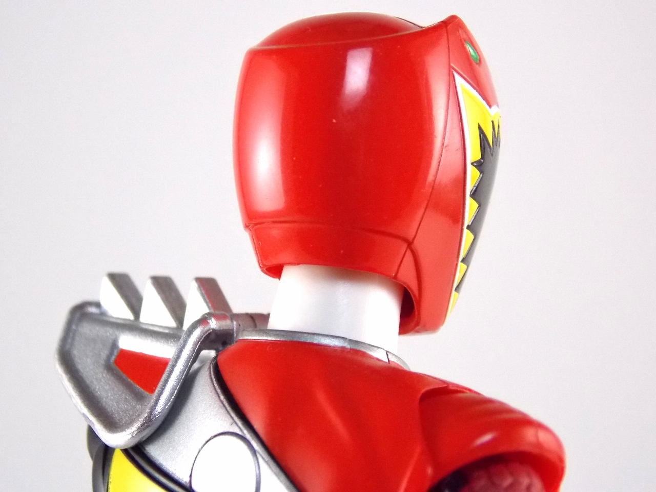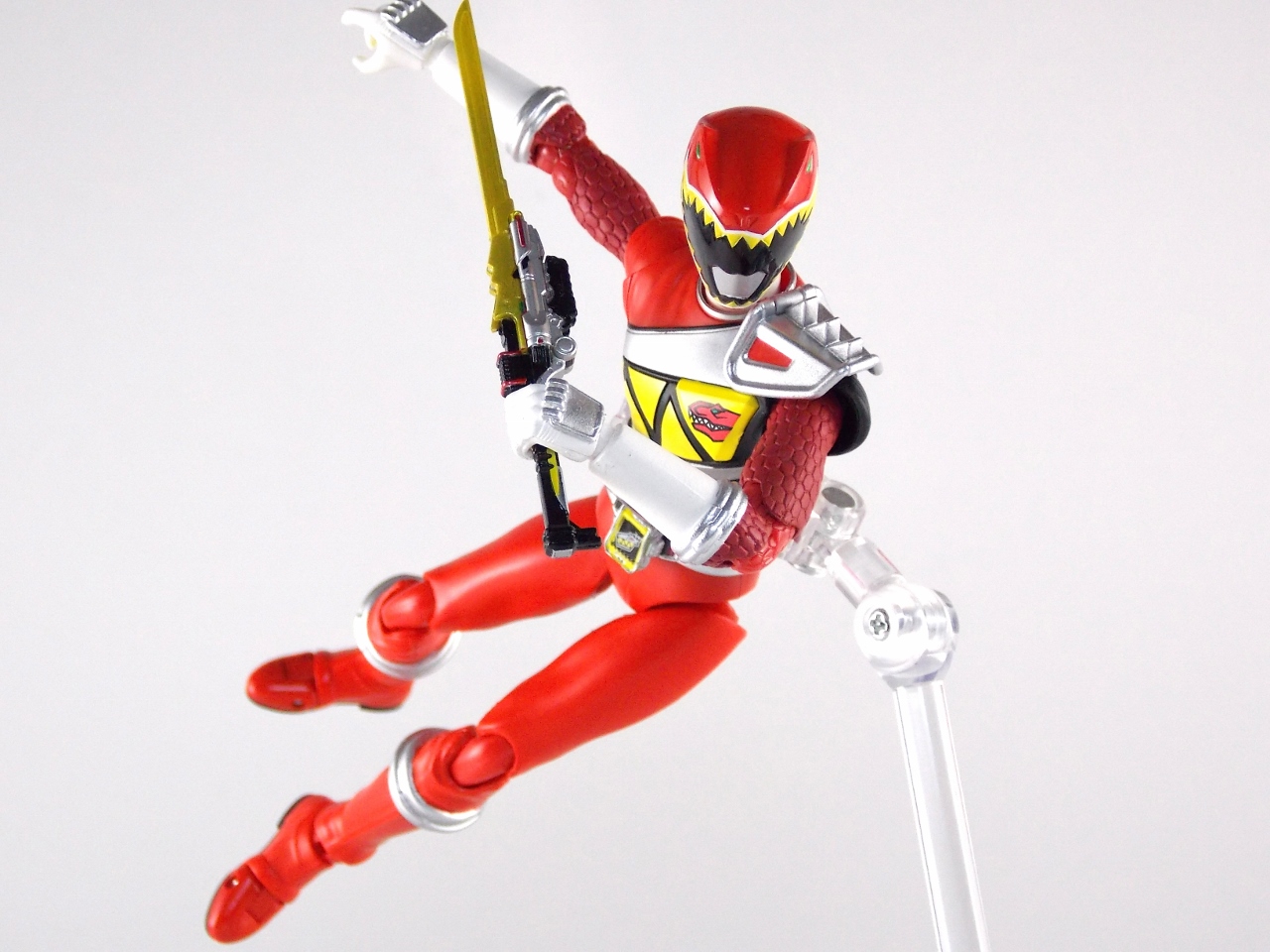 A renewed gallery for a new year! It's time for TokuNation to take it's Gallery 2.0 do-overs to the next level! Taking a look back at our archive of old galleries we thought that with the premiere of Power Rangers Dino Charge upon us it would be the opportune time to go back and give Zyuden Sentai Kyoryuger the TLC it deserves. So without further delay we now present S.H. Figuarts Kyoryu Red (Gallery 2.0)! Packaging Kyoryu Red comes in quite the interesting box. Though Sentai Figuarts haven't been around nearly as longs as Rider ones, they initially started out with the same boring box design. But in recent years Bandai's really gone all out, Kyoryuger figuarts are no different. Not just a simple window box, Kyoryu Red's really tries to evoke the general look and feel of his costume, right down to the "sash" across the window. The back of the box is also pretty snazy to just be a selection of stock photos. I mean honestly the Kyoryuger Boxes were some of the nicest sentai figuarts packaging for their time. Main Figure As with any time a new Sentai Figuart is release, Kyoryu Red is an entirely new base body. And wow what a nice one it is. The Kyoryuger designs are some of the more busy modern sentai suits we've had in a while, and I mean that in a good way. Luckily the busyness, in fact the more armored nature of this costume, lends itself that much more to being a toy. Where Riders Metal Heroes & the like have the advantage of armored costumes and less apparent articulation cuts, sentai costumes are basically fabric. So reproducing that in articulated toy form can be difficult. But Kyoryu Red really pulls off his look quite well. The lower half of the body is simple stuff. Come up to the belt though and look at the glorious detail on the Mobuckle. It's hard to see at that scale but the Kyoryuger emblem and even the eyes on the sides of the buckle are fully painted. The Mobuckle can also rotate to the side to simulate what happens when a Zyudenchi would normally be removed from inside. At this scale though they couldn't engineer the Mobuckle to open and store them. But that's okay as the included Zyudenchi is tiny. Further up brings us to the exquisitely molded arm details. Rather than go for a fishnet style paint job on the arms to get the scaly feel of the costume, Bandai has instead sculpted the detailing into the arms themselves! Thus creating a much more polished look that works better than I ever thought it would. The chest and head though are where the figure knocks it out of the park. As I said the more armored nature of the figure lends itself well to the toy makeover. The chest emblem, sash, shoulder, & back are all gloriously detailed and fully painted. The Gabutyra emblem in particular looks great. The head while well sculpted could stand to be painted just a little bit better. The front and back halves of it appear to actually be different colors under the right light. A minor gripe but one none the less. Otherwise it's dead on the show suit. And as for posability, well see for yourself below. Kyoryu Red can assume any of his iconic poses with ease and pretty great balance as well. The shoulder armor doesn't impact articulation either thanks to the hinge on the pad. So this guy has great open ranges of movement at his disposal. Accessories Kyoryu Red comes loaded down with a basically perfect assortment of what you need: 1 - Gaburevolver. The trademark weapon/henshin device of the Kyoryugers is done true justice here. You'd think at this size it would be missing paint apps but frankly it's perfect. It's just incredible how perfectly to scale this thing is painted compared to the real thing. Now the barrel doesn't spin nor can it open up on the end to accept Zyudenchi, but considering how small the Zyudenchi for these figuarts are that's fine. Once you got one in I'm sure it would never come out again. 1 - Generic Zyudenchi. Though by association this should be Gabutyra's Zyudenchi, it simply isn't painted correctly. Though to be fair none of the 6 Kyoryuger Figuarts have Zyudenchi with entirely accurate colors. But that's mostly because at this scale it's nigh impossible to paint properly. So some general colors are slapped on so you get a feel for it. Again this thing is infinitesimally small and I won't use it for anything again ever. I'm fine with it being kind of generic. 1 - Gaburicalibur. Again this is a wonderfully detailed piece. Right down to the most minor details this is a perfect recreation of the show prop. Again it does not open or accept batteries and I'm totally okay with that. What I'm not okay with however is that the Gaburevolver & Gaburicalibu do not combine into the Gaburicannon. Nor is a separately molded version of it included with any figuart. If a Kyoryu Violet is ever made it would almost certainly come with him/her as it was used quite often by the second (female) Violet. 3 - sets of additional hands. For your general needs. You get one set of Revolver hands, one set of Calibur hands, and one set of splayed out roll call pose hands. 1 - Armed On Arm. A great inclusion here is the option to display your figure as Kyoryu Red Armed On. To use this you need to (pretty forcefully) yank out his right arm at the shoulder socket. Then plug this one on. I've found this to be infuriatingly difficult to do with. Most of the time I can get it more or less on but can't always get that last "click" to lock it into place. But when you do, and then the arm stays up properly, the look is very satisfying. 1 - Gabutyra Fang. A complimentary piece to the Armed On Arm, the Gabutyra Fang is Kyoryu Red's Armed On weapon. Another beautifully, almost cartoonishly, sculpted piece that looks like it walked right off the set. It fully replaces the fist of the arm you plug it onto but it shoulder primarily be used on the the right Armed Arm. The jaw opens and closes and is on a nice tight joint so you can display it open if you so choose. While this Fang can't combine with the 