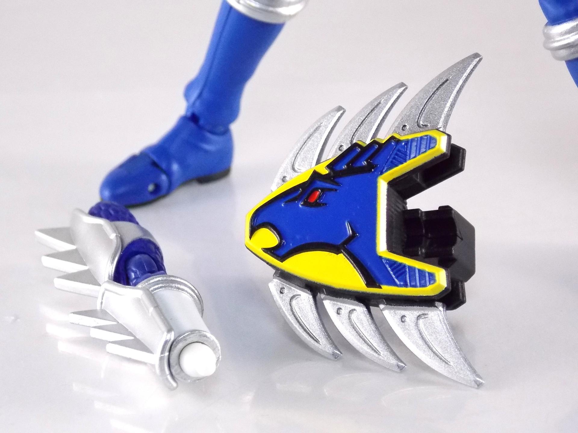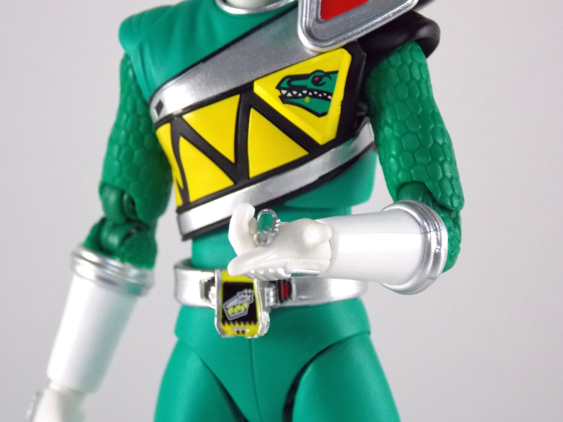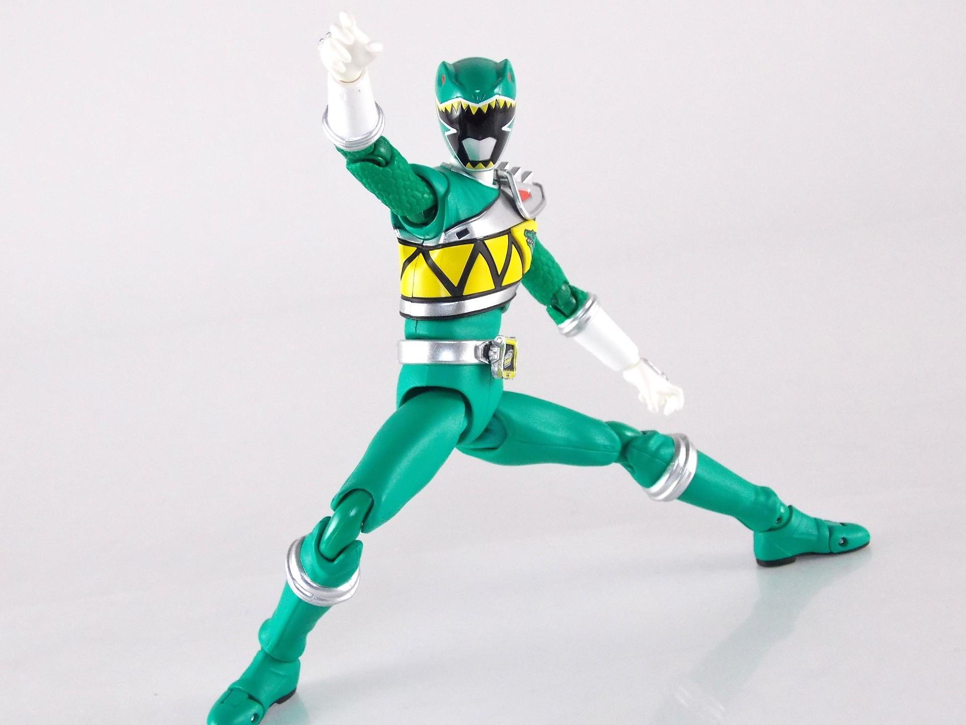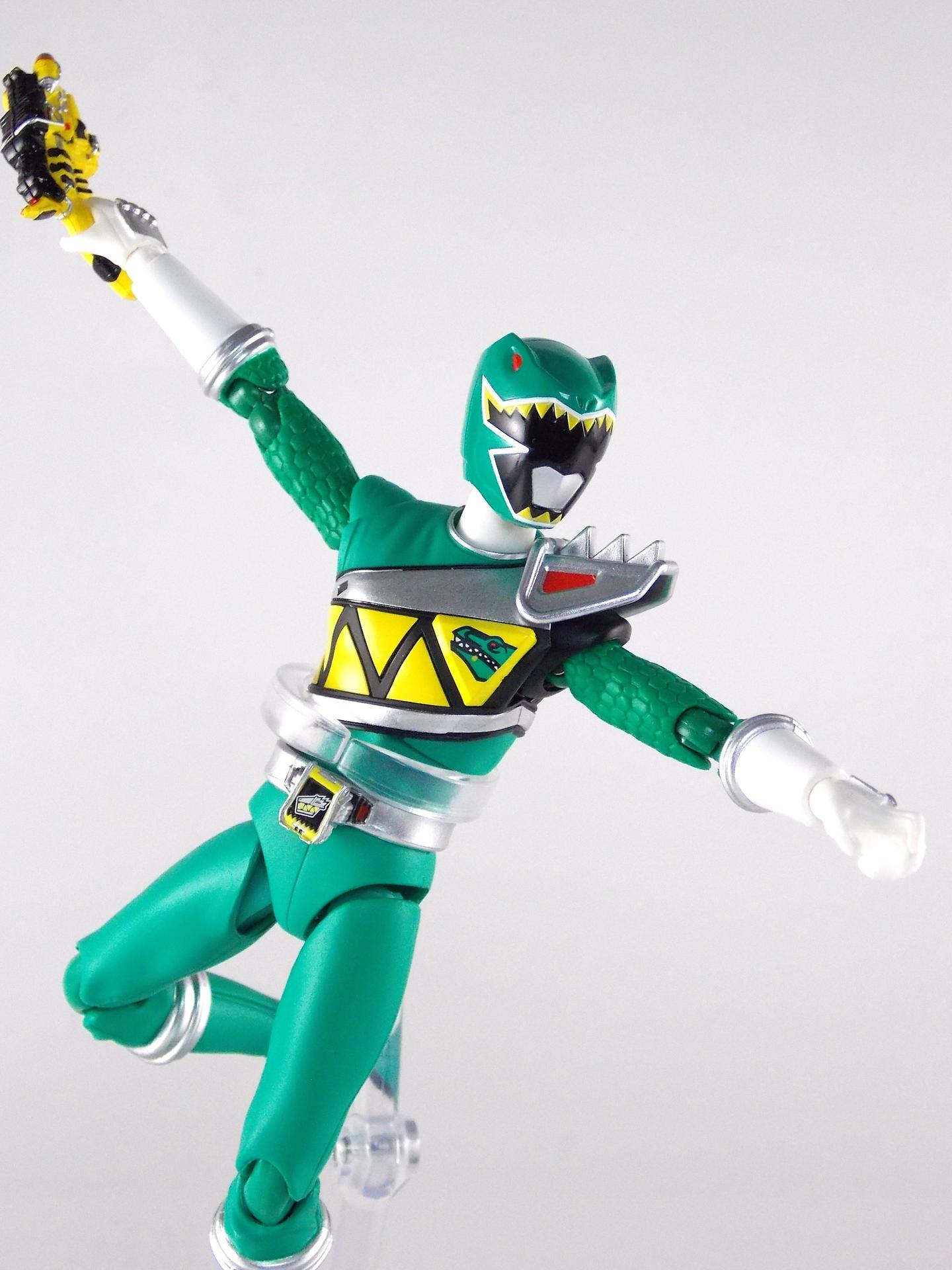 The Slashing Brave! Continuing TokuNation's Gallery 2.0 do-overs leading into Power Rangers Dino Charge we're back with another look back at Zyuden Sentai Kyoryuger! This time we're doing S.H. Figuarts Kyoryu Blue & Kyoryu Green Gallery 2.0! ** A majority of this review will be identical to my Kyoryu Red gallery & review. These figures are nigh identical to it aside from accessories. Packaging Kyoryu Blue & Green come in the same interesting box that Kyoryu Red did. Though Sentai Figuarts haven't been around nearly as longs as Rider ones, they initially started out with the same boring box design but Kyoryuger figuarts are much nicer. Though unlike Kyoryu Red, Blue & Green (as a tamashii web exclusive release) do not feature a window box. Main Figure Kyoryu Blue & Green feature the same new base body as Kyoryu Red. And wow what a nice one it is. The Kyoryuger designs are some of the more busy modern sentai suits we've had in a while, and I mean that in a good way. Luckily the busyness, in fact the more armored nature of this costume, lends itself that much more to being a toy. Where Riders Metal Heroes & the like have the advantage of armored costumes and less apparent articulation cuts, sentai costumes are basically fabric. So reproducing that in articulated toy form can be difficult. But Kyoryu Blue & Green really pull off his look quite well. The lower half of the body is simple stuff. Come up to the belt though and look at the glorious detail on the Mobuckle. It's hard to see at that scale but the Kyoryuger emblem and even the eyes on the sides of the buckle are fully painted. The Mobuckle can also rotate to the side to simulate what happens when a Zyudenchi would normally be removed from inside. At this scale though they couldn't engineer the Mobuckle to open and store them. But that's okay as the included Zyudenchi is tiny. Further up brings us to the exquisitely molded arm details. Rather than go for a fishnet style paint job on the arms to get the scaly feel of the costume, Bandai has instead sculpted the detailing into the arms themselves! Thus creating a much more polished look that works better than I ever thought it would. The chest and head though are where the figures really knock it out of the park. As I said the more armored nature of these figures lend themselves well to the toy makeover. The chest emblems, sash, shoulder, & backs are all gloriously detailed and fully painted. The Stegotchi emblem in particular looks great. However the Zakutor emblem on my Kyoryu Green has a nasty drop of paint right in the middle of it.... The heads for both are sculpted fantastically and the color matches are much better than they were on Kyoryu Red. The sculpt is a bit more dynamic on Kyoryu Blue but both he and Kyoryu Green look very solid. And as for posability, well see for yourself below. Kyoryu Blue & Green (much like Red) can assume any of their iconic poses with ease and pretty great balance as well. The shoulder armor doesn't impact articulation either thanks to the hinge on the pad. So these guys have great open ranges of movement at their disposal. Accessories Kyoryu Blue & Green also come loaded down with a basically perfect assortment of what you need. Each of them come with: 1 - Gaburevolver. The trademark weapon/henshin device of the Kyoryugers is done true justice here. You'd think at this size it would be missing paint apps but frankly it's perfect. It's just incredible how perfectly to scale this thing is painted compared to the real thing. Now the barrel doesn't spin nor can it open up on the end to accept Zyudenchi, but considering how small the Zyudenchi for these figuarts are that's fine. Once you got one in I'm sure it would never come out again. 1 - Generic Zyudenchi. Though by association these should be Stegotchi's & Zakutor's Zyudenchi respectively, they simply aren't painted correctly. Though to be fair none of the 6 Kyoryuger Figuarts have Zyudenchi with entirely accurate colors. But that's mostly because at this scale it's nigh impossible to paint properly. So some general colors are slapped on so you get a feel for it. Again this thing is infinitesimally small and I won't use it for anything again ever. I'm fine with it being kind of generic. 1 - Gaburicalibur. Again this is a wonderfully detailed piece. Right down to the most minor details this is a perfect recreation of the show prop. Again it does not open or accept batteries and I'm totally okay with that. What I'm not okay with however is that the Gaburevolver & Gaburicalibu do not combine into the Gaburicannon. Nor is a separately molded version of it included with any figuart. If a Kyoryu Violet is ever made it would almost certainly come with him/her as it was used quite often by the second (female) Violet. 4 - sets of additional hands. For your general needs. You get one set of Revolver hands, one set of Calibur hands, and one set of splayed out roll call pose hands. 1 - Armed On Arm. A great inclusion here is the option to display either of your figures in their Armed On forms! To use these you need to (pretty forcefully) yank out the right arms at the shoulder socket. Then plug the new one on. I've found this to be infuriatingly difficult to do with. Most of the time I can get them more or less on but can't always get that last "click" to lock them into place. But when you do, and then the arm stays up properly, the look is very satisfying. Then there are some unique accessories for each figure: 1 - Stego Shield. A complimentary piece to the Armed On Arm, the Stego Shield is Kyoryu Blue's Armed On weapon. Another beautifully, almost cartoonishly, sculpted piece that looks like it walked right off the set. While this Shield can't combine with the other Kyoyuger weapons into the Kentrospiker, a version of the Stego Shield is included in the S.H. Figuarts Kyoryu Black & Pink Set. That one comes already combined as the Shield Lanslasher combo. So thankfully you have the option to have both a comple