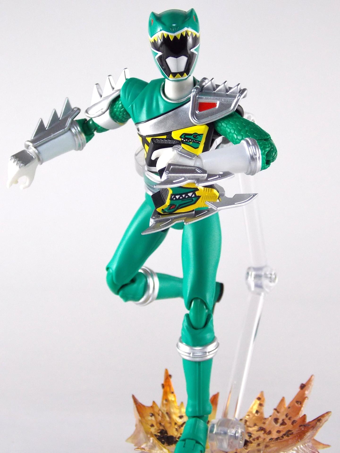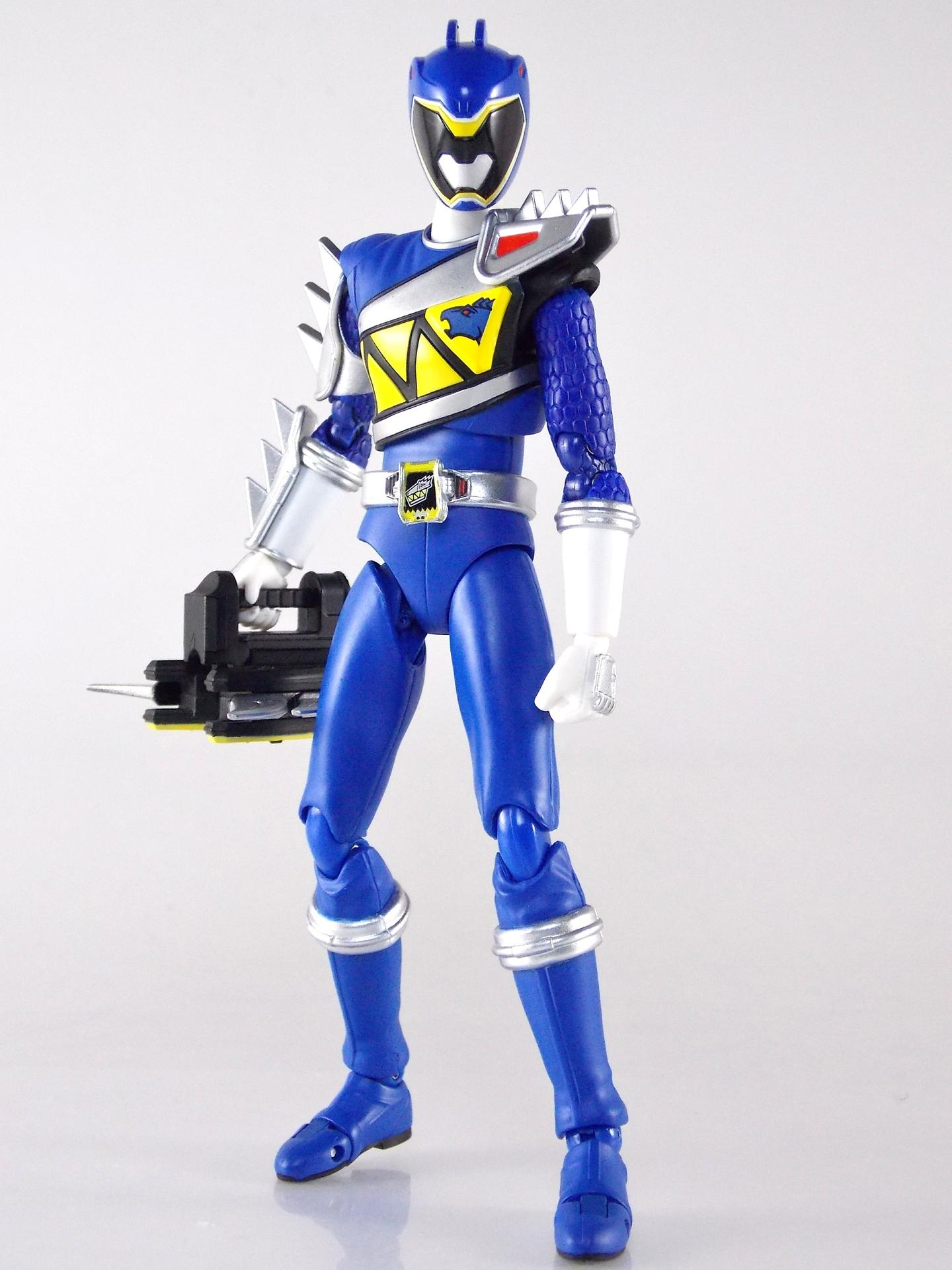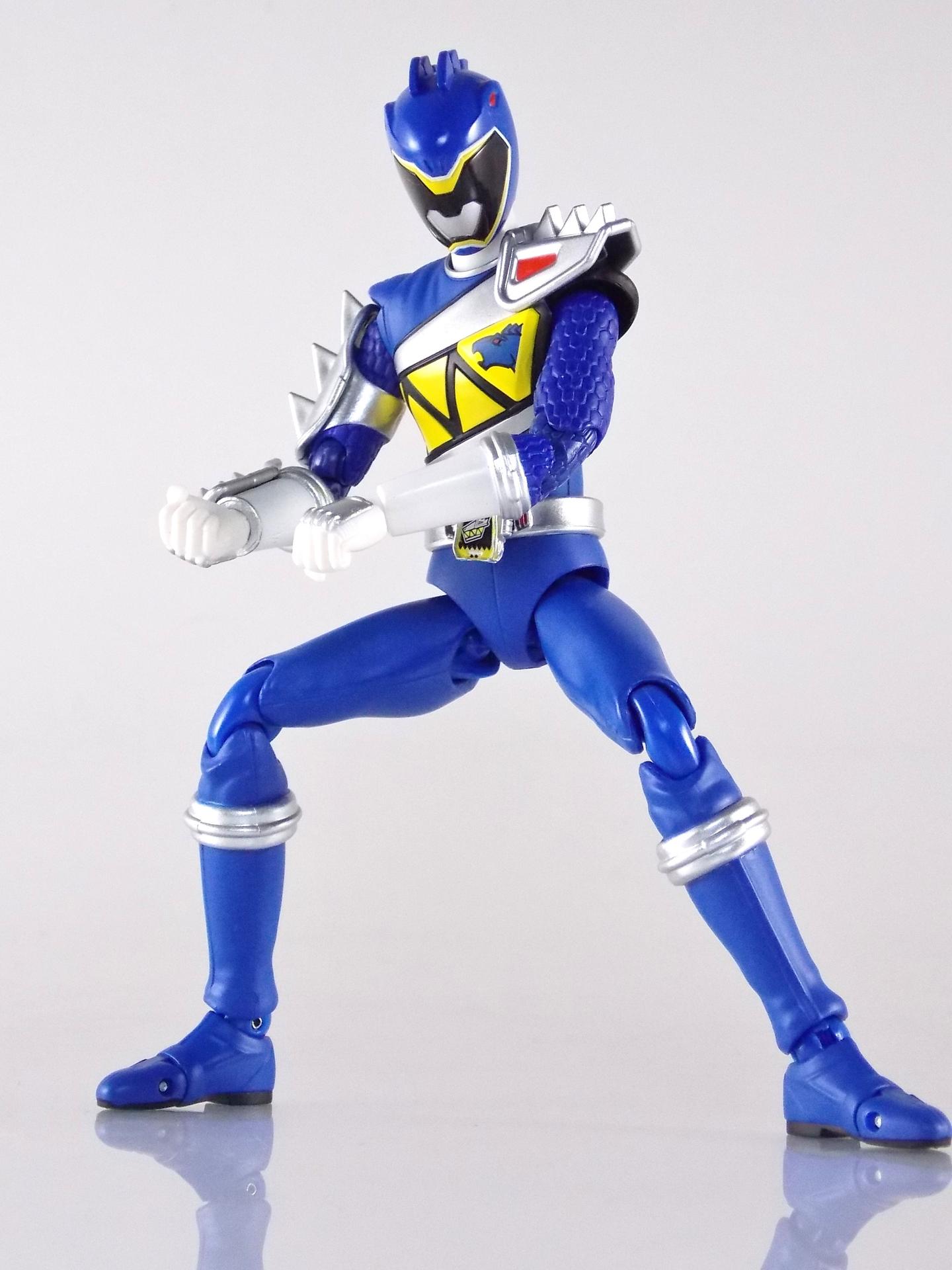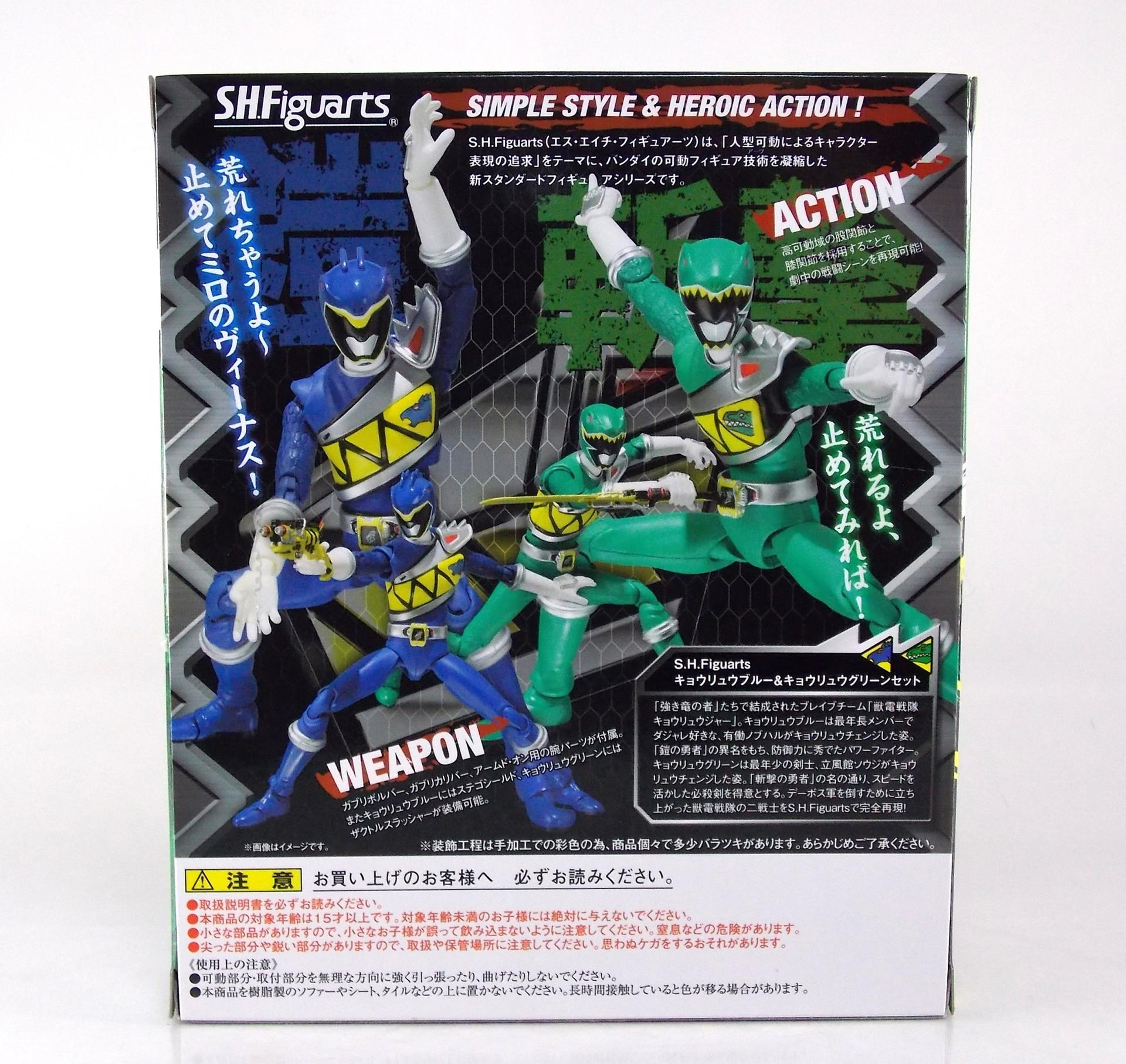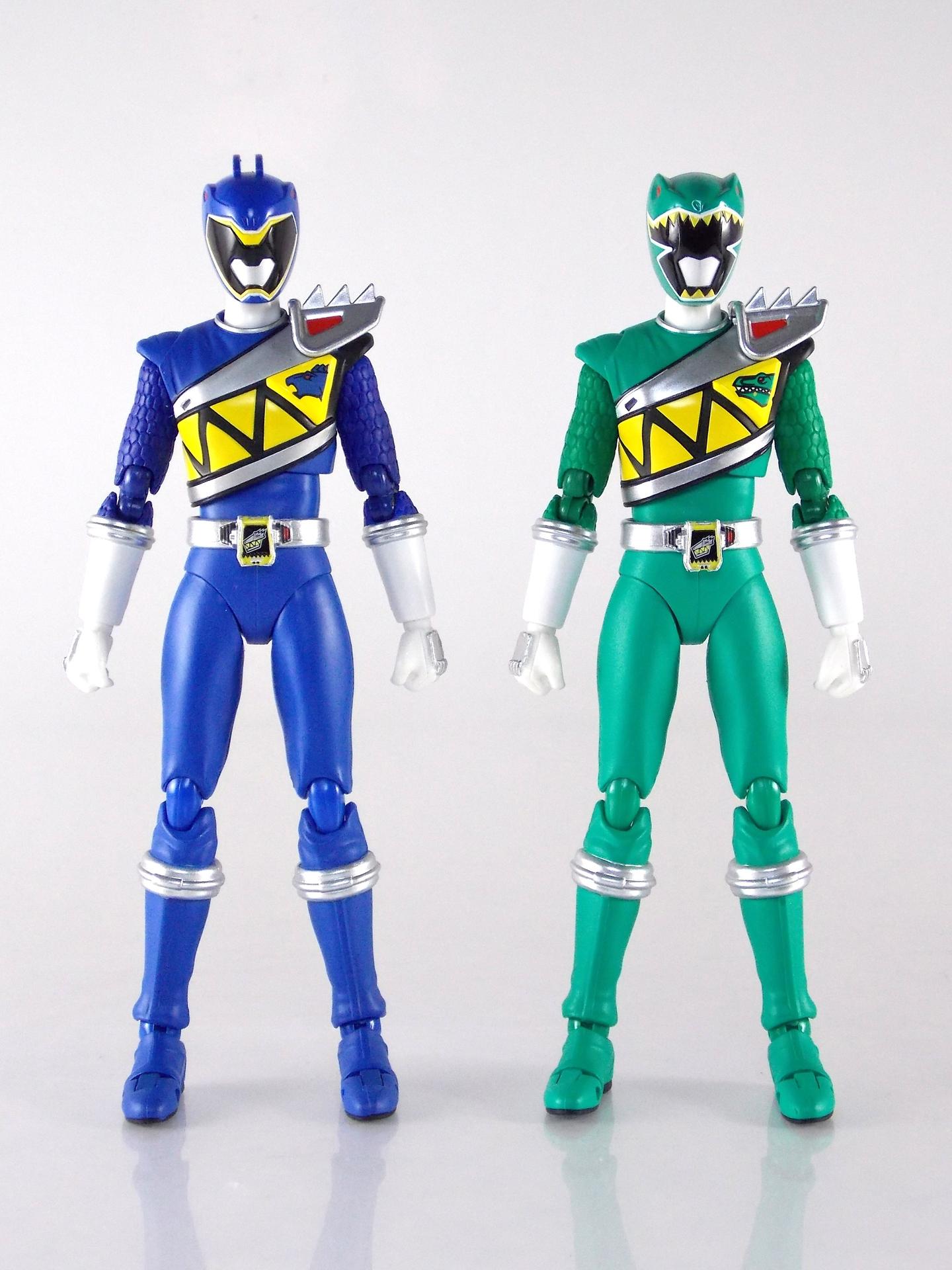 The Slashing Brave! Continuing TokuNation's Gallery 2.0 do-overs leading into Power Rangers Dino Charge we're back with another look back at Zyuden Sentai Kyoryuger! This time we're doing S.H. Figuarts Kyoryu Blue & Kyoryu Green Gallery 2.0! ** A majority of this review will be identical to my Kyoryu Red gallery & review. These figures are nigh identical to it aside from accessories. Packaging Kyoryu Blue & Green come in the same interesting box that Kyoryu Red did. Though Sentai Figuarts haven't been around nearly as longs as Rider ones, they initially started out with the same boring box design but Kyoryuger figuarts are much nicer. Though unlike Kyoryu Red, Blue & Green (as a tamashii web exclusive release) do not feature a window box. Main Figure Kyoryu Blue & Green feature the same new base body as Kyoryu Red. And wow what a nice one it is. The Kyoryuger designs are some of the more busy modern sentai suits we've had in a while, and I mean that in a good way. Luckily the busyness, in fact the more armored nature of this costume, lends itself that much more to being a toy. Where Riders Metal Heroes & the like have the advantage of armored costumes and less apparent articulation cuts, sentai costumes are basically fabric. So reproducing that in articulated toy form can be difficult. But Kyoryu Blue & Green really pull off his look quite well. The lower half of the body is simple stuff. Come up to the belt though and look at the glorious detail on the Mobuckle. It's hard to see at that scale but the Kyoryuger emblem and even the eyes on the sides of the buckle are fully painted. The Mobuckle can also rotate to the side to simulate what happens when a Zyudenchi would normally be removed from inside. At this scale though they couldn't engineer the Mobuckle to open and store them. But that's okay as the included Zyudenchi is tiny. Further up brings us to the exquisitely molded arm details. Rather than go for a fishnet style paint job on the arms to get the scaly feel of the costume, Bandai has instead sculpted the detailing into the arms themselves! Thus creating a much more polished look that works better than I ever thought it would. The chest and head though are where the figures really knock it out of the park. As I said the more armored nature of these figures lend themselves well to the toy makeover. The chest emblems, sash, shoulder, & backs are all gloriously detailed and fully painted. The Stegotchi emblem in particular looks great. However the Zakutor emblem on my Kyoryu Green has a nasty drop of paint right in the middle of it.... The heads for both are sculpted fantastically and the color matches are much better than they were on Kyoryu Red. The sculpt is a bit more dynamic on Kyoryu Blue but both he and Kyoryu Green look very solid. And as for posability, well see for yourself below. Kyoryu Blue & Green (much like Red) can assume any of their iconic poses with ease and pretty great balance as well. The shoulder armor doesn't impact articulation either thanks to the hinge on the pad. So these guys have great open ranges of movement at their disposal. Accessories Kyoryu Blue & Green also come loaded down with a basically perfect assortment of what you need. Each of them come with: 1 - Gaburevolver. The trademark weapon/henshin device of the Kyoryugers is done true justice here. You'd think at this size it would be missing paint apps but frankly it's perfect. It's just incredible how perfectly to scale this thing is painted compared to the real thing. Now the barrel doesn't spin nor can it open up on the end to accept Zyudenchi, but considering how small the Zyudenchi for these figuarts are that's fine. Once you got one in I'm sure it would never come out again. 1 - Generic Zyudenchi. Though by association these should be Stegotchi's & Zakutor's Zyudenchi respectively, they simply aren't painted correctly. Though to be fair none of the 6 Kyoryuger Figuarts have Zyudenchi with entirely accurate colors. But that's mostly because at this scale it's nigh impossible to paint properly. So some general colors are slapped on so you get a feel for it. Again this thing is infinitesimally small and I won't use it for anything again ever. I'm fine with it being kind of generic. 1 - Gaburicalibur. Again this is a wonderfully detailed piece. Right down to the most minor details this is a perfect recreation of the show prop. Again it does not open or accept batteries and I'm totally okay with that. What I'm not okay with however is that the Gaburevolver & Gaburicalibu do not combine into the Gaburicannon. Nor is a separately molded version of it included with any figuart. If a Kyoryu Violet is ever made it would almost certainly come with him/her as it was used quite often by the second (female) Violet. 4 - sets of additional hands. For your general needs. You get one set of Revolver hands, one set of Calibur hands, and one set of splayed out roll call pose hands. 1 - Armed On Arm. A great inclusion here is the option to display either of your figures in their Armed On forms! To use these you need to (pretty forcefully) yank out the right arms at the shoulder socket. Then plug the new one on. I've found this to be infuriatingly difficult to do with. Most of the time I can get them more or less on but can't always get that last "click" to lock them into place. But when you do, and then the arm stays up properly, the look is very satisfying. Then there are some unique accessories for each figure: 1 - Stego Shield. A complimentary piece to the Armed On Arm, the Stego Shield is Kyoryu Blue's Armed On weapon. Another beautifully, almost cartoonishly, sculpted piece that looks like it walked right off the set. While this Shield can't combine with the other Kyoyuger weapons into the Kentrospiker, a version of the Stego Shield is included in the S.H. Figuarts Kyoryu Black & Pink Set. That one comes already combined as the Shield Lanslasher combo. So thankfully you have the option to have both a comple