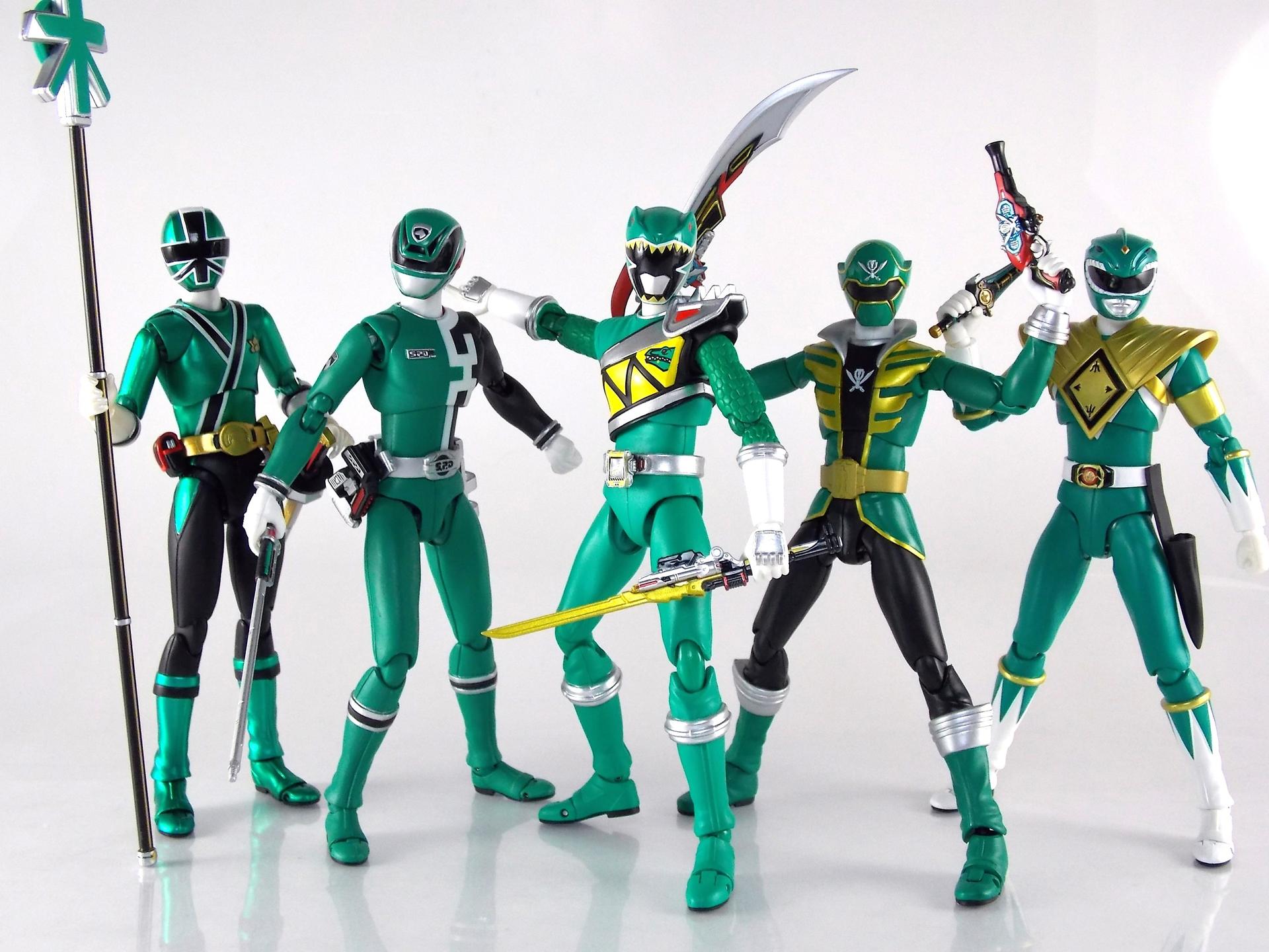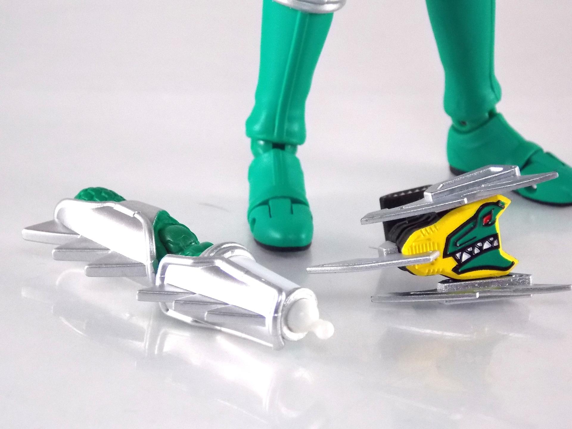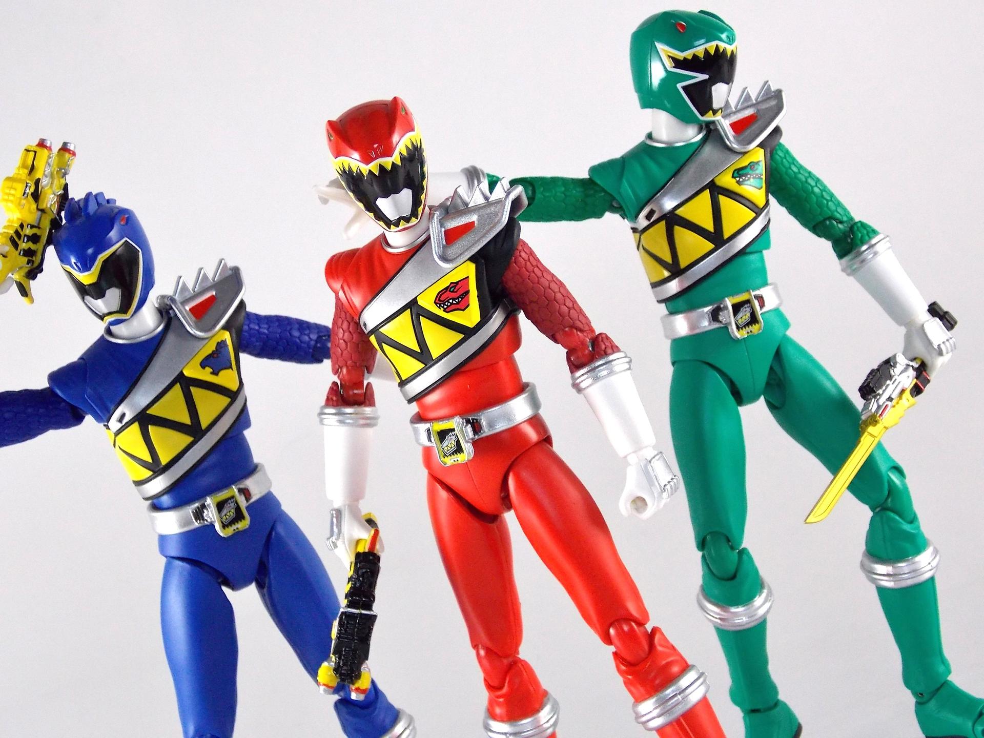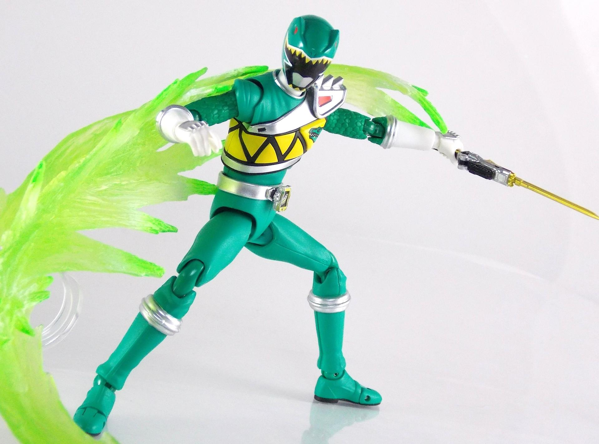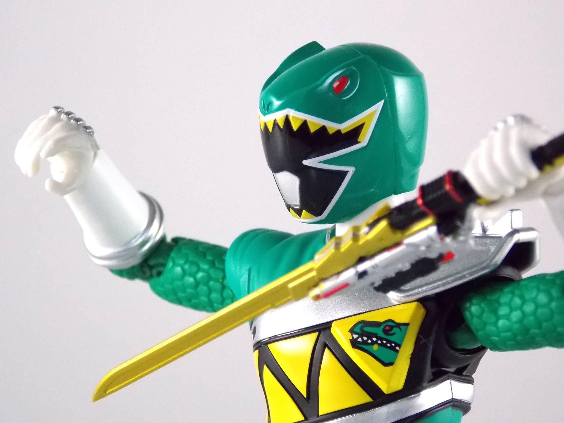 The Slashing Brave! Continuing TokuNation's Gallery 2.0 do-overs leading into Power Rangers Dino Charge we're back with another look back at Zyuden Sentai Kyoryuger! This time we're doing S.H. Figuarts Kyoryu Blue & Kyoryu Green Gallery 2.0! ** A majority of this review will be identical to my Kyoryu Red gallery & review. These figures are nigh identical to it aside from accessories. Packaging Kyoryu Blue & Green come in the same interesting box that Kyoryu Red did. Though Sentai Figuarts haven't been around nearly as longs as Rider ones, they initially started out with the same boring box design but Kyoryuger figuarts are much nicer. Though unlike Kyoryu Red, Blue & Green (as a tamashii web exclusive release) do not feature a window box. Main Figure Kyoryu Blue & Green feature the same new base body as Kyoryu Red. And wow what a nice one it is. The Kyoryuger designs are some of the more busy modern sentai suits we've had in a while, and I mean that in a good way. Luckily the busyness, in fact the more armored nature of this costume, lends itself that much more to being a toy. Where Riders Metal Heroes & the like have the advantage of armored costumes and less apparent articulation cuts, sentai costumes are basically fabric. So reproducing that in articulated toy form can be difficult. But Kyoryu Blue & Green really pull off his look quite well. The lower half of the body is simple stuff. Come up to the belt though and look at the glorious detail on the Mobuckle. It's hard to see at that scale but the Kyoryuger emblem and even the eyes on the sides of the buckle are fully painted. The Mobuckle can also rotate to the side to simulate what happens when a Zyudenchi would normally be removed from inside. At this scale though they couldn't engineer the Mobuckle to open and store them. But that's okay as the included Zyudenchi is tiny. Further up brings us to the exquisitely molded arm details. Rather than go for a fishnet style paint job on the arms to get the scaly feel of the costume, Bandai has instead sculpted the detailing into the arms themselves! Thus creating a much more polished look that works better than I ever thought it would. The chest and head though are where the figures really knock it out of the park. As I said the more armored nature of these figures lend themselves well to the toy makeover. The chest emblems, sash, shoulder, & backs are all gloriously detailed and fully painted. The Stegotchi emblem in particular looks great. However the Zakutor emblem on my Kyoryu Green has a nasty drop of paint right in the middle of it.... The heads for both are sculpted fantastically and the color matches are much better than they were on Kyoryu Red. The sculpt is a bit more dynamic on Kyoryu Blue but both he and Kyoryu Green look very solid. And as for posability, well see for yourself below. Kyoryu Blue & Green (much like Red) can assume any of their iconic poses with ease and pretty great balance as well. The shoulder armor doesn't impact articulation either thanks to the hinge on the pad. So these guys have great open ranges of movement at their disposal. Accessories Kyoryu Blue & Green also come loaded down with a basically perfect assortment of what you need. Each of them come with: 1 - Gaburevolver. The trademark weapon/henshin device of the Kyoryugers is done true justice here. You'd think at this size it would be missing paint apps but frankly it's perfect. It's just incredible how perfectly to scale this thing is painted compared to the real thing. Now the barrel doesn't spin nor can it open up on the end to accept Zyudenchi, but considering how small the Zyudenchi for these figuarts are that's fine. Once you got one in I'm sure it would never come out again. 1 - Generic Zyudenchi. Though by association these should be Stegotchi's & Zakutor's Zyudenchi respectively, they simply aren't painted correctly. Though to be fair none of the 6 Kyoryuger Figuarts have Zyudenchi with entirely accurate colors. But that's mostly because at this scale it's nigh impossible to paint properly. So some general colors are slapped on so you get a feel for it. Again this thing is infinitesimally small and I won't use it for anything again ever. I'm fine with it being kind of generic. 1 - Gaburicalibur. Again this is a wonderfully detailed piece. Right down to the most minor details this is a perfect recreation of the show prop. Again it does not open or accept batteries and I'm totally okay with that. What I'm not okay with however is that the Gaburevolver & Gaburicalibu do not combine into the Gaburicannon. Nor is a separately molded version of it included with any figuart. If a Kyoryu Violet is ever made it would almost certainly come with him/her as it was used quite often by the second (female) Violet. 4 - sets of additional hands. For your general needs. You get one set of Revolver hands, one set of Calibur hands, and one set of splayed out roll call pose hands. 1 - Armed On Arm. A great inclusion here is the option to display either of your figures in their Armed On forms! To use these you need to (pretty forcefully) yank out the right arms at the shoulder socket. Then plug the new one on. I've found this to be infuriatingly difficult to do with. Most of the time I can get them more or less on but can't always get that last "click" to lock them into place. But when you do, and then the arm stays up properly, the look is very satisfying. Then there are some unique accessories for each figure: 1 - Stego Shield. A complimentary piece to the Armed On Arm, the Stego Shield is Kyoryu Blue's Armed On weapon. Another beautifully, almost cartoonishly, sculpted piece that looks like it walked right off the set. While this Shield can't combine with the other Kyoyuger weapons into the Kentrospiker, a version of the Stego Shield is included in the S.H. Figuarts Kyoryu Black & Pink Set. That one comes already combined as the Shield Lanslasher combo. So thankfully you have the option to have both a comple