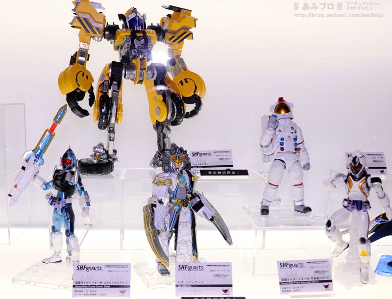 SH Figuarts on display include: A full Kamen Rider Fourze display, including Cosmic States, the Leo Zodiart, OSTO Spacesuit, Power Dizer and the various module/effect parts Kamen Rider Knight Survive Kamen Rider Super-1 Kamen Rider Zeronos Kamen Rider Den-O Super Climax Form Genocider While the SICs seen include: Kamen Rider OOO Tatoba and Tajadoru combos Kamen Rider Gills & Another Agito and Gills Raider/Dark Hopper bikes Kiwami Tamashii Kamen Rider Decade Check out the gallery after the jump!