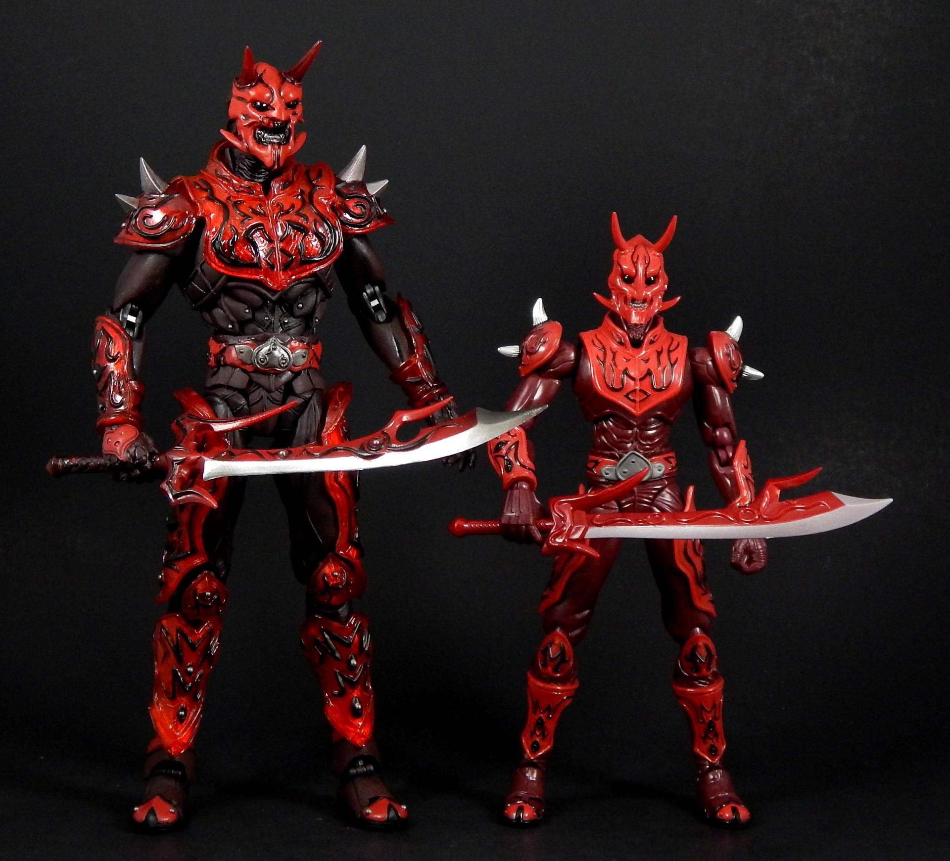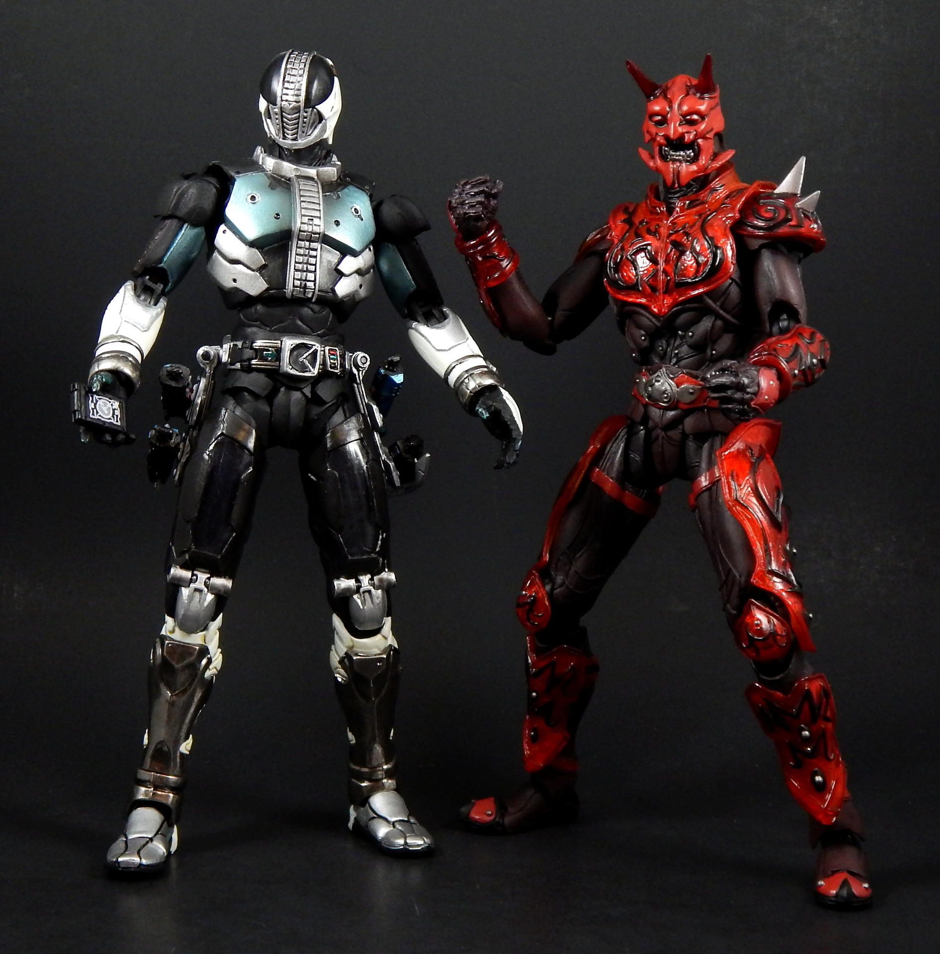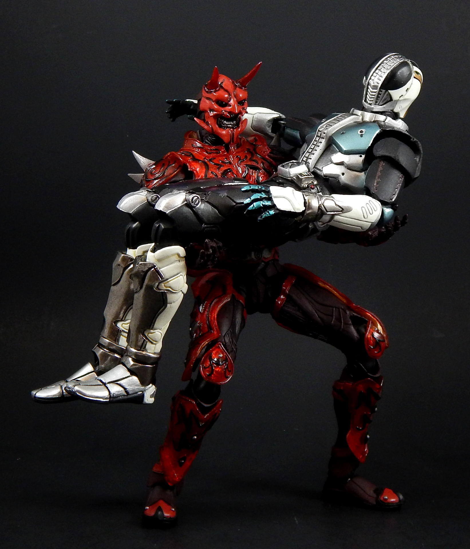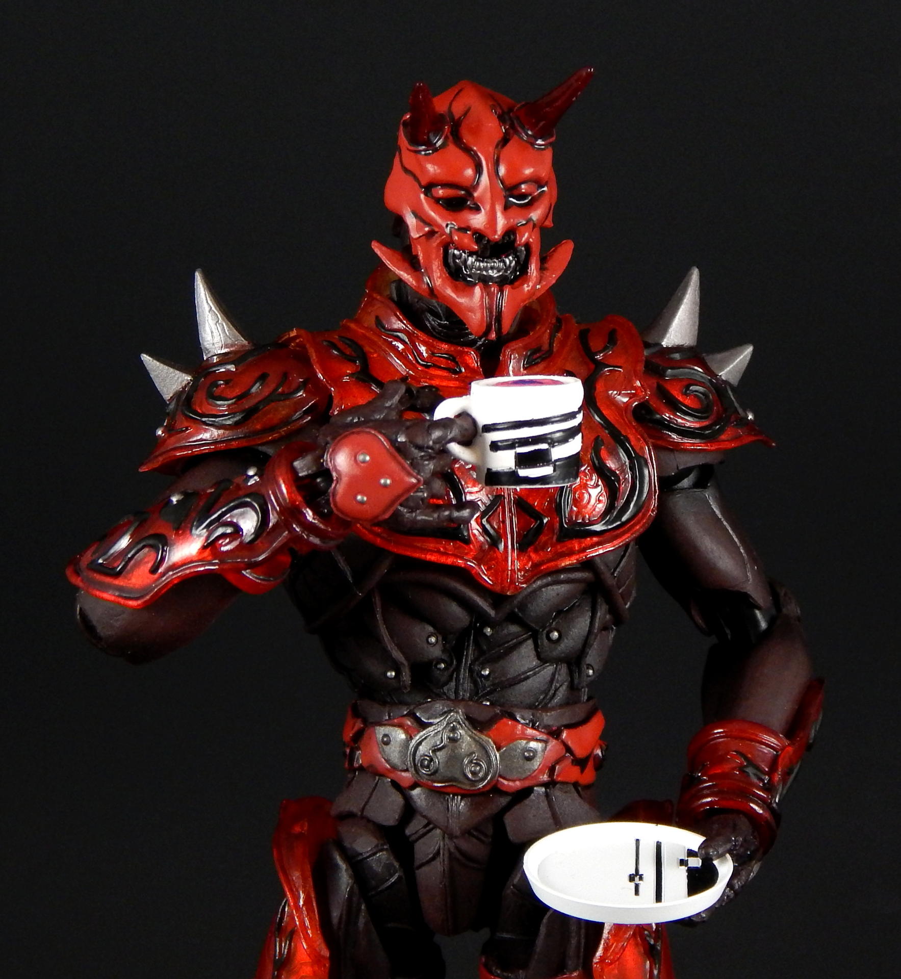 What better way to kick off a look at the Super Imaginative Chogokin Kamen Rider Den-O figures, than to start with the most well know form and character? SIC Kamen Rider Den-O Sword Form and Momotaros! I love this show, I love these characters, and I love these SIC 2 packs. I really hope I can share my love of the show and characters through these galleries of, frankly, excellent figures. Main Figure The SIC line is a bit different from my main collecting line, SH Figuarts, in many ways. They're larger figures, in the 7" tall range, and they're not meant to be show-accurate representations, but re-imaginings of those characters, as it says in the name Imaginative! The designs for the SIC Den-O are definitely different, distinct from their show-counterparts, but they're also not nearly as out-there as other SIC offerings. I love all the extra details on these figures. Starting with Momotaros, rather than looking like he's got a one piece rubber suit on under his armor, it looks like it's made out of a bunch of leather straps, with steel studs holding it together in the torso area. The armor is translucent red, with lots of fine lines etched into it, aside from the black detailing. His horns are translucent red too! Den-O is similarly detailed, with lines etched into the chest and back pieces, and his armor made to appear to be assembled of many distinct armor plates. The shin-guards are even metal, for that extra armor-feel to it (it also assists with balancing the figure). Articulation-wise, Den-O and Momotaros are similar to SH Figuarts, meaning they pretty much have all the articulation points you could want (though strictly speaking, they may have slightly fewer articulation points, and may not be quite as pose-able as Figuarts), and they all have pretty great range. They won't be doing any high kicks, but they can comfortably sit in chairs, and get in most interesting poses. The torso joints are the most limited, they can't bend forward or backward too much, Momotaros seems particularly limited, though I get the feeling the joint is stuck on mine, rather than actually being hindered by design. There are only a couple of problems I can really think of with these figures. The first is rather superficial. The forearm armor on both figures can rotate freely, and sometimes rotated into positions I didn't want. This is more noticeable on Momotaros, because Den-Os are basically bracelets (though the left arm's does extend up his arm a little bit, so if it rotates around on the inside it's in the wrong place), whereas Momo's extend the length of the forearm, so if it swivels around to the inside it will either hinder the elbow joint or look stupid. Also, they will jump off the arm anytime a hand is removed, particularly Den-O's, which are made of metal. The big problem with these figures, Den-O especially, is that several of the joints are kinda loose. It's not usually too much trouble, but when trying to stand Den-O on one leg, with the other leg propped up and him leaning on it, every one of the leg joints would give out and fold up if he wasn't exactly balanced JUST RIGHT. They do hold him up, but it can take several tries to find the sweet spot. Someday I'll get some floor polish and try to tighten them up (just like I've been saying I would for 3+ years). Den-O also has a particularly loose inner shoulder joint on one side, so I couldn't get him to hold the sword up in certain positions, without his arm dropping down. The elbow, wrist and outer shoulder joints were perfectly snug, it was just one joint that kept dropping the entire arm out of place. Momotaros' joints are also somewhat looser than I would like, but they weren't nearly as troublesome to deal with as Den-O's are. As you can see, in one picture I got Momotaros to carry Den-O, completely freestanding, and it didn't take nearly as much effort as I feared it would. Between the leg joints and that one shoulder joint, the reverse was simply not possible. Accessories: Momotaros The Momotarosword - a big fancy sword with a two hand grip, a big-ass blade and some flame-esque bits on the back and crosspiece. It's very detailed (check the grip, looks like braided leather), nicely painted and he holds it quite well. Coffee cup and plate - the signature cup of coffee that Naomi made for Momotaros, with matching plate! It looks really good, and I like the deco on the plate, something the Figuarts version lacks. It looks good displayed on a table, or being held in the included hand. 3 face plates. Not full faces, just the upper half with different eyes: wide open, fully closed, and lazy half-closed eyes. I've had this set for a number of years now, and I've always thought the different eyes were rather pointless. That is, until this photo-shoot, when I finally took the time to try to find a use for the half-closed and fully closed eyes. I won't ever display Momotaros asleep in a throne, or enjoying a good cup of coffee, but I think they made for good pictures. 3.5 pairs of hands. A pair for punching, a pair for holding the sword, a calm pair, and a hand specifically to hold the coffee cup. The hands are pegs that just slide into the forearms, with a single hinge joint where the peg meets the hand. These peg in reasonably snugly, such that they don't fall out during regular use. I prefer Figuarts style wrist/hand joints, which allow for greater posing, however, these are reasonably successful, and I didn't ever have a hard time positioning them the way I wanted them. Accessories: Den-O DenGasher and belt holder pieces. Let's start off with the coolest accessories, the semi-functional DenGasher! This this is super detailed, all four pieces are surprising show accurate, despite their tiny size, with red, white, blue, and silver paint in all the right places, down to the numeric designating patterns on them (ie, each has a symbol painted on it, 1-4). The individual pieces can plug on to the belt holders, and can combine in the Sword Mode. Pi