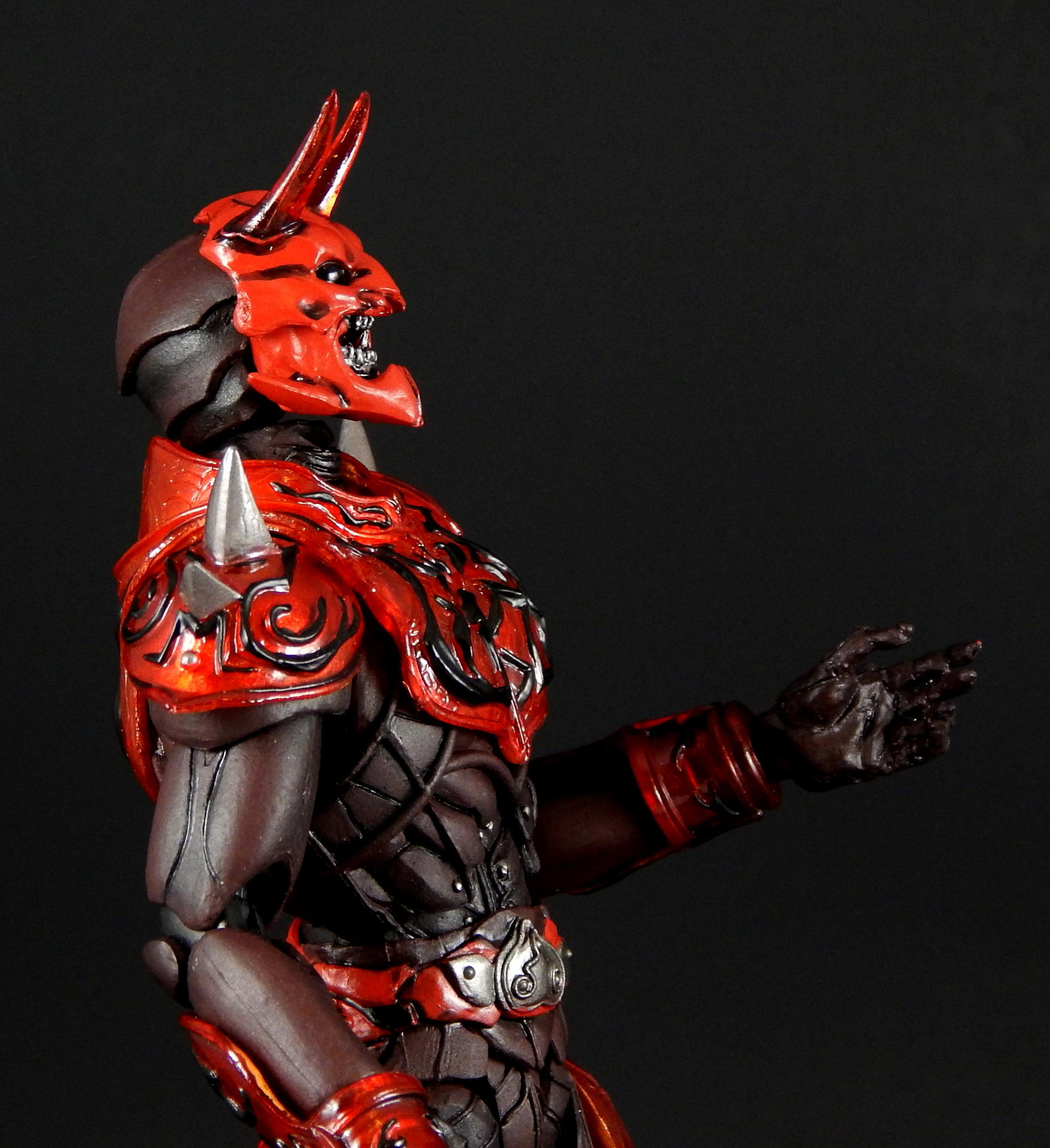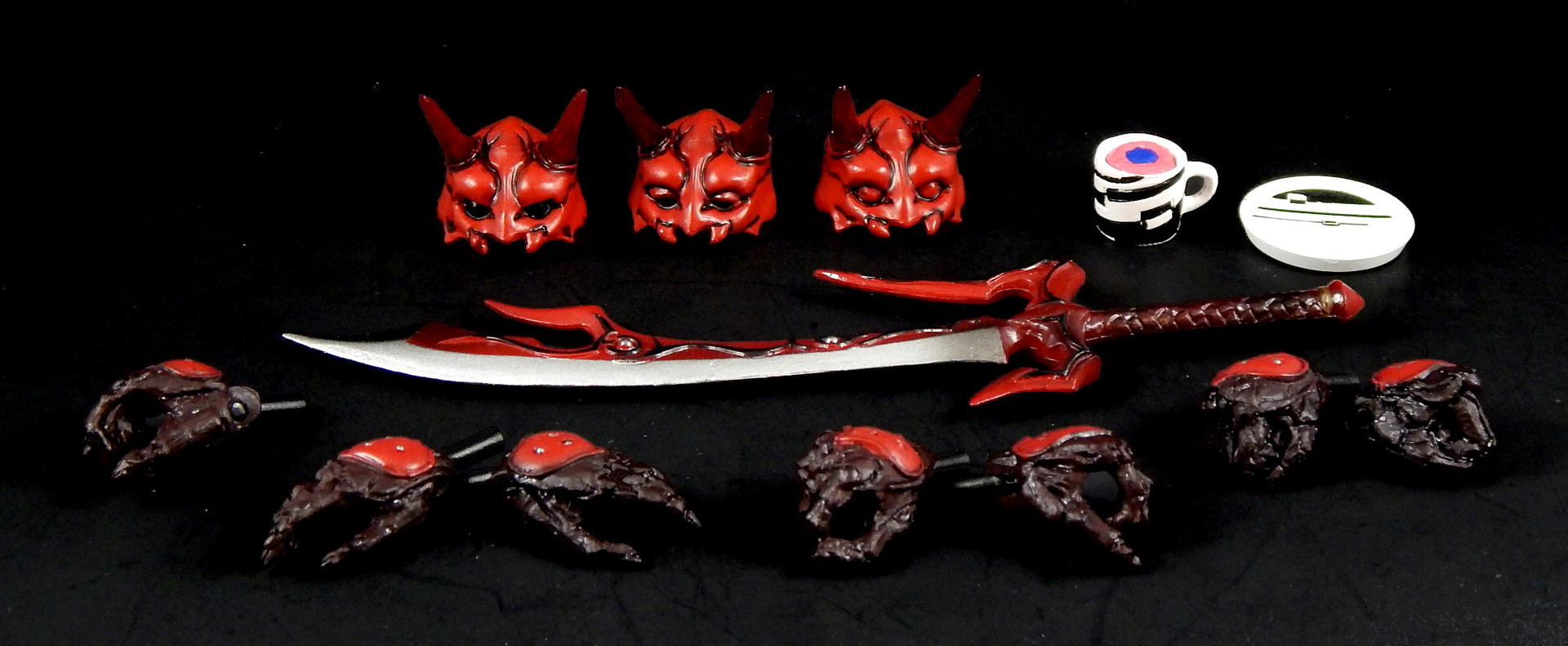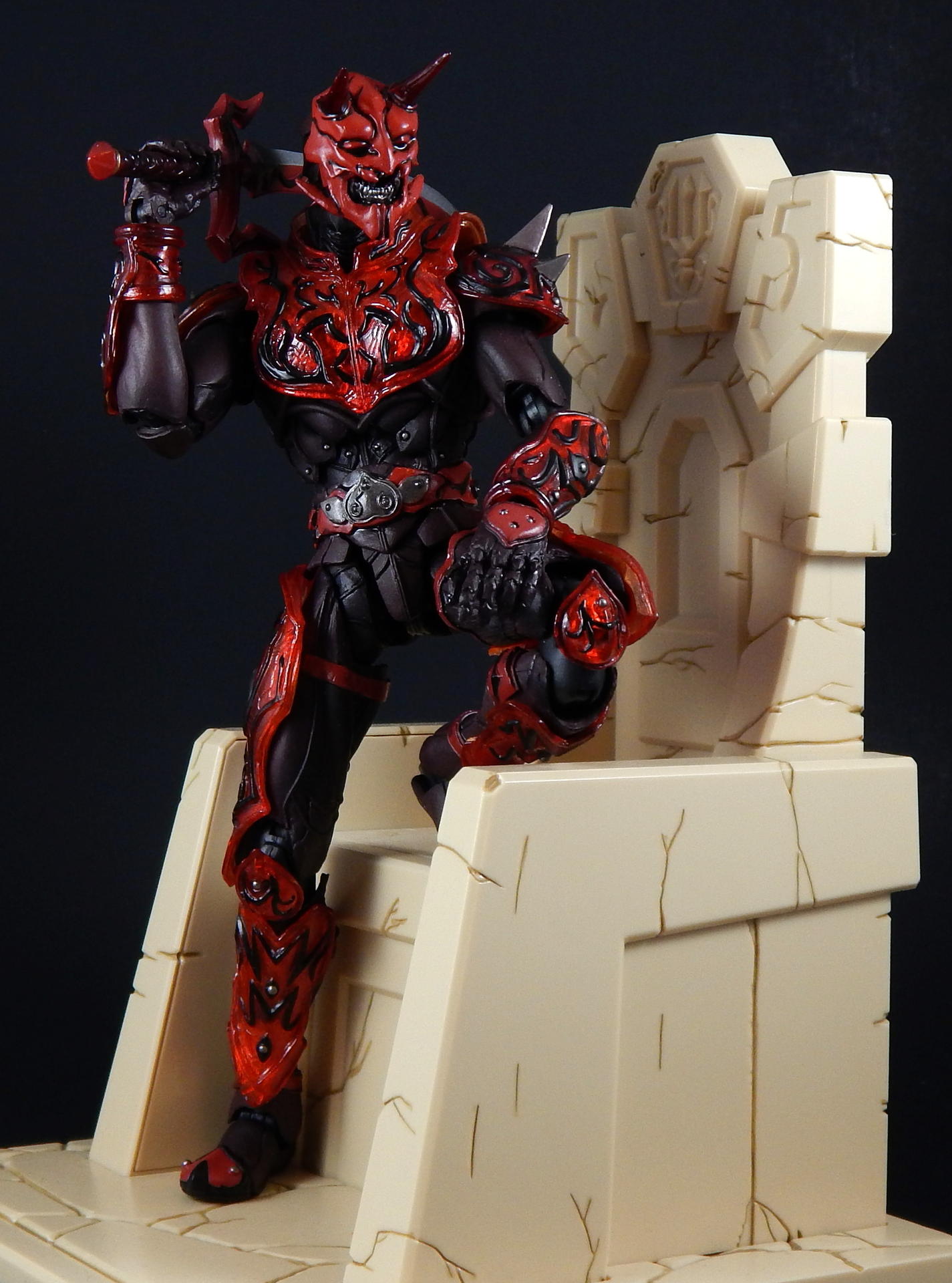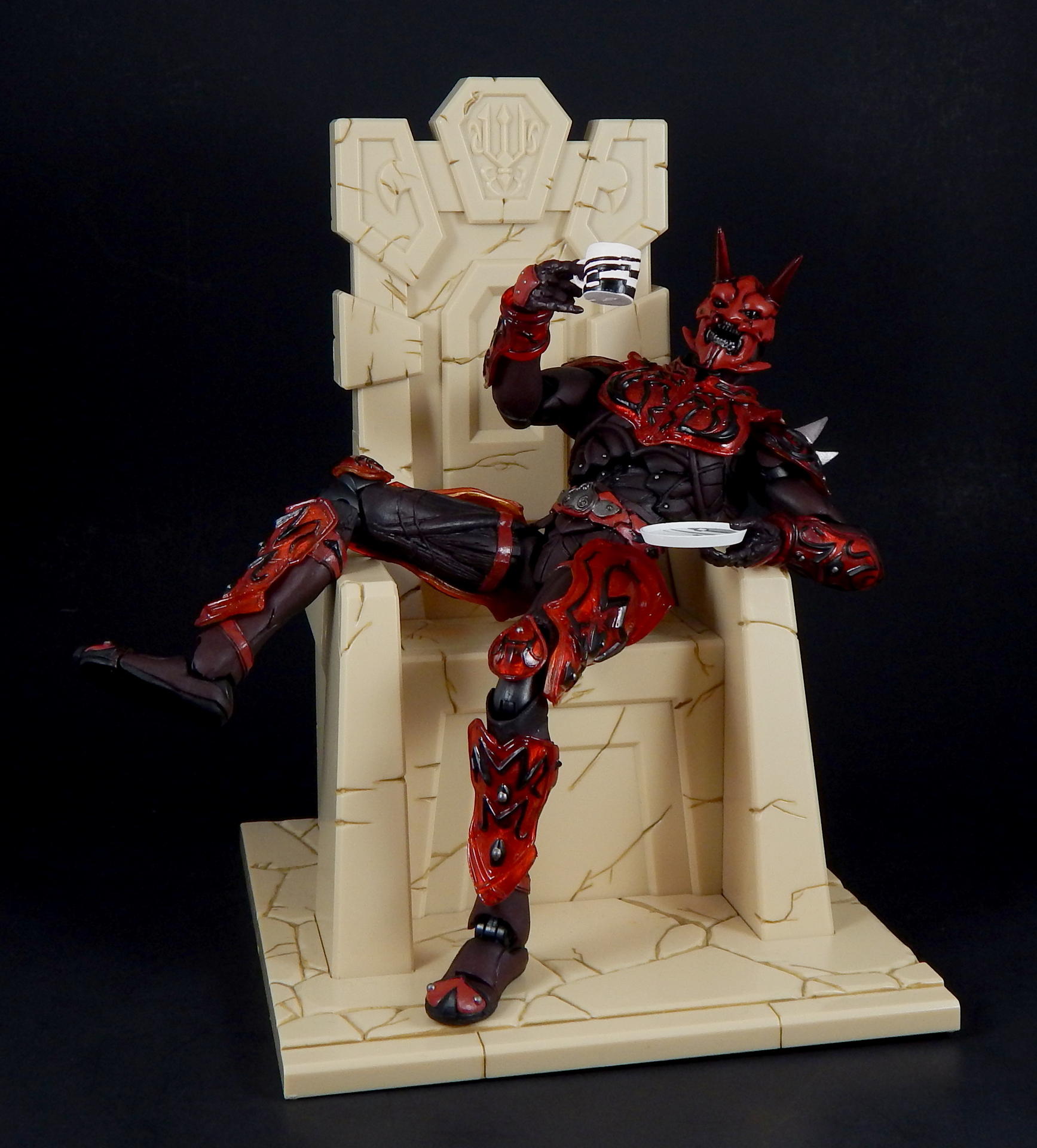 What better way to kick off a look at the Super Imaginative Chogokin Kamen Rider Den-O figures, than to start with the most well know form and character? SIC Kamen Rider Den-O Sword Form and Momotaros! I love this show, I love these characters, and I love these SIC 2 packs. I really hope I can share my love of the show and characters through these galleries of, frankly, excellent figures. Main Figure The SIC line is a bit different from my main collecting line, SH Figuarts, in many ways. They're larger figures, in the 7" tall range, and they're not meant to be show-accurate representations, but re-imaginings of those characters, as it says in the name Imaginative! The designs for the SIC Den-O are definitely different, distinct from their show-counterparts, but they're also not nearly as out-there as other SIC offerings. I love all the extra details on these figures. Starting with Momotaros, rather than looking like he's got a one piece rubber suit on under his armor, it looks like it's made out of a bunch of leather straps, with steel studs holding it together in the torso area. The armor is translucent red, with lots of fine lines etched into it, aside from the black detailing. His horns are translucent red too! Den-O is similarly detailed, with lines etched into the chest and back pieces, and his armor made to appear to be assembled of many distinct armor plates. The shin-guards are even metal, for that extra armor-feel to it (it also assists with balancing the figure). Articulation-wise, Den-O and Momotaros are similar to SH Figuarts, meaning they pretty much have all the articulation points you could want (though strictly speaking, they may have slightly fewer articulation points, and may not be quite as pose-able as Figuarts), and they all have pretty great range. They won't be doing any high kicks, but they can comfortably sit in chairs, and get in most interesting poses. The torso joints are the most limited, they can't bend forward or backward too much, Momotaros seems particularly limited, though I get the feeling the joint is stuck on mine, rather than actually being hindered by design. There are only a couple of problems I can really think of with these figures. The first is rather superficial. The forearm armor on both figures can rotate freely, and sometimes rotated into positions I didn't want. This is more noticeable on Momotaros, because Den-Os are basically bracelets (though the left arm's does extend up his arm a little bit, so if it rotates around on the inside it's in the wrong place), whereas Momo's extend the length of the forearm, so if it swivels around to the inside it will either hinder the elbow joint or look stupid. Also, they will jump off the arm anytime a hand is removed, particularly Den-O's, which are made of metal. The big problem with these figures, Den-O especially, is that several of the joints are kinda loose. It's not usually too much trouble, but when trying to stand Den-O on one leg, with the other leg propped up and him leaning on it, every one of the leg joints would give out and fold up if he wasn't exactly balanced JUST RIGHT. They do hold him up, but it can take several tries to find the sweet spot. Someday I'll get some floor polish and try to tighten them up (just like I've been saying I would for 3+ years). Den-O also has a particularly loose inner shoulder joint on one side, so I couldn't get him to hold the sword up in certain positions, without his arm dropping down. The elbow, wrist and outer shoulder joints were perfectly snug, it was just one joint that kept dropping the entire arm out of place. Momotaros' joints are also somewhat looser than I would like, but they weren't nearly as troublesome to deal with as Den-O's are. As you can see, in one picture I got Momotaros to carry Den-O, completely freestanding, and it didn't take nearly as much effort as I feared it would. Between the leg joints and that one shoulder joint, the reverse was simply not possible. Accessories: Momotaros The Momotarosword - a big fancy sword with a two hand grip, a big-ass blade and some flame-esque bits on the back and crosspiece. It's very detailed (check the grip, looks like braided leather), nicely painted and he holds it quite well. Coffee cup and plate - the signature cup of coffee that Naomi made for Momotaros, with matching plate! It looks really good, and I like the deco on the plate, something the Figuarts version lacks. It looks good displayed on a table, or being held in the included hand. 3 face plates. Not full faces, just the upper half with different eyes: wide open, fully closed, and lazy half-closed eyes. I've had this set for a number of years now, and I've always thought the different eyes were rather pointless. That is, until this photo-shoot, when I finally took the time to try to find a use for the half-closed and fully closed eyes. I won't ever display Momotaros asleep in a throne, or enjoying a good cup of coffee, but I think they made for good pictures. 3.5 pairs of hands. A pair for punching, a pair for holding the sword, a calm pair, and a hand specifically to hold the coffee cup. The hands are pegs that just slide into the forearms, with a single hinge joint where the peg meets the hand. These peg in reasonably snugly, such that they don't fall out during regular use. I prefer Figuarts style wrist/hand joints, which allow for greater posing, however, these are reasonably successful, and I didn't ever have a hard time positioning them the way I wanted them. Accessories: Den-O DenGasher and belt holder pieces. Let's start off with the coolest accessories, the semi-functional DenGasher! This this is super detailed, all four pieces are surprising show accurate, despite their tiny size, with red, white, blue, and silver paint in all the right places, down to the numeric designating patterns on them (ie, each has a symbol painted on it, 1-4). The individual pieces can plug on to the belt holders, and can combine in the Sword Mode. Pi