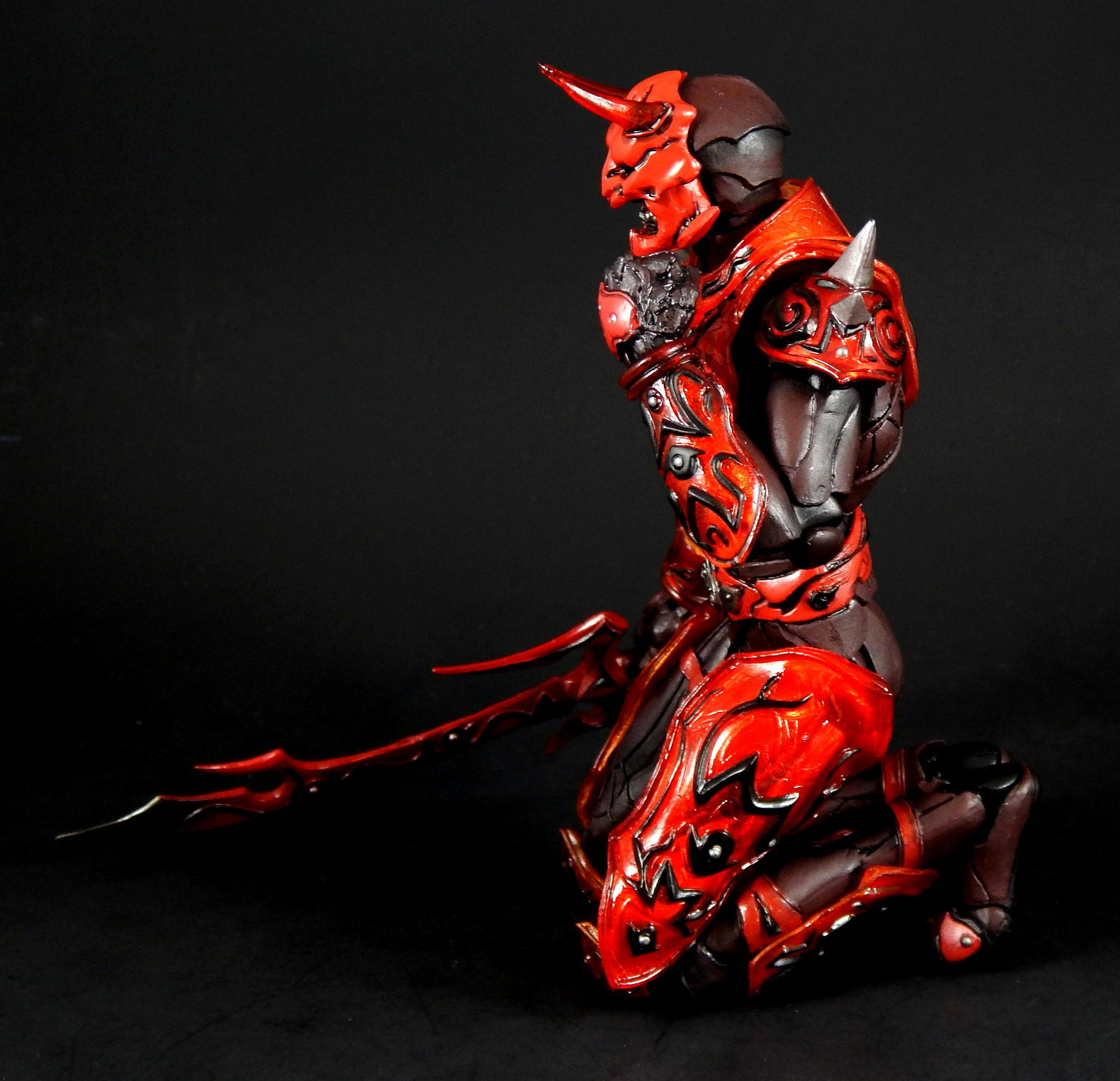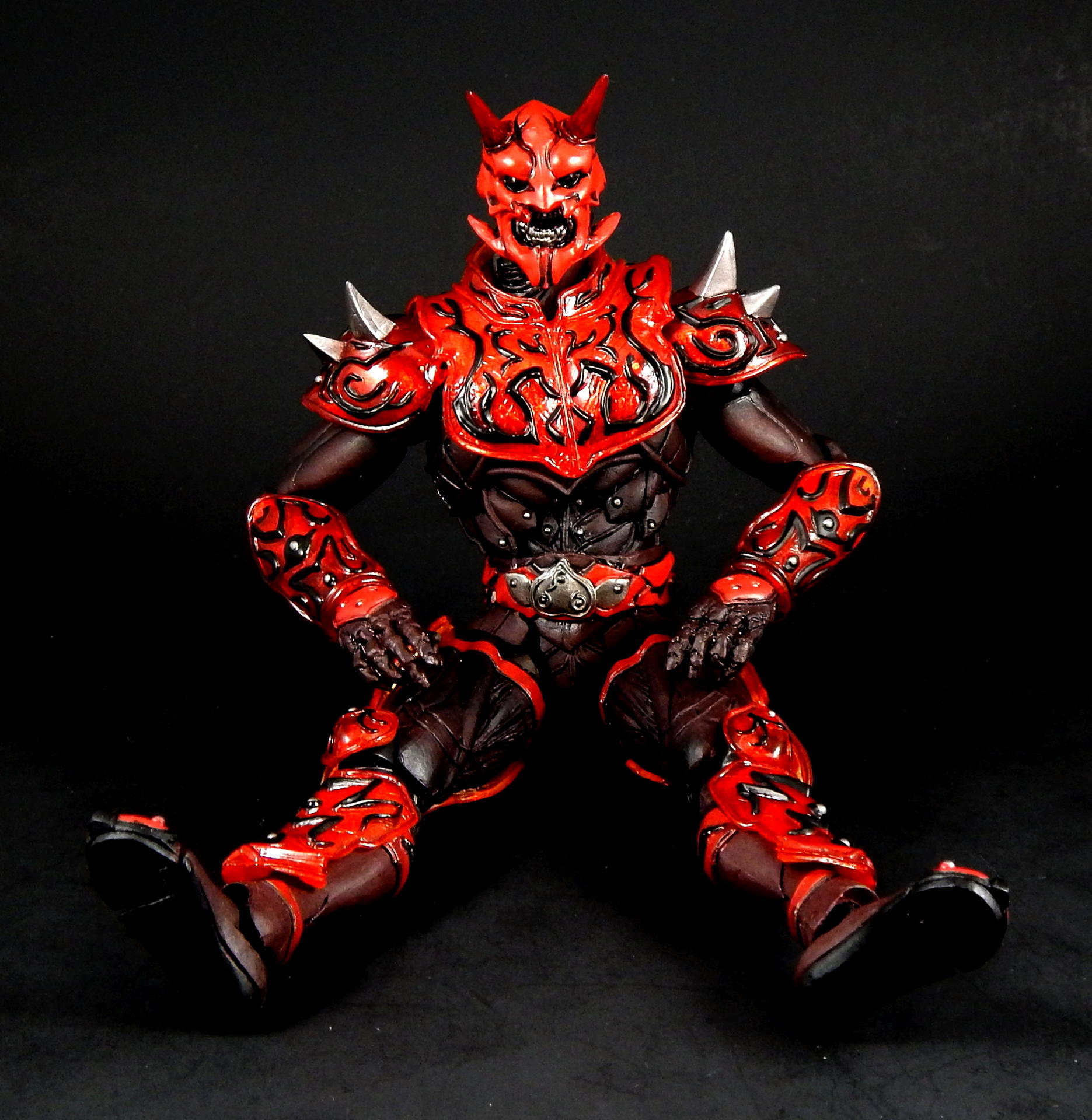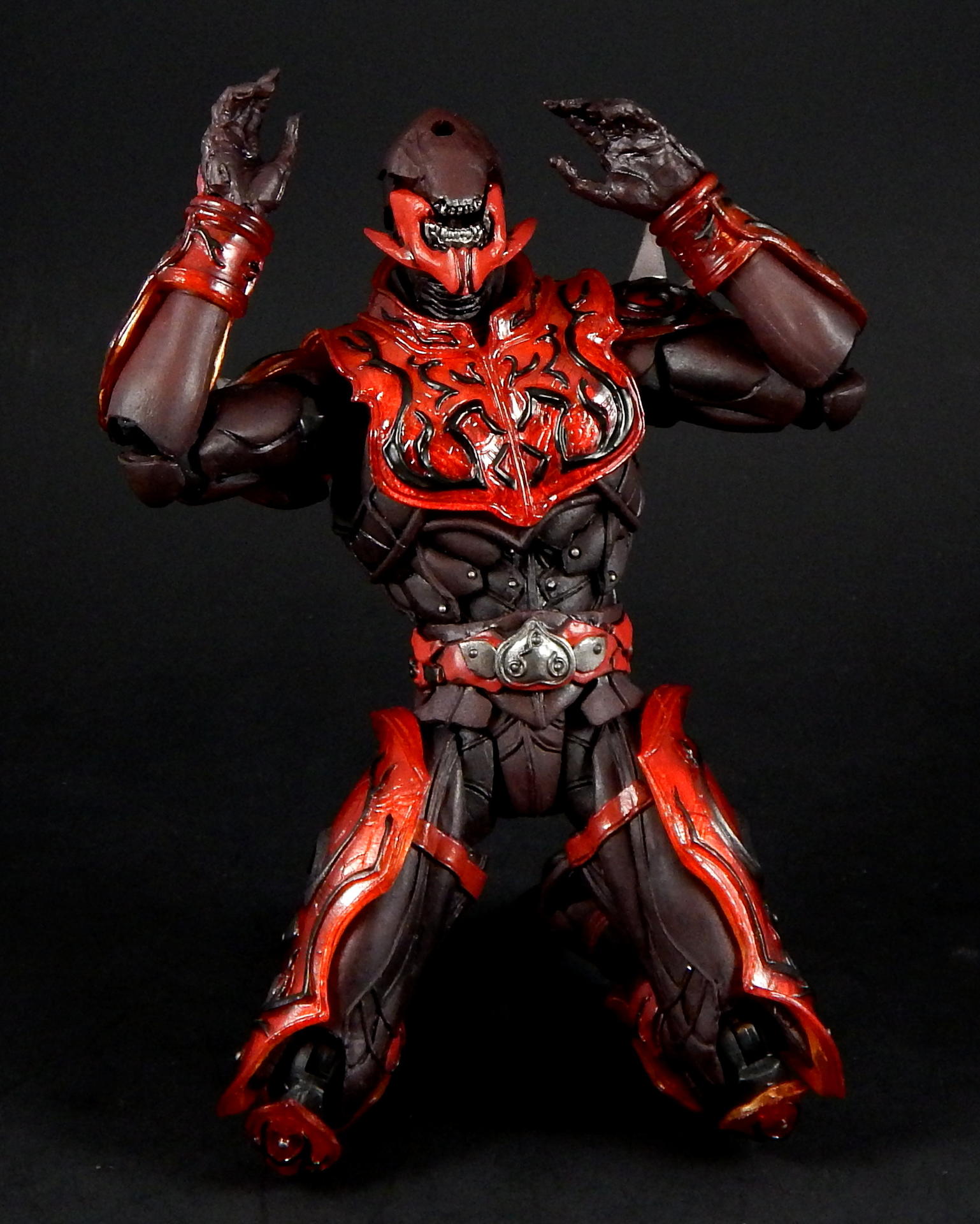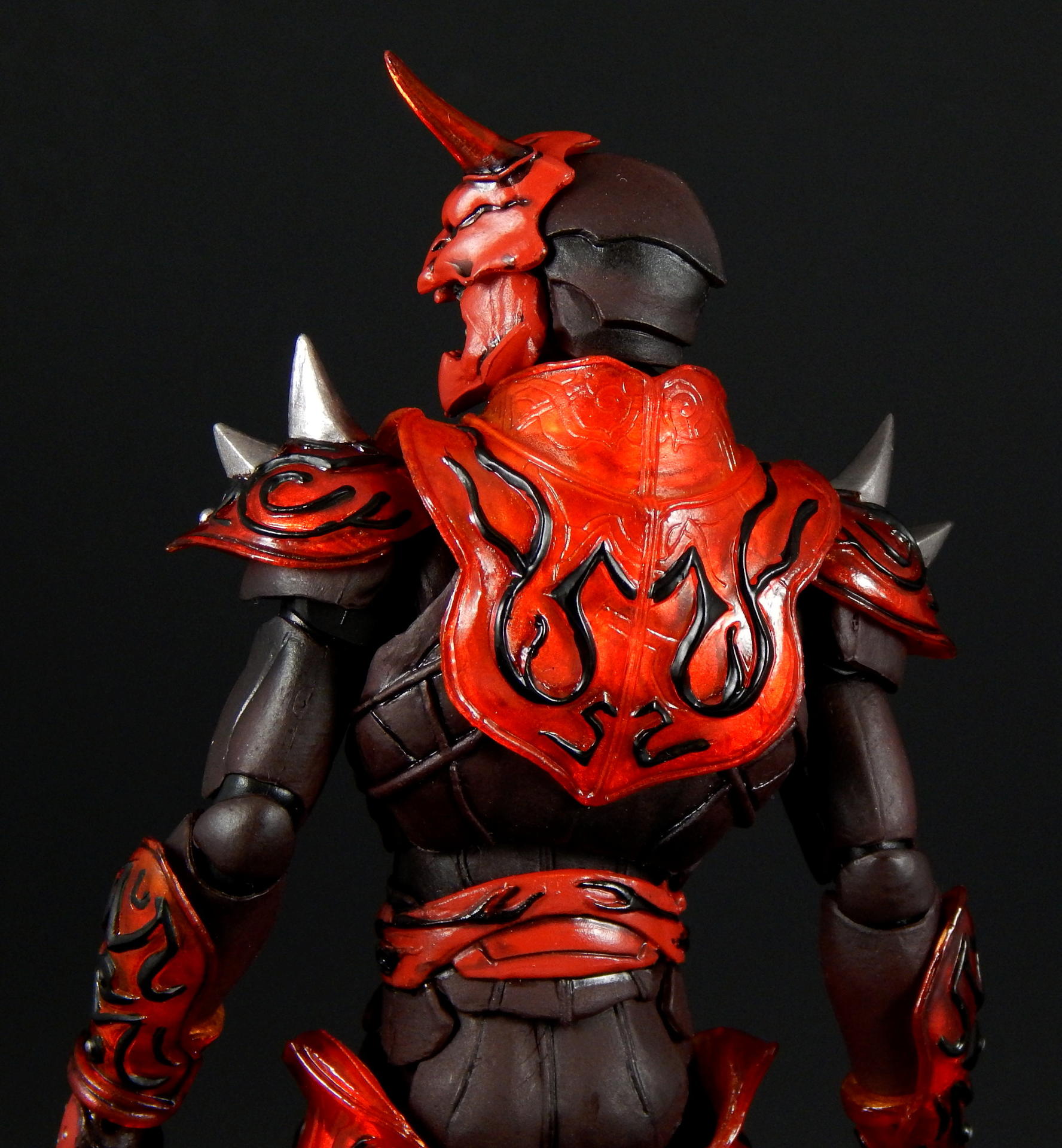 What better way to kick off a look at the Super Imaginative Chogokin Kamen Rider Den-O figures, than to start with the most well know form and character? SIC Kamen Rider Den-O Sword Form and Momotaros! I love this show, I love these characters, and I love these SIC 2 packs. I really hope I can share my love of the show and characters through these galleries of, frankly, excellent figures. Main Figure The SIC line is a bit different from my main collecting line, SH Figuarts, in many ways. They're larger figures, in the 7" tall range, and they're not meant to be show-accurate representations, but re-imaginings of those characters, as it says in the name Imaginative! The designs for the SIC Den-O are definitely different, distinct from their show-counterparts, but they're also not nearly as out-there as other SIC offerings. I love all the extra details on these figures. Starting with Momotaros, rather than looking like he's got a one piece rubber suit on under his armor, it looks like it's made out of a bunch of leather straps, with steel studs holding it together in the torso area. The armor is translucent red, with lots of fine lines etched into it, aside from the black detailing. His horns are translucent red too! Den-O is similarly detailed, with lines etched into the chest and back pieces, and his armor made to appear to be assembled of many distinct armor plates. The shin-guards are even metal, for that extra armor-feel to it (it also assists with balancing the figure). Articulation-wise, Den-O and Momotaros are similar to SH Figuarts, meaning they pretty much have all the articulation points you could want (though strictly speaking, they may have slightly fewer articulation points, and may not be quite as pose-able as Figuarts), and they all have pretty great range. They won't be doing any high kicks, but they can comfortably sit in chairs, and get in most interesting poses. The torso joints are the most limited, they can't bend forward or backward too much, Momotaros seems particularly limited, though I get the feeling the joint is stuck on mine, rather than actually being hindered by design. There are only a couple of problems I can really think of with these figures. The first is rather superficial. The forearm armor on both figures can rotate freely, and sometimes rotated into positions I didn't want. This is more noticeable on Momotaros, because Den-Os are basically bracelets (though the left arm's does extend up his arm a little bit, so if it rotates around on the inside it's in the wrong place), whereas Momo's extend the length of the forearm, so if it swivels around to the inside it will either hinder the elbow joint or look stupid. Also, they will jump off the arm anytime a hand is removed, particularly Den-O's, which are made of metal. The big problem with these figures, Den-O especially, is that several of the joints are kinda loose. It's not usually too much trouble, but when trying to stand Den-O on one leg, with the other leg propped up and him leaning on it, every one of the leg joints would give out and fold up if he wasn't exactly balanced JUST RIGHT. They do hold him up, but it can take several tries to find the sweet spot. Someday I'll get some floor polish and try to tighten them up (just like I've been saying I would for 3+ years). Den-O also has a particularly loose inner shoulder joint on one side, so I couldn't get him to hold the sword up in certain positions, without his arm dropping down. The elbow, wrist and outer shoulder joints were perfectly snug, it was just one joint that kept dropping the entire arm out of place. Momotaros' joints are also somewhat looser than I would like, but they weren't nearly as troublesome to deal with as Den-O's are. As you can see, in one picture I got Momotaros to carry Den-O, completely freestanding, and it didn't take nearly as much effort as I feared it would. Between the leg joints and that one shoulder joint, the reverse was simply not possible. Accessories: Momotaros The Momotarosword - a big fancy sword with a two hand grip, a big-ass blade and some flame-esque bits on the back and crosspiece. It's very detailed (check the grip, looks like braided leather), nicely painted and he holds it quite well. Coffee cup and plate - the signature cup of coffee that Naomi made for Momotaros, with matching plate! It looks really good, and I like the deco on the plate, something the Figuarts version lacks. It looks good displayed on a table, or being held in the included hand. 3 face plates. Not full faces, just the upper half with different eyes: wide open, fully closed, and lazy half-closed eyes. I've had this set for a number of years now, and I've always thought the different eyes were rather pointless. That is, until this photo-shoot, when I finally took the time to try to find a use for the half-closed and fully closed eyes. I won't ever display Momotaros asleep in a throne, or enjoying a good cup of coffee, but I think they made for good pictures. 3.5 pairs of hands. A pair for punching, a pair for holding the sword, a calm pair, and a hand specifically to hold the coffee cup. The hands are pegs that just slide into the forearms, with a single hinge joint where the peg meets the hand. These peg in reasonably snugly, such that they don't fall out during regular use. I prefer Figuarts style wrist/hand joints, which allow for greater posing, however, these are reasonably successful, and I didn't ever have a hard time positioning them the way I wanted them. Accessories: Den-O DenGasher and belt holder pieces. Let's start off with the coolest accessories, the semi-functional DenGasher! This this is super detailed, all four pieces are surprising show accurate, despite their tiny size, with red, white, blue, and silver paint in all the right places, down to the numeric designating patterns on them (ie, each has a symbol painted on it, 1-4). The individual pieces can plug on to the belt holders, and can combine in the Sword Mode. Pi