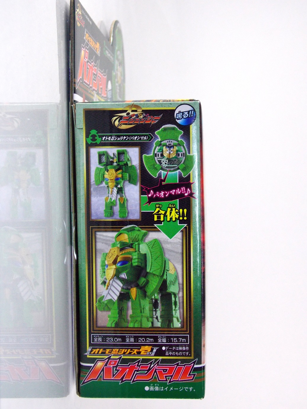 The incredible melting pot of the Shuriken Sentai Ninninger toyline continues with the addition of the first Otomonin upgrade mecha! The DX Paonmaru! Born from the first of the restored Sealing Shurikens, Paonmaru joins the Ninningers in their fight against the Youkai! But we're here to talk the toy of this interesting mecha, so read on below! Packaging DX Paonmaru comes in a pretty standard small cardboard box, and by the looks of it so will the rest of the Otomonin. It's pretty basic stuff for sentai lines honestly. Once one additional mecha comes out they almost all follow the same formula for packaging with each successive release. Some basic stock photography of the figure as well as shots of it's combined forms to round it all out. Main Figure A bit of an odd one, DX Paonmaru has an interesting transformation method to say the least. The standard form of this figure is indeed it's elephant form. To create it you need to take the the two axe weapons and plug them on to the back of tiny half robot. It's legs in turn fold out and forward. The Shuriken itself with the disc attached then plugs onto what will be the chest of the robot mode later. Then simply plug the elephant face and trunk on. Thus completing the look! It's actually a pretty intricate little figure in this mode, despite a general lack of much in the way of paint apps. Though nicely enough the head, front knees, & trunk are all painted very well. In the same way that Shinobimaru has a greatly detailed chest, so does Paonmaru. It's about on par sizewise with one of the only other elephants we got in sentai, Hyakuju Sentai Gaoranger's Gao Elephant. I don't actually own a Geki Elephant to compare it with. Though you can't get much pose wise from this form it's pretty fun. The basic robot mode for Paonmaru can be achieved by reassembling the given components. Separate everything back down to it's base and start from scratch with the small humanoid robot. Straighten the legs out properly and then fold the head up out of the back of it's chest. Take the face/trunk portion of the elephant and plug it onto the Paonmaru robot's chest which gives you the basic robot. The Elephant head actually completes the arms of the robot weirdly enough. The base robot only has elbow length arms but some tiny fists are sculpted into the head section to complete them. Then take the Axe/hind legs and attach them to the shoulders to add two giant missile launchers. The actual Shuriken and disc aren't used for this mode at all. But that gives you Paonmaru in robot mode, comparable size wise to Shinobimaru though quite a bit bulkier. He fits right in. Accessories It's hard to classify accessories with something like this as it's harder to distinguish between those items which are included with the figure optionally, or those things that are integral to it's basic structure. Nin Shuriken Base & Disc. This electronic item is what forms the head and face of Shurikenjin Paon. It's normally stored on Paonmaru's animal form plugged onto the neck as a mane-like appendage. I find it slightly odd that so far bot Paonmaru can store these items in at least one form, but Shinobimaru has no such storage options for the Shurikenjin Nin Shuriken when not in use. A pair of triggers on this piece detect when it's combined to form Shurikenjin Paon and plays out the appropriate phrase & music when done. When not connected pressing the physical button on top will cycle through three sound bytes "Paonger" "Paonmaru" & "Otomonin Shuriken". Shurikenjin Paon To get Shurikenjin ready for this combination you need to remove and rearrange a few things. Start by removing the standard Shurikenjin Shuriken and leaving that to the side, it won't be used. Remove Shinobimaru from the throne all together, and then remove the right arm made from Dumpmaru. People often question why a third shoulder peg exists on the back of the figure and it's for this, to store the arm you just removed! So plug the Dumpmaru arm there and transform Shinobimaru into the new right arm and plug him on. Now take the basic Paonmaru robot minus the shoulder cannons and fold his legs up to seat him in the throne. It should be noted that seating his hand over the control mechanisms on the throne is a little bit difficult. But once you do it looks pretty great. Then simply plug the Paon Shuriken onto the the neck of Shurikenjin. As a side not the new faceplate is pretty awesome looking compared to the standard Shurikenjin face, mine though appears to be molded on a little bit crookedly. Now take the Paon Axes and flip out some small handles on the bottom of each. Plug them into the combined robot's hands and there you have it, Shurikenjin Paon is formed! Sadly the axes are rather small and inaccurate but that's to be expected. These things tend to make some small compromises in toy form. Whether it's intentional or not you can plug the axes onto Shurikenjin's back for storage. This form manages to incorporate most everything from the standard Shurikenjin mode aside from the Shuriken, Drago Sword & Shield. But you'll see that you can still store or use the Drago Shield & Sword if you so choose. Either way Shurikenjin Paon is a pretty welcome sight. The green & gold Paonmaru brings to the table really helps break up the otherwise uniform color scheme of Shurikenjin and mixes it up a bit. It's a pretty great look actually. And because of the dynamic hips Shurikenjin has you can get some decent poses out this form. Final Thoughts As this line continues I continue to be very pleased. The Otomonin series of additional mecha is shaping up to be a pretty damn fun one. While it's likely these many upgrades won't be incorporated into any sort of final combination robo, they each seem to have a unique charm that I love. DX Paonmaru is a great addition to this line that once again gives it a pretty great variety of design. After 2 years of being pretty unimpressed by the mecha lines of sentai (Kyoryuger, ToQger) I'm happy