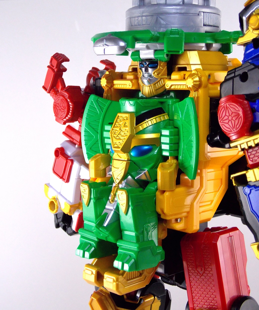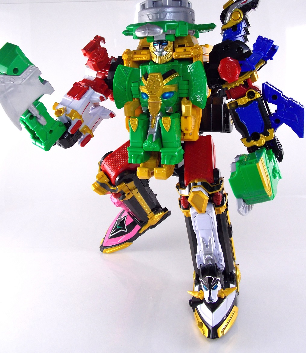 The incredible melting pot of the Shuriken Sentai Ninninger toyline continues with the addition of the first Otomonin upgrade mecha! The DX Paonmaru! Born from the first of the restored Sealing Shurikens, Paonmaru joins the Ninningers in their fight against the Youkai! But we're here to talk the toy of this interesting mecha, so read on below! Packaging DX Paonmaru comes in a pretty standard small cardboard box, and by the looks of it so will the rest of the Otomonin. It's pretty basic stuff for sentai lines honestly. Once one additional mecha comes out they almost all follow the same formula for packaging with each successive release. Some basic stock photography of the figure as well as shots of it's combined forms to round it all out. Main Figure A bit of an odd one, DX Paonmaru has an interesting transformation method to say the least. The standard form of this figure is indeed it's elephant form. To create it you need to take the the two axe weapons and plug them on to the back of tiny half robot. It's legs in turn fold out and forward. The Shuriken itself with the disc attached then plugs onto what will be the chest of the robot mode later. Then simply plug the elephant face and trunk on. Thus completing the look! It's actually a pretty intricate little figure in this mode, despite a general lack of much in the way of paint apps. Though nicely enough the head, front knees, & trunk are all painted very well. In the same way that Shinobimaru has a greatly detailed chest, so does Paonmaru. It's about on par sizewise with one of the only other elephants we got in sentai, Hyakuju Sentai Gaoranger's Gao Elephant. I don't actually own a Geki Elephant to compare it with. Though you can't get much pose wise from this form it's pretty fun. The basic robot mode for Paonmaru can be achieved by reassembling the given components. Separate everything back down to it's base and start from scratch with the small humanoid robot. Straighten the legs out properly and then fold the head up out of the back of it's chest. Take the face/trunk portion of the elephant and plug it onto the Paonmaru robot's chest which gives you the basic robot. The Elephant head actually completes the arms of the robot weirdly enough. The base robot only has elbow length arms but some tiny fists are sculpted into the head section to complete them. Then take the Axe/hind legs and attach them to the shoulders to add two giant missile launchers. The actual Shuriken and disc aren't used for this mode at all. But that gives you Paonmaru in robot mode, comparable size wise to Shinobimaru though quite a bit bulkier. He fits right in. Accessories It's hard to classify accessories with something like this as it's harder to distinguish between those items which are included with the figure optionally, or those things that are integral to it's basic structure. Nin Shuriken Base & Disc. This electronic item is what forms the head and face of Shurikenjin Paon. It's normally stored on Paonmaru's animal form plugged onto the neck as a mane-like appendage. I find it slightly odd that so far bot Paonmaru can store these items in at least one form, but Shinobimaru has no such storage options for the Shurikenjin Nin Shuriken when not in use. A pair of triggers on this piece detect when it's combined to form Shurikenjin Paon and plays out the appropriate phrase & music when done. When not connected pressing the physical button on top will cycle through three sound bytes "Paonger" "Paonmaru" & "Otomonin Shuriken". Shurikenjin Paon To get Shurikenjin ready for this combination you need to remove and rearrange a few things. Start by removing the standard Shurikenjin Shuriken and leaving that to the side, it won't be used. Remove Shinobimaru from the throne all together, and then remove the right arm made from Dumpmaru. People often question why a third shoulder peg exists on the back of the figure and it's for this, to store the arm you just removed! So plug the Dumpmaru arm there and transform Shinobimaru into the new right arm and plug him on. Now take the basic Paonmaru robot minus the shoulder cannons and fold his legs up to seat him in the throne. It should be noted that seating his hand over the control mechanisms on the throne is a little bit difficult. But once you do it looks pretty great. Then simply plug the Paon Shuriken onto the the neck of Shurikenjin. As a side not the new faceplate is pretty awesome looking compared to the standard Shurikenjin face, mine though appears to be molded on a little bit crookedly. Now take the Paon Axes and flip out some small handles on the bottom of each. Plug them into the combined robot's hands and there you have it, Shurikenjin Paon is formed! Sadly the axes are rather small and inaccurate but that's to be expected. These things tend to make some small compromises in toy form. Whether it's intentional or not you can plug the axes onto Shurikenjin's back for storage. This form manages to incorporate most everything from the standard Shurikenjin mode aside from the Shuriken, Drago Sword & Shield. But you'll see that you can still store or use the Drago Shield & Sword if you so choose. Either way Shurikenjin Paon is a pretty welcome sight. The green & gold Paonmaru brings to the table really helps break up the otherwise uniform color scheme of Shurikenjin and mixes it up a bit. It's a pretty great look actually. And because of the dynamic hips Shurikenjin has you can get some decent poses out this form. Final Thoughts As this line continues I continue to be very pleased. The Otomonin series of additional mecha is shaping up to be a pretty damn fun one. While it's likely these many upgrades won't be incorporated into any sort of final combination robo, they each seem to have a unique charm that I love. DX Paonmaru is a great addition to this line that once again gives it a pretty great variety of design. After 2 years of being pretty unimpressed by the mecha lines of sentai (Kyoryuger, ToQger) I'm happy