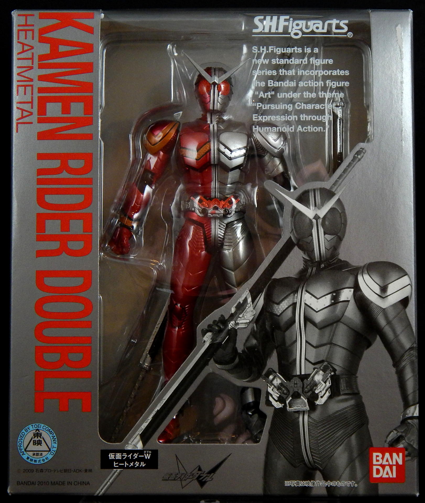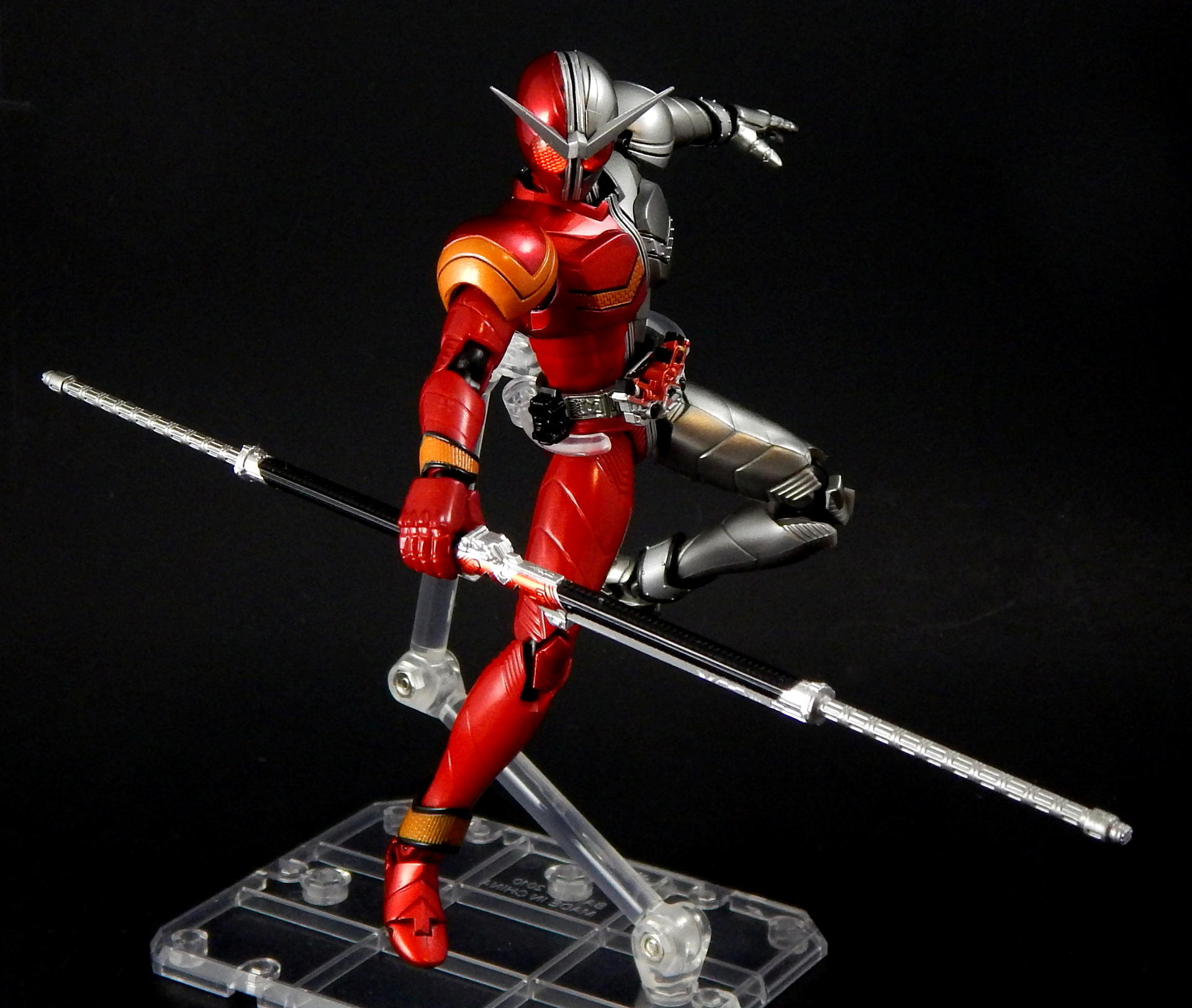 The next figure in my Kamen Rider W Figuarts series is my favorite of the three primary forms: Heat Metal, which gives W flame powers and a long metal stick to beat Dopants with.