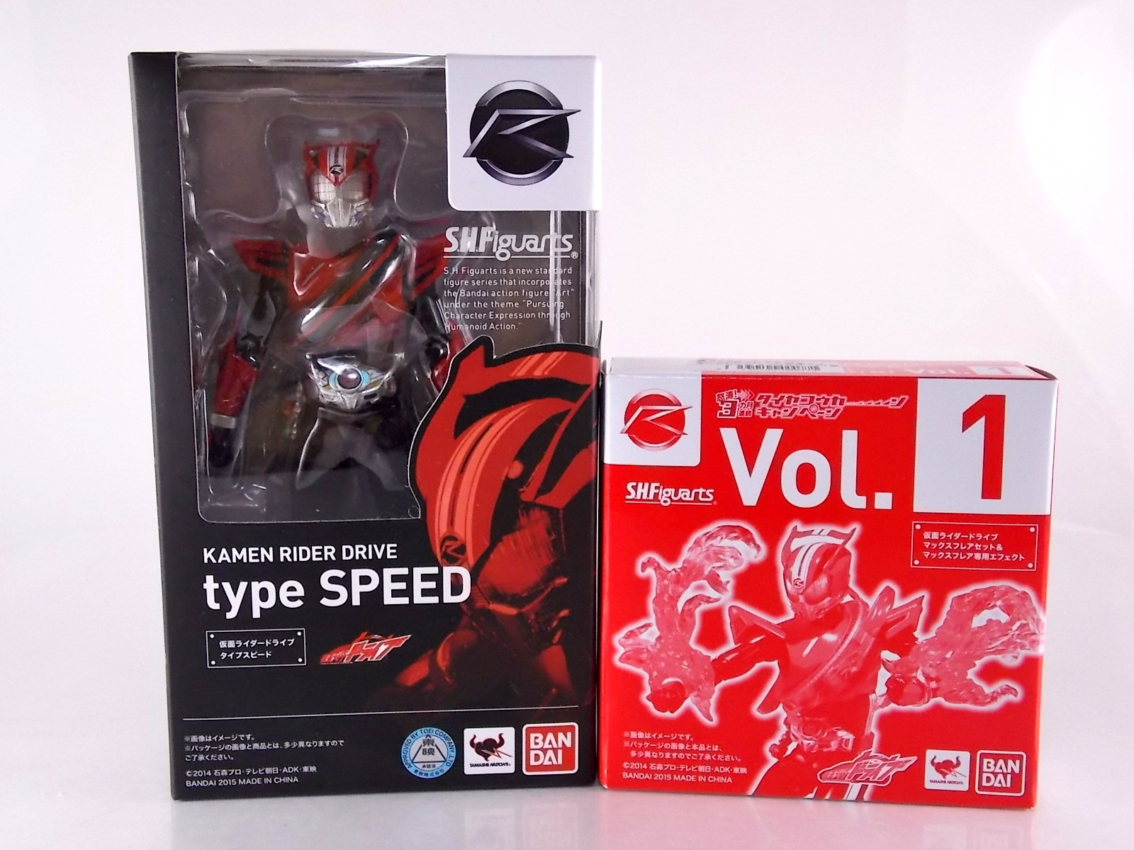 Tokunation is proud to finally present an in depth look at the newest Heisei Rider to join the S.H. Figuarts line, Kamen Rider Drive Type Speed and the included 1st Run Max Flare Bonus! Packaging Kamen Rider Drive comes packaged in what appears to be the new standard for most S.H. Figuarts. A new slim style box. We've seen a recent trend of Figuarts boxes getting a bit smaller over time, Vul Eagle was slimmer but taller than the average, Hakaider & Kikaider were the first of the true slim styles, and now Drive and even Imperial Stormtroopers are being packaged this way. In Drive's case it could have to do with his low accessory count, but either way I'm totally okay with the slimmer box design. As has become the case in recent years, rider boxes have gotten fairly elaborate and very nicely themed to each character, this one feels very much the same in that regard. The Max Flare Bonus (as most bonuses do) comes packed in it's own small square 2-tone box. Traditionally most add on 1st run extras like this come in similarly themed packaging. Even as far back as the Gokaiger Darins. Included in the main Drive box however, other than the instructions, is a premium glossy mini-booklet focusing on the upcoming S.H. Figuarts Tridoron! A nice little bonus to get people salivating for that expensive beast. Main Figure Wow. Let me just say that up front. WOW. Last year I was convinced that Kamen Rider Gaim Orange Arms was hands down one of the best Figuarts I'd ever owned. Let me just say that for all that amazement I am even more blown away by Kamen Rider Drive Type Speed. This figure, in nearly every way possible, captures the true essence of the on screen Drive suit, and even manages to replicate it's real life counterparts gimmick in practical prop fashion. Let's start by looking at the amazing level of detailing this beauty has. You expect an S.H. Figuart to exude a certain level of quality because of it's nature as a collector's piece. Then you handle Drive. Everything from the gorgeously detailed head to the wonderfully painted belt looks great. Looking head on you get Drive in all his glory. Perhaps the best area on the figure though is the Driver Driver & belt. The Driver itself is immaculate, just perfectly detailed at this scale. It's also removable! The face of the driver itself can be removed exposing the cylindrical part that displays Mr. Belt's facial expressions/Tire Koukans. From the ground up this figure is designed for cross compatibility with future Shift Car/Tire sets. Meanwhile the Shift Car holster looks fantastic. You think to yourself, wow these cars look so good, almost like they're removable. And they are! You can literally remove the Funky Spike, Midnight Shadow, & Max Flare Shift Cars from the holsters and replace them with other cars from future releases. In much the same way that Gaim Orange Arms could hold additional Lock Seeds on his holster. The Shift Brace is likewise magnificent, the flipped Type Speed Shift Car pre-packaged into it is also removable! Allowing for you to use future flipped Shift Cars in the brace to recreate various Tire Koukans! Seriously anything you need to to do accommodate a Tire Koukan can be done. As if that kind of ingenuity weren't enough the chest is just magical. The Type Speed Tire, which is made of rubber material, also happens to be modular and entirely removable! This is easily going to be the highlight of the Drive Figuarts line, the reason why it outshines other current releases. Because it's just genius that they've recreated Tire Koukan in this way. This basic Tire breaks up into 2 components, a small connector piece comes straight off Drive's back. A hint at the future, this piece was designed to be removed in that way so that a flattened back tire piece could be included with S.H. Figuarts Triodorn, thus giving Drive a smooth back to fit in the vehicle better. The larger front half which wraps all the way around the figure slides right off thanks to the bendable rubber material its made from, exposing the tireless flat diagonal across Drive's chest underneath. Where the Tire Koukan (TK) figures opted to make the Tire's full components without which Drive would be missing huge chunks of body mass, this figure takes the gimmick in the more practical direction of the actual show suit. In doing so it gives a truly truly accurate version of Drive that I jut did not expect. And Tire swapping is oh so simple on this guy as I'll explain below in the accessories portion of the review. And the rest of the detailing on this guy is just fantastic as well. The head is a dead ringer for the actual prop, though I'm sure some avid customizers out there will figure out how to incorporate LED's into the eyes. And the entire back half of the figure features that gorgeous undercarriage detailing we've come to know and love from the actual show suit. The TK fgure even included this detailing so I knew the S.H. Figuart would pull it off fantastically. I was not disappointed. I think special mention should be made that the articulation on Drive Type Speed is not hindered in any realistic way that I've found either. Despite having a diagonal rubber tire through his chest Drive's neck and head articulation aren't really impacated at all. Honestly the neck ball joint is so good that it just works around the tire. And the left shoulder which would otherwise have trouble with it, has a groove cut into it to allow it to slide under the tire's edge. The hips have a wonderful full range of motion, this is the style of Figuart hip I absolutely adore as well. Can't stand drop down hips at all. Frankly this figure is just the full package. It's absolutely one of my favorite Figuarts ever. Just a home run this year Bandai. Accessories It should come as no surprise to anyone that's followed Drive that he has a rather lite accessory count. Included with the primary figure are: 2 - sets of additional hands. Granted I know that doesn't seem like much. But we also 