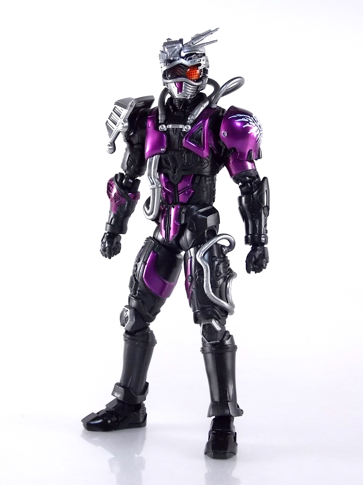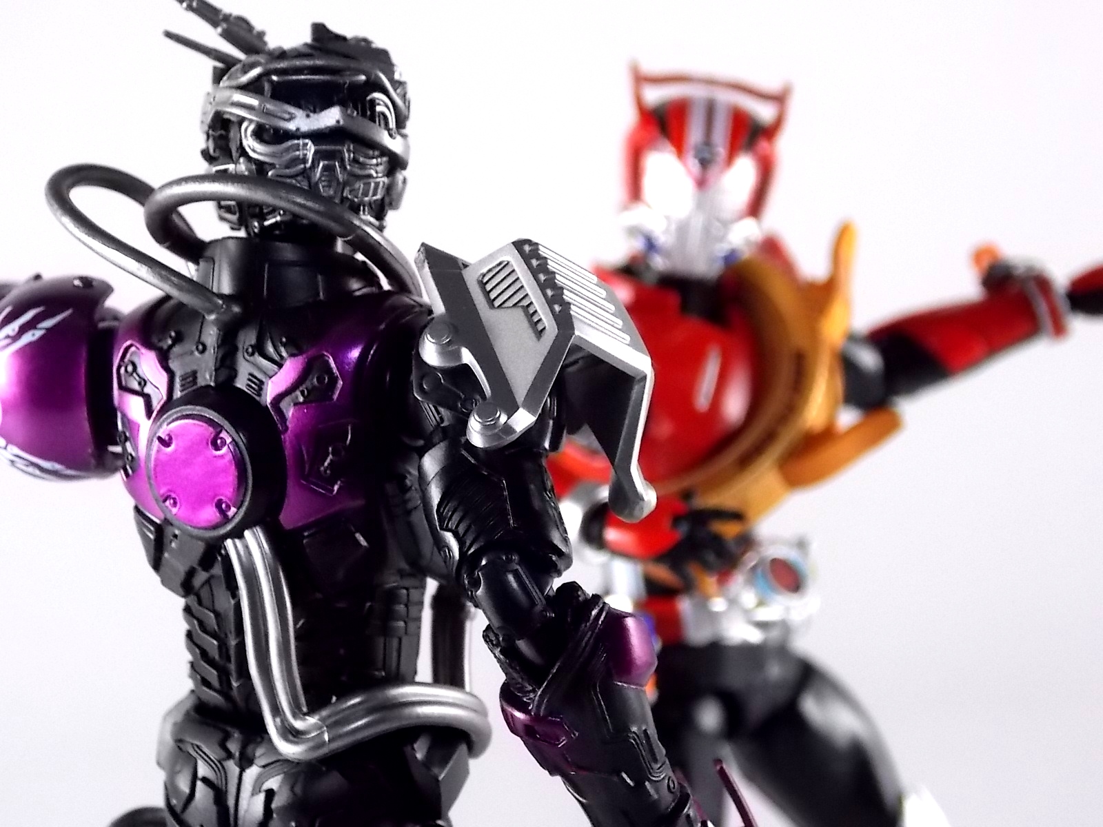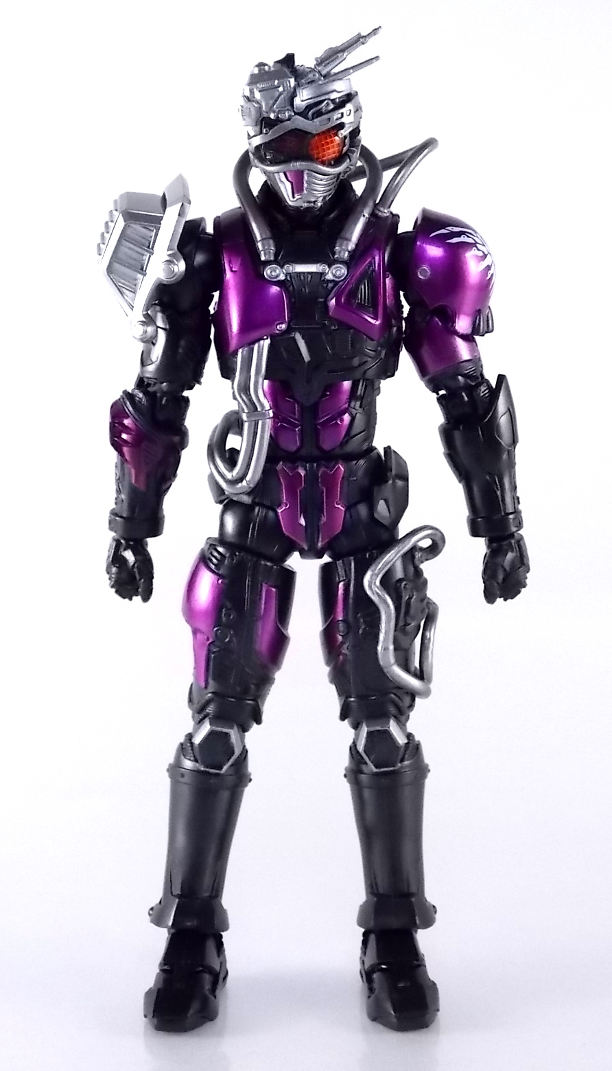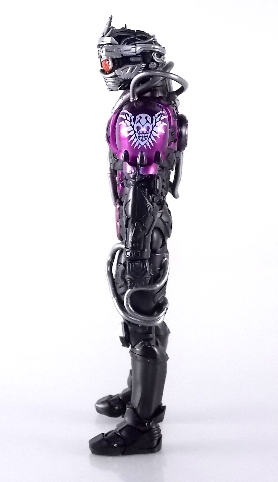 Cue the wicked guitar in the background because an incredible figure is officially in the foreground! Having debuted all the way back in Kamen Rider Drive episode 3, the one and only grim reaper of the Roidmudes is finally brought to life in collectors' toy form as S.H. Figuarts Mashin Chaser! Packaging S.H. Figuarts Mashin Chaser has followed the lead of Drive Type Speed and other recent releases and gone with a slim style box. Seemingly the new standard for mass retail and even some exclusives going forward, I have little new to say about it. As with Drive the theme of this season carries over well to the new box and it's decorated with some very awesome Mashin Chaser artwork. Aside from that and some stock photos of the figure, there's nothing new to report. Main Figure The bulk of this review consists of Mashin Chaser himself, we'll break down accessories a little further below. Chaser is a brand new mold in this fledgling line. If there's any parts sharing with Drive, it's definitely not apparent. But given Mashin Chaser's incredible asymmetry he should be his own unique beast. While Mashin Chaser looks gorgeous let's get something out of the way right now, he doesn't feature a ton of paint apps. Because he doesn't need them. The base figure is primarily black as he should be. Armored components are painted both metallic purple and silver where necessary and the grey piping on his body is molded in the appropriate color from the outset. So while Chaser may not seem to have as many paint applications as other Figuarts, the details are all present. Back to the asymmetry though, Mashin Chaser is probably one of the more elaborately molded Figuarts ever. Each thigh is unique, both forearms, both shoulders, his chest, head, everything really. While Drive was asymmetrical for different reasons he now seems very much more neat and orderly compared to Chaser. Mashin Chaser is really the embodiment of chaotic elements here compared to Drive. And thankfully the sculpt of the figure has capture this perfectly. The head is by far the most interesting part of the figure. There's just so much techincal detailing put into it that it's astounding. There's a bit of a gap issue through the middle of the head on mine, but otherwise it's fantastic. And those eyes, just some of the best compound eyes I've seen on a rider figuart in recent memory. By the way those tubes I mentioned above? They're made of an awesomely flexible plastic so you're much less likely to break them. And awesomely they don't impact the figure's range of motion at all. Because of the way the torso tubes are connected to Chaser they run the length of his torso and down to his waist but loop back up and attach to his back. So you don't have a rigid connection to the waist that would hinder movement. Sadly there are 2 things that hinder the arms. The shoulders. Though Mashin Chaser really does have a full range of motion, his shoulders are poorly designed. Though both have ball jointed pads on them the way the shoulders are designed prevents you from lifting the arms up and fully out perpendicular to the body. The shoulders can be pulled down and out but when you try to gend them back and up the sheath around the shoulder impacts the torso. Rather than being able to put his arms in a 90 degree angle you get more of about 80 degrees. So it's a bit hard to create iconic poses with the Break Gunner out to the side. The head is also unencumbered by the pipes on the shoulders, though the collar around the neck can be a pain. Otherwise the figure is incredibly solid, though I have one minor complaint about his back that I describe below in the Tire section. Accessories The pickings are a little slim, unless you ordered the 1st release of Mashin Chaser with the 1st run bonus! 1 - Brake Gunner. The trademark weapon of Mashin Chaser, the Break Gunner is scaled down to perfection here. While it's non-functional in the sense that it doesn't have moving parts, the guard on top can be removed to reveal a plug for Shift Cars! So any of Drive's standard non-flipped shift cars can be stolen or "tuned" by Chaser. Though the other half of tuning doesn't quite pan out, see Midnight Shadow Tire below. 3 - Sets of additional hands. Pretty standard fare here. Open hands for menacing stuff, one set to hold the Break Gunner in either hand, and a set of bike riding hands! These are a seriously welcome inclusion as many modern figuarts generally don't include them right off the bat. 1st Run Bonus 1 - Midnight Shadow Tire. Much like the Max Flare Tire the Midnight Shadow Tire, like all others in this line, can break apart into several component. The front and back halves can be clipped onto Kamen Rider Drive's chest or another compatible future release. This allows for a damn near seamless high end version of the Tire Koukan gimmick. The Hub section has a peg hole on the back of it that yes conveniently works with tamashii stage arms, but moreover it's meant to let the tires be used by the upcoming Tridoron! The paint on Midnight Shadow is pretty hit or miss though. It's a really thick grainy paint that they went with, not glossy at all and it feels quite cheap. And sadly it's poorly applied on several parts of my Tire. Connection points are also painted in this way so I'm sure it will flake off with repeated use. Sadly however Mashin Chaser is incomparable with the Tires as is. There is a removable plug on his back that exposes a port for his upcoming Busou Chaser set, but there's no such connector to use with any of Drive's Tires currently. Unless a part is included with that set. For now I've come up with a quick and dirty solution to at least get the general look of the Tire on Chaser's back. It involves you having an extra Tamashii Stage part but it works quite well. See the images below for a quick how to. 1 - Flipped Midnight Shadow Shift Car. Just like Max Flare, a flipped version for Drive's Shift Brace. 1 - Mr. Belt Shadow read out. Also just as the 