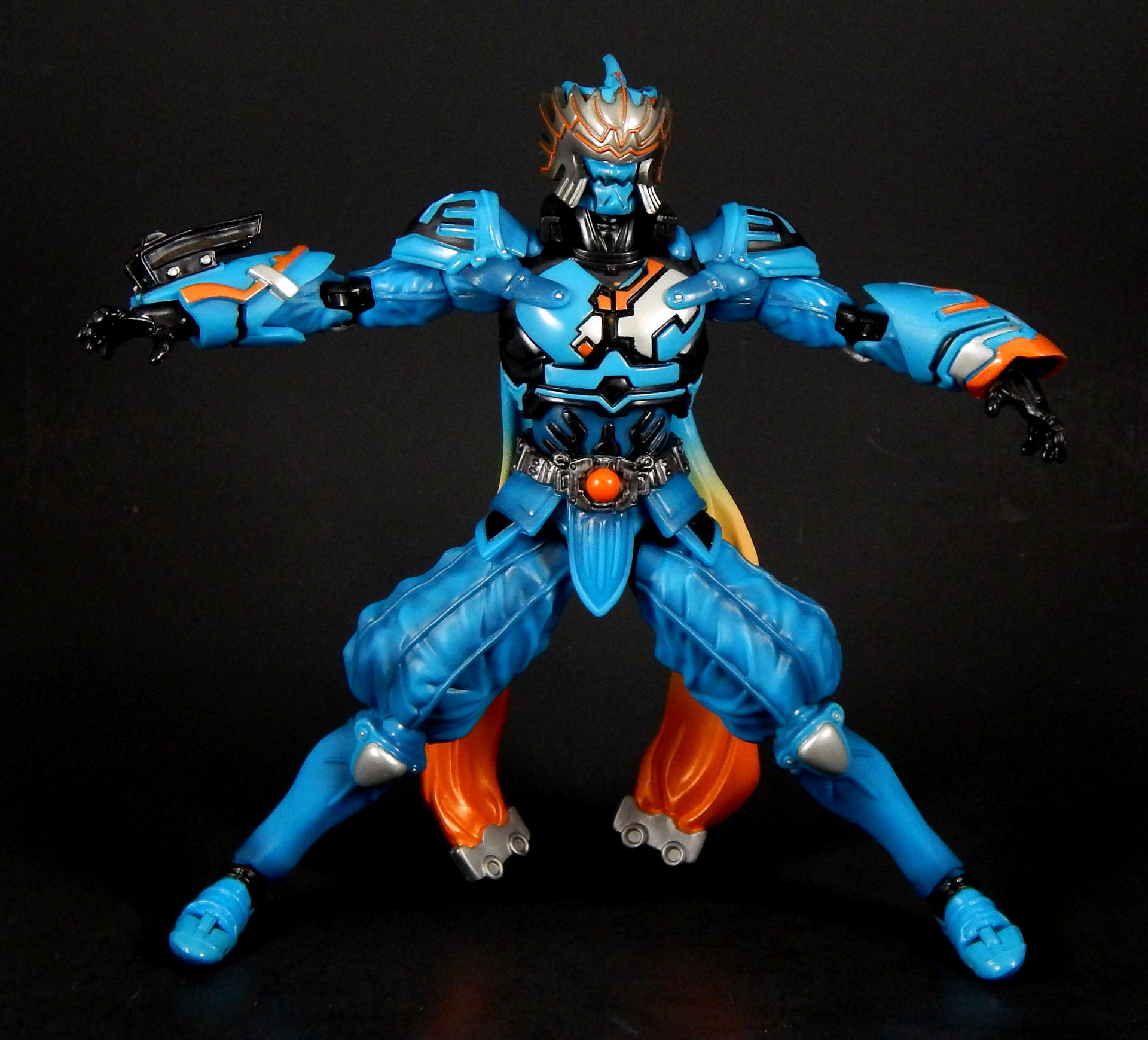 "I told you before, I also love this city." Ah, Kirihiko Suda! From the smug, superior attitude he carried at the beginning, as the top Gaia Memory dealer, to the way he became a rival of Kamen Rider W, in his form as the Nasca Dopant, and then even a bit of an ally at the end, Kirihiko was a favorite character of mine. And no lie, I still get a bit teary-eyed when I think of his transition and demise (spoilers!). SH Figuarts Nasca is a figure I looked forward to getting for quite a while, so let's see how he compares to the W Figuarts (of which I have previously reviewed Heat Metal, Luna Trigger, and of course Cyclone Joker), shall we? Packaging Nasca comes in the standard Figuarts box of the time, with a black and white picture of the character on one corner, a big window revealing the figure, and his name in orange letters against the blue box. I do like the coloring the W boxes have, but really, the boxes are boring, merely functional and little else. Main Figure Nasca has almost all the same articulation points as does W, but he doesn't share any parts, as far as I can tell. The joints are all functional and none are too hindered, though the hands can run into the gauntlets that extend past the wrist in some poses, but it's not too big a deal. The baggy pants he wears are scooped out in the back so his knees retain a deep bend, the skirt is soft and don't interfere with the legs that I've found. His ab crunch is a bit better than the W body, as his Driver doesn't interfere like W's does, though the backwards movement has a little more range. His scarf? Cape? What are those things on his back? Anyway, they're on a ball that lets them swivel out to almost parallel with the ground, and they can be lifted backwards too, though to get them to stay out like that I had to half-pop them off the ball. Oh, the ankles are not my favorite type of joint, being a ball-peg that the foot plugs into. There's not ankle hinge like W has, but unlike other Figuarts that have this type of foot joint, Nasca's actually has a pretty good range before the foot collides with the leg. As for the sculpting, Nasca is fantastic. The problem with W's form variations is that they're 9 (I guess 10, really, with Fang Joker) identical figures. There is slight variation in the chest band and arm/ankle cuffs, but they're such a small percentage of the figure, what my eye really sees is the same suit recolored several ways, and frankly, though I love the show and the character, it's a bit monotonous on the shelf. Enter Nasca! He looks NOTHING like W, and that's a great thing. His two gauntlets are distinct in both shape and detailing, his shoulder pads are triangles instead of the sphere's of W, the helmet is completely unlike W's, and his skirt and baggy paints completely change the shape of the figure, so again it looks unlike W. Obviously, that's all the design from the show, not inherent in the figure, but it was executed perfectly for the figure. All the black lines shapes on the blue, and the blue shapes on the black, are all sculpted, so the distinction between the colors is sharp and clean. The belt is detailed, the pants and sleeves look like cloth, with appropriate folds and wrinkles to look realistic, and to contrast with the smooth boots and armor-look of the gauntlets and torso. There's also black shading that helps bring out the folds/seams/wrinkles of the 'cloth' parts. The cape/scarf things are unique sculpts, each folding/curving in distinct ways. All the orange lines on the silver part of the mask are again sculpted detail, which helps it look amazing. Accessories For accessories, Nasca doesn't have a lot, and two of them are really part of his costume and probably shouldn't count, but for some reason, it doesn't feel like quite as big a deal as on the three W forms (maybe because the bodies are just repaints of each other? I don't know). Our friend Nasca has 4 pairs of hands, punching fists, sword holding hands, rage hands, and gesturing hands. As I mentioned earlier, Nasca doesn't appear to share any parts with W, and that includes the hands, they are not the same sculpt as W', he has a unique look to his gloves. Additionally, the poses of the rage and gesture hands are distinct from W's hands, so that's a nice detail. His cape/scarf thingies are removable, so I pictured them as accessories, but really, they're part of his outfit, there's no reason to ever remove them. His best accessory is, of course, his sword. It's an odd design, the grip is thin at the hilt and thickens as you move to the pommel, the hilt his a large, strange black piece with lots of silver lines painted on it (all raised sculpts), there's a few lines sculpted on the blade and painted silver, and the edge of the blade is also silver. While I don't know that I actually like the design, I love the look of the black and silver paint, it's great. Do be careful when putting the sword in his hands, this is actually my second Nasca Figuarts, as I broke the grip of the sword off right at the base of the hilt when trying to get him to hold it. Don't push on the hilt, push on the grip where you're having him hold it. Anyway, I love swords and Nasca looks great posed with his. I will say, it would have been cool to get his speed or flying wings that could be swapped with the scarfs, or maybe a soft rubber scarf with bendy wire in it, since they could be prehensile in the show? But neither feels like a noticeable lack, really. Oh, what he should have come with was a to-scale Futo-kun key chain. LOL. Final Thoughts I think this figure is a necessary part of the Kamen Rider W line. He was a very influential character, heroic in his own way, the suit itself came back in a different form later, and again returned briefly in the A-to-Z movie to fight Accel. Beyond that, it's absolutely gorgeous, both in terms of coloring and sculpting, and it stands out against the sameness of many color swaps of the W suits. And as a bonus, it's not expensive on 