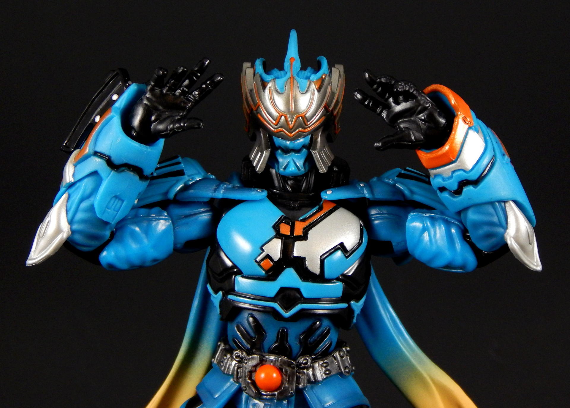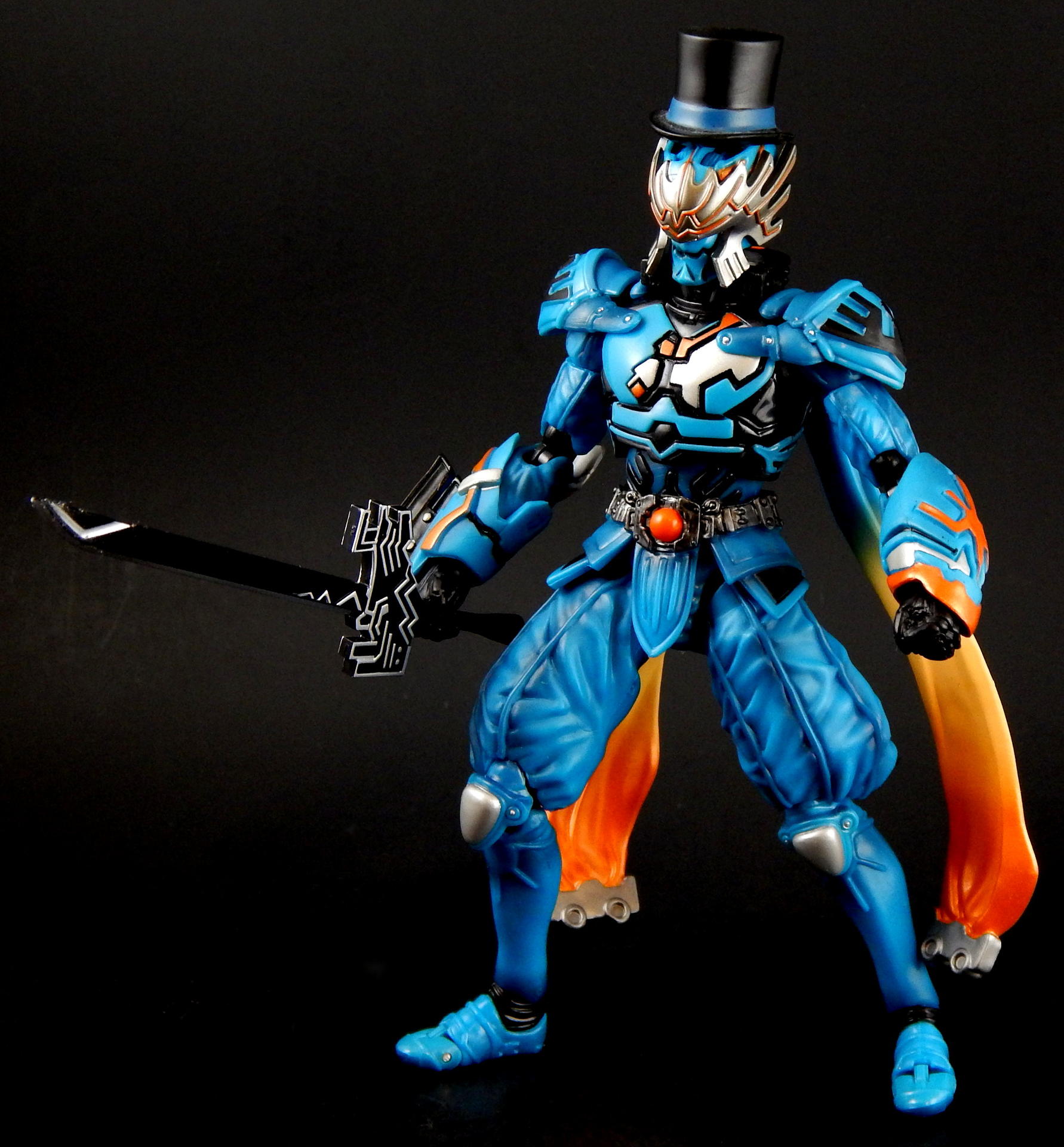 "I told you before, I also love this city." Ah, Kirihiko Suda! From the smug, superior attitude he carried at the beginning, as the top Gaia Memory dealer, to the way he became a rival of Kamen Rider W, in his form as the Nasca Dopant, and then even a bit of an ally at the end, Kirihiko was a favorite character of mine. And no lie, I still get a bit teary-eyed when I think of his transition and demise (spoilers!). SH Figuarts Nasca is a figure I looked forward to getting for quite a while, so let's see how he compares to the W Figuarts (of which I have previously reviewed Heat Metal, Luna Trigger, and of course Cyclone Joker), shall we? Packaging Nasca comes in the standard Figuarts box of the time, with a black and white picture of the character on one corner, a big window revealing the figure, and his name in orange letters against the blue box. I do like the coloring the W boxes have, but really, the boxes are boring, merely functional and little else. Main Figure Nasca has almost all the same articulation points as does W, but he doesn't share any parts, as far as I can tell. The joints are all functional and none are too hindered, though the hands can run into the gauntlets that extend past the wrist in some poses, but it's not too big a deal. The baggy pants he wears are scooped out in the back so his knees retain a deep bend, the skirt is soft and don't interfere with the legs that I've found. His ab crunch is a bit better than the W body, as his Driver doesn't interfere like W's does, though the backwards movement has a little more range. His scarf? Cape? What are those things on his back? Anyway, they're on a ball that lets them swivel out to almost parallel with the ground, and they can be lifted backwards too, though to get them to stay out like that I had to half-pop them off the ball. Oh, the ankles are not my favorite type of joint, being a ball-peg that the foot plugs into. There's not ankle hinge like W has, but unlike other Figuarts that have this type of foot joint, Nasca's actually has a pretty good range before the foot collides with the leg. As for the sculpting, Nasca is fantastic. The problem with W's form variations is that they're 9 (I guess 10, really, with Fang Joker) identical figures. There is slight variation in the chest band and arm/ankle cuffs, but they're such a small percentage of the figure, what my eye really sees is the same suit recolored several ways, and frankly, though I love the show and the character, it's a bit monotonous on the shelf. Enter Nasca! He looks NOTHING like W, and that's a great thing. His two gauntlets are distinct in both shape and detailing, his shoulder pads are triangles instead of the sphere's of W, the helmet is completely unlike W's, and his skirt and baggy paints completely change the shape of the figure, so again it looks unlike W. Obviously, that's all the design from the show, not inherent in the figure, but it was executed perfectly for the figure. All the black lines shapes on the blue, and the blue shapes on the black, are all sculpted, so the distinction between the colors is sharp and clean. The belt is detailed, the pants and sleeves look like cloth, with appropriate folds and wrinkles to look realistic, and to contrast with the smooth boots and armor-look of the gauntlets and torso. There's also black shading that helps bring out the folds/seams/wrinkles of the 'cloth' parts. The cape/scarf things are unique sculpts, each folding/curving in distinct ways. All the orange lines on the silver part of the mask are again sculpted detail, which helps it look amazing. Accessories For accessories, Nasca doesn't have a lot, and two of them are really part of his costume and probably shouldn't count, but for some reason, it doesn't feel like quite as big a deal as on the three W forms (maybe because the bodies are just repaints of each other? I don't know). Our friend Nasca has 4 pairs of hands, punching fists, sword holding hands, rage hands, and gesturing hands. As I mentioned earlier, Nasca doesn't appear to share any parts with W, and that includes the hands, they are not the same sculpt as W', he has a unique look to his gloves. Additionally, the poses of the rage and gesture hands are distinct from W's hands, so that's a nice detail. His cape/scarf thingies are removable, so I pictured them as accessories, but really, they're part of his outfit, there's no reason to ever remove them. His best accessory is, of course, his sword. It's an odd design, the grip is thin at the hilt and thickens as you move to the pommel, the hilt his a large, strange black piece with lots of silver lines painted on it (all raised sculpts), there's a few lines sculpted on the blade and painted silver, and the edge of the blade is also silver. While I don't know that I actually like the design, I love the look of the black and silver paint, it's great. Do be careful when putting the sword in his hands, this is actually my second Nasca Figuarts, as I broke the grip of the sword off right at the base of the hilt when trying to get him to hold it. Don't push on the hilt, push on the grip where you're having him hold it. Anyway, I love swords and Nasca looks great posed with his. I will say, it would have been cool to get his speed or flying wings that could be swapped with the scarfs, or maybe a soft rubber scarf with bendy wire in it, since they could be prehensile in the show? But neither feels like a noticeable lack, really. Oh, what he should have come with was a to-scale Futo-kun key chain. LOL. Final Thoughts I think this figure is a necessary part of the Kamen Rider W line. He was a very influential character, heroic in his own way, the suit itself came back in a different form later, and again returned briefly in the A-to-Z movie to fight Accel. Beyond that, it's absolutely gorgeous, both in terms of coloring and sculpting, and it stands out against the sameness of many color swaps of the W suits. And as a bonus, it's not expensive on 
