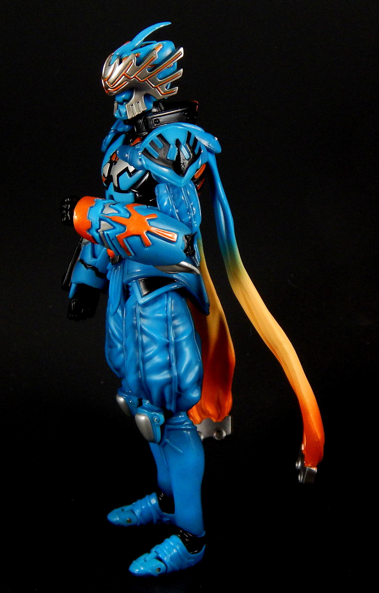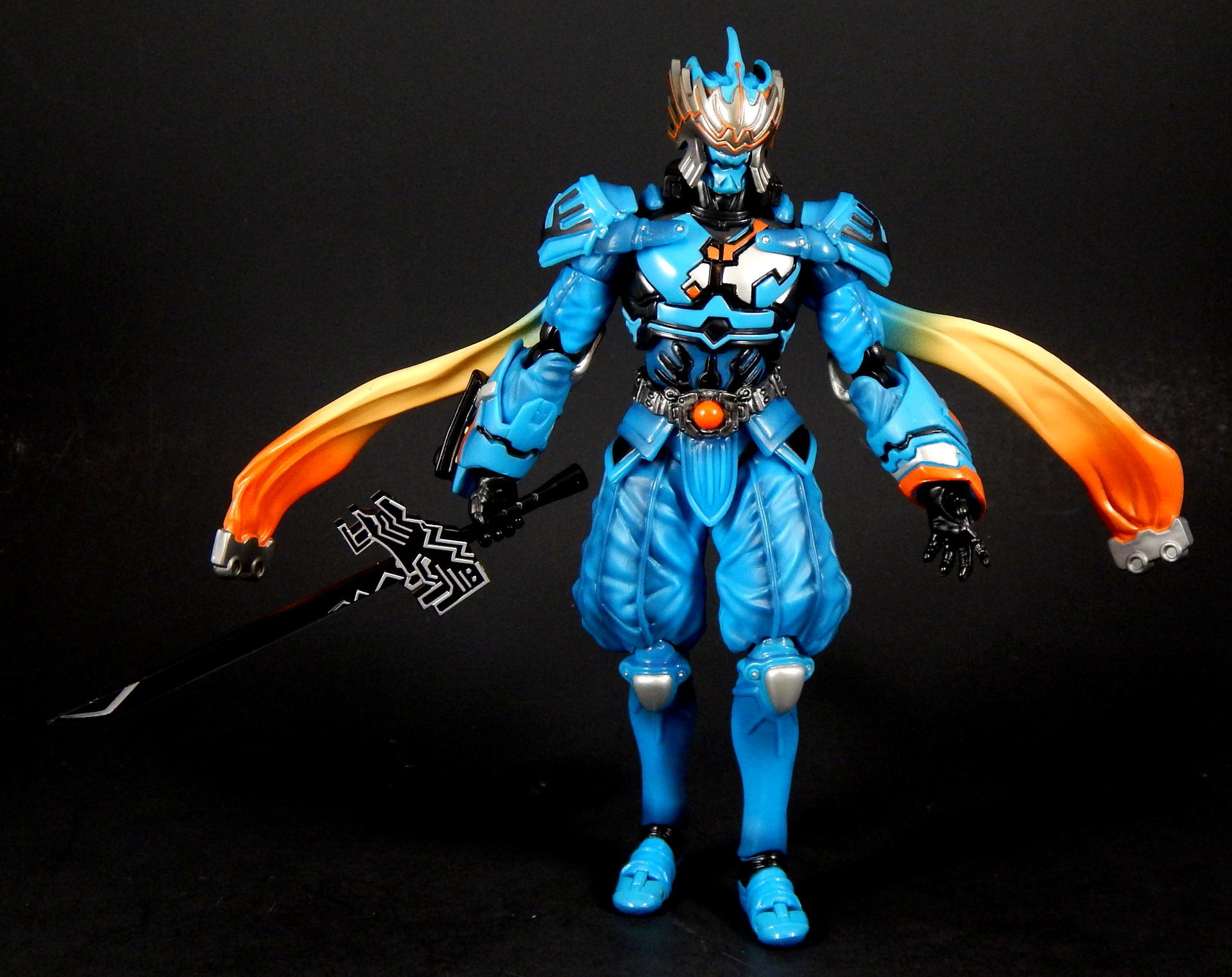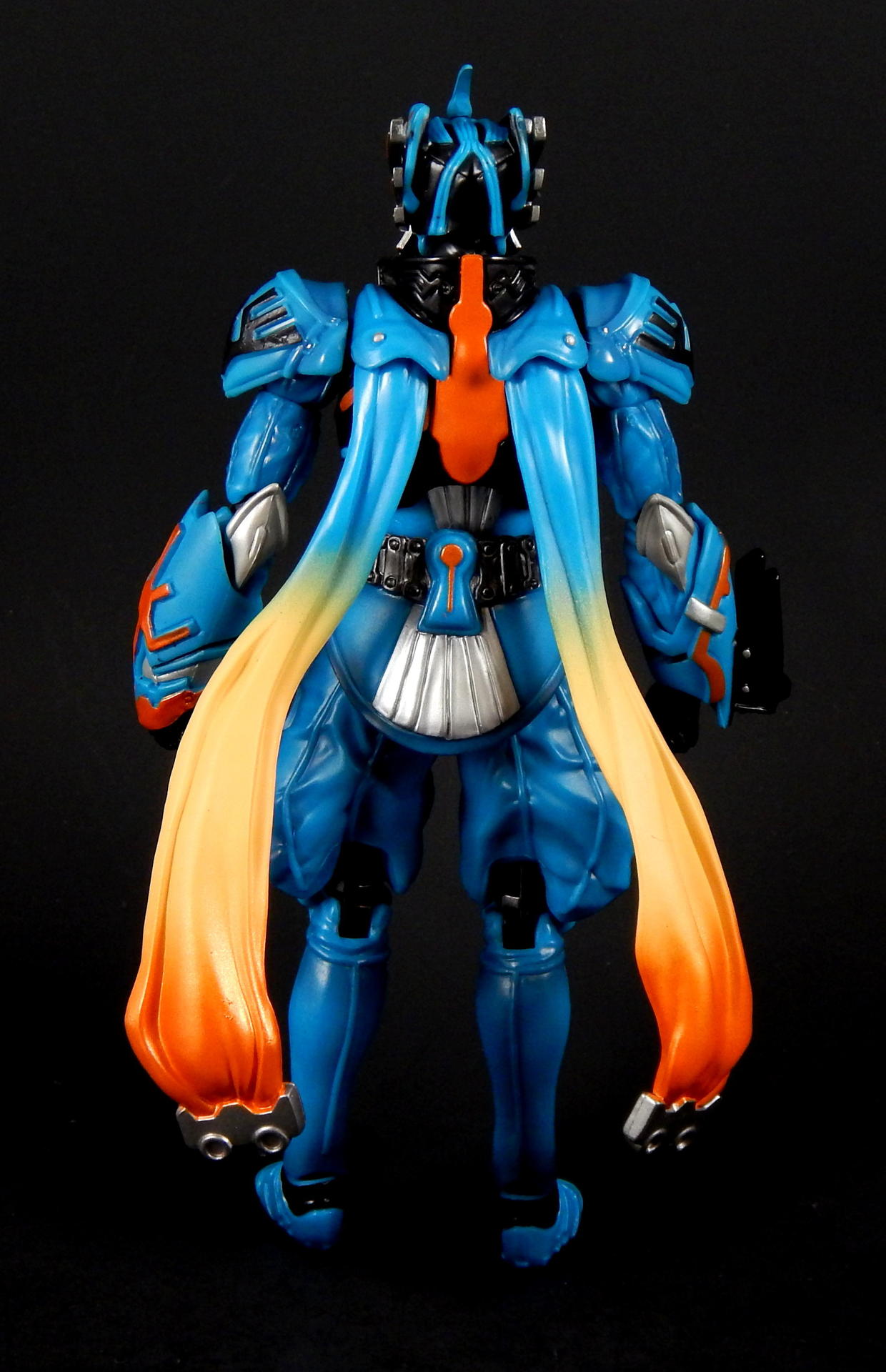 "I told you before, I also love this city." Ah, Kirihiko Suda! From the smug, superior attitude he carried at the beginning, as the top Gaia Memory dealer, to the way he became a rival of Kamen Rider W, in his form as the Nasca Dopant, and then even a bit of an ally at the end, Kirihiko was a favorite character of mine. And no lie, I still get a bit teary-eyed when I think of his transition and demise (spoilers!). SH Figuarts Nasca is a figure I looked forward to getting for quite a while, so let's see how he compares to the W Figuarts (of which I have previously reviewed Heat Metal, Luna Trigger, and of course Cyclone Joker), shall we? Packaging Nasca comes in the standard Figuarts box of the time, with a black and white picture of the character on one corner, a big window revealing the figure, and his name in orange letters against the blue box. I do like the coloring the W boxes have, but really, the boxes are boring, merely functional and little else. Main Figure Nasca has almost all the same articulation points as does W, but he doesn't share any parts, as far as I can tell. The joints are all functional and none are too hindered, though the hands can run into the gauntlets that extend past the wrist in some poses, but it's not too big a deal. The baggy pants he wears are scooped out in the back so his knees retain a deep bend, the skirt is soft and don't interfere with the legs that I've found. His ab crunch is a bit better than the W body, as his Driver doesn't interfere like W's does, though the backwards movement has a little more range. His scarf? Cape? What are those things on his back? Anyway, they're on a ball that lets them swivel out to almost parallel with the ground, and they can be lifted backwards too, though to get them to stay out like that I had to half-pop them off the ball. Oh, the ankles are not my favorite type of joint, being a ball-peg that the foot plugs into. There's not ankle hinge like W has, but unlike other Figuarts that have this type of foot joint, Nasca's actually has a pretty good range before the foot collides with the leg. As for the sculpting, Nasca is fantastic. The problem with W's form variations is that they're 9 (I guess 10, really, with Fang Joker) identical figures. There is slight variation in the chest band and arm/ankle cuffs, but they're such a small percentage of the figure, what my eye really sees is the same suit recolored several ways, and frankly, though I love the show and the character, it's a bit monotonous on the shelf. Enter Nasca! He looks NOTHING like W, and that's a great thing. His two gauntlets are distinct in both shape and detailing, his shoulder pads are triangles instead of the sphere's of W, the helmet is completely unlike W's, and his skirt and baggy paints completely change the shape of the figure, so again it looks unlike W. Obviously, that's all the design from the show, not inherent in the figure, but it was executed perfectly for the figure. All the black lines shapes on the blue, and the blue shapes on the black, are all sculpted, so the distinction between the colors is sharp and clean. The belt is detailed, the pants and sleeves look like cloth, with appropriate folds and wrinkles to look realistic, and to contrast with the smooth boots and armor-look of the gauntlets and torso. There's also black shading that helps bring out the folds/seams/wrinkles of the 'cloth' parts. The cape/scarf things are unique sculpts, each folding/curving in distinct ways. All the orange lines on the silver part of the mask are again sculpted detail, which helps it look amazing. Accessories For accessories, Nasca doesn't have a lot, and two of them are really part of his costume and probably shouldn't count, but for some reason, it doesn't feel like quite as big a deal as on the three W forms (maybe because the bodies are just repaints of each other? I don't know). Our friend Nasca has 4 pairs of hands, punching fists, sword holding hands, rage hands, and gesturing hands. As I mentioned earlier, Nasca doesn't appear to share any parts with W, and that includes the hands, they are not the same sculpt as W', he has a unique look to his gloves. Additionally, the poses of the rage and gesture hands are distinct from W's hands, so that's a nice detail. His cape/scarf thingies are removable, so I pictured them as accessories, but really, they're part of his outfit, there's no reason to ever remove them. His best accessory is, of course, his sword. It's an odd design, the grip is thin at the hilt and thickens as you move to the pommel, the hilt his a large, strange black piece with lots of silver lines painted on it (all raised sculpts), there's a few lines sculpted on the blade and painted silver, and the edge of the blade is also silver. While I don't know that I actually like the design, I love the look of the black and silver paint, it's great. Do be careful when putting the sword in his hands, this is actually my second Nasca Figuarts, as I broke the grip of the sword off right at the base of the hilt when trying to get him to hold it. Don't push on the hilt, push on the grip where you're having him hold it. Anyway, I love swords and Nasca looks great posed with his. I will say, it would have been cool to get his speed or flying wings that could be swapped with the scarfs, or maybe a soft rubber scarf with bendy wire in it, since they could be prehensile in the show? But neither feels like a noticeable lack, really. Oh, what he should have come with was a to-scale Futo-kun key chain. LOL. Final Thoughts I think this figure is a necessary part of the Kamen Rider W line. He was a very influential character, heroic in his own way, the suit itself came back in a different form later, and again returned briefly in the A-to-Z movie to fight Accel. Beyond that, it's absolutely gorgeous, both in terms of coloring and sculpting, and it stands out against the sameness of many color swaps of the W suits. And as a bonus, it's not expensive on 