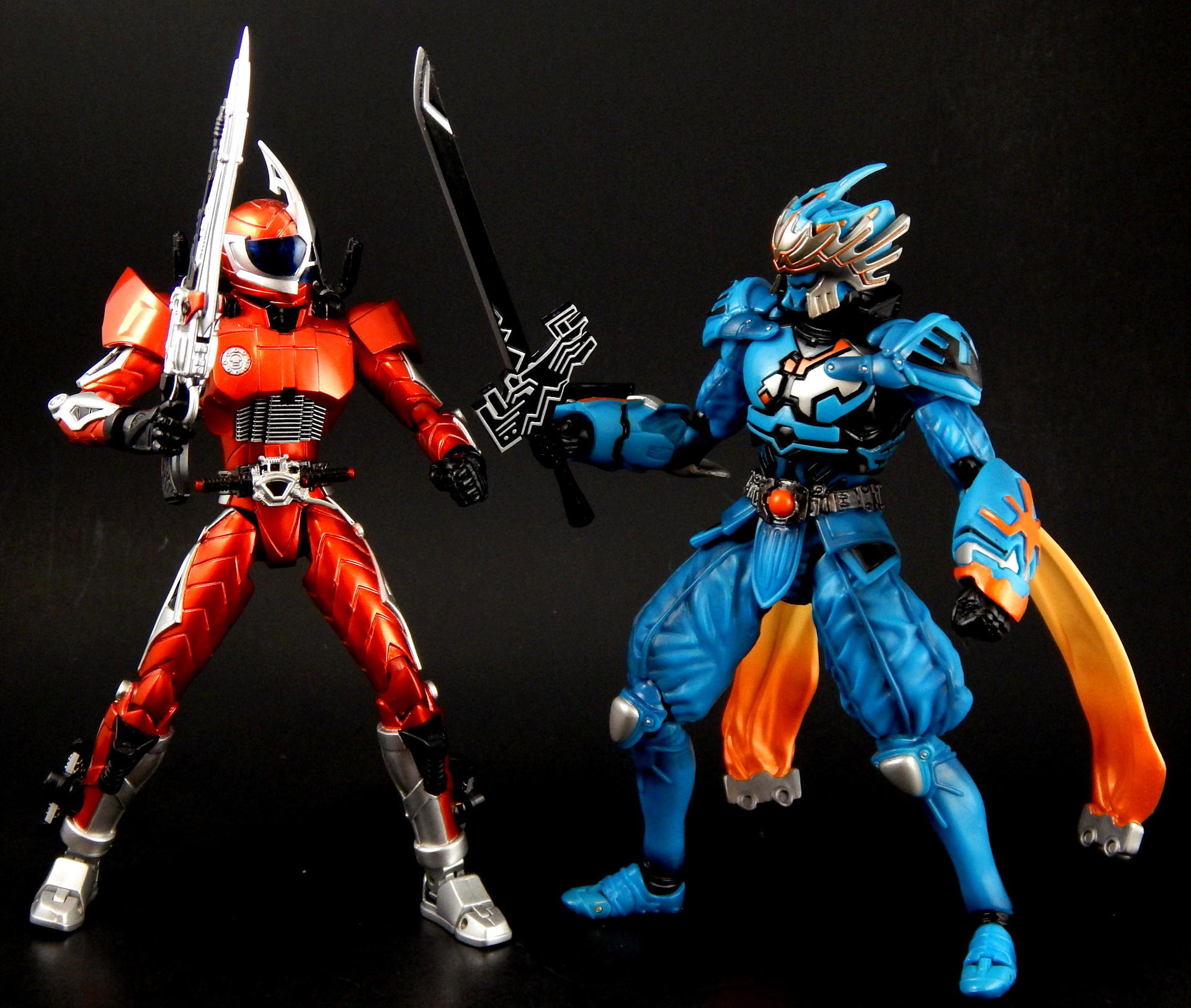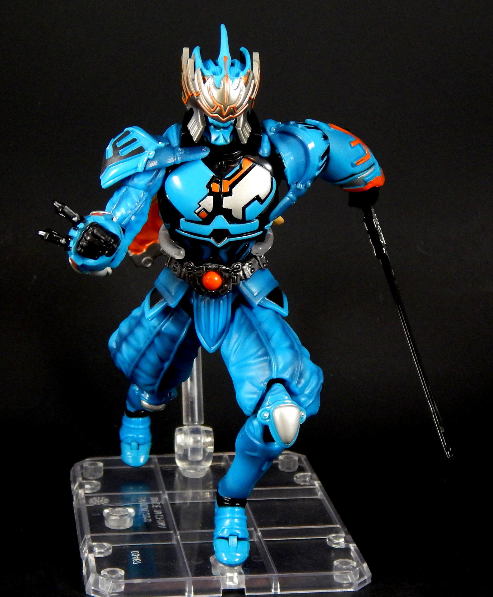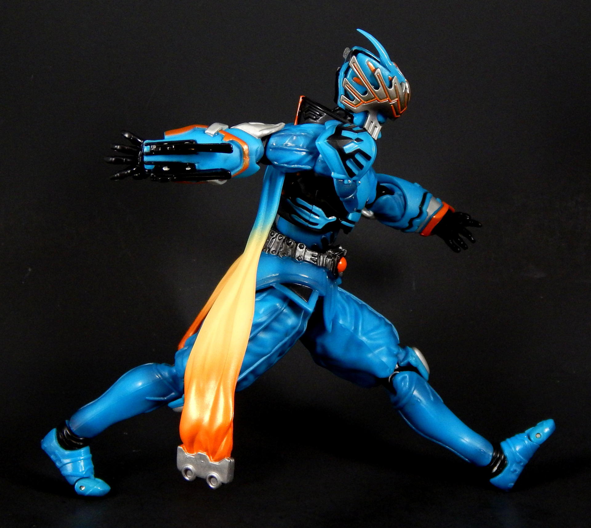 "I told you before, I also love this city." Ah, Kirihiko Suda! From the smug, superior attitude he carried at the beginning, as the top Gaia Memory dealer, to the way he became a rival of Kamen Rider W, in his form as the Nasca Dopant, and then even a bit of an ally at the end, Kirihiko was a favorite character of mine. And no lie, I still get a bit teary-eyed when I think of his transition and demise (spoilers!). SH Figuarts Nasca is a figure I looked forward to getting for quite a while, so let's see how he compares to the W Figuarts (of which I have previously reviewed Heat Metal, Luna Trigger, and of course Cyclone Joker), shall we? Packaging Nasca comes in the standard Figuarts box of the time, with a black and white picture of the character on one corner, a big window revealing the figure, and his name in orange letters against the blue box. I do like the coloring the W boxes have, but really, the boxes are boring, merely functional and little else. Main Figure Nasca has almost all the same articulation points as does W, but he doesn't share any parts, as far as I can tell. The joints are all functional and none are too hindered, though the hands can run into the gauntlets that extend past the wrist in some poses, but it's not too big a deal. The baggy pants he wears are scooped out in the back so his knees retain a deep bend, the skirt is soft and don't interfere with the legs that I've found. His ab crunch is a bit better than the W body, as his Driver doesn't interfere like W's does, though the backwards movement has a little more range. His scarf? Cape? What are those things on his back? Anyway, they're on a ball that lets them swivel out to almost parallel with the ground, and they can be lifted backwards too, though to get them to stay out like that I had to half-pop them off the ball. Oh, the ankles are not my favorite type of joint, being a ball-peg that the foot plugs into. There's not ankle hinge like W has, but unlike other Figuarts that have this type of foot joint, Nasca's actually has a pretty good range before the foot collides with the leg. As for the sculpting, Nasca is fantastic. The problem with W's form variations is that they're 9 (I guess 10, really, with Fang Joker) identical figures. There is slight variation in the chest band and arm/ankle cuffs, but they're such a small percentage of the figure, what my eye really sees is the same suit recolored several ways, and frankly, though I love the show and the character, it's a bit monotonous on the shelf. Enter Nasca! He looks NOTHING like W, and that's a great thing. His two gauntlets are distinct in both shape and detailing, his shoulder pads are triangles instead of the sphere's of W, the helmet is completely unlike W's, and his skirt and baggy paints completely change the shape of the figure, so again it looks unlike W. Obviously, that's all the design from the show, not inherent in the figure, but it was executed perfectly for the figure. All the black lines shapes on the blue, and the blue shapes on the black, are all sculpted, so the distinction between the colors is sharp and clean. The belt is detailed, the pants and sleeves look like cloth, with appropriate folds and wrinkles to look realistic, and to contrast with the smooth boots and armor-look of the gauntlets and torso. There's also black shading that helps bring out the folds/seams/wrinkles of the 'cloth' parts. The cape/scarf things are unique sculpts, each folding/curving in distinct ways. All the orange lines on the silver part of the mask are again sculpted detail, which helps it look amazing. Accessories For accessories, Nasca doesn't have a lot, and two of them are really part of his costume and probably shouldn't count, but for some reason, it doesn't feel like quite as big a deal as on the three W forms (maybe because the bodies are just repaints of each other? I don't know). Our friend Nasca has 4 pairs of hands, punching fists, sword holding hands, rage hands, and gesturing hands. As I mentioned earlier, Nasca doesn't appear to share any parts with W, and that includes the hands, they are not the same sculpt as W', he has a unique look to his gloves. Additionally, the poses of the rage and gesture hands are distinct from W's hands, so that's a nice detail. His cape/scarf thingies are removable, so I pictured them as accessories, but really, they're part of his outfit, there's no reason to ever remove them. His best accessory is, of course, his sword. It's an odd design, the grip is thin at the hilt and thickens as you move to the pommel, the hilt his a large, strange black piece with lots of silver lines painted on it (all raised sculpts), there's a few lines sculpted on the blade and painted silver, and the edge of the blade is also silver. While I don't know that I actually like the design, I love the look of the black and silver paint, it's great. Do be careful when putting the sword in his hands, this is actually my second Nasca Figuarts, as I broke the grip of the sword off right at the base of the hilt when trying to get him to hold it. Don't push on the hilt, push on the grip where you're having him hold it. Anyway, I love swords and Nasca looks great posed with his. I will say, it would have been cool to get his speed or flying wings that could be swapped with the scarfs, or maybe a soft rubber scarf with bendy wire in it, since they could be prehensile in the show? But neither feels like a noticeable lack, really. Oh, what he should have come with was a to-scale Futo-kun key chain. LOL. Final Thoughts I think this figure is a necessary part of the Kamen Rider W line. He was a very influential character, heroic in his own way, the suit itself came back in a different form later, and again returned briefly in the A-to-Z movie to fight Accel. Beyond that, it's absolutely gorgeous, both in terms of coloring and sculpting, and it stands out against the sameness of many color swaps of the W suits. And as a bonus, it's not expensive on 