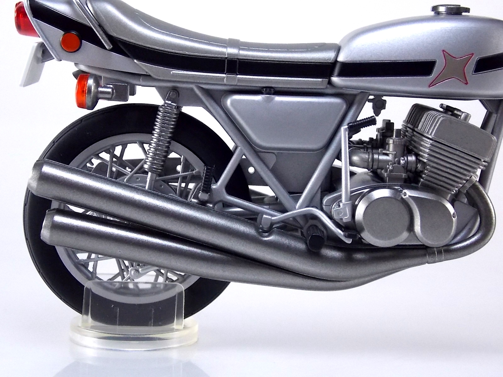 Packaging As has become the case with most bikes produced in this like, the packaging is all business as usual. The White Crow's box is modeled after Kikaider, Hakaider, & the Side Machine. Very cool minimalist artwork with one dynamic box shot on the back. Otherwise nothing new to see. Main Figure S.H. Figuarts White Crow is a very straight forward release. Unlike some Rider machines released in this line, it's more or less a standard motorcycle with some new accents added for flare. At it's base the White Crow is a standard 1972 model Kawasaki H1 Mach III. A gorgeous and classic bike design in it's own right. Here the bike is presented in fantastic painted silver with a few extra details. Primarily a set of diamond patterned bars on the front wheel. They almost appear to be Katana grips. Perhaps that's what the production staff of the show was going for? They look nice regardless of their purpose. Contrasting with the silver is a slick curved black stripe along the body of the bike. It helps to give the vehicle a bit of curvature to it, or at least it forces your eye to see it that way. It makes it feel a bit more alive. Otherwise the only other unique feature of the bike is Hakaider's emblem on the fuel tank. Everything else about White Crow is incredibly typical like the working rear suspension and turning front wheel. Nothing else spectacular to report. Although the gauges on the handlebars are fully painted which I always love. Accessories As (generally) is the case, S.H. Figuarts White Crow is lite on the accessories but gives us soemthing that's much needed: 1 - set of fully licensed Kawasaki labels! Just as with Side Machine, White Crow includes manufacturer labels to give the figure a bit more of that factory feel to it if you so choose. They're entirely optional but so so welcome as a bonus. I may never use them but I LOVE having them. 1 - set of riding hands. Most Figuarts these days tend to come with some form of "holding things" hands that while not perfect can at least double and work for this, but on occasion a vehicle includes them. In this case I'm very happy to have them and they could serve as hands for Hakaider or the recently release and very similar Gill Hakider if you so choose. 1 - wheel base. Standard size wheel base to hold the bike in place when not using the kickstand. 1 - set of additional handlebars. As usual I never have any idea why these are included. Final Thoughts S.H. Figuarts White Crow is a gorgeous bike to be certain and accurately represents what we saw in the original series. But for most it won't hold any special meaning unless they were fans of the series or character. For me it's a winner, but for most I can easily see why it would be a pass. But it's just so damn nice to have it side by side with the Side Machine. Next time we take a look at the titular hero of the second Kikaider live action series, S.H. Figuarts Kikaider 01!