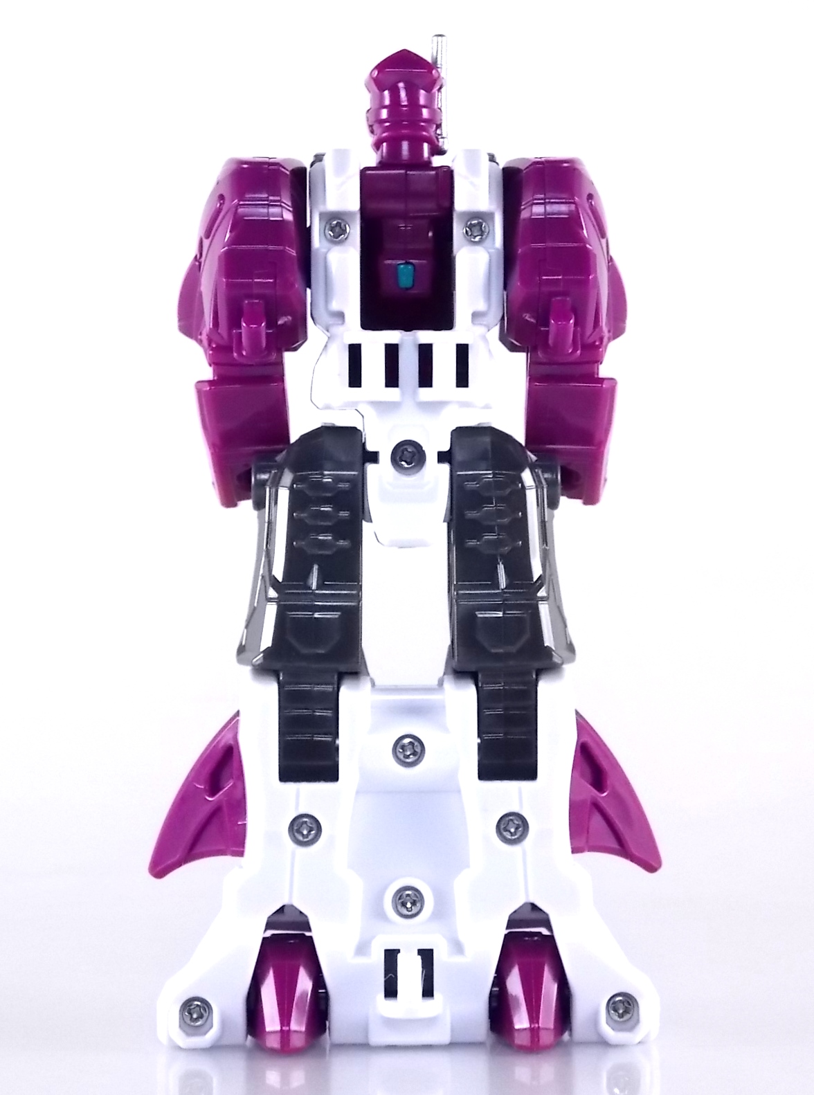 Shuriken Sentai Ninninger's all-star toy line continues with the addition of another Otomonin upgrade mecha! The DX Surfermaru! In the show, following the introduction of Paonmaru & UFOmaru, Surfermaru is the 3rd additional machine for the team. An odd one indeed, Surfermaru is so far the only extra Otomonin compatable with both Shurikenjin & Bison King. Now onto the toy! Packaging DX Surfermaru comes in the same type of small cardboard box as Paon & UFOmaru. It's pretty basic stuff for sentai lines honestly. Once one additional mecha comes out they almost all follow the same formula for packaging with each successive release. Some basic stock photography of the figure as well as shots of it's combined forms are present and that's about here. Main Figure A bit of an odd one, the main body of Surfermaru is composed of two parts. The base surfboard, and the actual Surfermaru robot. When combined these two parts make up the bulk of the Submarine mode. The included Shuriken parts finish off the look but we'll get to those in a second. Much like UFOmaru before him, Surfermaru is pretty unique looking. Though we have had several submarine's and other aquatic vehicles through out Super Sentai history, this is the first one with a humanoid robot blended into the design. The basic robot mode for Surfermaru can be achieved without any additional bits. It actually comes pre-packaged this way just as you need him for robot mode. He's roughly the same height as the benchmark that Shinobimaru has set. From a complexity and design stand point Surfermaru has more going on but the 2 still share some basic design elements to help unify them and lend credit to the notion that all Otomonin were built by the same person. All 5 of "pilot marus" look great together. As a set they alone show a lot of diversity for this line. Even without their additional combining bits, each is unique in their own way. DX Surfermaru is definitely the interesting one of the bunch though. Thanks to the way he needs to transform for his submarine mode he gets some added articulation that none of the others really have. Surfermaru has forward tilting angles. Meant for use while he's plugged onto the actual surfboard, these ankles allow him to lean completely forward on a flat surface in a way that would make the king of pop proud (as you can see below ) . His hips & knees can also arch back allowing him to lean all the way back while on the board. Surfermaru's arms also rotate 360 degrees as a necessity for his sub transformation. But this also allows him to look much more dynamic. To get into Submarine mode you need to fold the massive surfboard entirely in half upon itself. Then take Surfermaru himself and rotate his head on on the chest joint so it's hidden inside the main body. This rotates up the "sub head" for the sub mode. Now rotate his arms such that the elbow area is parallel to his head. Now plug his back onto the front end of the board and fold his legs backward and uponto the bottom of the board. Then simply fold out the rear wheels on the underside, and plug his shuriken onto the back end. It's a pretty damn weird looking sub, but I love LOVE the crazy looking shark face that winds up on the front end of this thing. The teeth and eyes are bizarre but I love it. Accessories It's hard to classify accessories with something like this as it's harder to distinguish between those items which are included for use with the figure optinally, or those things that are integral to it's basic structure. Nin Shuriken Base & Disc. This electronic item is what forms the head and face of Shurikenjin Surfer or alternatively Bison King Surfer. It's normally stored on Surfermaru's vehicle mode plugged onto the rear of the surfboard. I still find it odd that Paon, UFO, & Surfer as well as the Bison Buggy can all store these items in their vehicle modes, but Shinobimaru and rest of the Shurikenjin team has no such storage for the Shurikenjin Nin Shuriken. A pair of triggers on this piece detect when it's combined to form either of it's 2 combinations and plays out the appropriate phrase & music when done. When not connected pressing the physical button on top will cycle through three sound bytes "Surferger" "Surfermaru" & "Otomonin Shuriken". Much like how UFOmaru had uniquely molded Shuriken blades, those on Surfermaru are made to look like curved surfboards. Shurikenjin Surfer To get Shurikenjin ready for this combination you need to remove and rearrange a few things. Start by removing the standard Shurikenjin Shuriken and leaving that to the side, it won't be used. Remove Shinobimaru from the throne all together, and then remove the right arm made from Dumpmaru. People often question why a third shoulder peg exists on the back of the figure and it's for this, to store the arm you just removed! So plug the Dumpmaru arm there and transform Shinobimaru into the new right arm and plug him on. Now take Surfermaru's inner robot and adjust his arms and legs accordingly, plug him into the throne. Now make sure you lock the Shuriken disc onto the Surfer Shuriken, fold out the faceplate, and plug it on top. This completes the basic robot, but to finish the look you need to grab Surfermaru's actual surf board. When folded out to it's full length you'll see a set of clips built into the board. The one on the front end of the board is the one you need to flip out for Shurikenjin's foot to peg into. And voila! Shurikenjin Surfer is formed! Bison King Surfer For Bison King you need only remove the Bison King Shuriken and Rodeomaru. Simplt take Surfermaru and fold him down like Rodeo onto the Bison King shoulders and plug his Shuriken on top as you would the Bison King Shuriken. Then take the surfboard and flipout the foot clip on the Bison King end of the board. With that Bison King Surfer is born! Sadly (and I feel randomly) this is the only one of the additional Otomonin with an actual official combo with Bison King. Of course Surfermaru share's man
