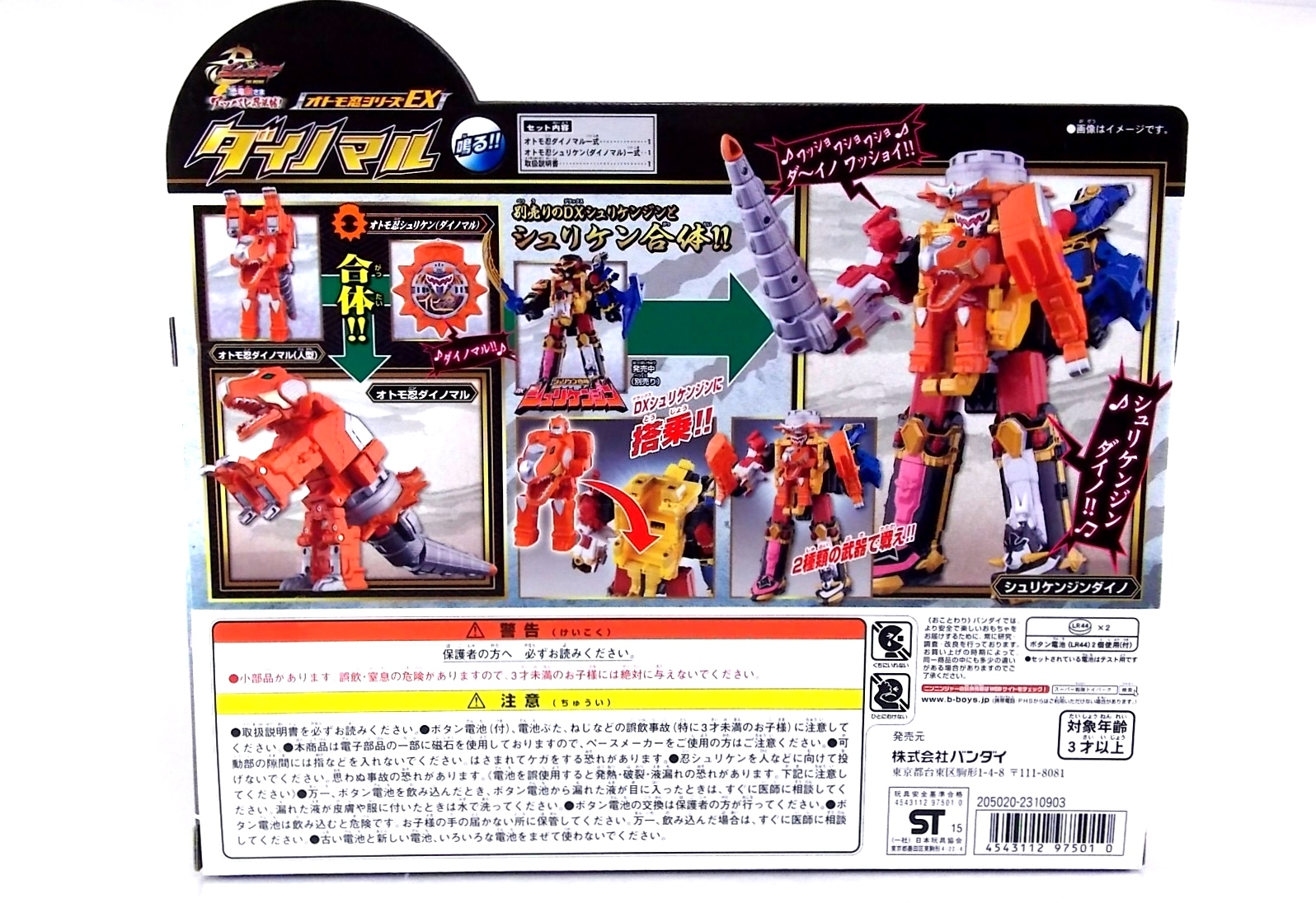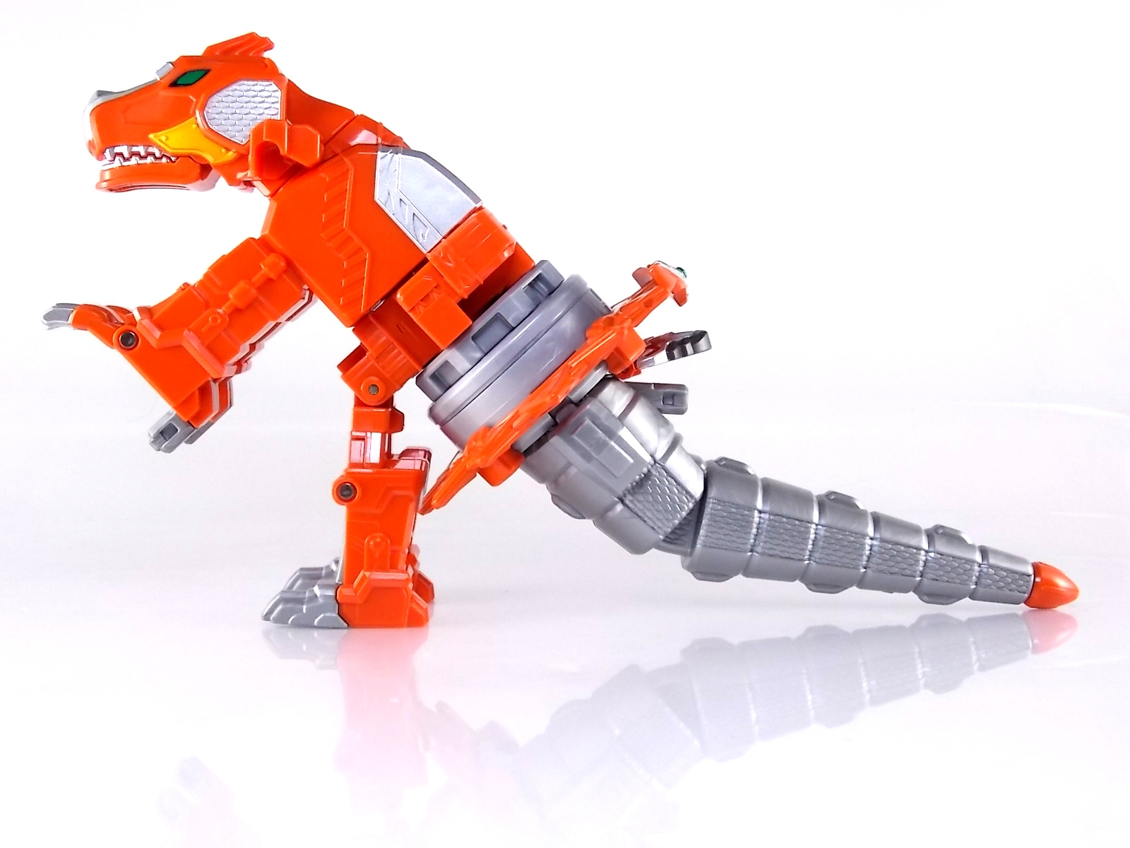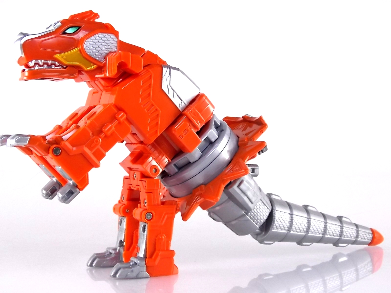 Packaging DX Dinomaru comes in the now standard packaging that all of the additional Otomonin of this toyline have shared. Nothing new to report here as the only changes to the basic packaging are the images of Dinomaru and the "EX" designation for this special release. Main Figure It needs to first be noted that DX Dinomaru is a remold & repaint of the first Otomonin released in the line, DX Paonmaru! It's kind of bonkers that Bandai were able to get an elephant & a dinosaur out of essentially the same toy, but they did it. And while the results are a little mixed it's still pretty damn cool. Dinomaru has an interesting transformation method to say the least. The standard configuration of this figure is obviously it's T-Rex form. To create it you need to first take the core humanoid body and ben it forward at the hips. Then take the the two hammer like weapons (which were axes on Paonmaru) and plug them on to the back of of the robot. Then attach the included T-Rex head onto the pair of clips on this back section and rotate the face down, the mouth can then open as well. The Shuriken itself with the disc attached then plugs onto what winds up being the tail of the figure, on Paonmaru it would have been the chest. Then simply plug the T-Rex tail on and use the joint at it's base to angle it up to allow clearance. Thus completing the look! It's actually a pretty intricate little figure in this mode, it's a little orange brick, but a fun one. The basic robot mode for Dinomaru can be achieved by reassembling the given components. Separate everything back down to it's base and start from scratch with the small humanoid robot. Straighten the legs out properly and then fold the head up out of the back of it's chest. Take the T-Rex head and plug it onto the Dinomaru robot's chest which gives you the basic robot. The head actually completes the arms of the robot weirdly enough, though not quite in the same way as Paonmaru did. The base robot only has elbow length arms but some tiny fists are sculpted into the head section to complete them. Then take the Hammers/arms and attach them to the shoulder/backpack area. This give the appearance of 2 giant claws coming off his bath and sadly means there's a lack of missle launchers that were present on Paonmaru. The actual Shuriken and disc aren't used for this mode at all. But that gives you Dinomaru in robot mode. As you can see the molding differences between Dion & Paon are that great but the affect the figure greatly here. The moving joins in the hammer weapons are gone entirely. Premanently molded handles give the impresseion of claws so this figure can't really assume a "down on all fours" type of mode. Accessories Included with DX Dinomaru are 2 accessories integral to it's T-Rex mode, and it's further combination with Shurikenjin. The Nin Shuriken Base & Disc. This electronic item is what forms the head and face of Shurikenjin Dino. It's normally stored on Dinomaru's animal form as the connector for the tail. I still think it's weird these Shurikens only have storage options in one mode for the Otomonin rather both forms. A pair of triggers on this piece detect when it's combined to form Shurikenjin Dino and plays out the appropriate phrase & music when done. When not connected pressing the physical button on top will cycle through three sound bytes "Dinoger" "Dinomaru" & "Otomonin Shuriken". Shurikenjin Dino To get Shurikenjin ready for this combination you need to remove and rearrange a few things. Remove the standard Shurikenjin Shuriken and leaving that to the side, it won't be used. Remove Shinobimaru from the throne, then remove the right arm made from Dumpmaru. Plug Dumpmaru arm onto the back peg of Shurikenjin & transform Shinobimaru into the new right arm and plug him on. Now take the basic Dinomaru robot minus the shoulder cannons and fold his legs up to seat him in the throne. Then simply plug the Dino Shuriken onto the the neck of Shurikenjin. As a side not the new faceplate is pretty awesome looking compared to the standard Shurikenjin face or the on the Paon Shuriken. It's sort of reminds me of Abare Killer's helmet. Now take the T-Rex tail and straighten it back out, then flip the small handle out at the base. Plug it into the combined robot's hands and there you have it, Shurikenjin Dino is formed! Whether it's intentional or not you can plug the unnamed hammer like weapons onto Shurikenjin's back for storage, or you can alternatively plug them right into Shurikenjin's hands in lieu of the Sword. While you won't be using the standard Shurikenjin shuriken in this combo, you can still use the Drago Sword & Shield optionally. Either way Shurikenjin Dino is pretty great. It's by far my favorite combination thus far. It may only have appeared in one movie thus far, but I'd say it isn't out of the realm of possibility to see it in the show at least once if the past is any indicator. Oh, and because of the dynamic hips Shurikenjin has you can get some decent poses out this form! Final Thoughts With what seems to be the final single Otomonin release in the line I have to say I'm satisfied. The 4 unique releases have been a bit hit or miss, but EX DX Dinomaru is the clear winner of the bunch. Check out our previous DX Ninninger galleries below! DX Shurikenjin DX Paonmaru DX UFOmaru DX Surfermaru DX Bison King
