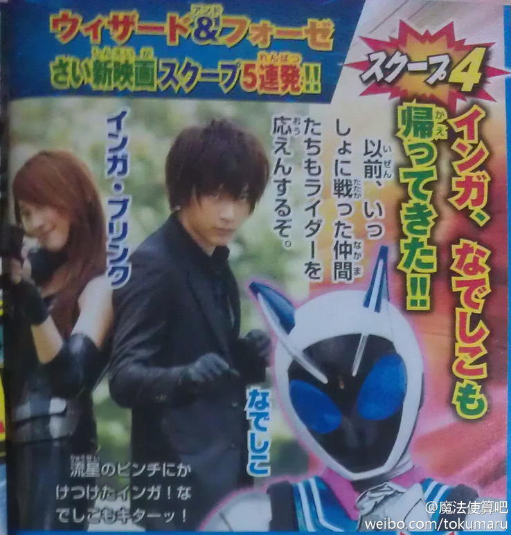Further scans from the magazine also reveal that the movie will be set five years after the end of Fourze, the return of Kamen Rider Nadeshiko and the guest appearances of Sanagiman from Inazuman and the magical girl Patrine from the series Pretty Mask Poitrine! Kamen Rider x Kamen Rider Wizard & Fourze: Movie Wars Ultimatum is set to be released in December 2012! Stay tuned to TokuNation for more information as it comes! Picture credit: Tokumaru and Henshin Justice Unlimited