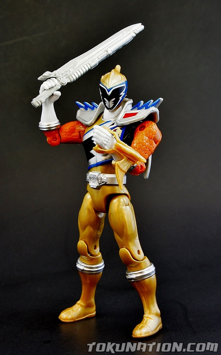After 800 years of darkness, the Knight of Zandar Sir Ivan, has been released from his imprisonment inside the villainous Fury! With his freedom restored he becomes the Dino Charge Gold Ranger, using the power of the Gold Energem and from the Ptera Zord to vanquish his foes. This 5" figure is the first major retail release of the character, aside from a vinyl figure in Japan. You can find the Kyoryu Gold S.H. Figuart figure on the aftermarket, but it was not available as a retail release, and instead was a web exclusive. Right off the bat it should be noted that this figure is going to have the same quality issues you find in the other 5" figures from the Power Rangers Dino Charge line, because with the exception of a retooled head and chest, it is the same figure you've already purchased with the core four male Ranger figures. So ignoring those, we're going to focus particularly on this figure and what it brings to the table. The Figure First and foremost, Bandai America knocked it out of the park when they did the head sculpting. It looks incredible and the paint detail is outstanding. The metallic blue details on the helmet as well as remembering to add the red eyes are incredible. The paint on the chest is also top notch. Obviously, there's no paint on the back but on this figure you don't really notice it. But the colors picked create a bright and glorious looking figure in the package and even more so when you put the lights on it to take pictures. It just pops - and that's awesome. The Accessories The Ptera Sword is very detailed and nice looking. Obviously, it isn't painted. But it still looks incredibly sculpted as most of the Bandai America accessories do. Again, it's just the lack of painting that ruins what was otherwise a glorious looking weapon. The Ptera Morpher on his wrist is also unpainted, and comes in what I'm calling the "800 years of rust" colors (kind of like when he first calls for it in the show!). Obviously, the morpher is supposed to be blue and silver, but this is more of a rust-brown. Either way, it has great detail to it. Just more paint please! Or any paint, really. So let's break it down in bullet points, because bullet points are fun. The Good!