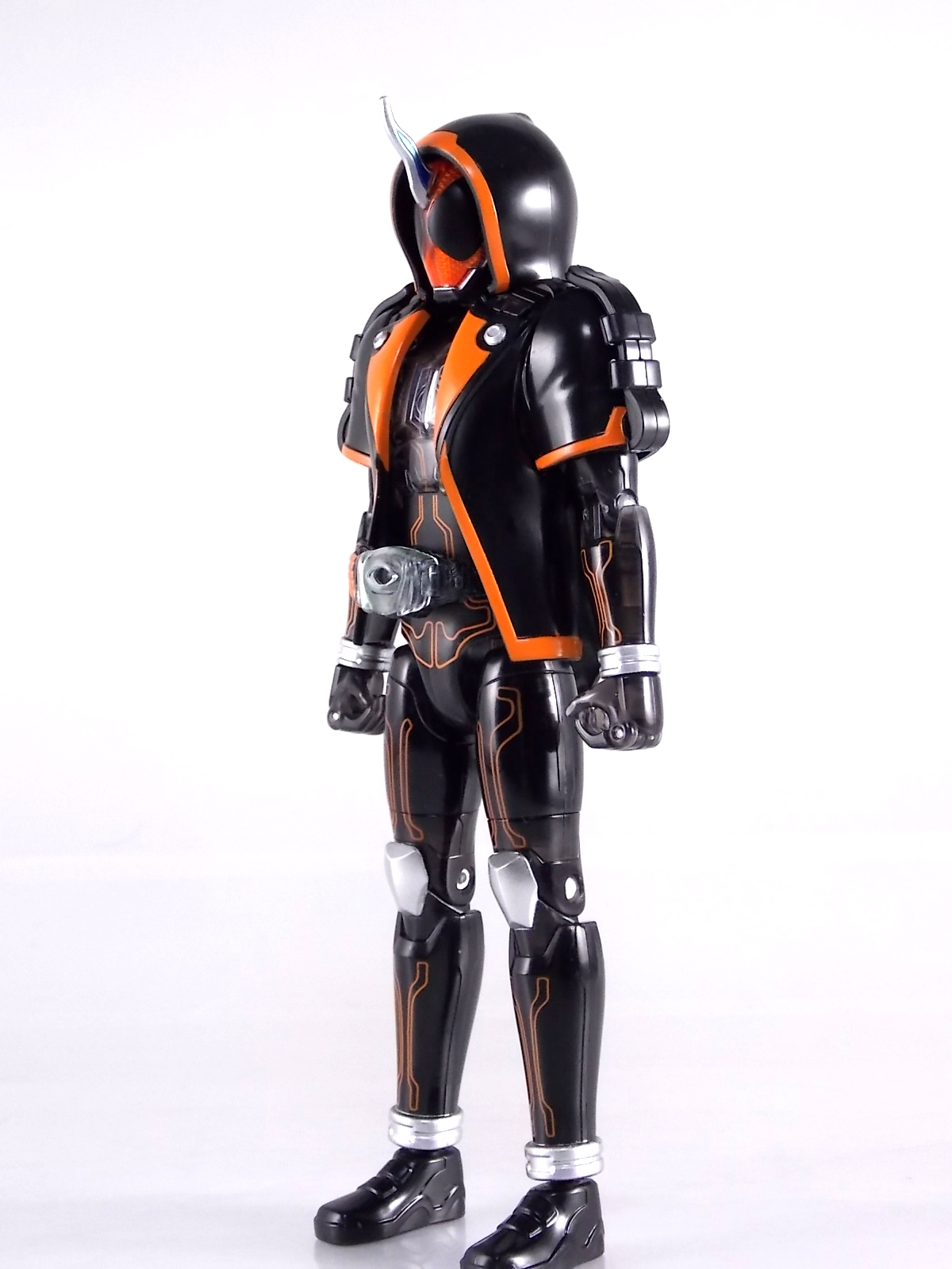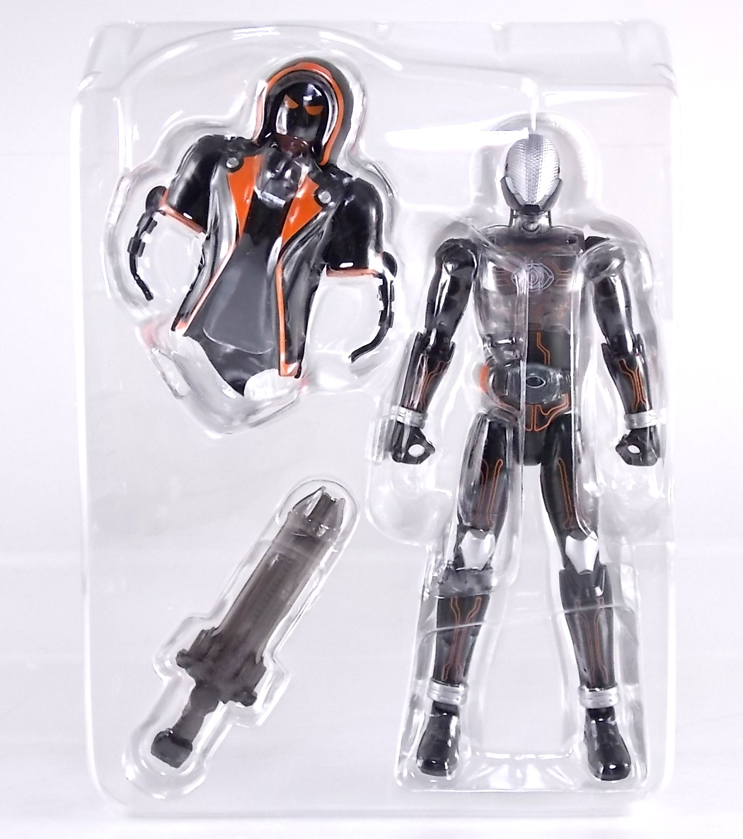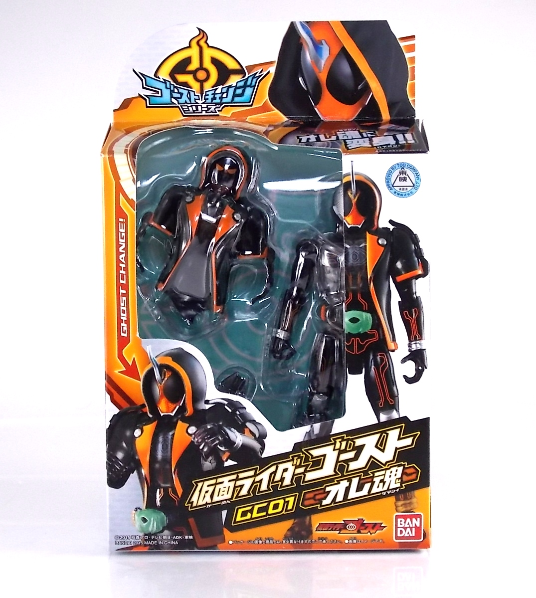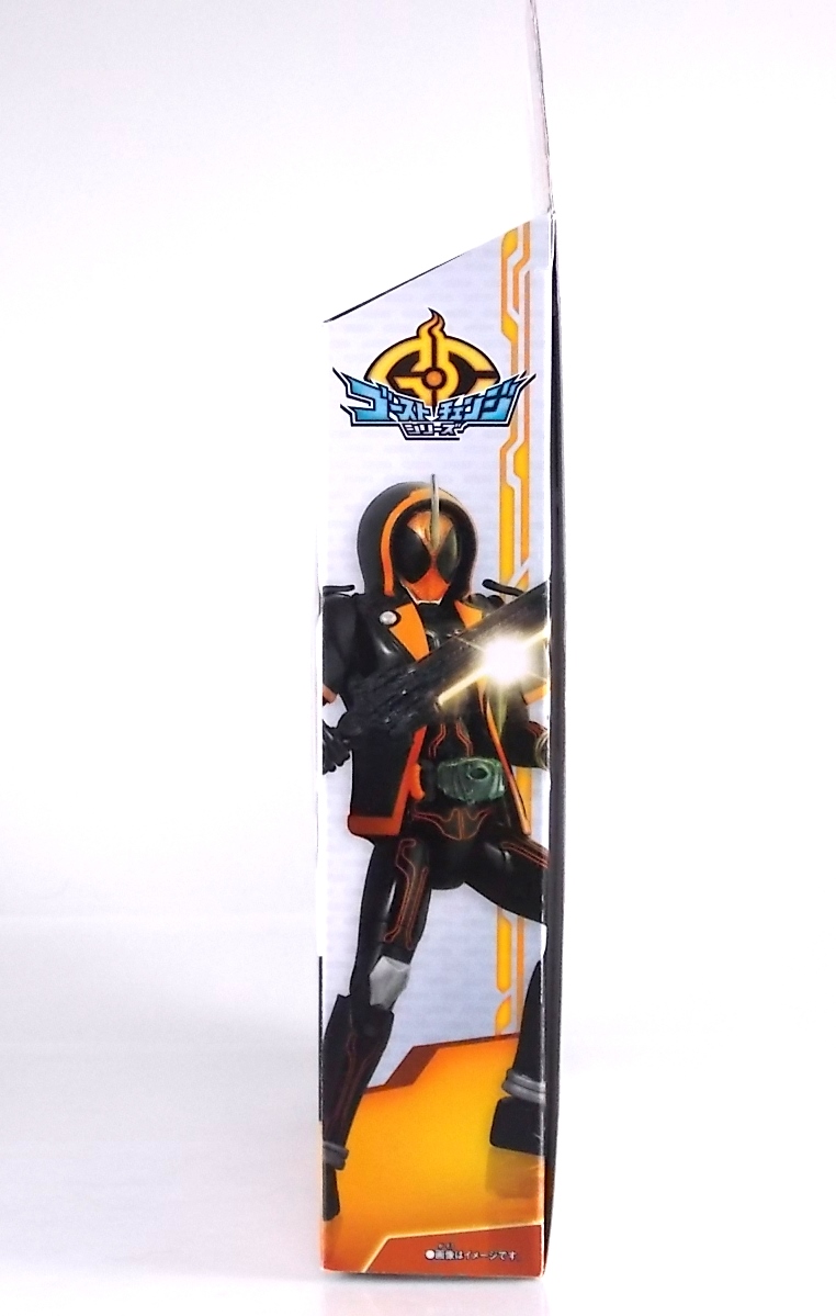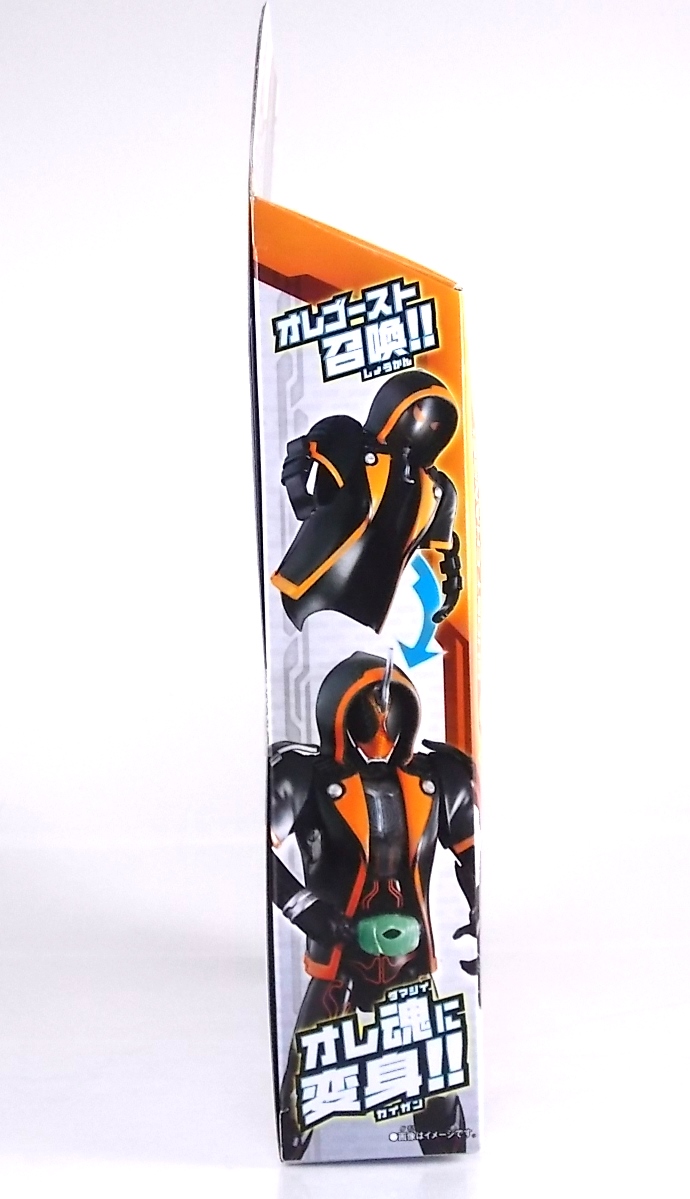 The spooktacular new rider, Kamen Rider Ghost arrives with the first of many gimmick line figures! Today we take a look at that initial release with Ghost Change GC-01 Kamen Rider Ghost Ore Damashii! ** This gallery was made possible thanks to the generosity of my good friend Baltmatrix, who let me borrow his Ghost so I didn't have to purchase one myself. Thanks Matt! Packaging As we've seen over the years the packaging for the mass retail rider gimmick lines is actually pretty nice, though for consistencies sake they usually share the same basic packaging type. Which is a smart move for a series that's on annually. Similar packaging for figures like this through out the years has got to make it easier on Japanese retailers. In any case Kamen Rider Ghost's packing deviates a bit with the two halves of his plastic inner shell forming over the figure like normal, but the box itself doesn't have a plastic window. My guess would be cost cutting as it is really unnecessary since the plastic shell fully encapsulates the toy anyway. There are good shots of the Ghost suit on the package and call outs to other merch as well as a large Ghost symbol printed on card back in the box. All in all pretty nice. Main Figure Ghost Change Kamen Rider Ghost is a rather bland figure on it's own. In his basic form with no Damashii's attached he's known as Kamen Rider Ghost Transient. This very basic form is akin to past years' pre-forms like Kuuga Growing or Den-O Plat Form. While basic it does look rather interesting. An all black suit, the majority of the figure is cast in a translucent gray/green plastic to give it a ghostly ethereal feel. The body lines are painted in a nice bright orange to contrast this and the chest detail in particular is very nice. The Ghost Driver is a little plain but that's to be expected on a gimmick style toy like this. Though as many fans have pointed out in the show, the Ghost Driver sticks rather far out off of Ghosts' waist. Here it's the same. It's non-functioning but it gets the job done well enough. The helmet details in this form actually deviate a bit from the show. The silver face plate is sort of studded with bumps to replicate the features of traditional Kamen Rider Compound Eyes. This is to help the figure pull the look of each different Damashii off, without having to tool that detail into each Damashii. So while it's a bit off from the smooth show face plate, it's smart. The figure has a fairly basic range of movement with swivel/ball jointed feet. Swivels thighs, knee bends, rotating hips, a partially rotating waist, poseable fingers, elbows, rotating shoulders, and a neck that can swivel side to side and back. It's capable of some fairly decent poses thanks to this, but as you'll see in images & read below, the Parka Ghosts/Damashiis greatly hinder this. Accessories Ghost Change Kamen Rider Ghost is pretty standard as far as retail figures of this nature are concerned. He comes with only the essential accessories: 1 - Gan Gun Saber. A totally unpainted scaled down version of his signature weapon. It's a nicely scaled weapon that indeed is sculpted faithfully to the real thing. But is totally unpainted. And cast in the same kind of translucent gray plastic as Ghost himself. Again this is probably a cost cutting measure. Like the body parts cast in this color and this weapon are probably on the same parts runner at the factory. But gimmick accessories like this rarely have many paint apps as is. 1 - Ore Damashii Parka Ghost/jacket. The series and toylines' signature gimmick. Ore Damashii is the personification of Takeru/Ghosts own soul or damashii. An interesting accessory, this gimmick very clearly appears like a spiritual (forgive the pun) successor to Arms Change. However don't be fooled. It's far sub-standard to that gimmick. While as a floating Parka Ghost on it's own this piece is fun. It's combination with the Ghost figure pretty much kills anything you could have done with the figure. Rotate the face mask on the Parka Ghost up to reveal the Ghost Ore face plate, rotate the small strappy arms on the sleeves up over the shoulders. Then slide the the whole contraption over Ghost. There are slits in the jacket part to clear the shoulders. But getting the face plugged in is I've found frustratingly difficult. But once you do, you've basically killed all the neck articulation the figure has. You can just barely angle the head side to side by pulling down on the mask and locking it in, but it's minimal at best. But not in any meaningful way that I've found. And the jacket now limits the upper body and waist movement you had before. The shoulder pads are hinged to move somewhat with the arms but they only give you minimal outward movement before they impact the arms and kill that too. Frankly it's the most obtrusive gimmick Bandai could have come up with. Final Thoughts After several years of solid gimmick toy lines with Gaim & Drive I'm sad to report that Ghost Change is kind of a flop in my book. The basic Transient Ghost figure is very nicely detailed albeit a bit boring. But the Damashii gimmick itself is terribly intrusive to the figure, limiting almost all aspects of it. Even in static poses the way the jacket forces the figure into a more rigid stance makes it look lifeless. I'm sorry to say that GC-01 Ghost Change Kamen Rider Ghost Ore Damashii is not a great toy. Buy this one on the cheap, or better yet wait for the S.H. Figuart that's being fully revealed this weekend.