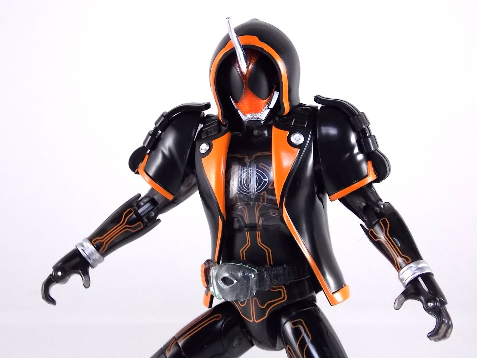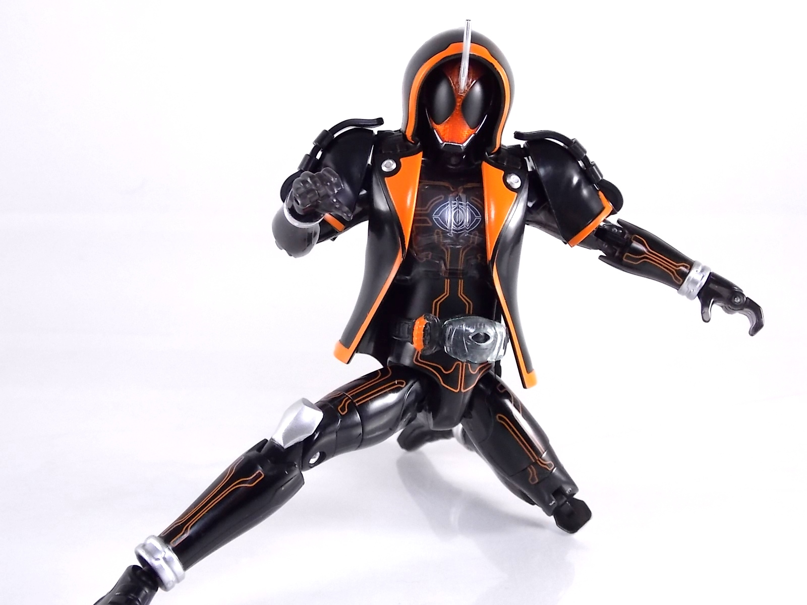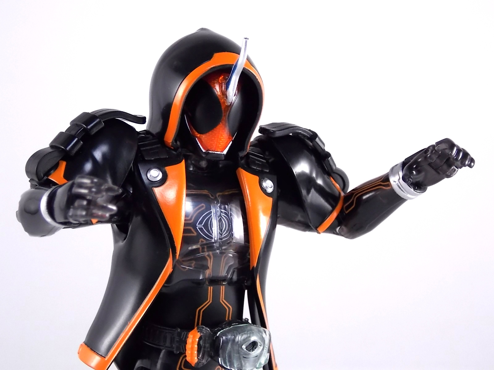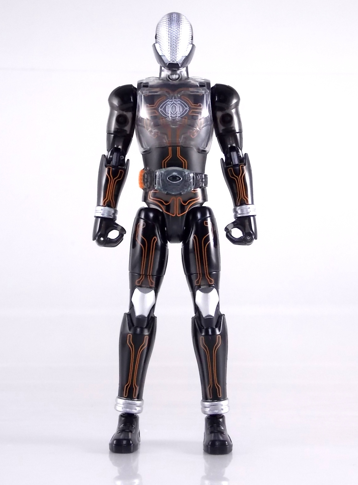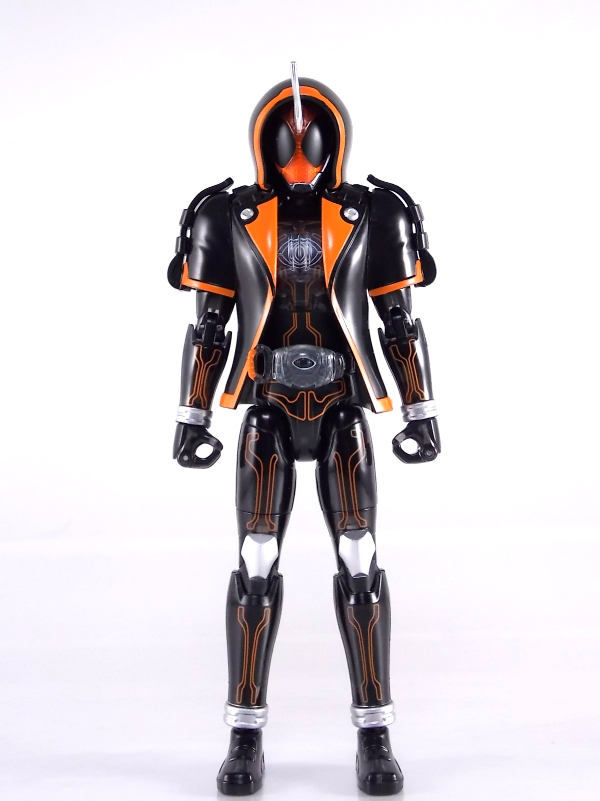 The spooktacular new rider, Kamen Rider Ghost arrives with the first of many gimmick line figures! Today we take a look at that initial release with Ghost Change GC-01 Kamen Rider Ghost Ore Damashii! ** This gallery was made possible thanks to the generosity of my good friend Baltmatrix, who let me borrow his Ghost so I didn't have to purchase one myself. Thanks Matt! Packaging As we've seen over the years the packaging for the mass retail rider gimmick lines is actually pretty nice, though for consistencies sake they usually share the same basic packaging type. Which is a smart move for a series that's on annually. Similar packaging for figures like this through out the years has got to make it easier on Japanese retailers. In any case Kamen Rider Ghost's packing deviates a bit with the two halves of his plastic inner shell forming over the figure like normal, but the box itself doesn't have a plastic window. My guess would be cost cutting as it is really unnecessary since the plastic shell fully encapsulates the toy anyway. There are good shots of the Ghost suit on the package and call outs to other merch as well as a large Ghost symbol printed on card back in the box. All in all pretty nice. Main Figure Ghost Change Kamen Rider Ghost is a rather bland figure on it's own. In his basic form with no Damashii's attached he's known as Kamen Rider Ghost Transient. This very basic form is akin to past years' pre-forms like Kuuga Growing or Den-O Plat Form. While basic it does look rather interesting. An all black suit, the majority of the figure is cast in a translucent gray/green plastic to give it a ghostly ethereal feel. The body lines are painted in a nice bright orange to contrast this and the chest detail in particular is very nice. The Ghost Driver is a little plain but that's to be expected on a gimmick style toy like this. Though as many fans have pointed out in the show, the Ghost Driver sticks rather far out off of Ghosts' waist. Here it's the same. It's non-functioning but it gets the job done well enough. The helmet details in this form actually deviate a bit from the show. The silver face plate is sort of studded with bumps to replicate the features of traditional Kamen Rider Compound Eyes. This is to help the figure pull the look of each different Damashii off, without having to tool that detail into each Damashii. So while it's a bit off from the smooth show face plate, it's smart. The figure has a fairly basic range of movement with swivel/ball jointed feet. Swivels thighs, knee bends, rotating hips, a partially rotating waist, poseable fingers, elbows, rotating shoulders, and a neck that can swivel side to side and back. It's capable of some fairly decent poses thanks to this, but as you'll see in images & read below, the Parka Ghosts/Damashiis greatly hinder this. Accessories Ghost Change Kamen Rider Ghost is pretty standard as far as retail figures of this nature are concerned. He comes with only the essential accessories: 1 - Gan Gun Saber. A totally unpainted scaled down version of his signature weapon. It's a nicely scaled weapon that indeed is sculpted faithfully to the real thing. But is totally unpainted. And cast in the same kind of translucent gray plastic as Ghost himself. Again this is probably a cost cutting measure. Like the body parts cast in this color and this weapon are probably on the same parts runner at the factory. But gimmick accessories like this rarely have many paint apps as is. 1 - Ore Damashii Parka Ghost/jacket. The series and toylines' signature gimmick. Ore Damashii is the personification of Takeru/Ghosts own soul or damashii. An interesting accessory, this gimmick very clearly appears like a spiritual (forgive the pun) successor to Arms Change. However don't be fooled. It's far sub-standard to that gimmick. While as a floating Parka Ghost on it's own this piece is fun. It's combination with the Ghost figure pretty much kills anything you could have done with the figure. Rotate the face mask on the Parka Ghost up to reveal the Ghost Ore face plate, rotate the small strappy arms on the sleeves up over the shoulders. Then slide the the whole contraption over Ghost. There are slits in the jacket part to clear the shoulders. But getting the face plugged in is I've found frustratingly difficult. But once you do, you've basically killed all the neck articulation the figure has. You can just barely angle the head side to side by pulling down on the mask and locking it in, but it's minimal at best. But not in any meaningful way that I've found. And the jacket now limits the upper body and waist movement you had before. The shoulder pads are hinged to move somewhat with the arms but they only give you minimal outward movement before they impact the arms and kill that too. Frankly it's the most obtrusive gimmick Bandai could have come up with. Final Thoughts After several years of solid gimmick toy lines with Gaim & Drive I'm sad to report that Ghost Change is kind of a flop in my book. The basic Transient Ghost figure is very nicely detailed albeit a bit boring. But the Damashii gimmick itself is terribly intrusive to the figure, limiting almost all aspects of it. Even in static poses the way the jacket forces the figure into a more rigid stance makes it look lifeless. I'm sorry to say that GC-01 Ghost Change Kamen Rider Ghost Ore Damashii is not a great toy. Buy this one on the cheap, or better yet wait for the S.H. Figuart that's being fully revealed this weekend.