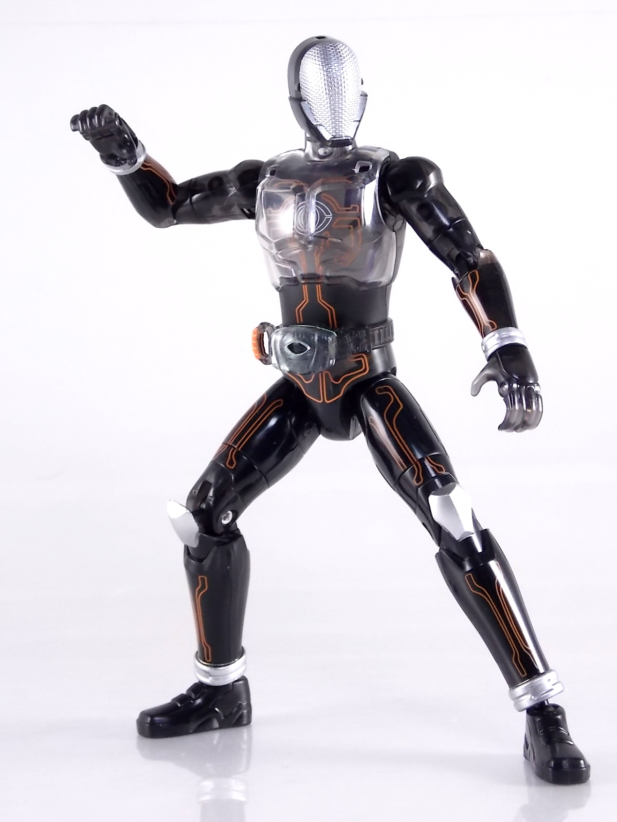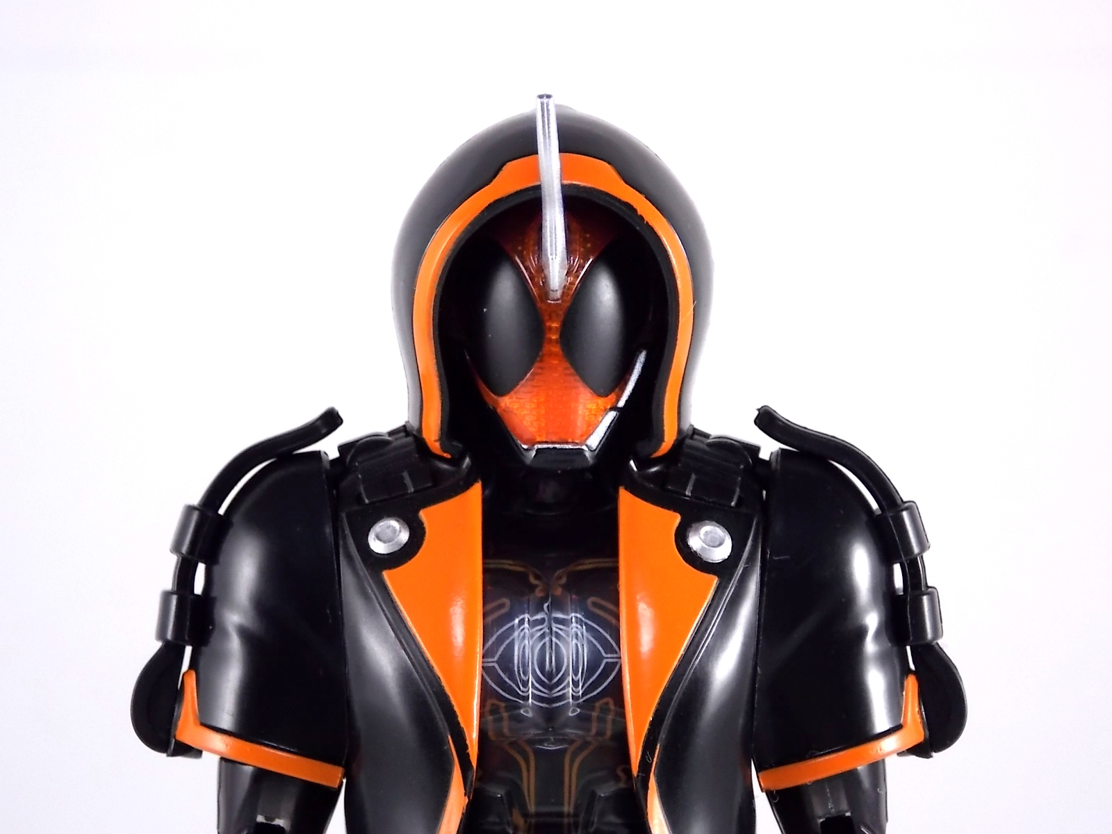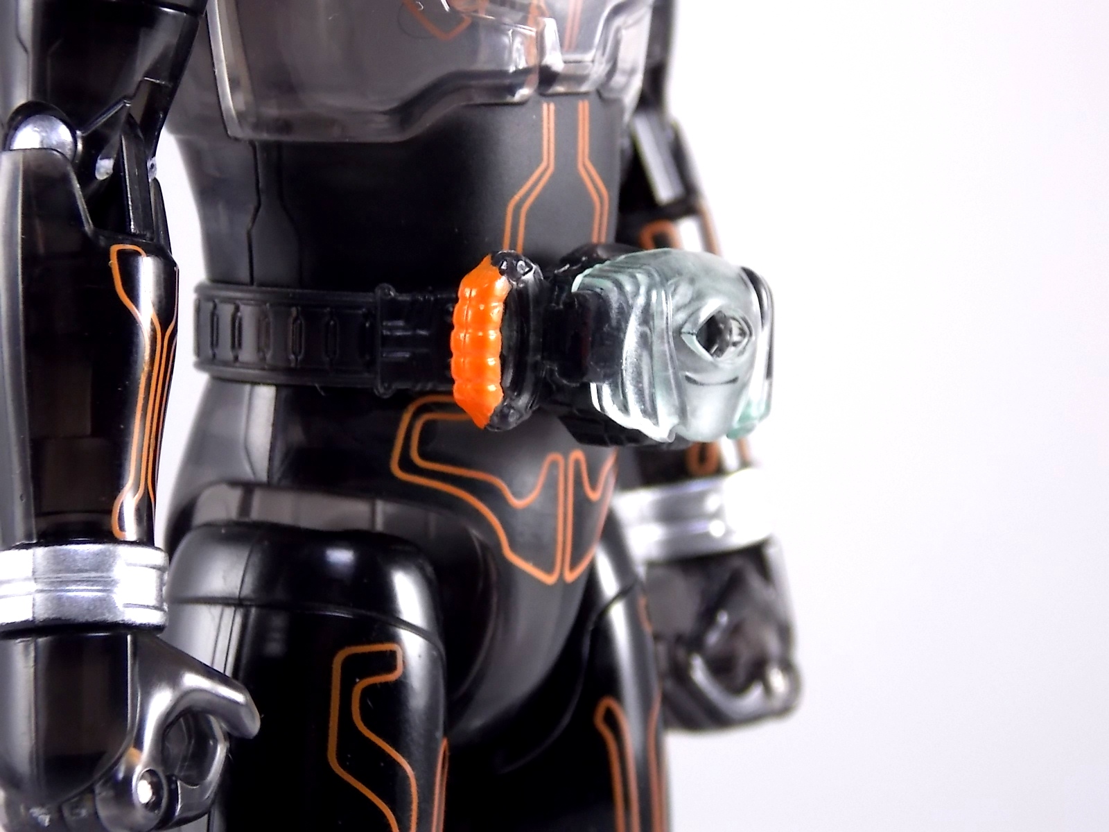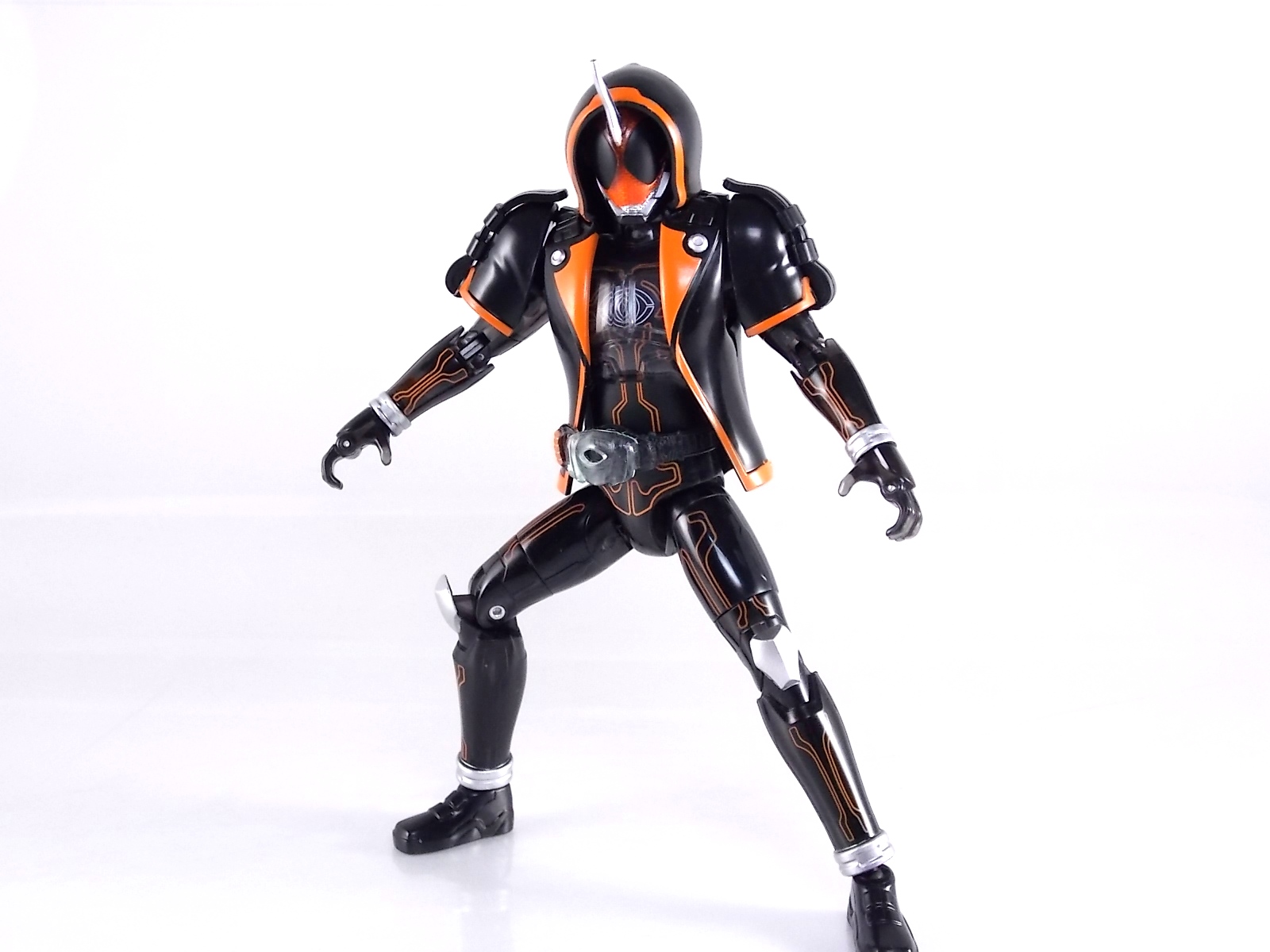 The spooktacular new rider, Kamen Rider Ghost arrives with the first of many gimmick line figures! Today we take a look at that initial release with Ghost Change GC-01 Kamen Rider Ghost Ore Damashii! ** This gallery was made possible thanks to the generosity of my good friend Baltmatrix, who let me borrow his Ghost so I didn't have to purchase one myself. Thanks Matt! Packaging As we've seen over the years the packaging for the mass retail rider gimmick lines is actually pretty nice, though for consistencies sake they usually share the same basic packaging type. Which is a smart move for a series that's on annually. Similar packaging for figures like this through out the years has got to make it easier on Japanese retailers. In any case Kamen Rider Ghost's packing deviates a bit with the two halves of his plastic inner shell forming over the figure like normal, but the box itself doesn't have a plastic window. My guess would be cost cutting as it is really unnecessary since the plastic shell fully encapsulates the toy anyway. There are good shots of the Ghost suit on the package and call outs to other merch as well as a large Ghost symbol printed on card back in the box. All in all pretty nice. Main Figure Ghost Change Kamen Rider Ghost is a rather bland figure on it's own. In his basic form with no Damashii's attached he's known as Kamen Rider Ghost Transient. This very basic form is akin to past years' pre-forms like Kuuga Growing or Den-O Plat Form. While basic it does look rather interesting. An all black suit, the majority of the figure is cast in a translucent gray/green plastic to give it a ghostly ethereal feel. The body lines are painted in a nice bright orange to contrast this and the chest detail in particular is very nice. The Ghost Driver is a little plain but that's to be expected on a gimmick style toy like this. Though as many fans have pointed out in the show, the Ghost Driver sticks rather far out off of Ghosts' waist. Here it's the same. It's non-functioning but it gets the job done well enough. The helmet details in this form actually deviate a bit from the show. The silver face plate is sort of studded with bumps to replicate the features of traditional Kamen Rider Compound Eyes. This is to help the figure pull the look of each different Damashii off, without having to tool that detail into each Damashii. So while it's a bit off from the smooth show face plate, it's smart. The figure has a fairly basic range of movement with swivel/ball jointed feet. Swivels thighs, knee bends, rotating hips, a partially rotating waist, poseable fingers, elbows, rotating shoulders, and a neck that can swivel side to side and back. It's capable of some fairly decent poses thanks to this, but as you'll see in images & read below, the Parka Ghosts/Damashiis greatly hinder this. Accessories Ghost Change Kamen Rider Ghost is pretty standard as far as retail figures of this nature are concerned. He comes with only the essential accessories: 1 - Gan Gun Saber. A totally unpainted scaled down version of his signature weapon. It's a nicely scaled weapon that indeed is sculpted faithfully to the real thing. But is totally unpainted. And cast in the same kind of translucent gray plastic as Ghost himself. Again this is probably a cost cutting measure. Like the body parts cast in this color and this weapon are probably on the same parts runner at the factory. But gimmick accessories like this rarely have many paint apps as is. 1 - Ore Damashii Parka Ghost/jacket. The series and toylines' signature gimmick. Ore Damashii is the personification of Takeru/Ghosts own soul or damashii. An interesting accessory, this gimmick very clearly appears like a spiritual (forgive the pun) successor to Arms Change. However don't be fooled. It's far sub-standard to that gimmick. While as a floating Parka Ghost on it's own this piece is fun. It's combination with the Ghost figure pretty much kills anything you could have done with the figure. Rotate the face mask on the Parka Ghost up to reveal the Ghost Ore face plate, rotate the small strappy arms on the sleeves up over the shoulders. Then slide the the whole contraption over Ghost. There are slits in the jacket part to clear the shoulders. But getting the face plugged in is I've found frustratingly difficult. But once you do, you've basically killed all the neck articulation the figure has. You can just barely angle the head side to side by pulling down on the mask and locking it in, but it's minimal at best. But not in any meaningful way that I've found. And the jacket now limits the upper body and waist movement you had before. The shoulder pads are hinged to move somewhat with the arms but they only give you minimal outward movement before they impact the arms and kill that too. Frankly it's the most obtrusive gimmick Bandai could have come up with. Final Thoughts After several years of solid gimmick toy lines with Gaim & Drive I'm sad to report that Ghost Change is kind of a flop in my book. The basic Transient Ghost figure is very nicely detailed albeit a bit boring. But the Damashii gimmick itself is terribly intrusive to the figure, limiting almost all aspects of it. Even in static poses the way the jacket forces the figure into a more rigid stance makes it look lifeless. I'm sorry to say that GC-01 Ghost Change Kamen Rider Ghost Ore Damashii is not a great toy. Buy this one on the cheap, or better yet wait for the S.H. Figuart that's being fully revealed this weekend.